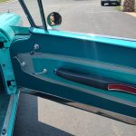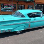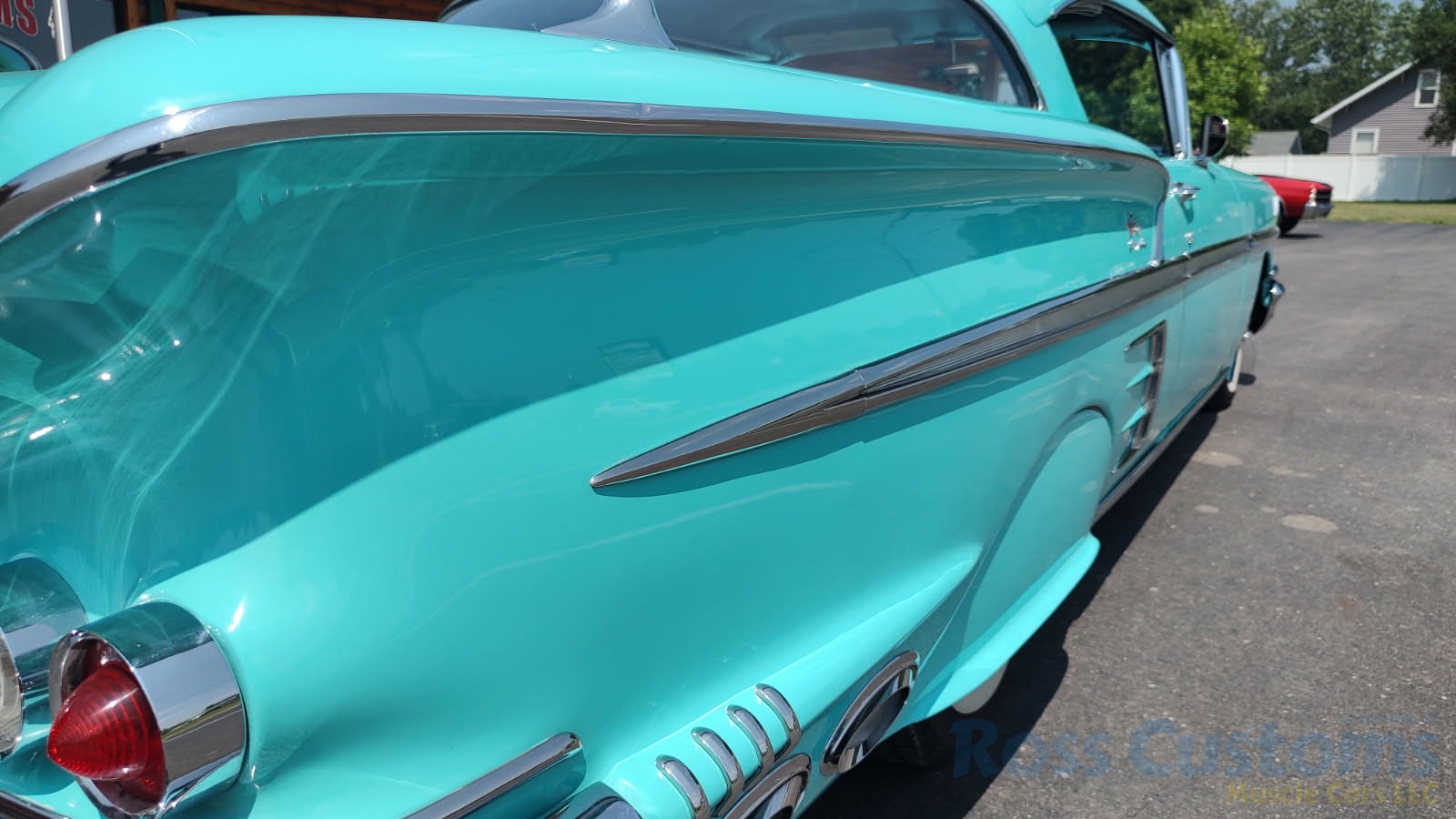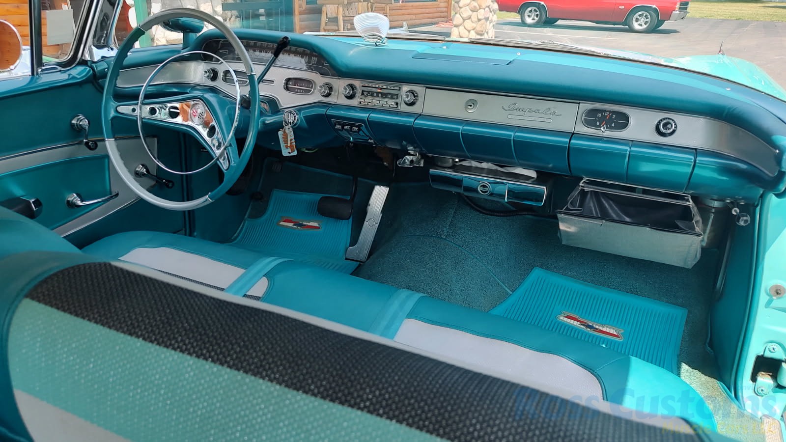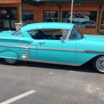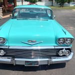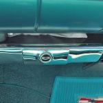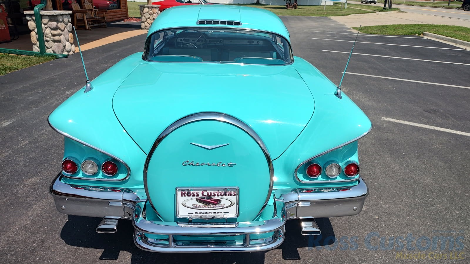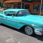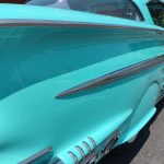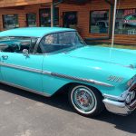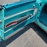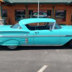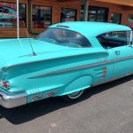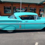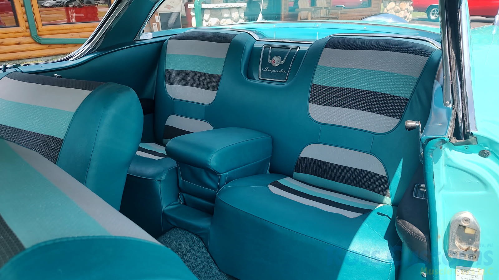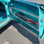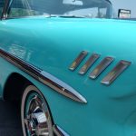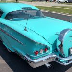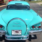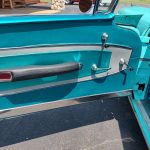 This is a very nice 58 Impala done in its original Tropic Turquoise, sanded and wheeled smooth, all glass is in excellent condition, window stainless and chrome is in excellent condition, chrome window frames are in excellent condition, rear roof vent has been re-chromed, at time of restoration had new weather stripping and window felts, side view mirrors and door handles look like new, accessory fingernail guards, upper fender spears are original in excellent condition, hood “V” and emblem have been replaced, hood bar, fender eyebrows and quarter moldings are in excellent condition; as well as parking light housings, custom tube grill – also have original grill included in sale in excellent condition, original front bumper in very good condition, all body side moldings are original and have been re-polished in excellent condition, original side gills in excellent condition; as well as rocker moldings, has optional fender shirts; also has optional side tailpipe vents, dual rear antennas, factory continental kit, deck lid emblems look like new, rear bumper has been re-chromed.