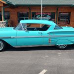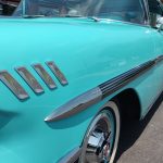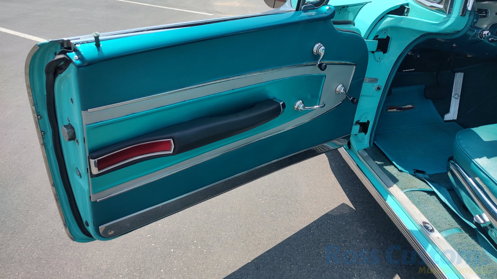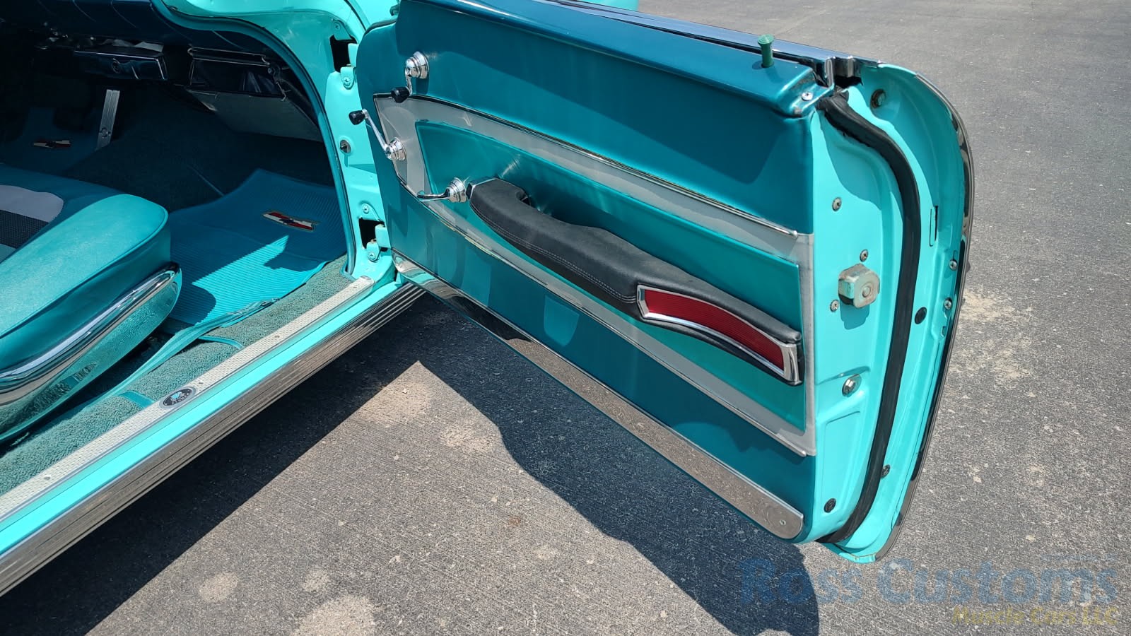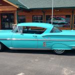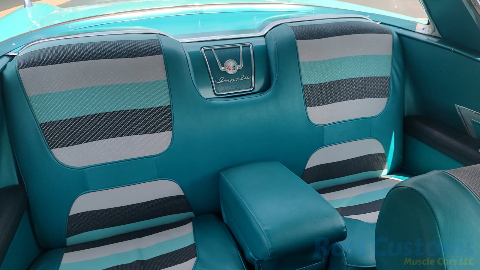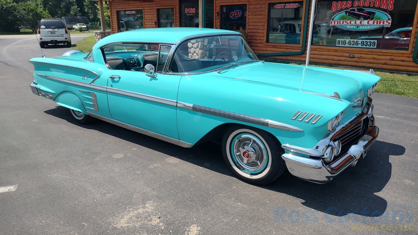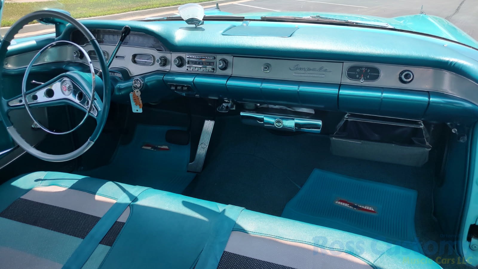 This is a very nice 58 Impala done in its original Tropic Turquoise, sanded and wheeled smooth, all glass is in excellent condition, window stainless and chrome is in excellent condition, chrome window frames are in excellent condition, rear roof vent has been re-chromed, at time of restoration had new weather stripping and window felts, side view mirrors and door handles look like new, accessory fingernail guards, upper fender spears are original in excellent condition, hood “V” and emblem have been replaced, hood bar, fender eyebrows and quarter moldings are in excellent condition; as well as parking light housings, custom tube grill – also have original grill included in sale in excellent condition, original front bumper in very good condition, all body side moldings are original and have been re-polished in excellent condition, original side gills in excellent condition; as well as rocker moldings, has optional fender shirts; also has optional side tailpipe vents, dual rear antennas, factory continental kit, deck lid emblems look like new, rear bumper has been re-chromed.