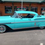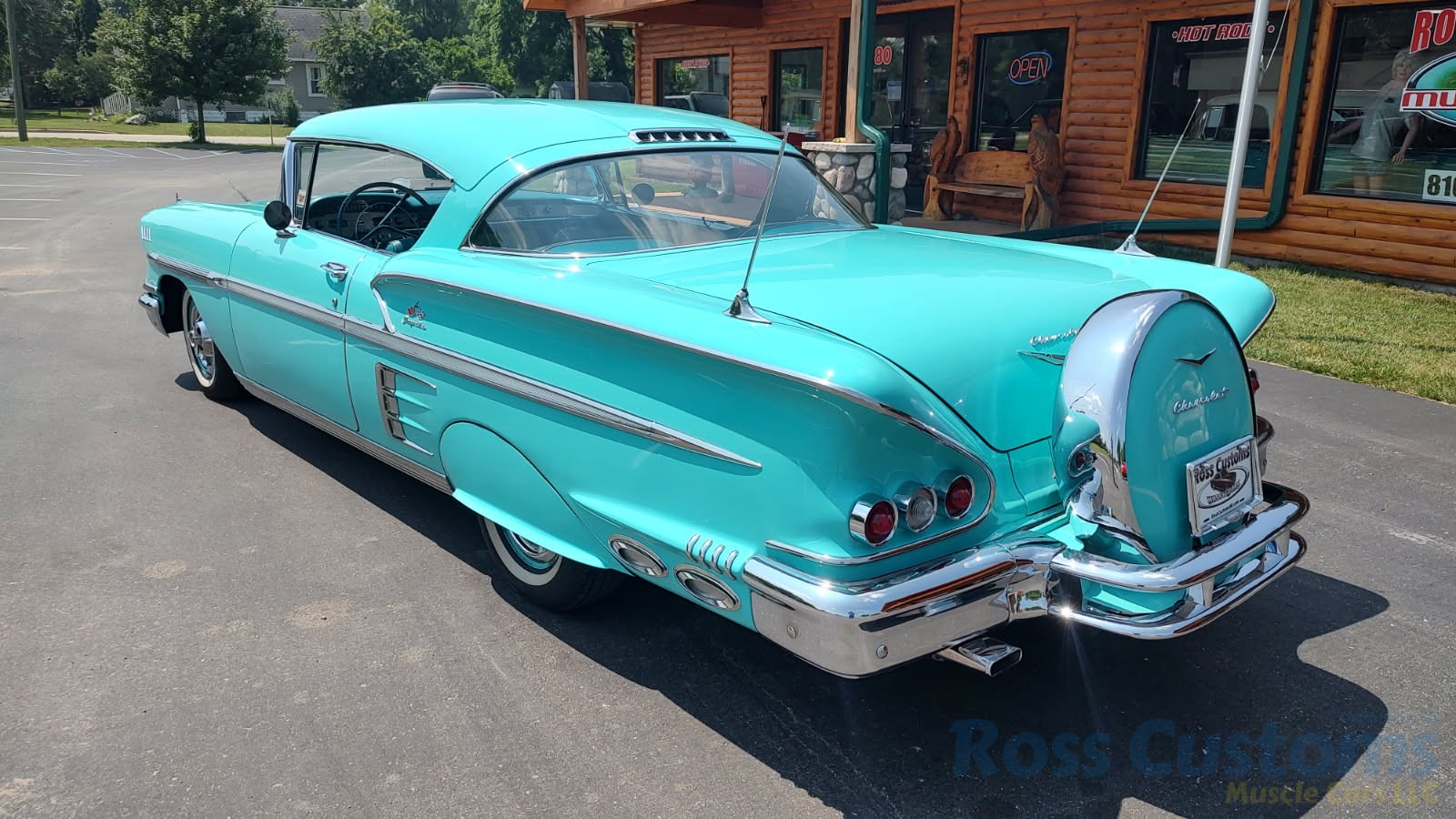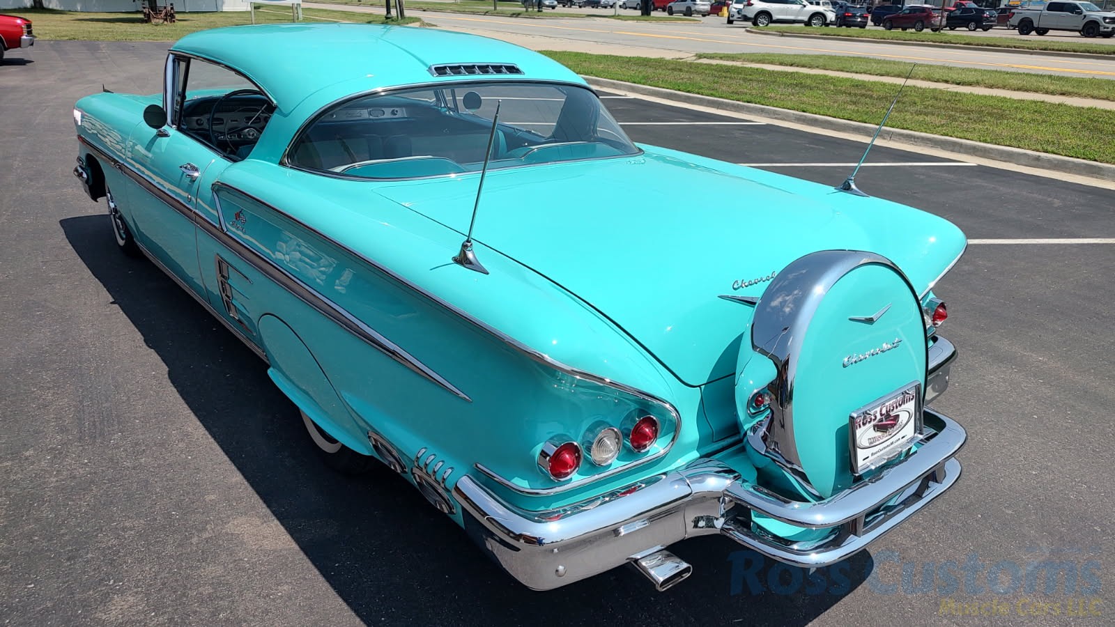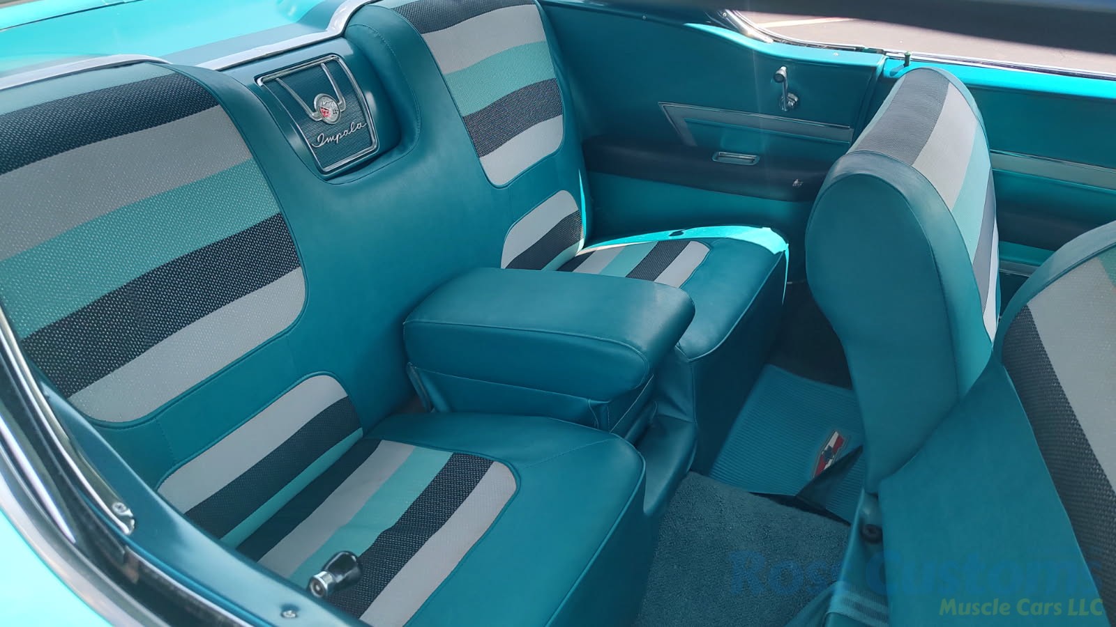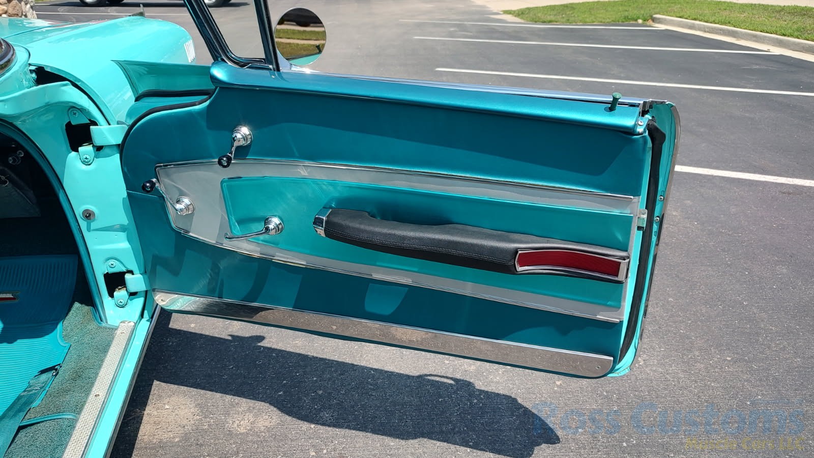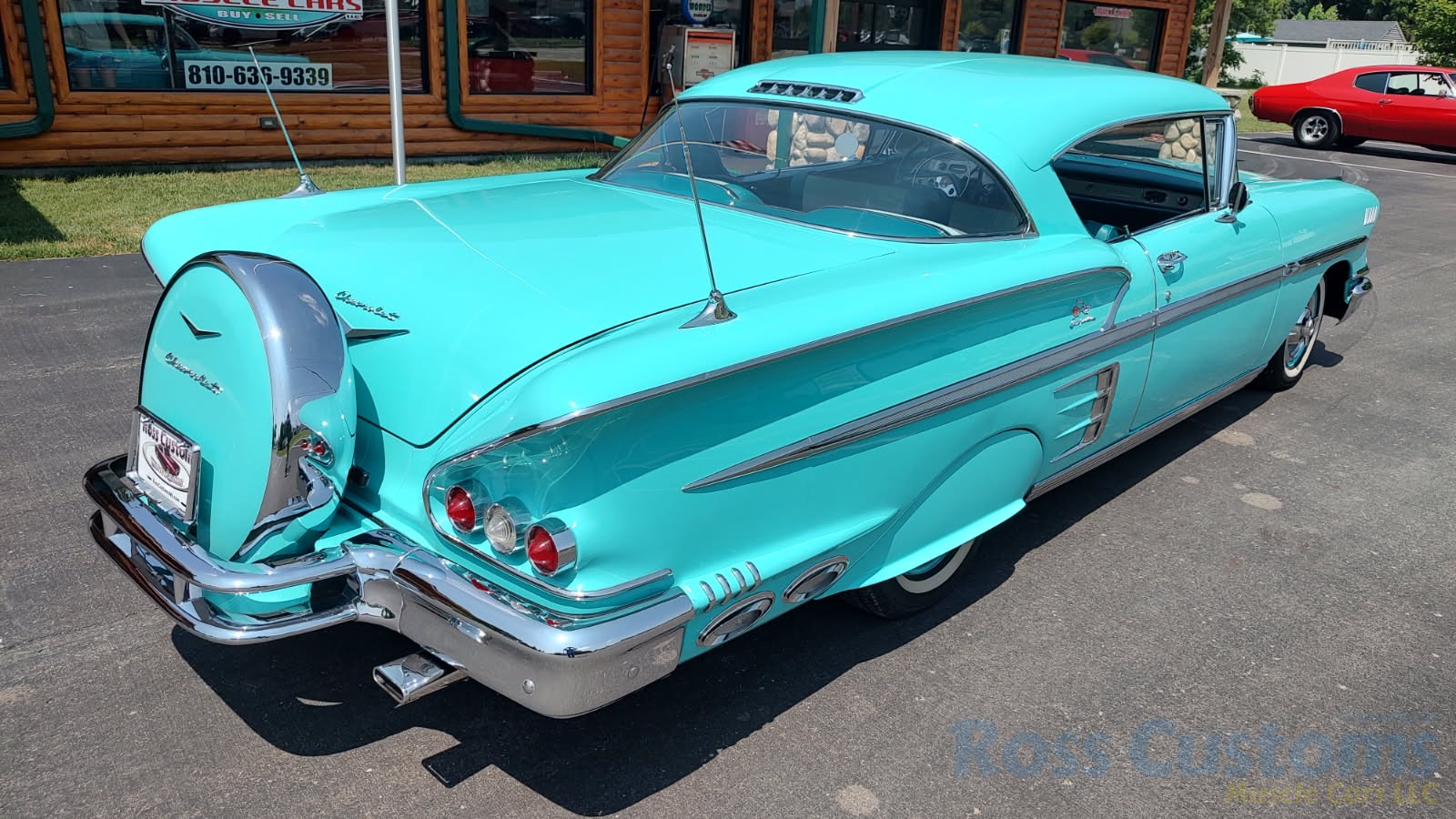 This is a very nice 58 Impala done in its original Tropic Turquoise, sanded and wheeled smooth, all glass is in excellent condition, window stainless and chrome is in excellent condition, chrome window frames are in excellent condition, rear roof vent has been re-chromed, at time of restoration had new weather stripping and window felts, side view mirrors and door handles look like new, accessory fingernail guards, upper fender spears are original in excellent condition, hood “V” and emblem have been replaced, hood bar, fender eyebrows and quarter moldings are in excellent condition; as well as parking light housings, custom tube grill – also have original grill included in sale in excellent condition, original front bumper in very good condition, all body side moldings are original and have been re-polished in excellent condition, original side gills in excellent condition; as well as rocker moldings, has optional fender shirts; also has optional side tailpipe vents, dual rear antennas, factory continental kit, deck lid emblems look like new, rear bumper has been re-chromed.