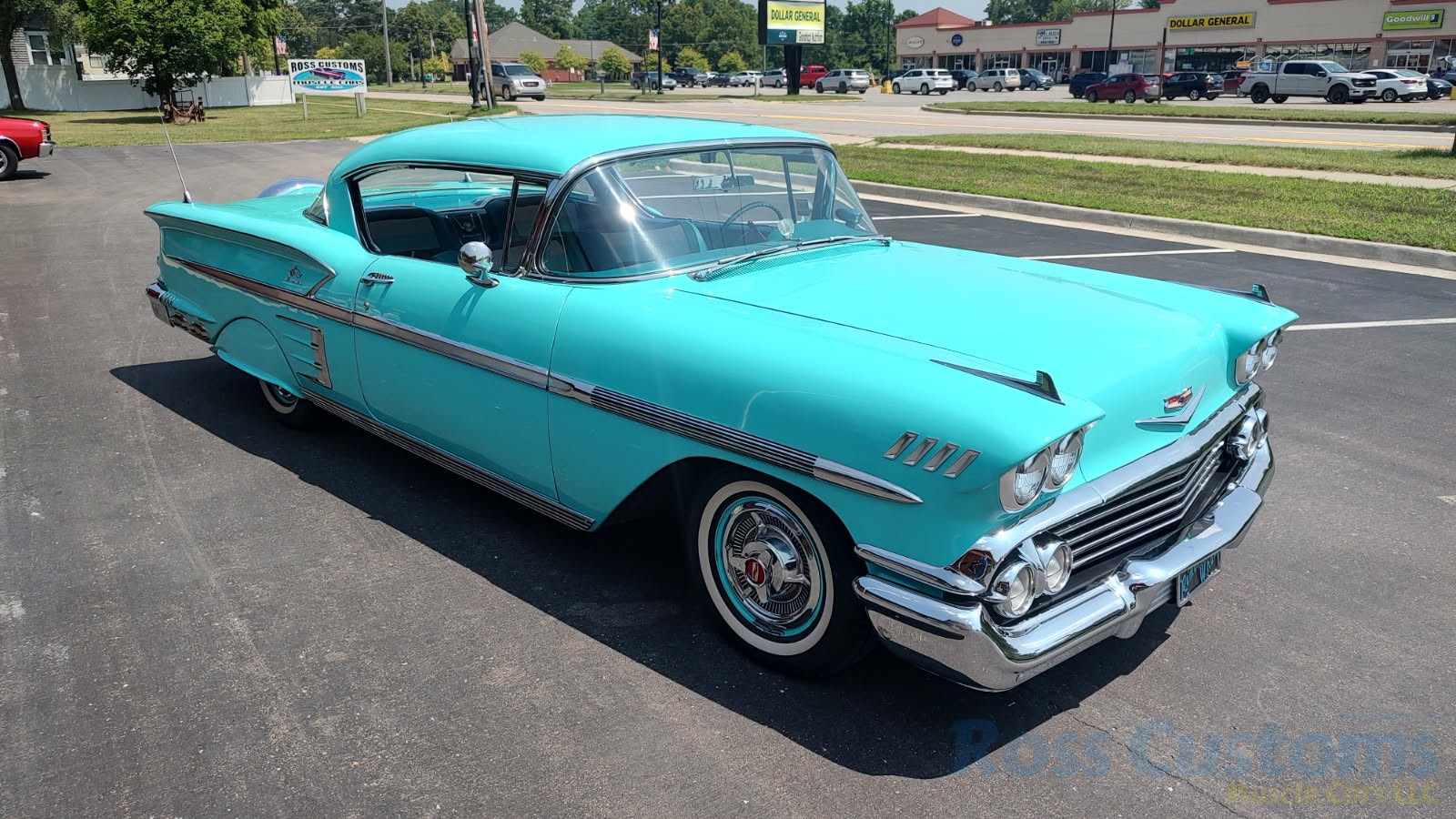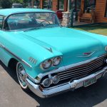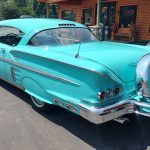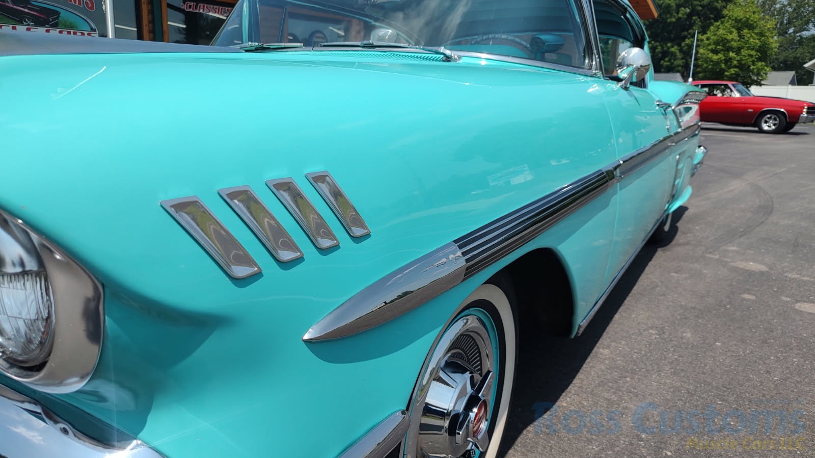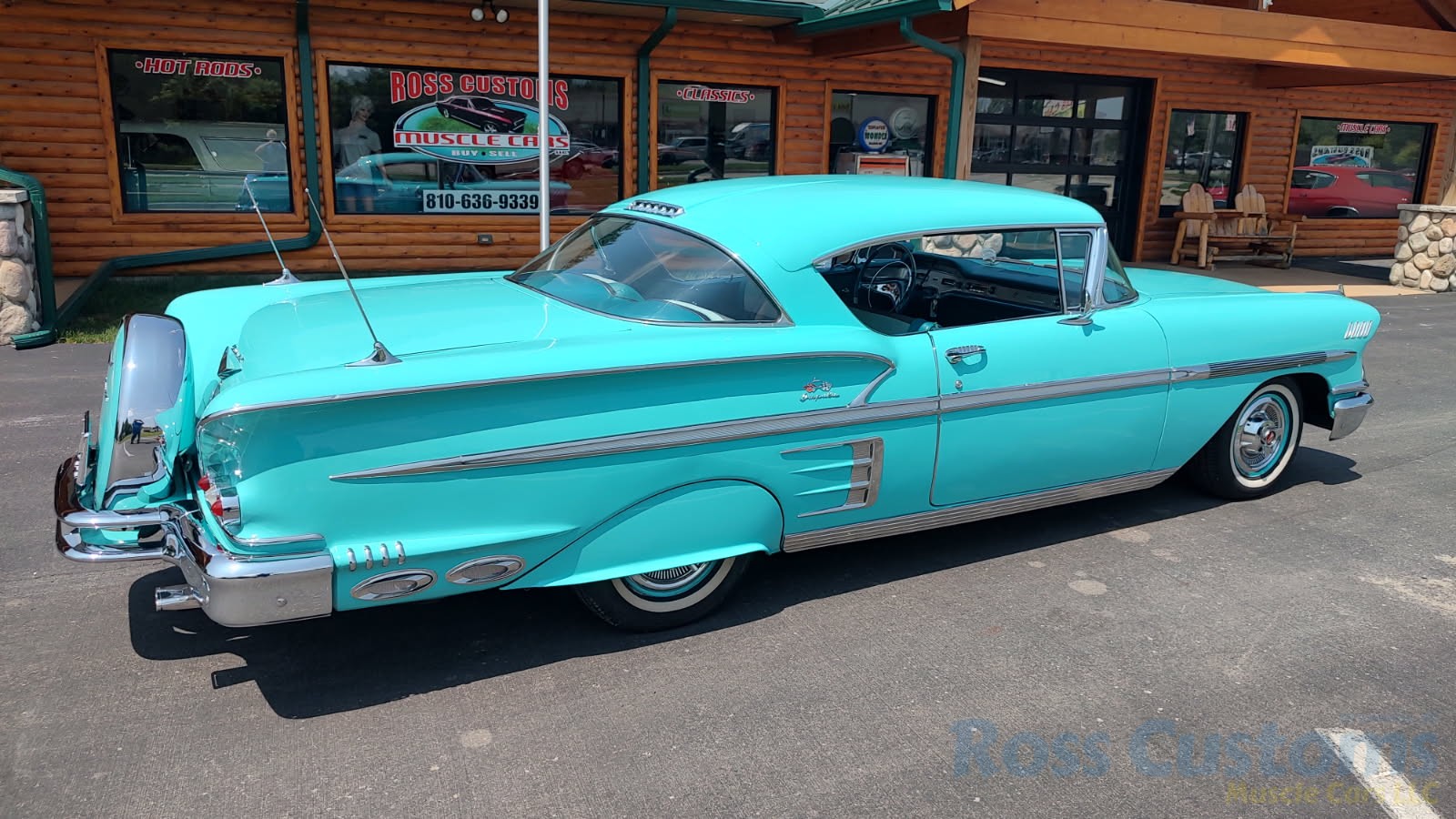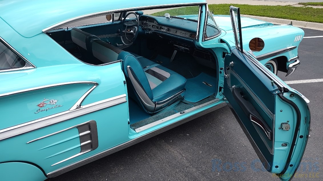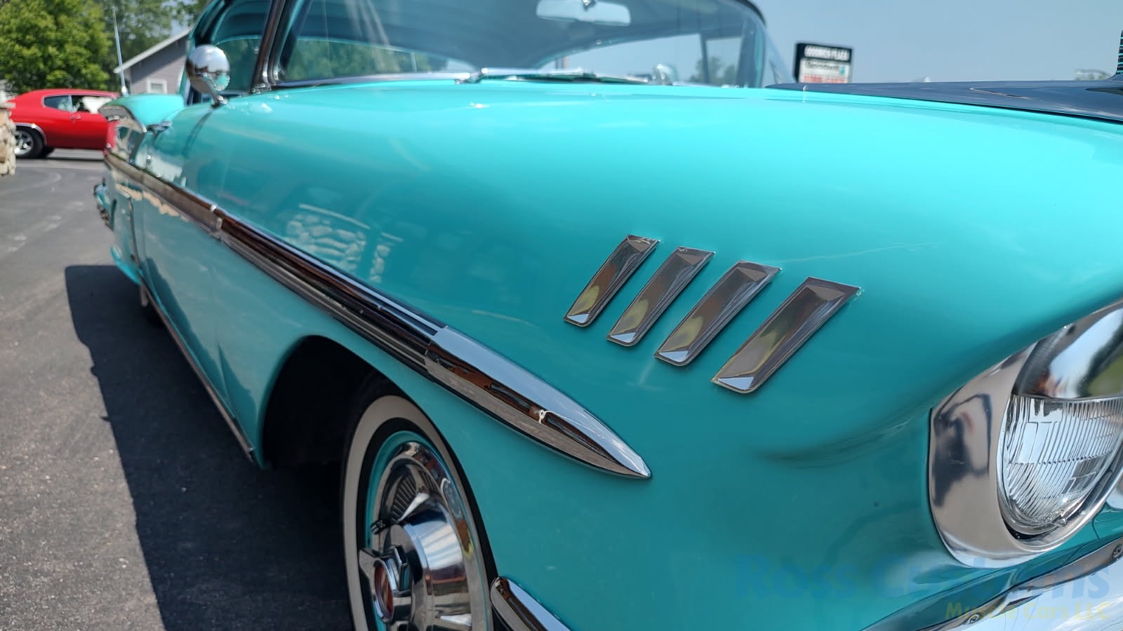 This is a very nice 58 Impala done in its original Tropic Turquoise, sanded and wheeled smooth, all glass is in excellent condition, window stainless and chrome is in excellent condition, chrome window frames are in excellent condition, rear roof vent has been re-chromed, at time of restoration had new weather stripping and window felts, side view mirrors and door handles look like new, accessory fingernail guards, upper fender spears are original in excellent condition, hood “V” and emblem have been replaced, hood bar, fender eyebrows and quarter moldings are in excellent condition; as well as parking light housings, custom tube grill – also have original grill included in sale in excellent condition, original front bumper in very good condition, all body side moldings are original and have been re-polished in excellent condition, original side gills in excellent condition; as well as rocker moldings, has optional fender shirts; also has optional side tailpipe vents, dual rear antennas, factory continental kit, deck lid emblems look like new, rear bumper has been re-chromed.