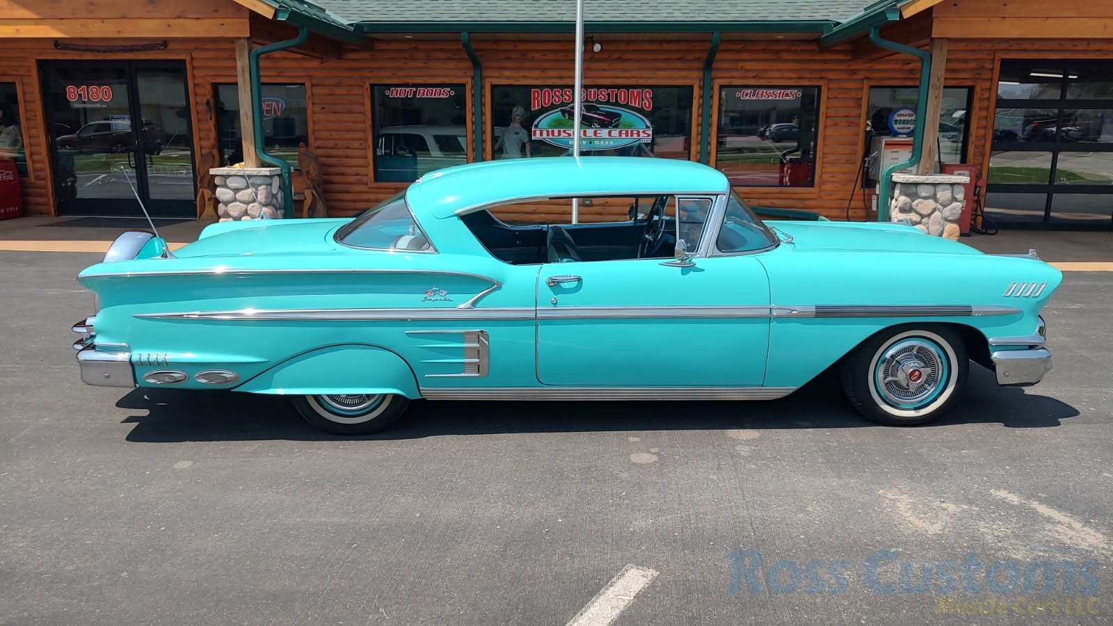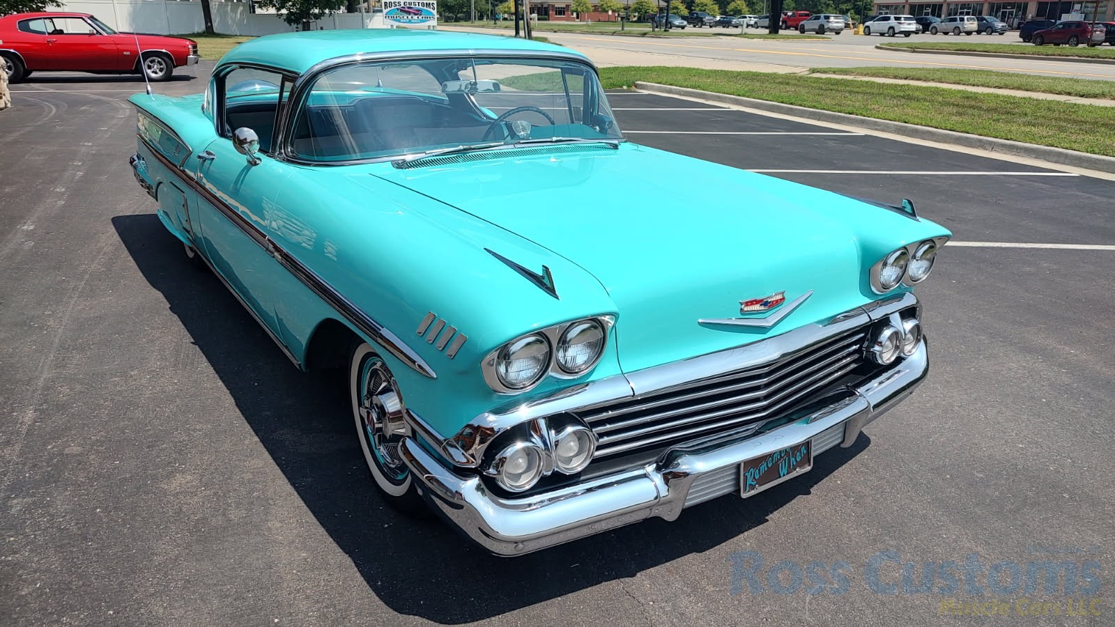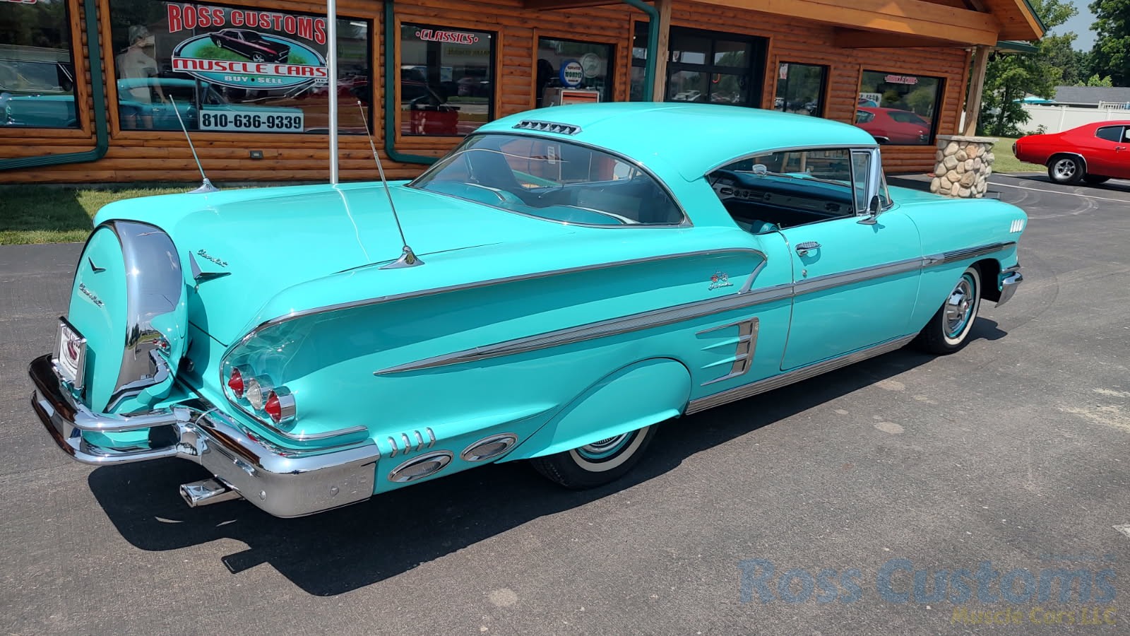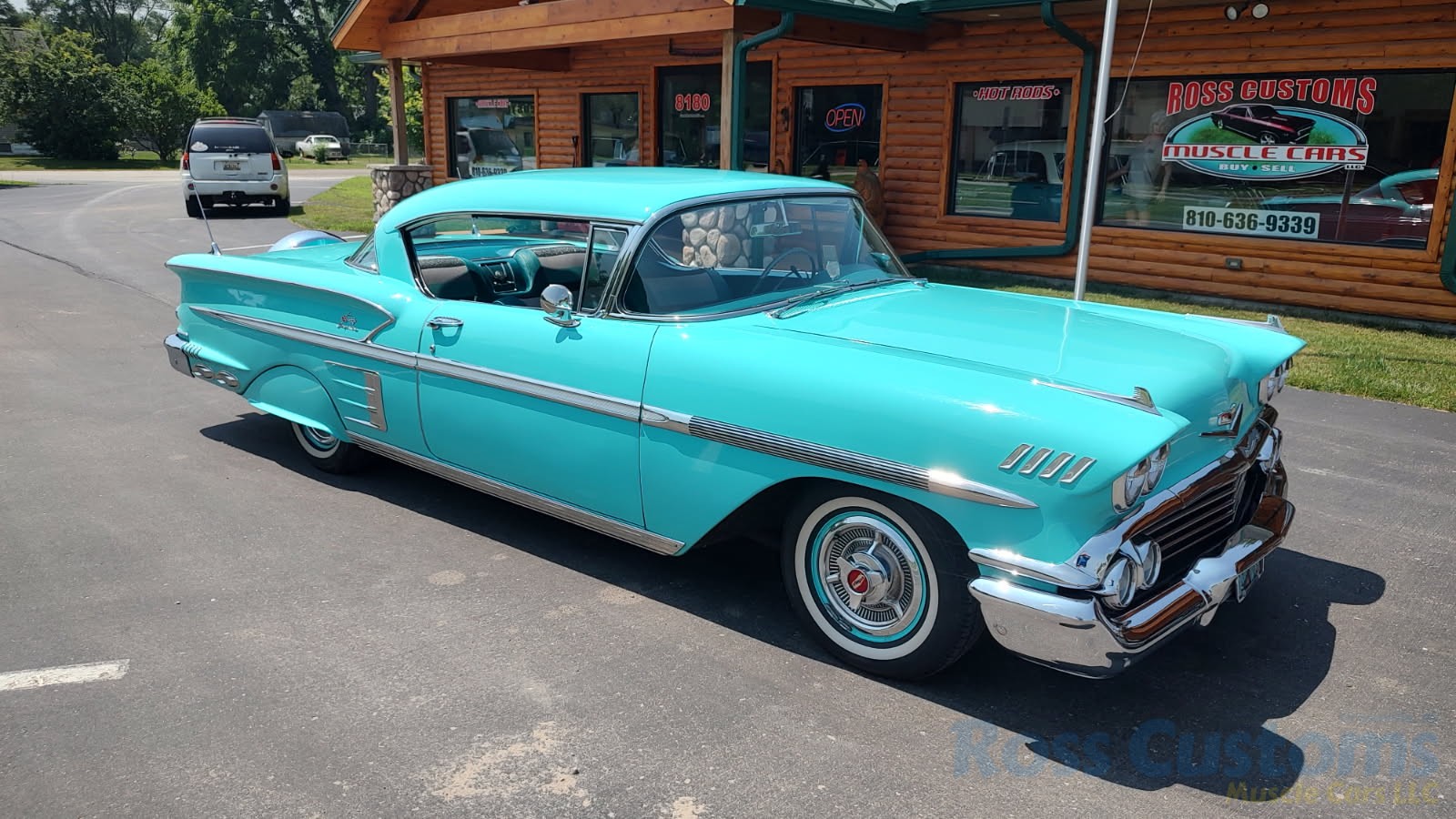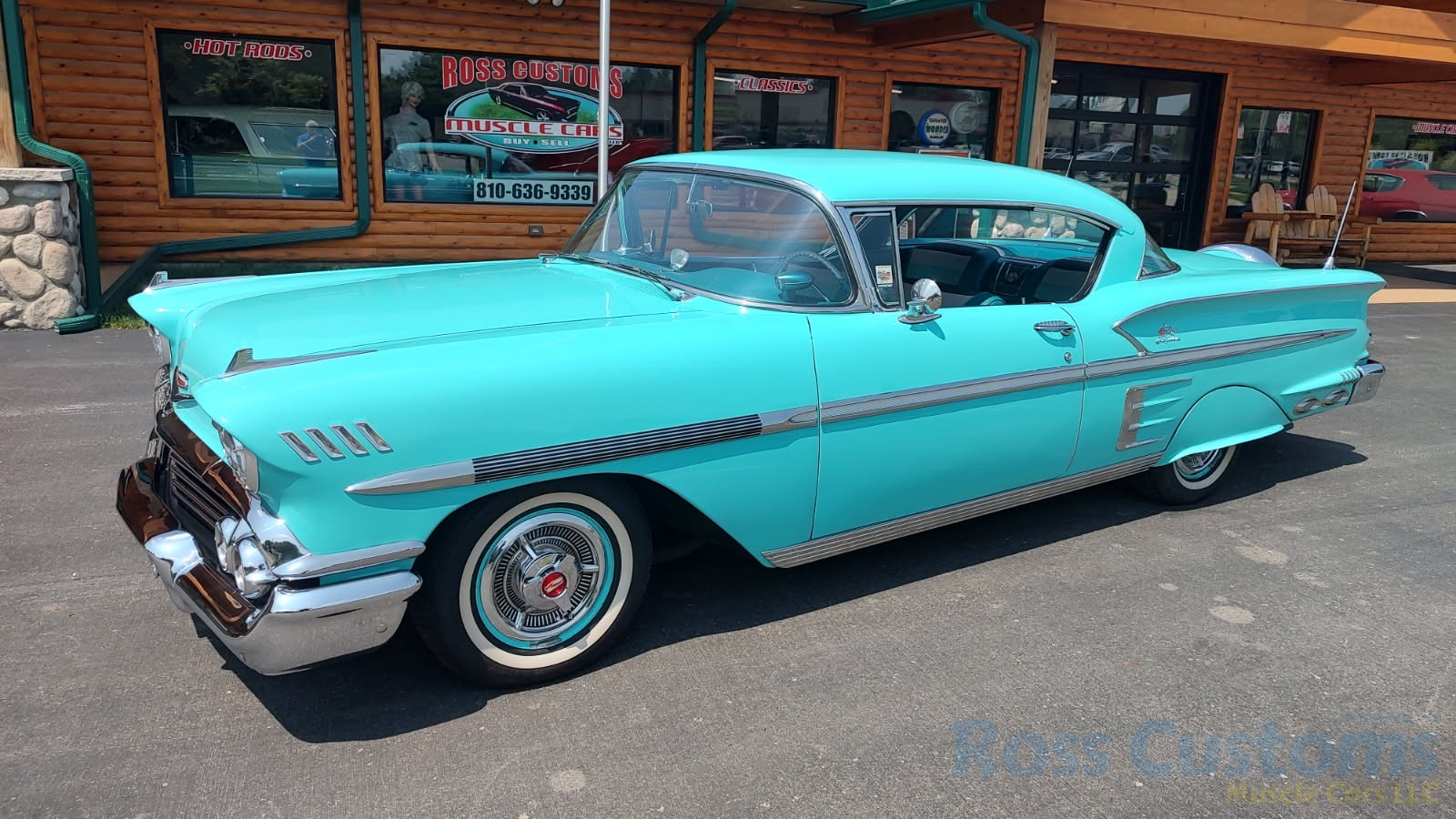 This is a very nice 58 Impala done in its original Tropic Turquoise, sanded and wheeled smooth, all glass is in excellent condition, window stainless and chrome is in excellent condition, chrome window frames are in excellent condition, rear roof vent has been re-chromed, at time of restoration had new weather stripping and window felts, side view mirrors and door handles look like new, accessory fingernail guards, upper fender spears are original in excellent condition, hood “V” and emblem have been replaced, hood bar, fender eyebrows and quarter moldings are in excellent condition; as well as parking light housings, custom tube grill – also have original grill included in sale in excellent condition, original front bumper in very good condition, all body side moldings are original and have been re-polished in excellent condition, original side gills in excellent condition; as well as rocker moldings, has optional fender shirts; also has optional side tailpipe vents, dual rear antennas, factory continental kit, deck lid emblems look like new, rear bumper has been re-chromed.