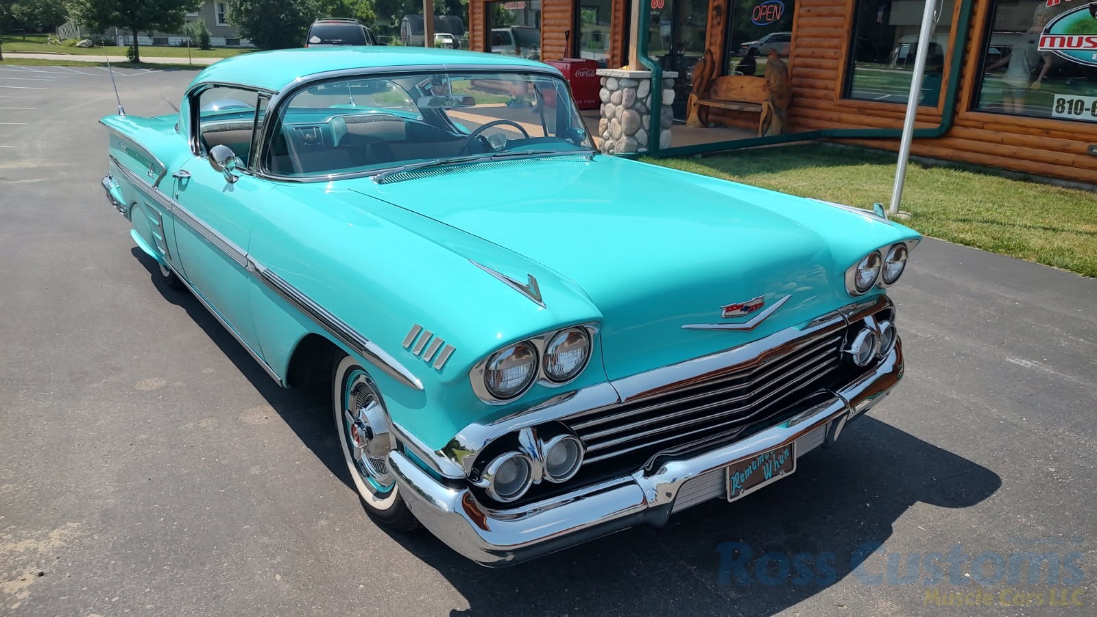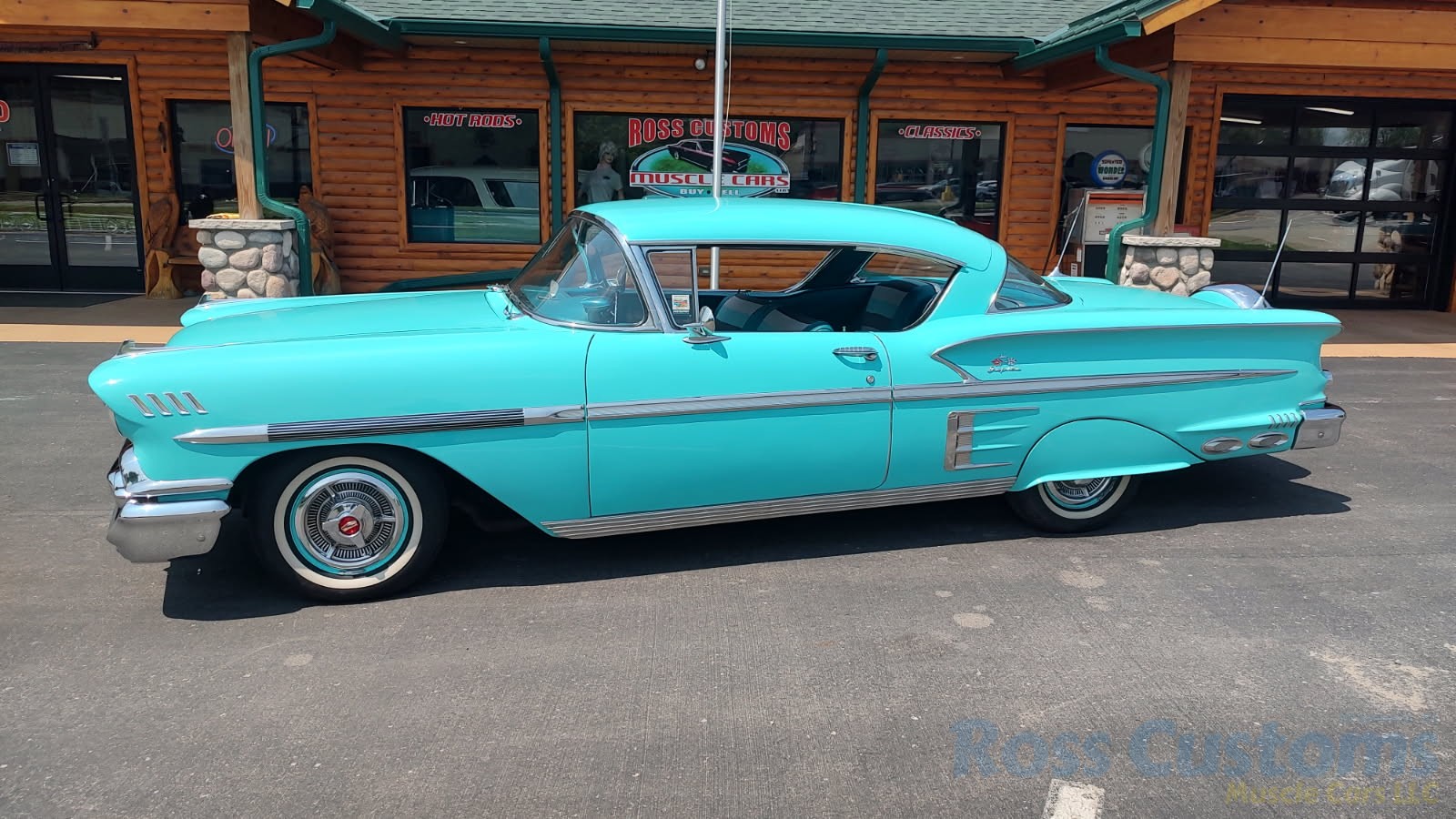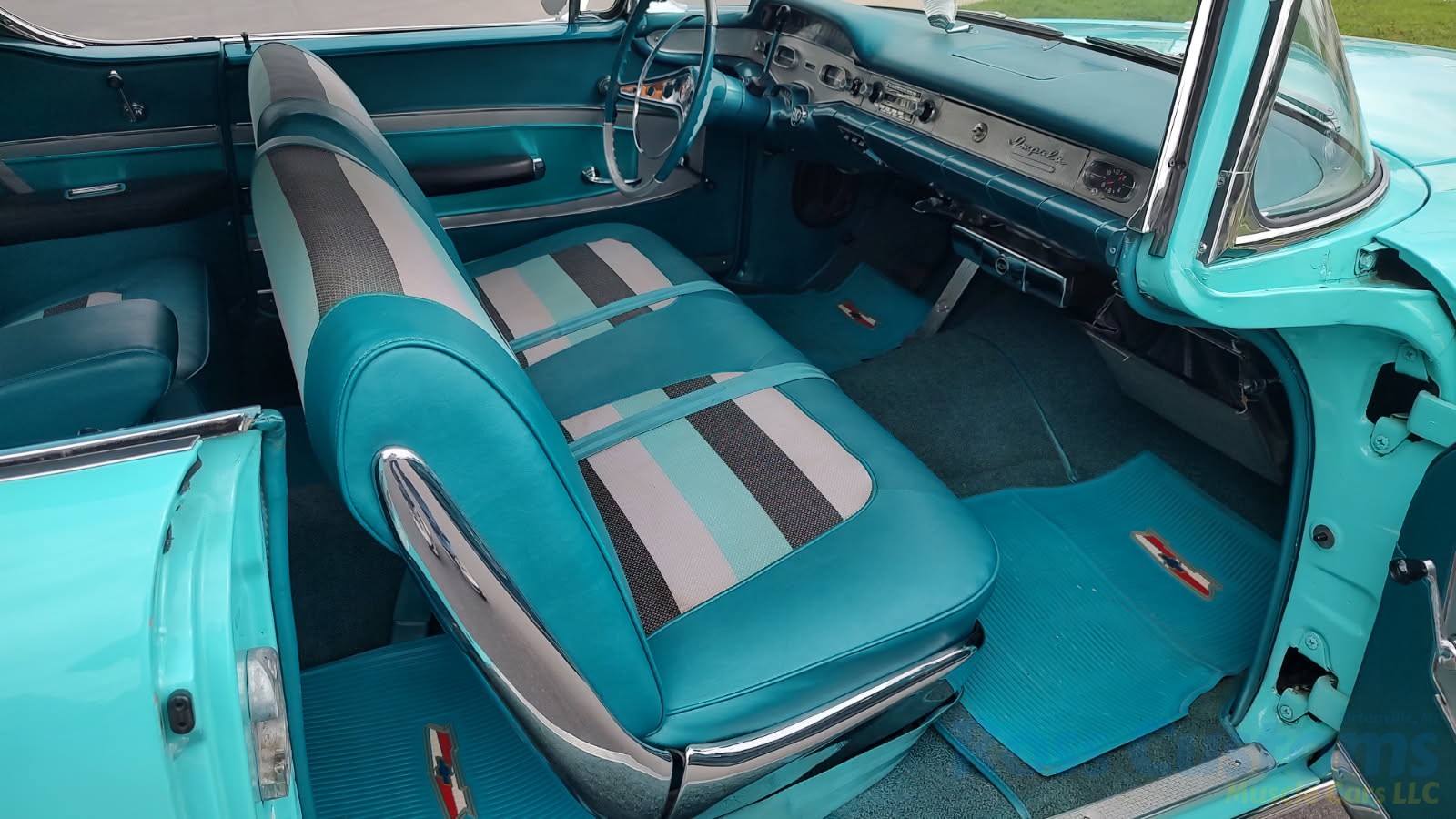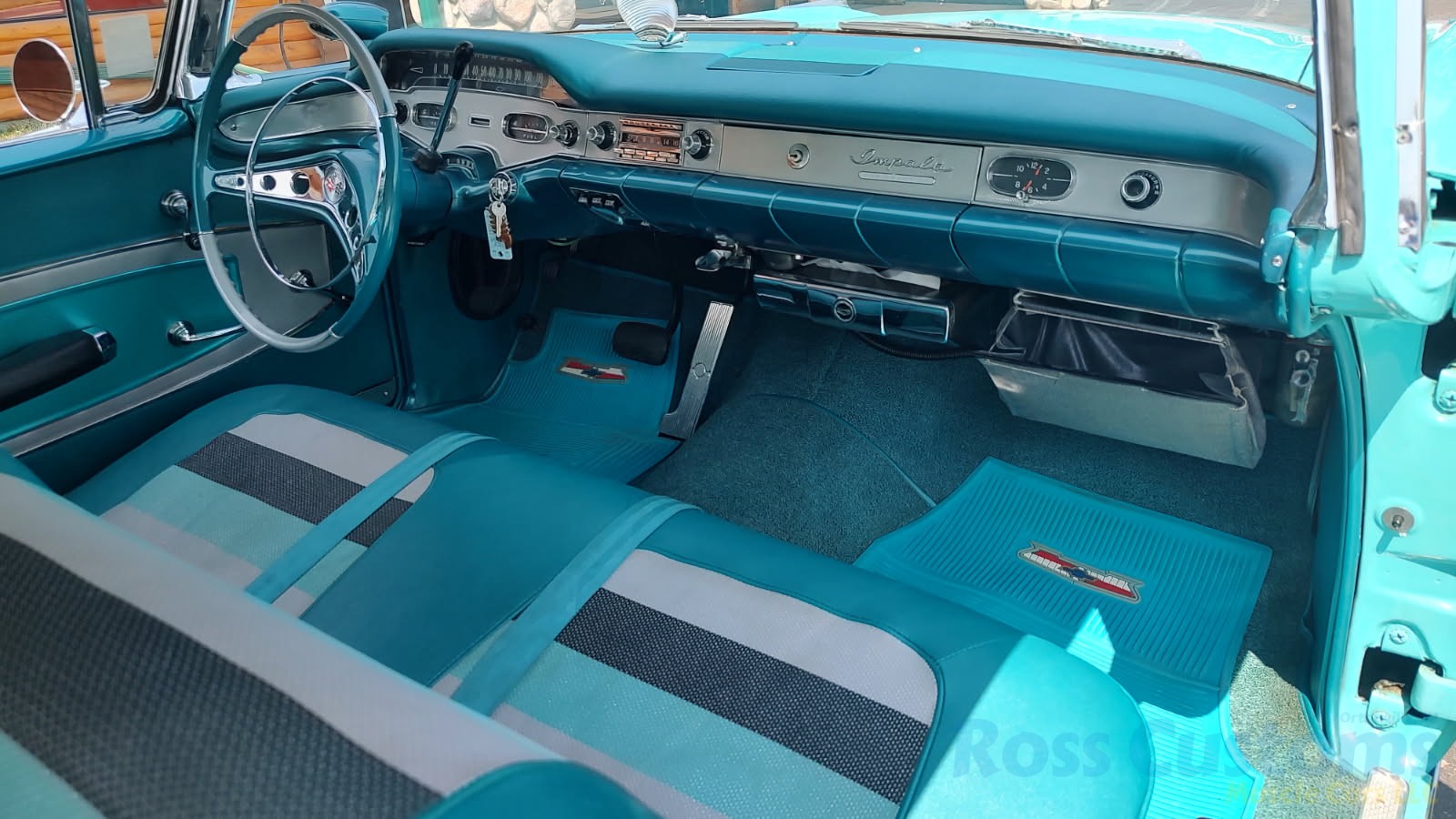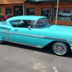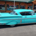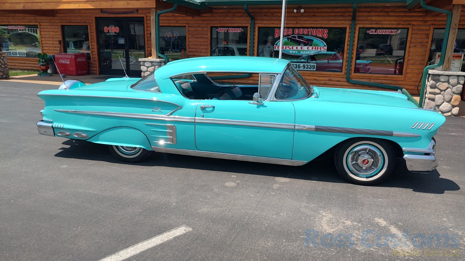 This is a very nice 58 Impala done in its original Tropic Turquoise, sanded and wheeled smooth, all glass is in excellent condition, window stainless and chrome is in excellent condition, chrome window frames are in excellent condition, rear roof vent has been re-chromed, at time of restoration had new weather stripping and window felts, side view mirrors and door handles look like new, accessory fingernail guards, upper fender spears are original in excellent condition, hood “V” and emblem have been replaced, hood bar, fender eyebrows and quarter moldings are in excellent condition; as well as parking light housings, custom tube grill – also have original grill included in sale in excellent condition, original front bumper in very good condition, all body side moldings are original and have been re-polished in excellent condition, original side gills in excellent condition; as well as rocker moldings, has optional fender shirts; also has optional side tailpipe vents, dual rear antennas, factory continental kit, deck lid emblems look like new, rear bumper has been re-chromed.