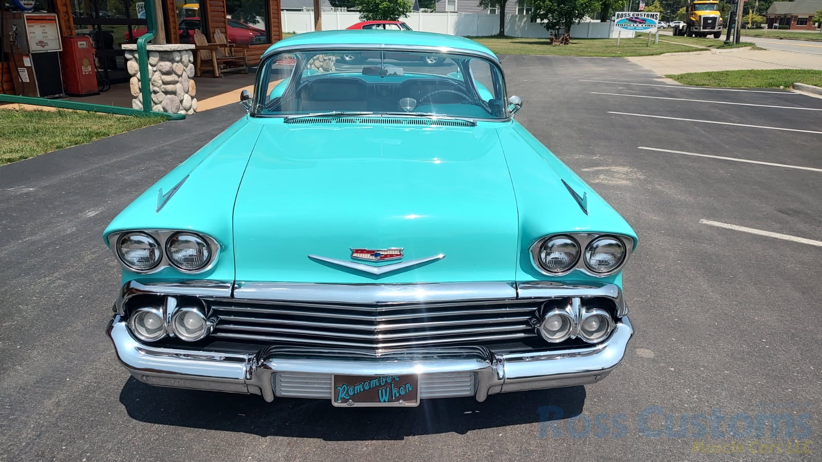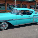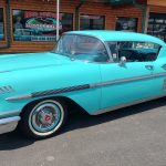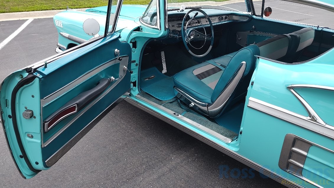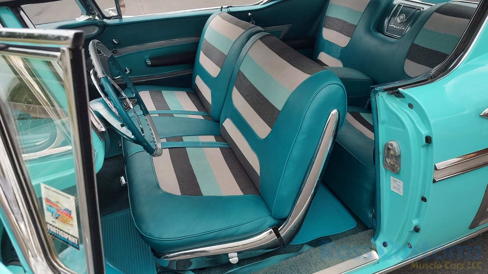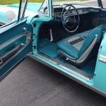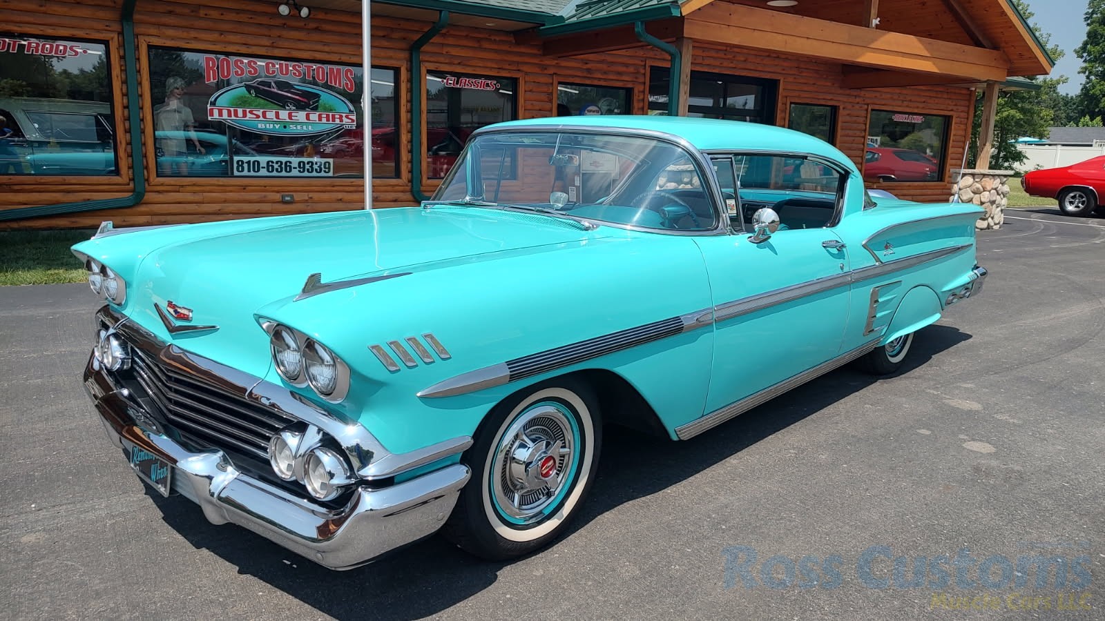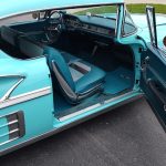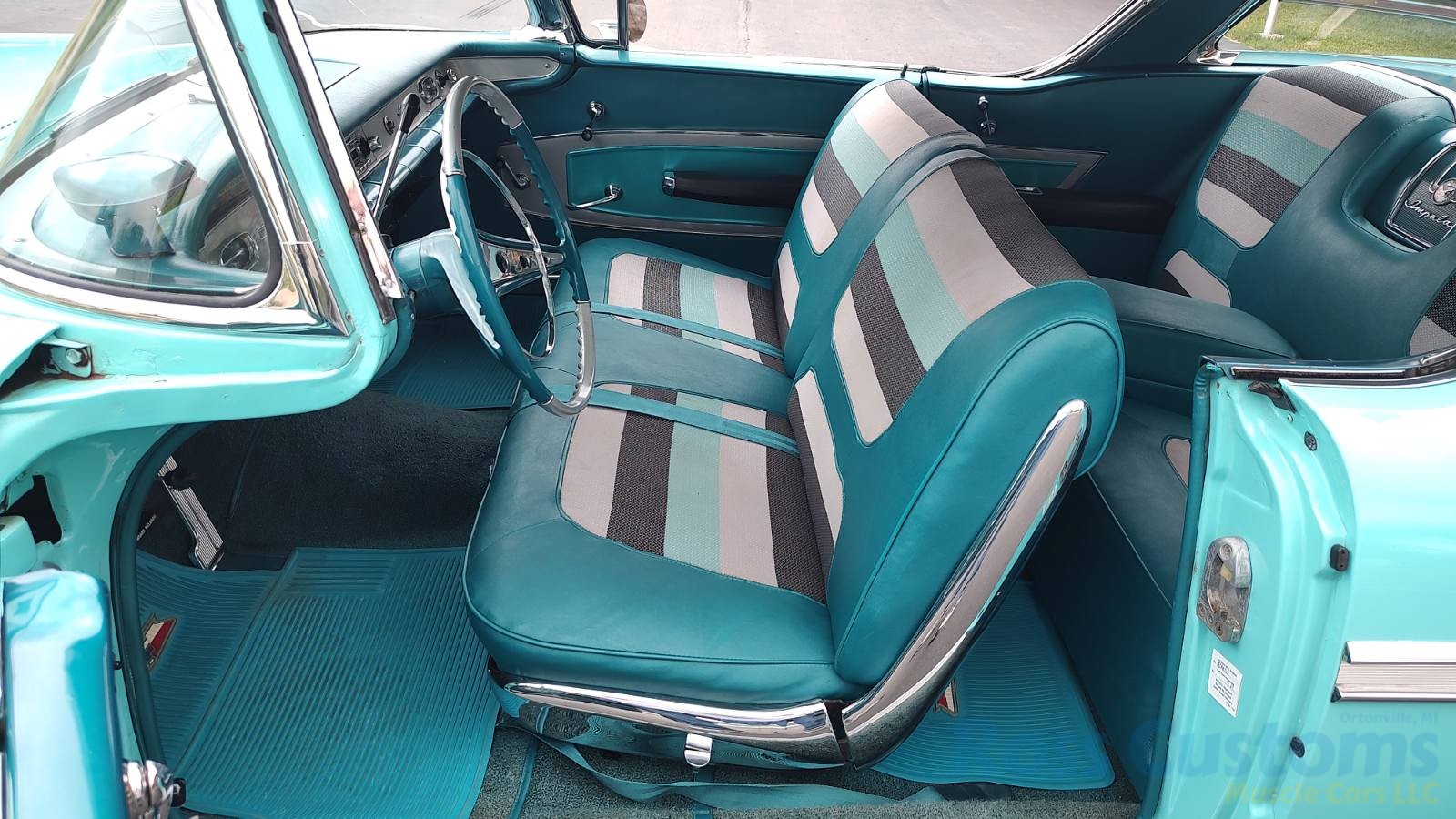 This is a very nice 58 Impala done in its original Tropic Turquoise, sanded and wheeled smooth, all glass is in excellent condition, window stainless and chrome is in excellent condition, chrome window frames are in excellent condition, rear roof vent has been re-chromed, at time of restoration had new weather stripping and window felts, side view mirrors and door handles look like new, accessory fingernail guards, upper fender spears are original in excellent condition, hood “V” and emblem have been replaced, hood bar, fender eyebrows and quarter moldings are in excellent condition; as well as parking light housings, custom tube grill – also have original grill included in sale in excellent condition, original front bumper in very good condition, all body side moldings are original and have been re-polished in excellent condition, original side gills in excellent condition; as well as rocker moldings, has optional fender shirts; also has optional side tailpipe vents, dual rear antennas, factory continental kit, deck lid emblems look like new, rear bumper has been re-chromed.