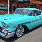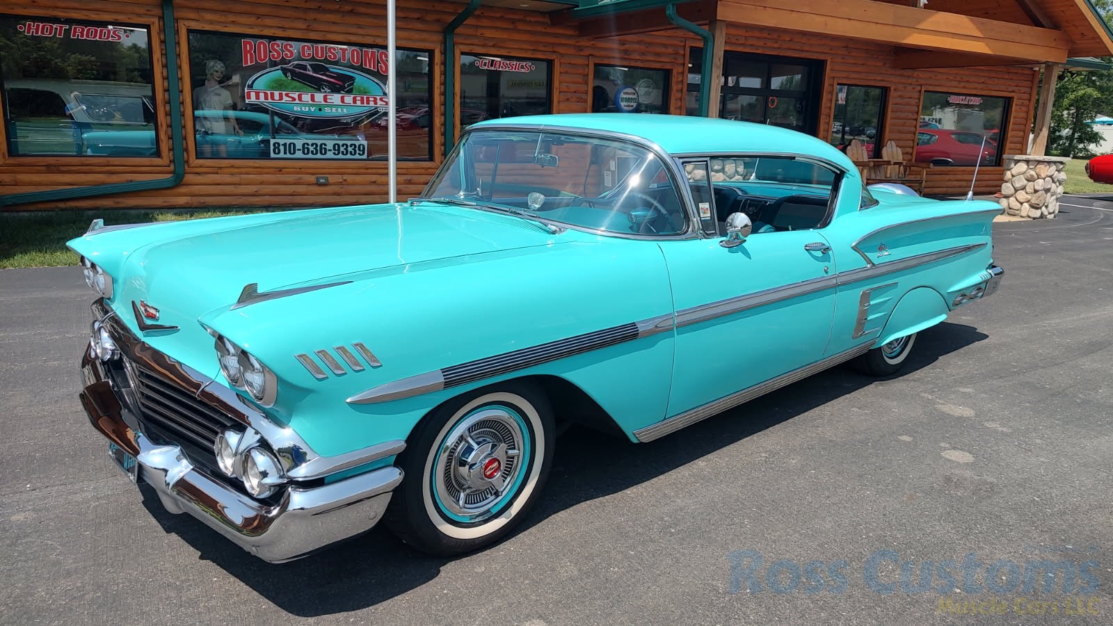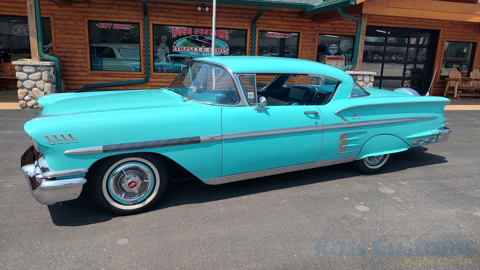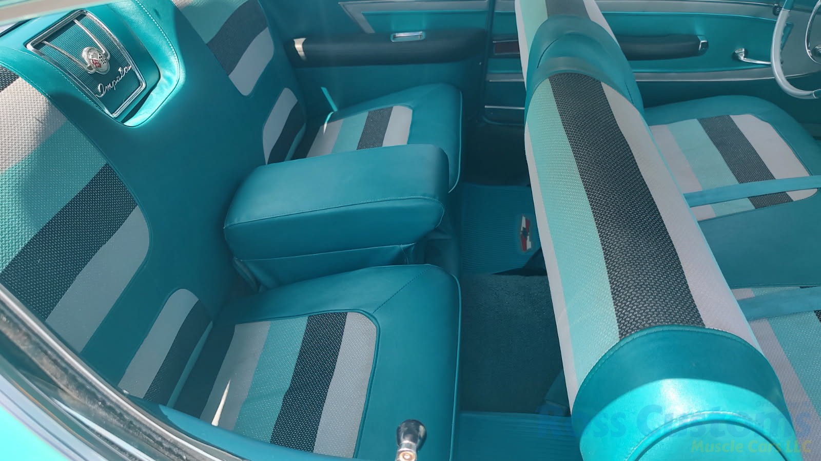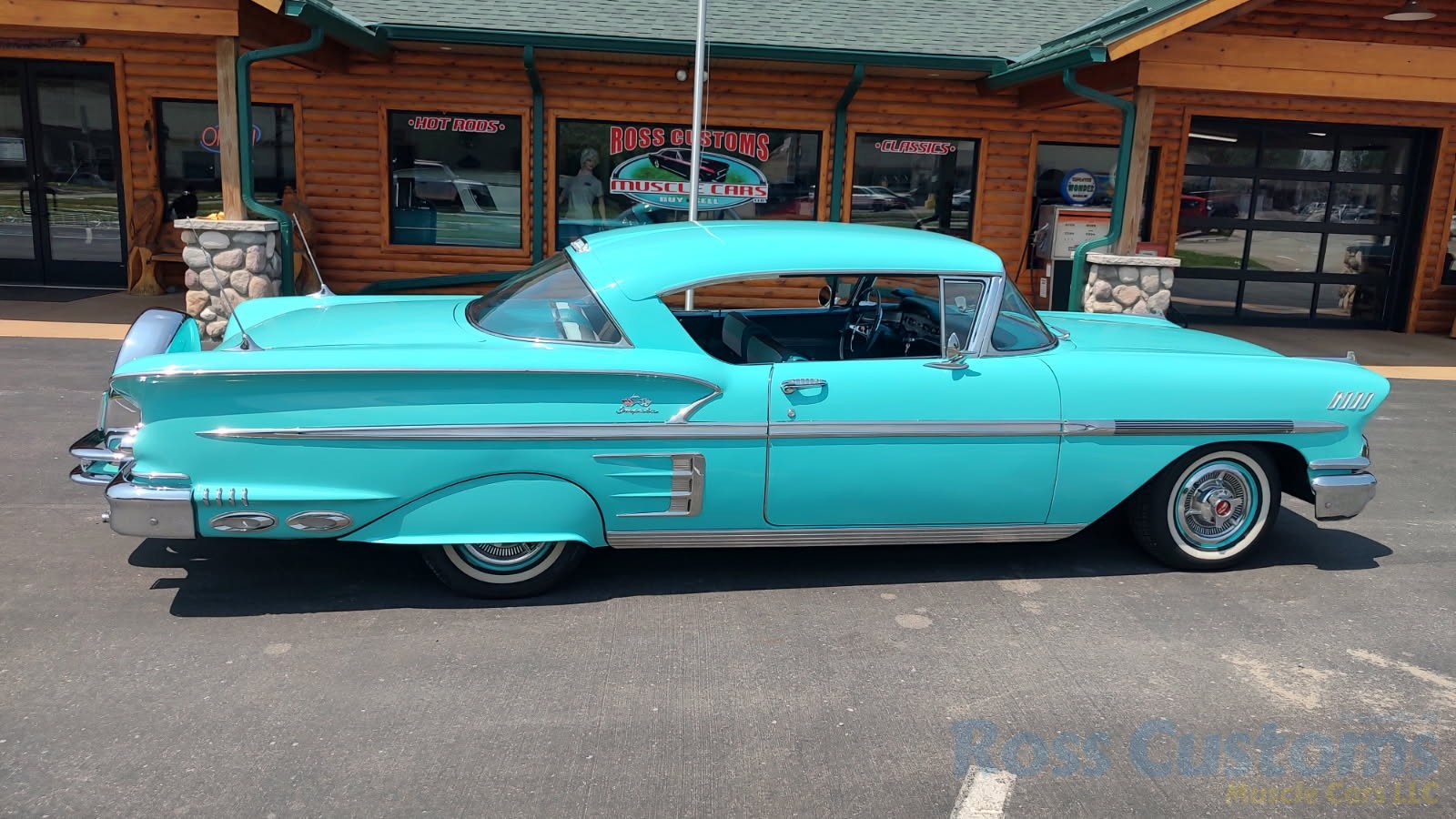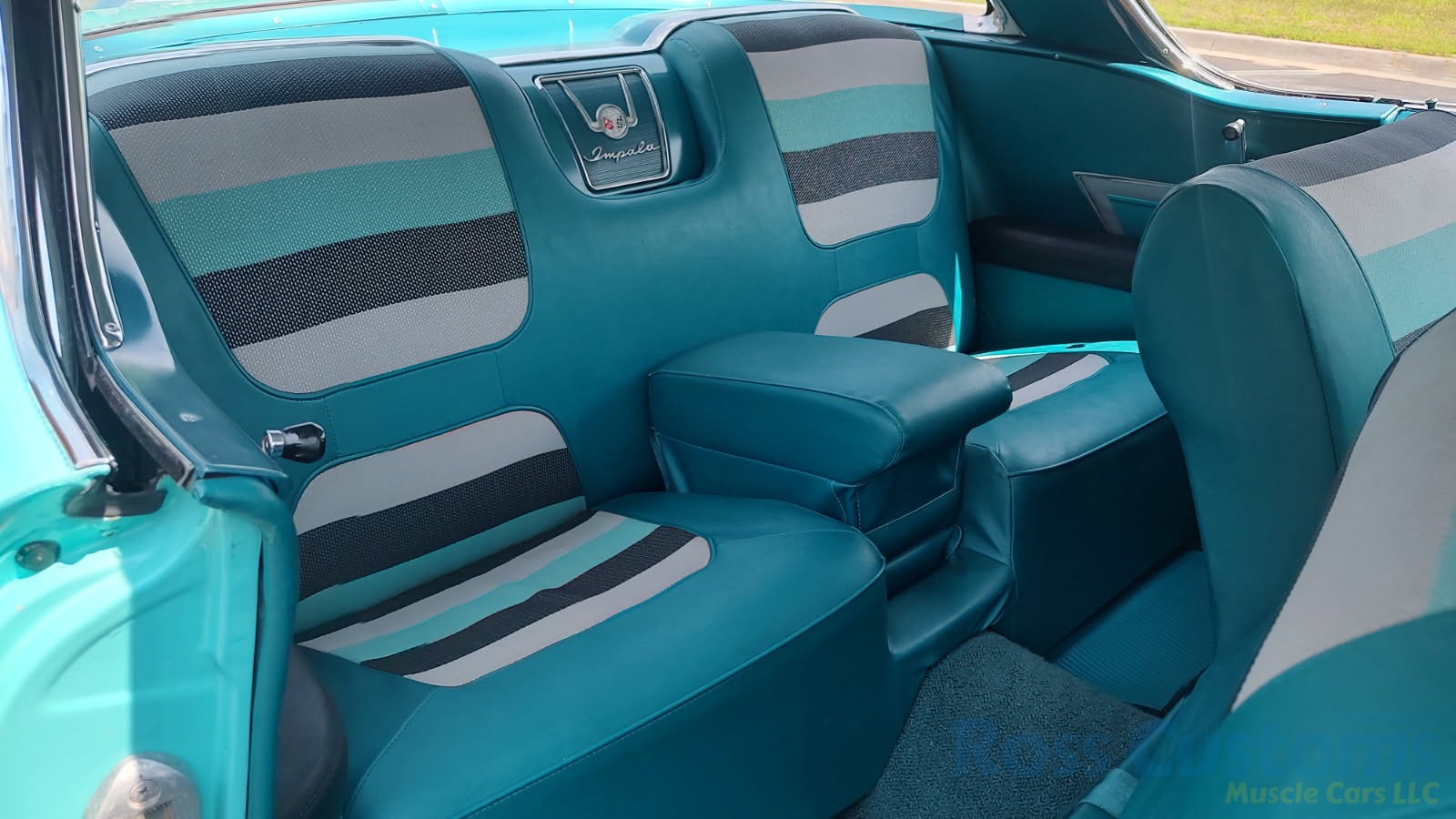 This is a very nice 58 Impala done in its original Tropic Turquoise, sanded and wheeled smooth, all glass is in excellent condition, window stainless and chrome is in excellent condition, chrome window frames are in excellent condition, rear roof vent has been re-chromed, at time of restoration had new weather stripping and window felts, side view mirrors and door handles look like new, accessory fingernail guards, upper fender spears are original in excellent condition, hood “V” and emblem have been replaced, hood bar, fender eyebrows and quarter moldings are in excellent condition; as well as parking light housings, custom tube grill – also have original grill included in sale in excellent condition, original front bumper in very good condition, all body side moldings are original and have been re-polished in excellent condition, original side gills in excellent condition; as well as rocker moldings, has optional fender shirts; also has optional side tailpipe vents, dual rear antennas, factory continental kit, deck lid emblems look like new, rear bumper has been re-chromed.