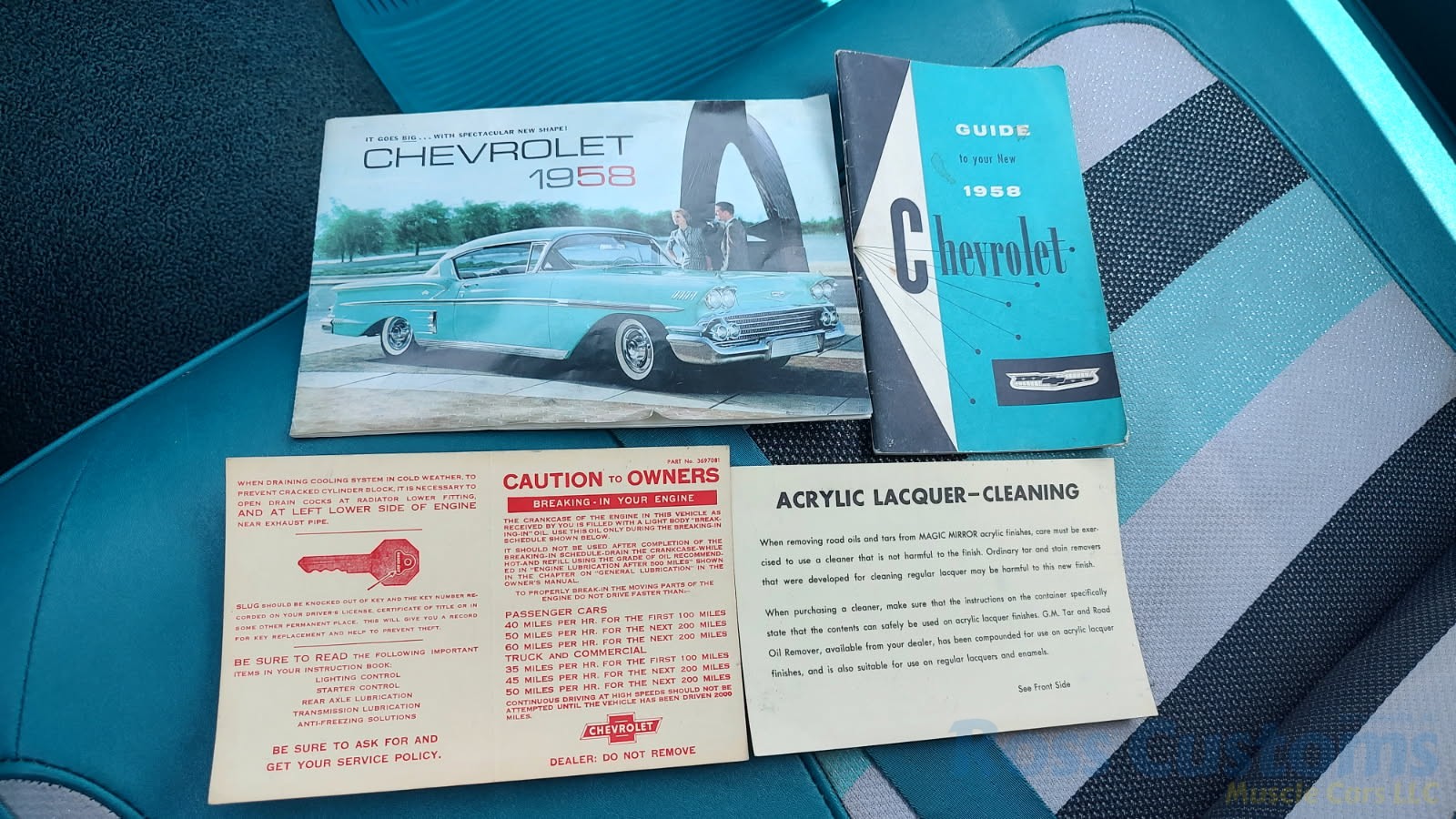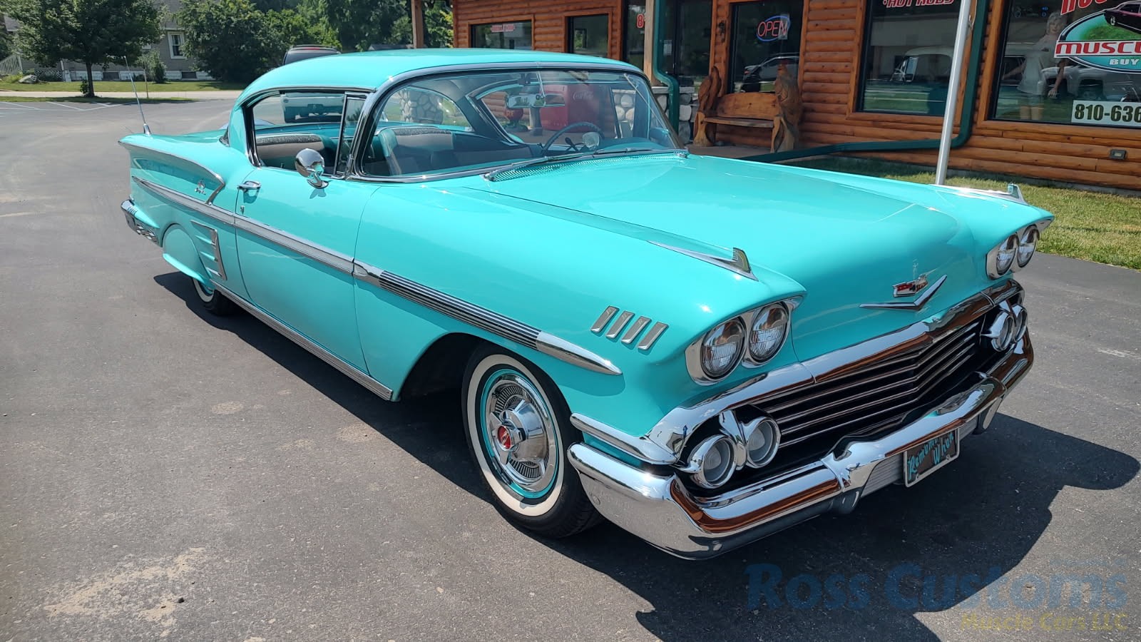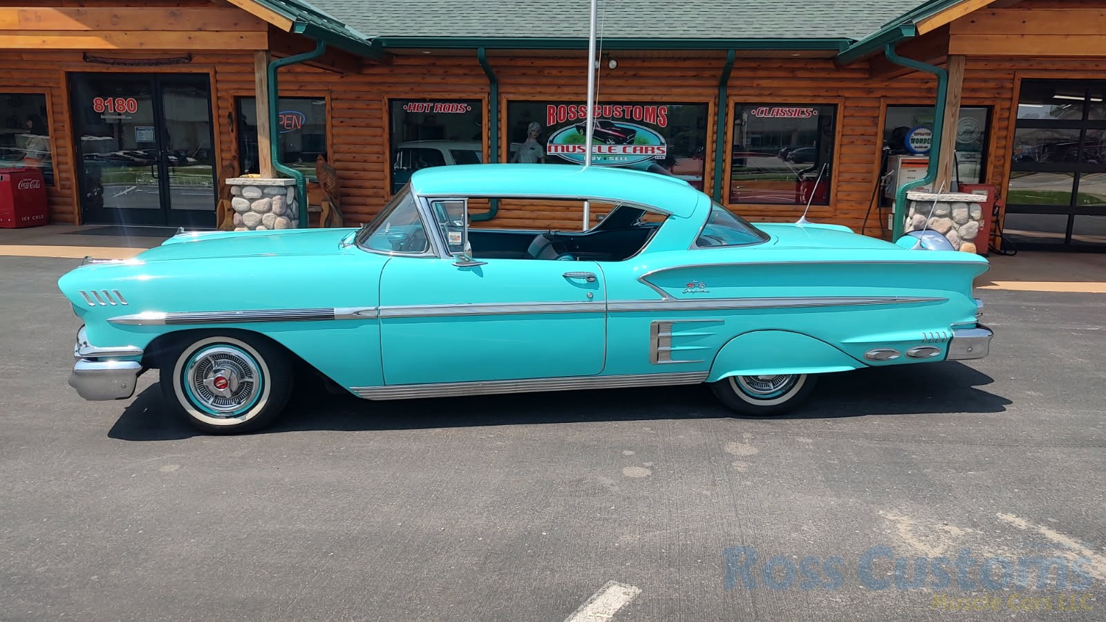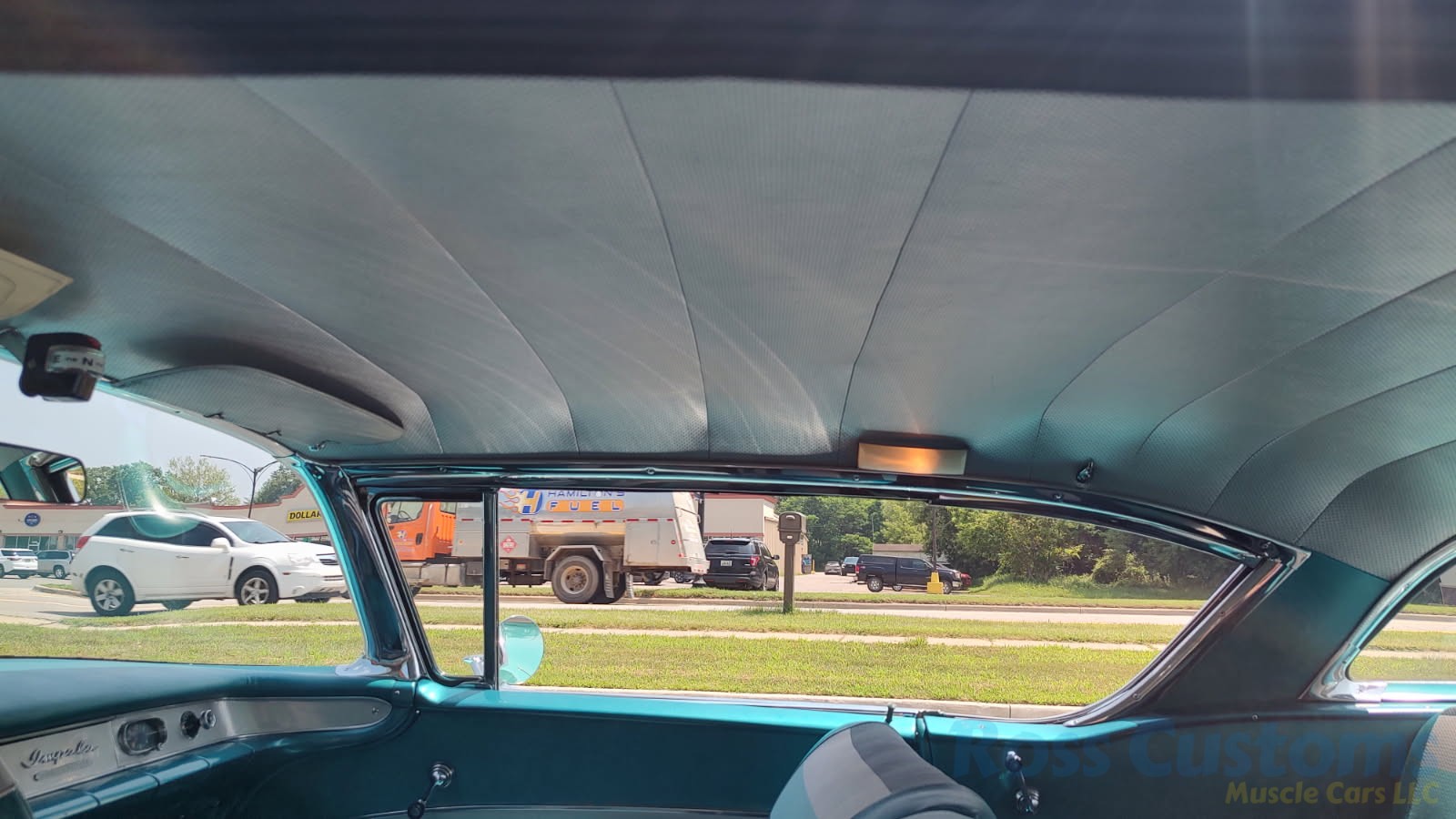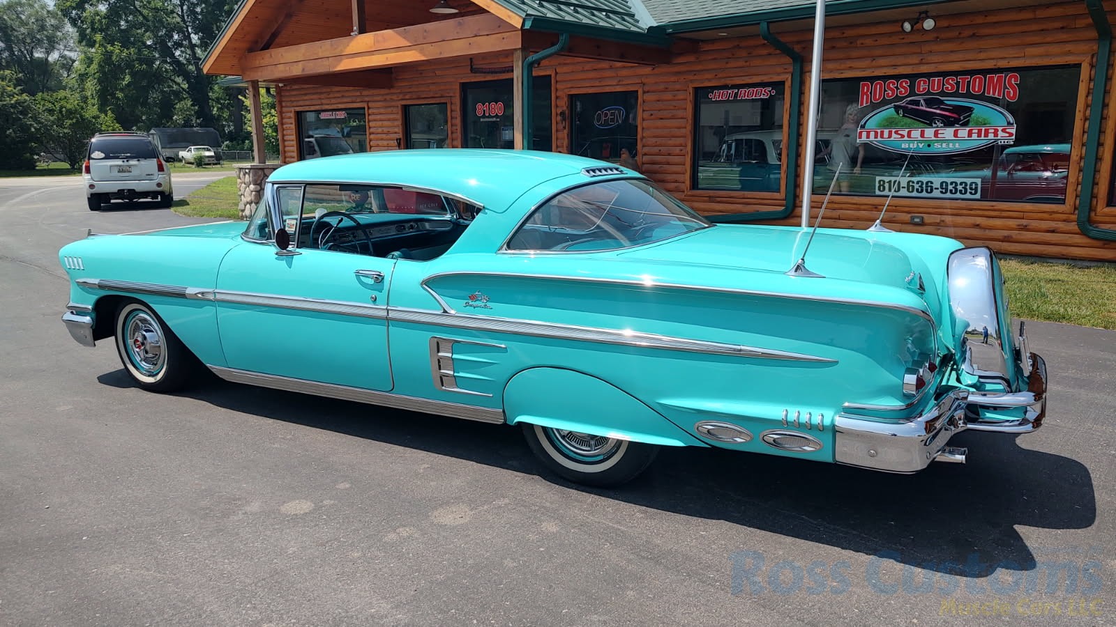This is a very nice 58 Impala done in its original Tropic Turquoise, sanded and wheeled smooth, all glass is in excellent condition, window stainless and chrome is in excellent condition, chrome window frames are in excellent condition, rear roof vent has been re-chromed, at time of restoration had new weather stripping and window felts, side view mirrors and door handles look like new, accessory fingernail guards, upper fender spears are original in excellent condition, hood “V” and emblem have been replaced, hood bar, fender eyebrows and quarter moldings are in excellent condition; as well as parking light housings, custom tube grill – also have original grill included in sale in excellent condition, original front bumper in very good condition, all body side moldings are original and have been re-polished in excellent condition, original side gills in excellent condition; as well as rocker moldings, has optional fender shirts; also has optional side tailpipe vents, dual rear antennas, factory continental kit, deck lid emblems look like new, rear bumper has been re-chromed.