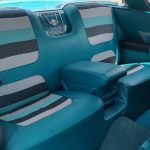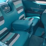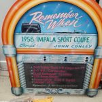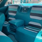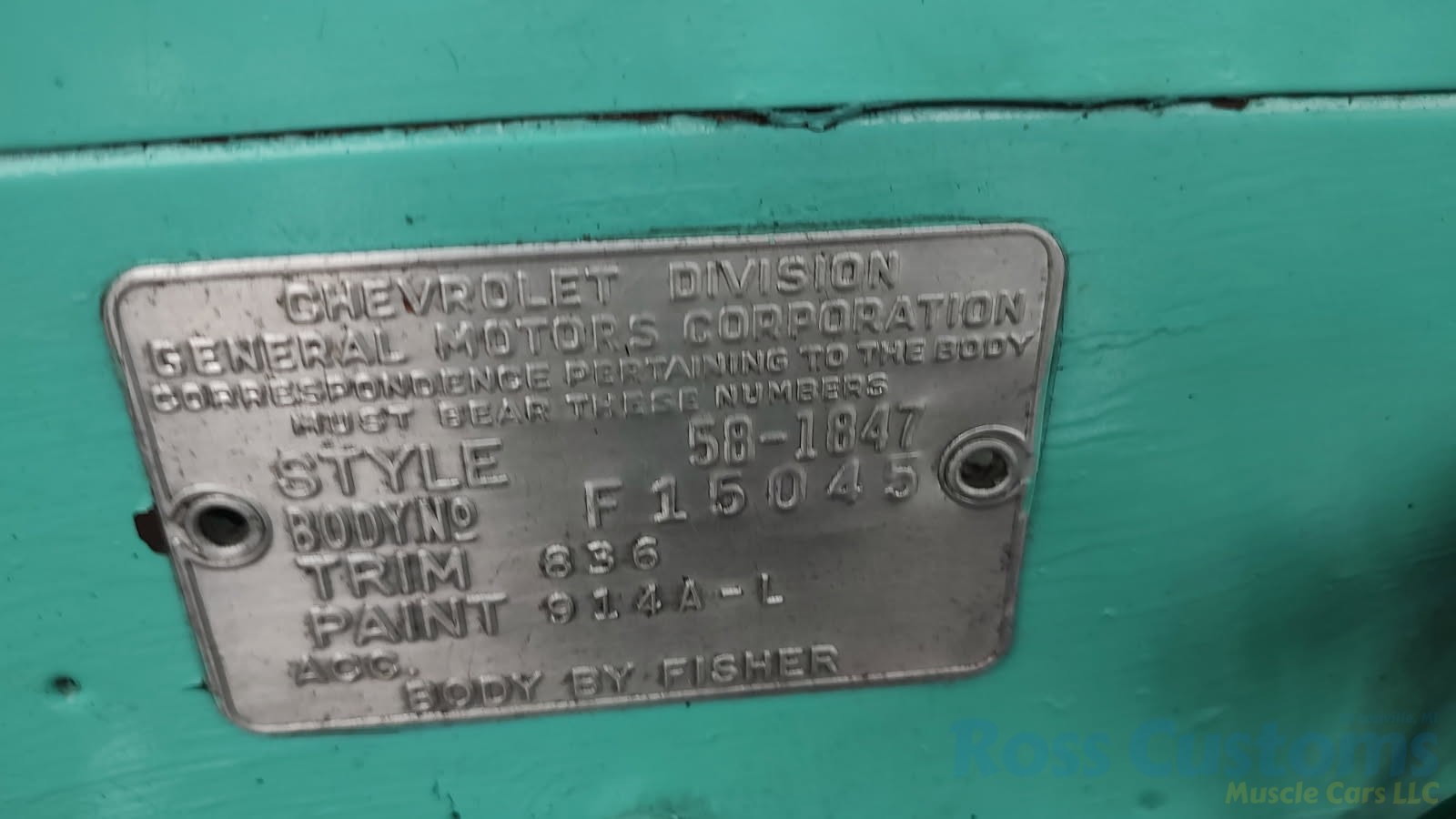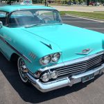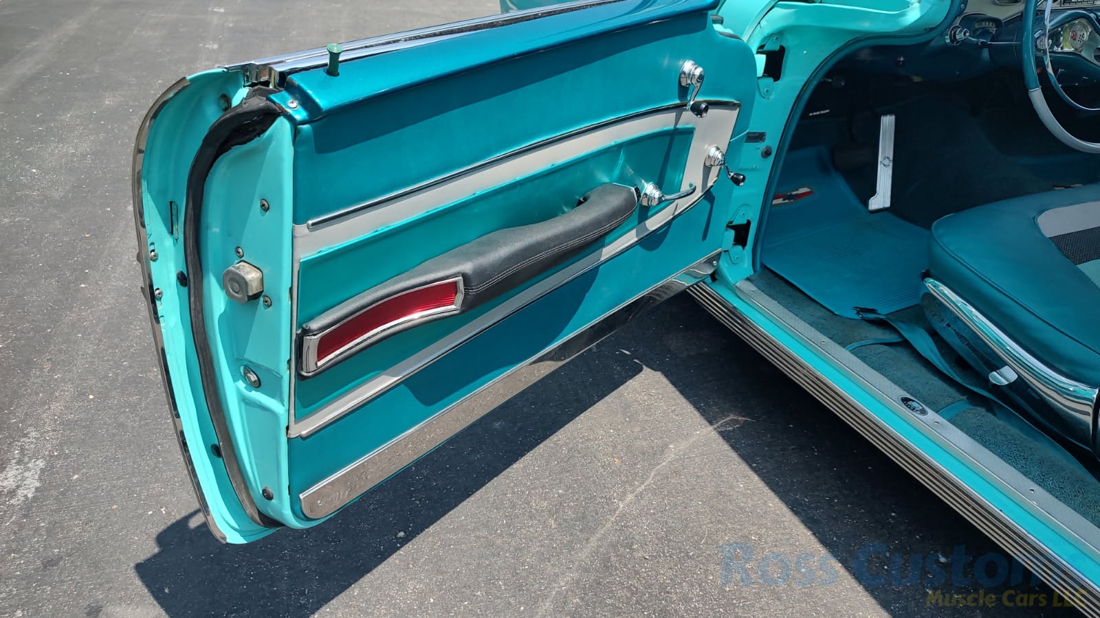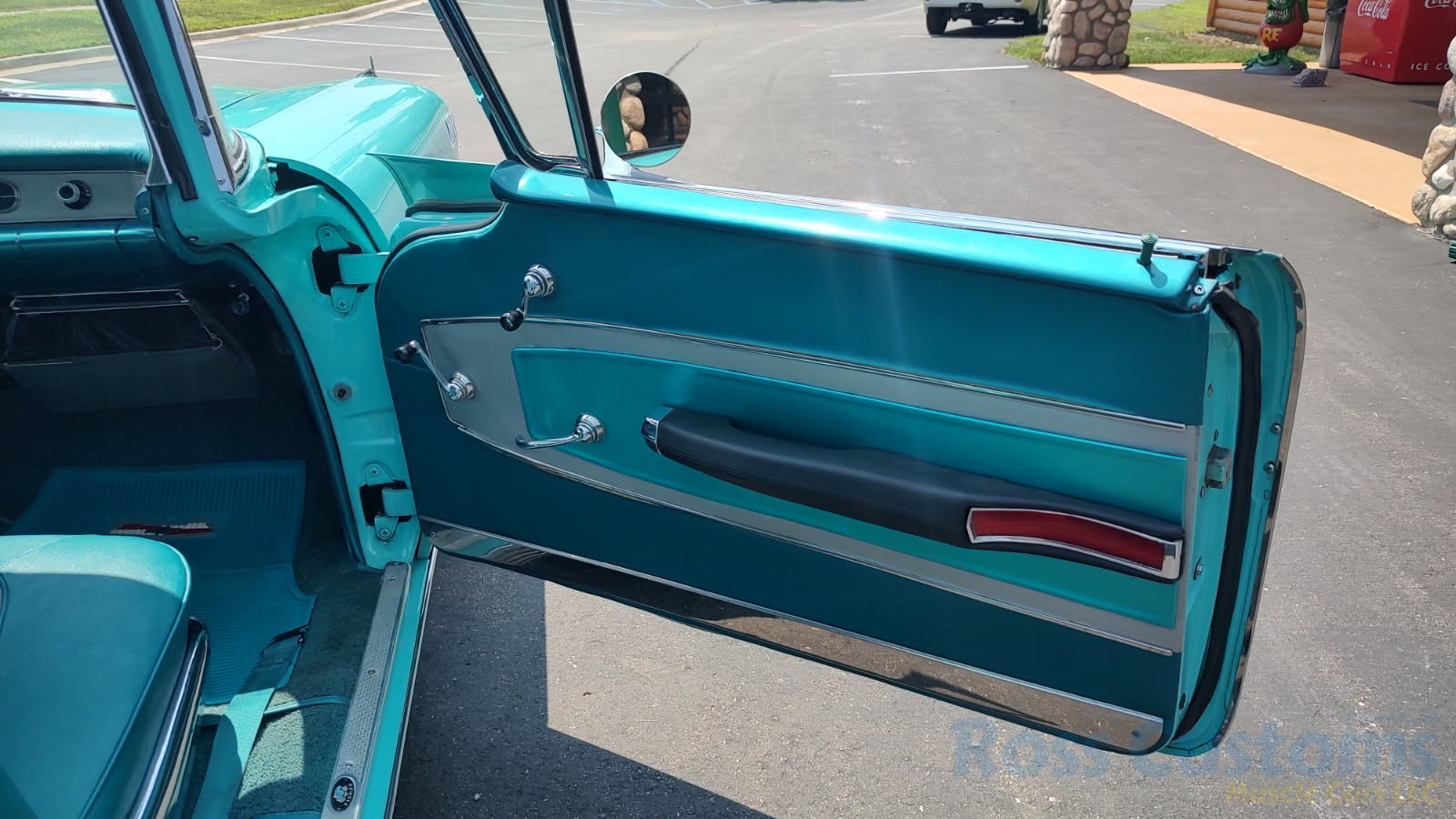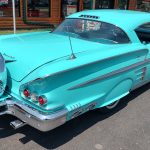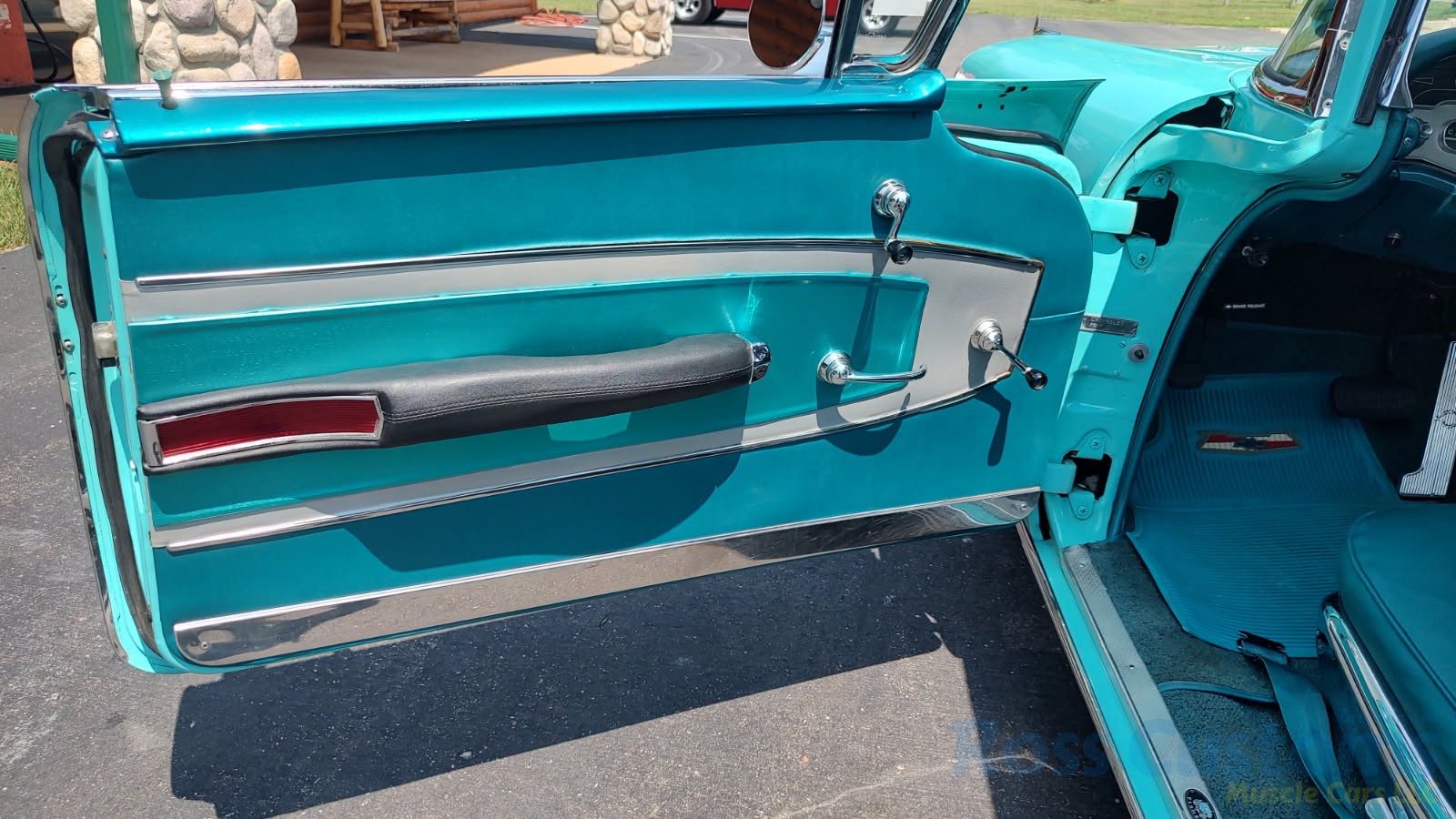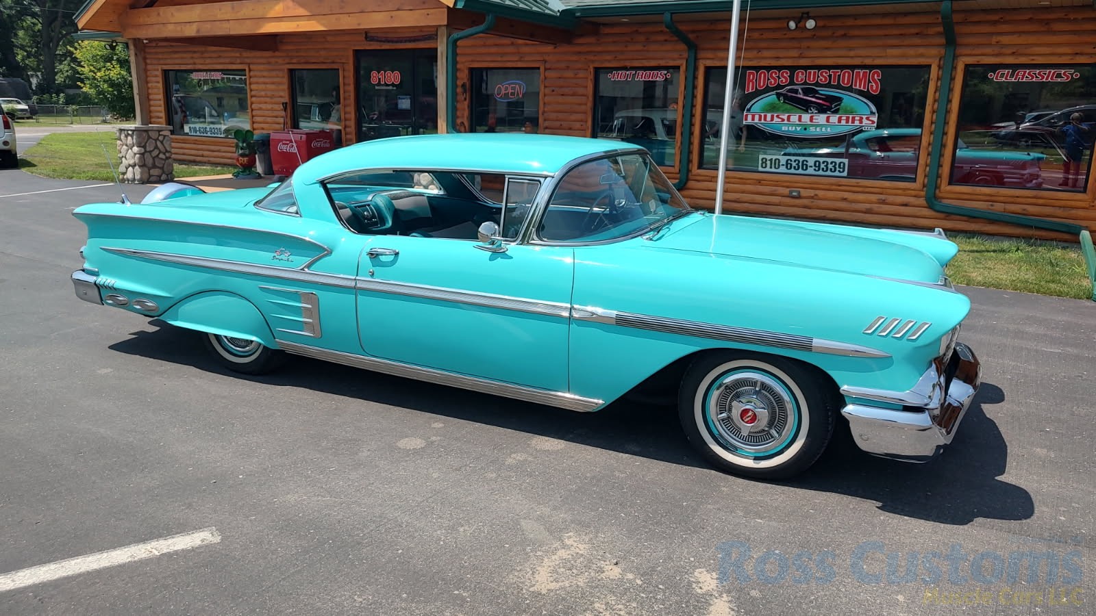 This is a very nice 58 Impala done in its original Tropic Turquoise, sanded and wheeled smooth, all glass is in excellent condition, window stainless and chrome is in excellent condition, chrome window frames are in excellent condition, rear roof vent has been re-chromed, at time of restoration had new weather stripping and window felts, side view mirrors and door handles look like new, accessory fingernail guards, upper fender spears are original in excellent condition, hood “V” and emblem have been replaced, hood bar, fender eyebrows and quarter moldings are in excellent condition; as well as parking light housings, custom tube grill – also have original grill included in sale in excellent condition, original front bumper in very good condition, all body side moldings are original and have been re-polished in excellent condition, original side gills in excellent condition; as well as rocker moldings, has optional fender shirts; also has optional side tailpipe vents, dual rear antennas, factory continental kit, deck lid emblems look like new, rear bumper has been re-chromed.