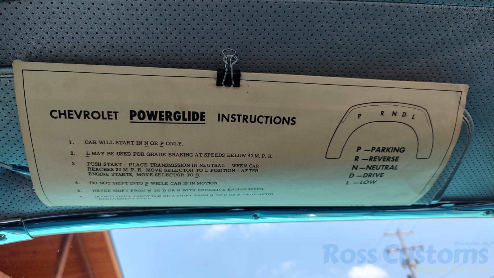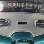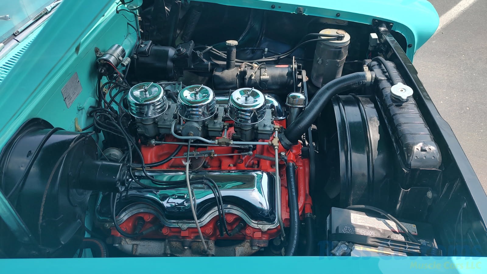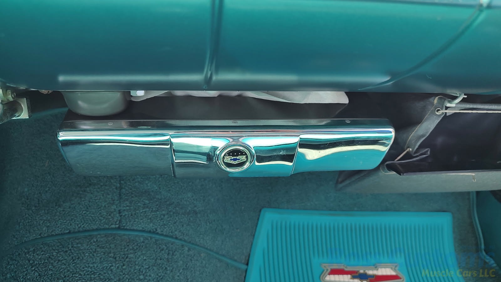 Under the hood we have the original 348 which has been rebuilt, factory Tri-Power, updated PerTronix ignition, chrome valve covers and air cleaners – also have factory Tri-Power air cleaner, has factory power brakes, power steering, optional windshield glass reservoir, factory heavy duty Harrison radiator with correct shroud and fan, this strong 348 is backed up with its original 2 speed factory power glide trans, factory exhaust manifolds in dual exhaust out the back with stainless tips.