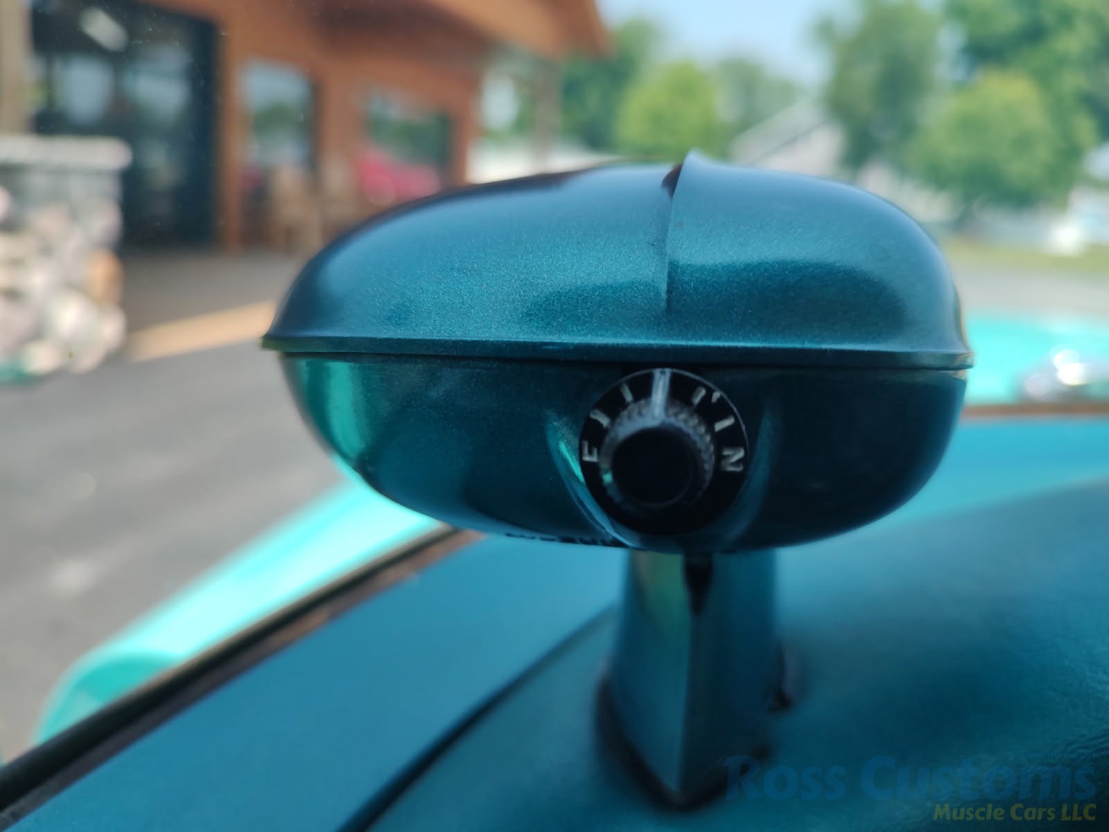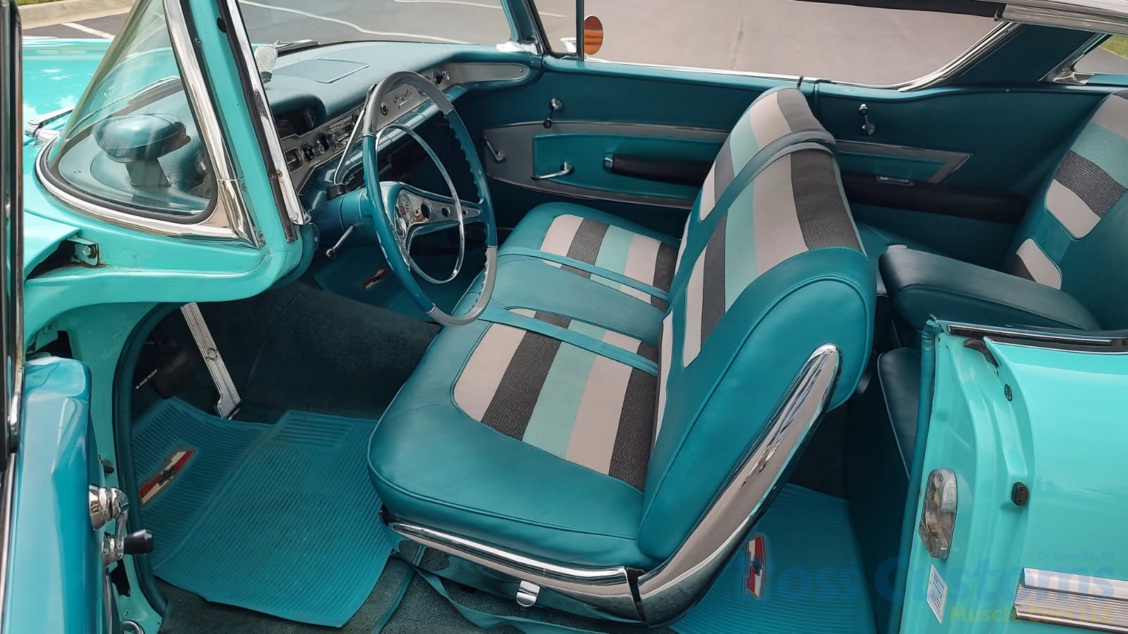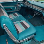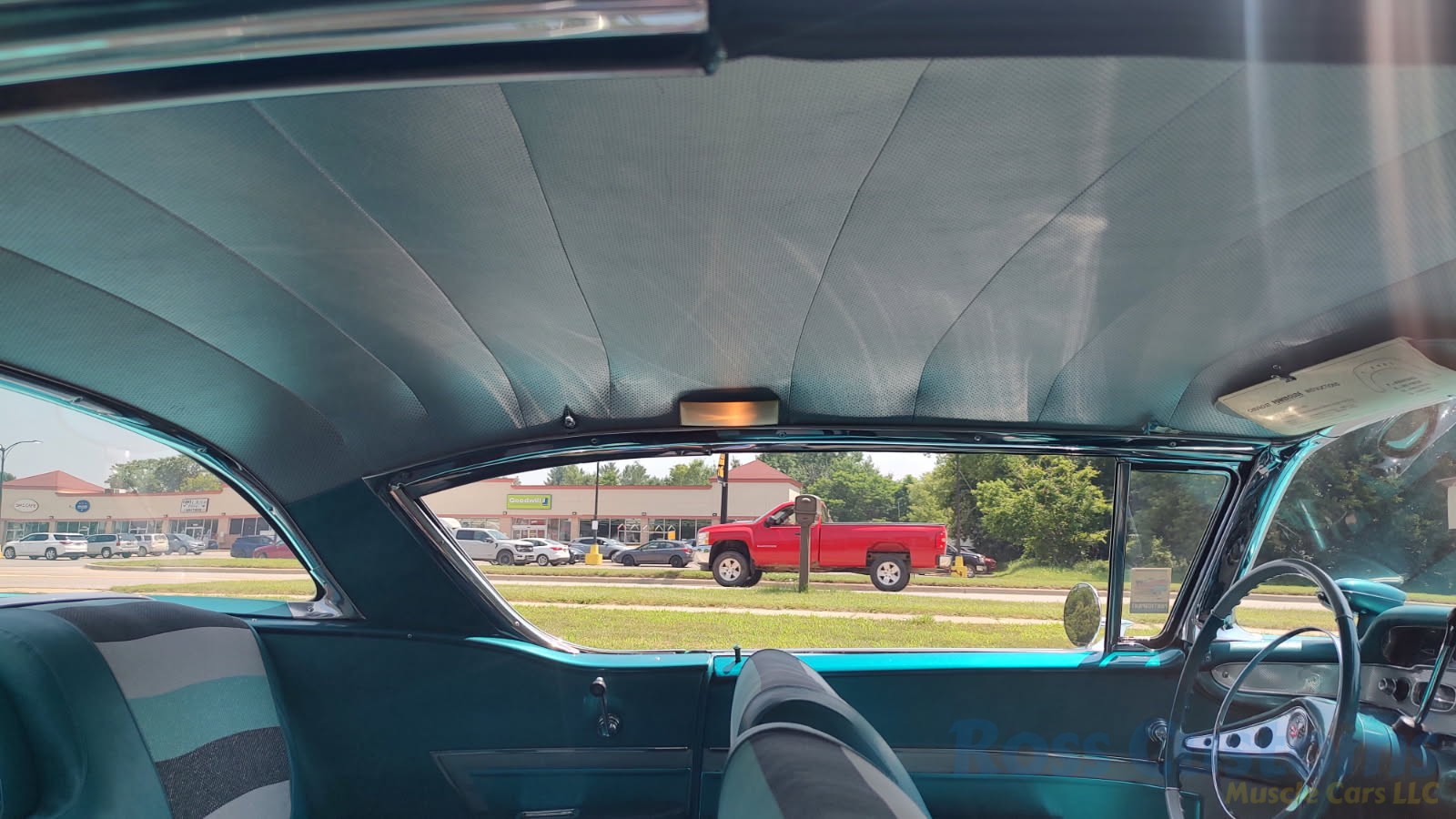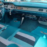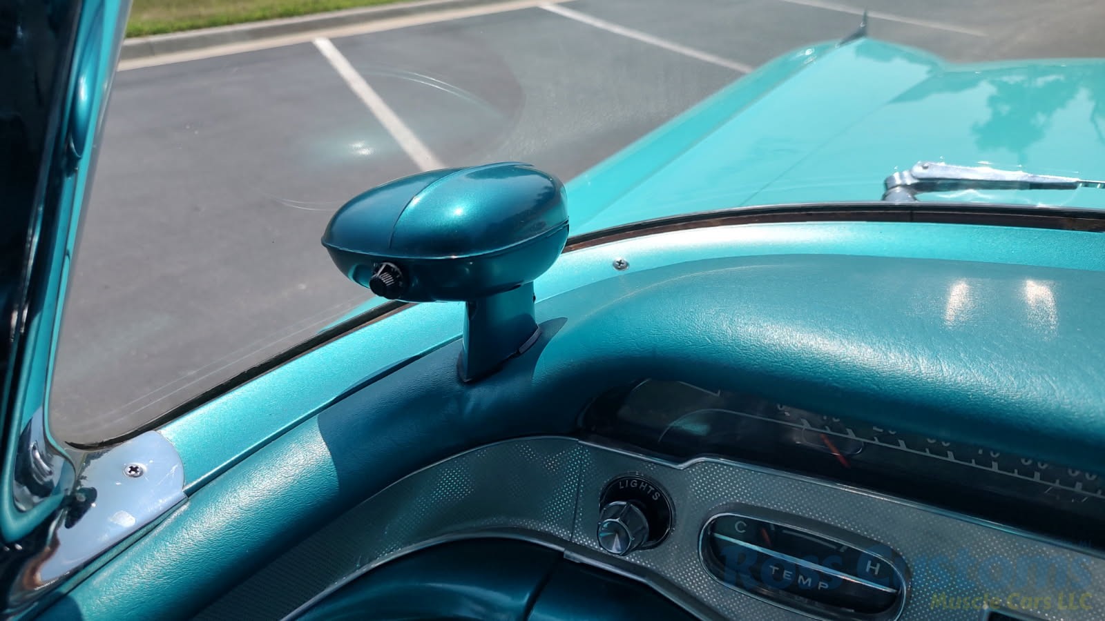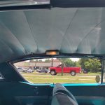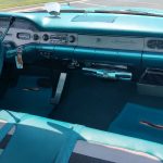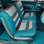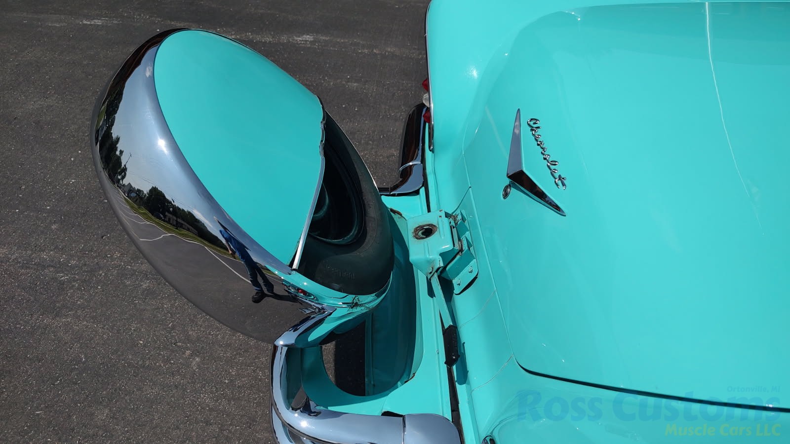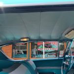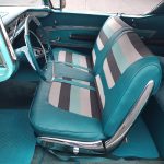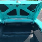 Factory tri-tone interior which was replaced at time of restoration, dash housing is in excellent condition, all dash trim is original in excellent condition, optional padded dash, optional headlight dimmer and traffic light clamshell, updated with Wonder Bar AM/FM radio; also has front and rear speaker switch, optional vacuum ashtray – which works, optional Kleenex dispenser and map pocket, speedo shows 70,760, headliner and visors in excellent condition, all headliner stainless trim also in excellent condition, front and rear door panels look like new; as well as seat covers, updated with front seat belts, carpet in good condition, deluxe floor mats, sill placed have also been replaced, optional hood and trunk lights.
