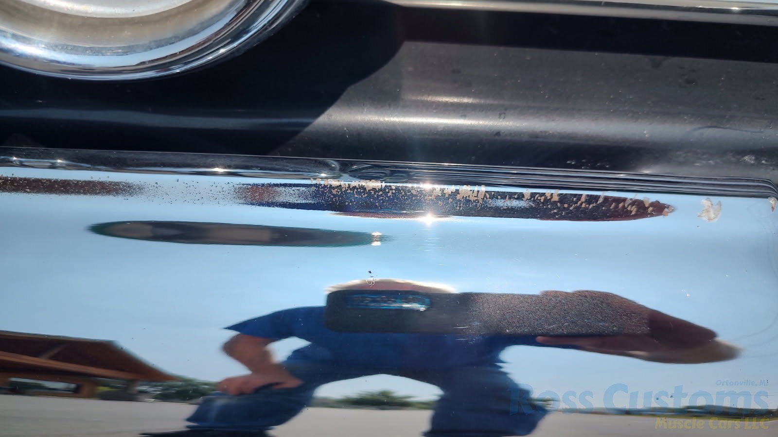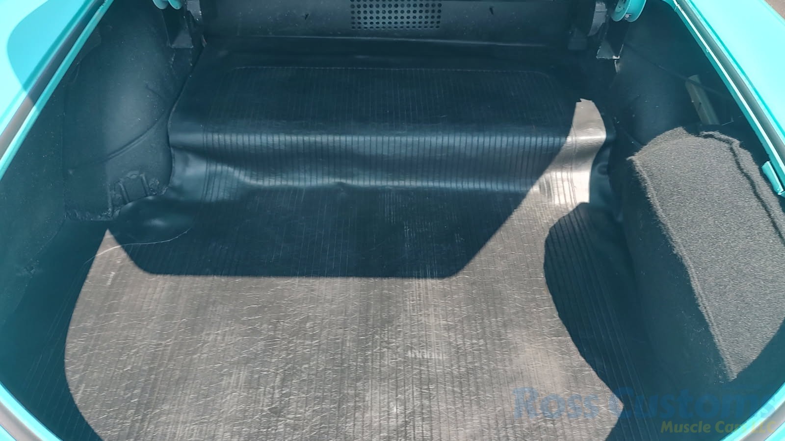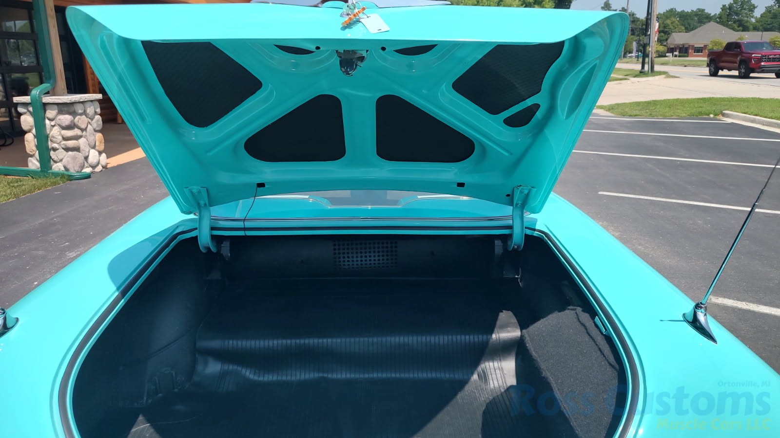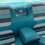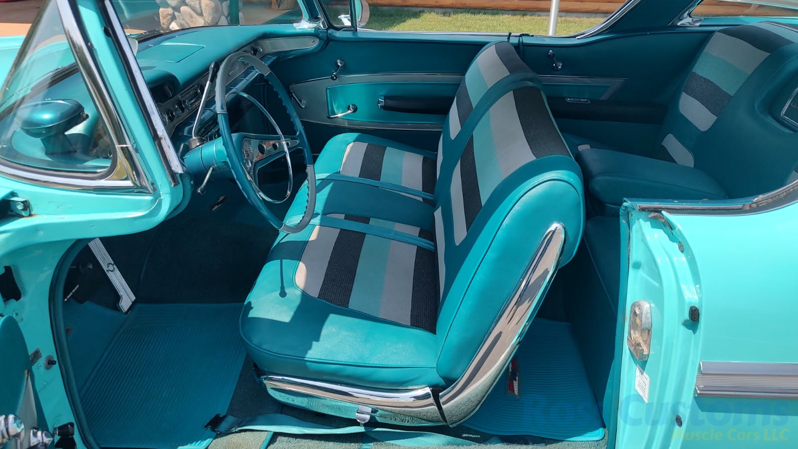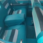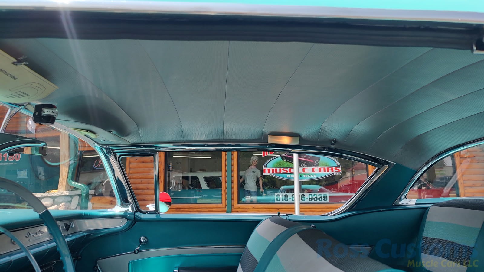 Factory tri-tone interior which was replaced at time of restoration, dash housing is in excellent condition, all dash trim is original in excellent condition, optional padded dash, optional headlight dimmer and traffic light clamshell, updated with Wonder Bar AM/FM radio; also has front and rear speaker switch, optional vacuum ashtray – which works, optional Kleenex dispenser and map pocket, speedo shows 70,760, headliner and visors in excellent condition, all headliner stainless trim also in excellent condition, front and rear door panels look like new; as well as seat covers, updated with front seat belts, carpet in good condition, deluxe floor mats, sill placed have also been replaced, optional hood and trunk lights.