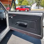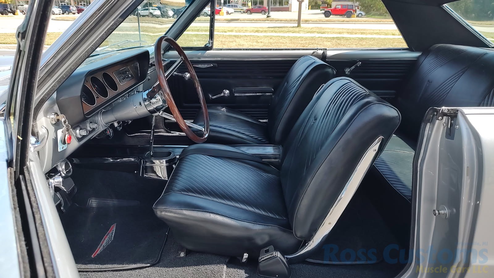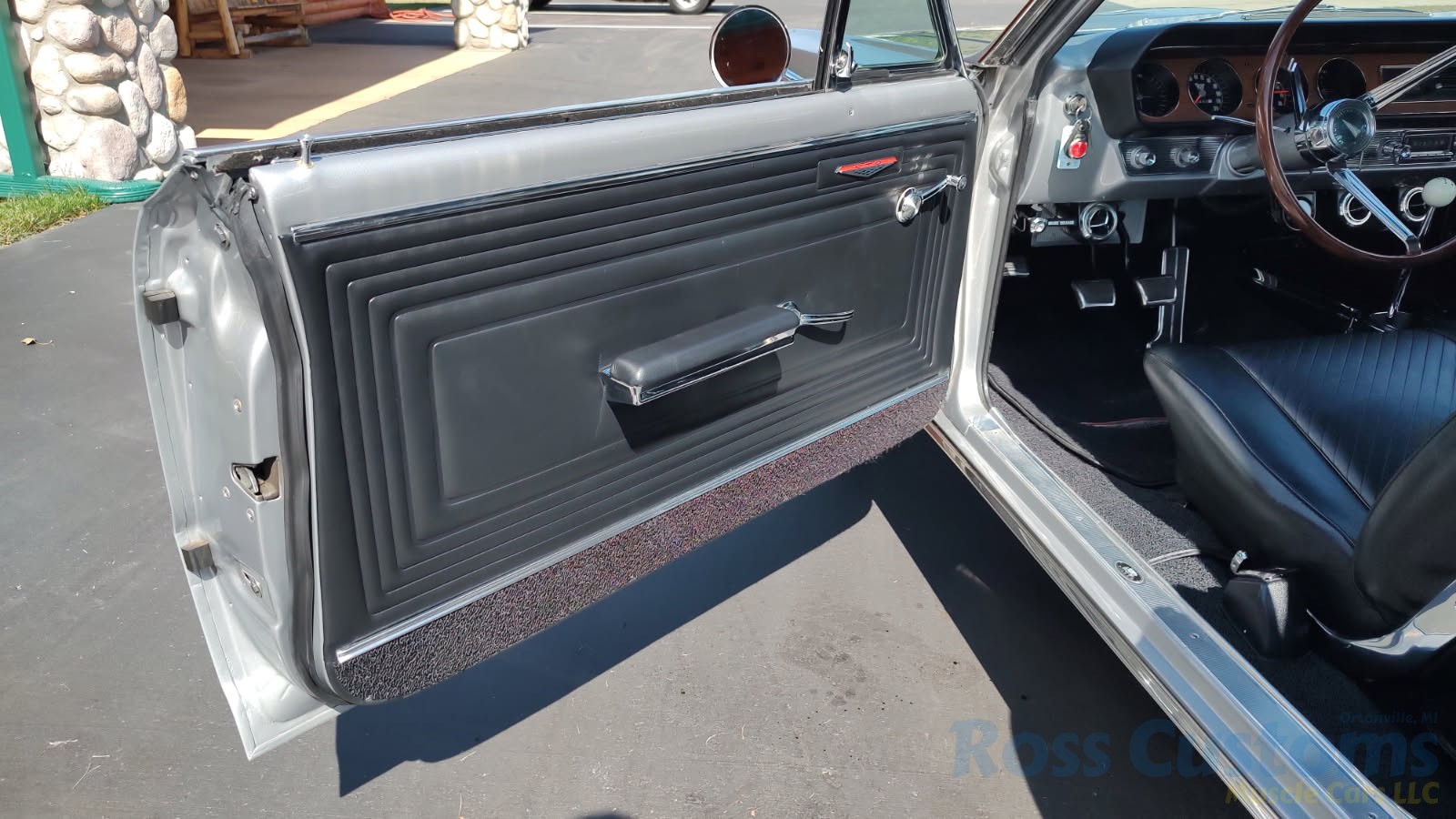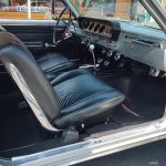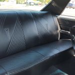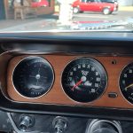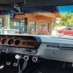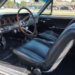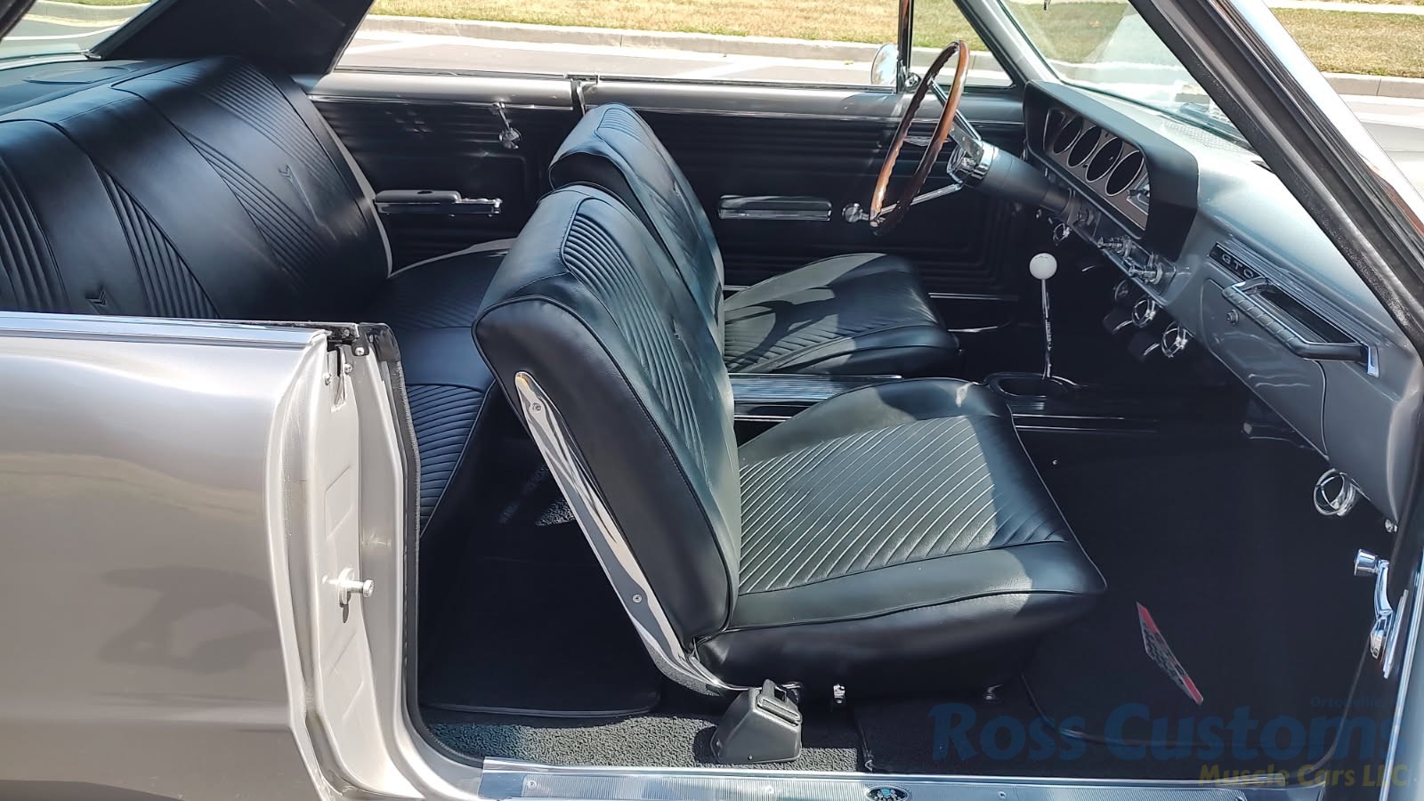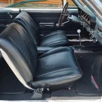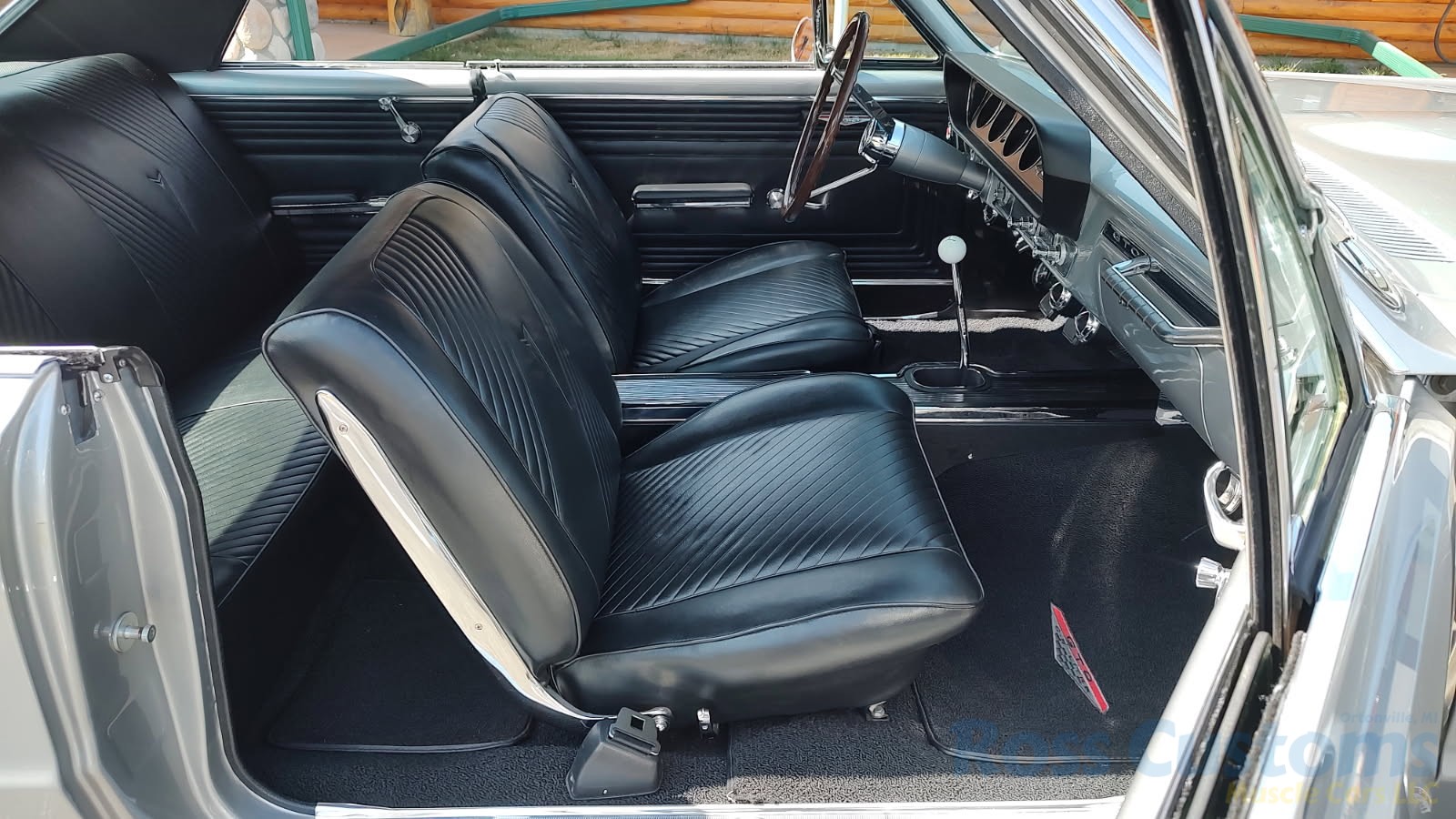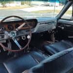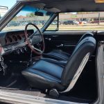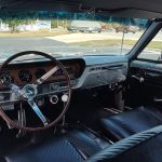 Factory black bucket seat console interior, dash has ben refinished, new factory wiring harness throughout, factory instrument cluster with full gauge package – showing 3,498 miles, dash bezel and woodgrain in excellent condition; as well as all other dash trim, factory appearing retro-fit AM/FM stereo with IPOD capability, 3 spoke deluxe wood steering wheel in excellent condition, nicely updated with Vintage heat and AC, vents nicely mounted under dash, deluxe pedal package, new headliner, visors and sail panels, deluxe package shelf with factory speaker grills, new front and rear door panels, new front and rear arm rest and bases, new front and rear seat covers; as well as foam, updated with GM front seat belts, original 4 speed center console in excellent condition with factory appearing Hurst shifter, new carpet and custom floor mats, new sill plates.