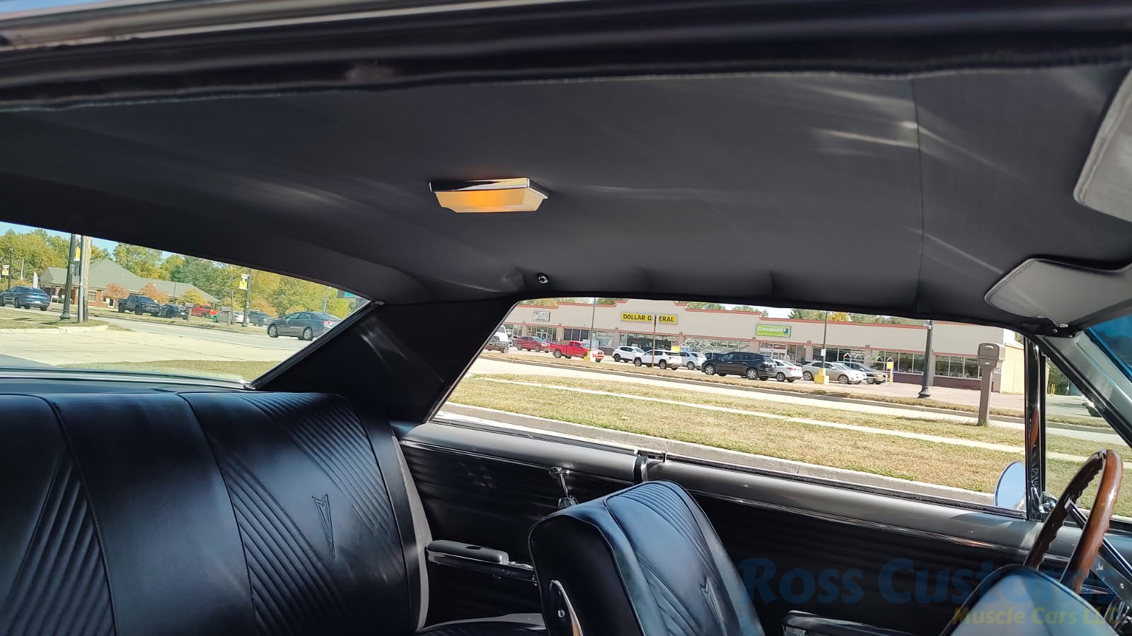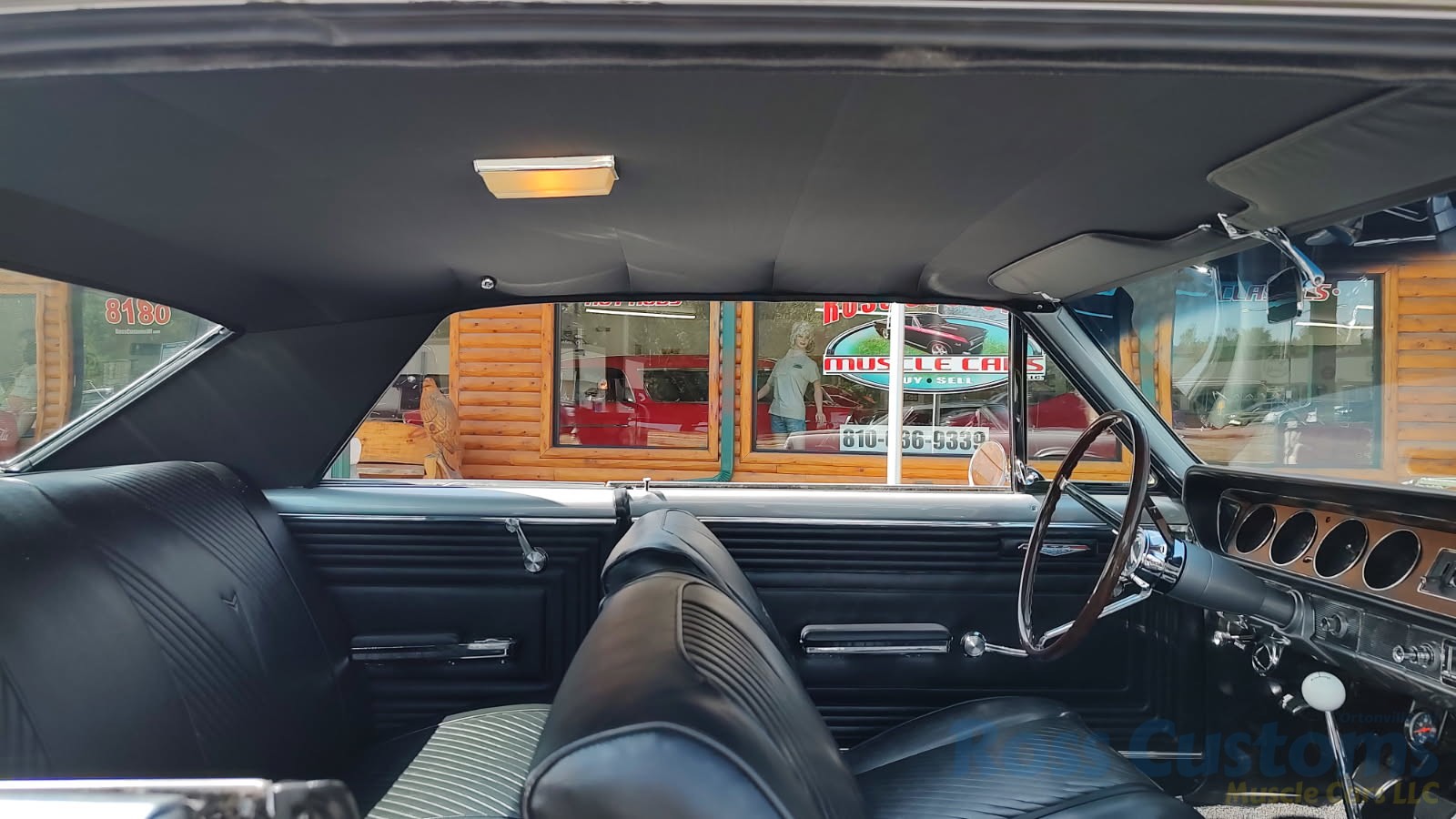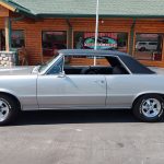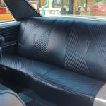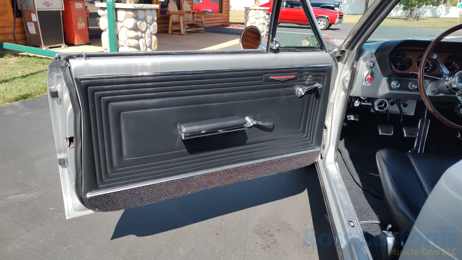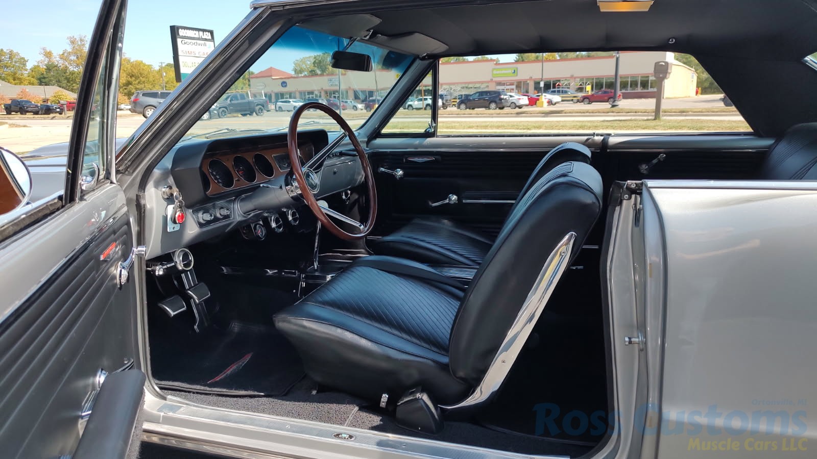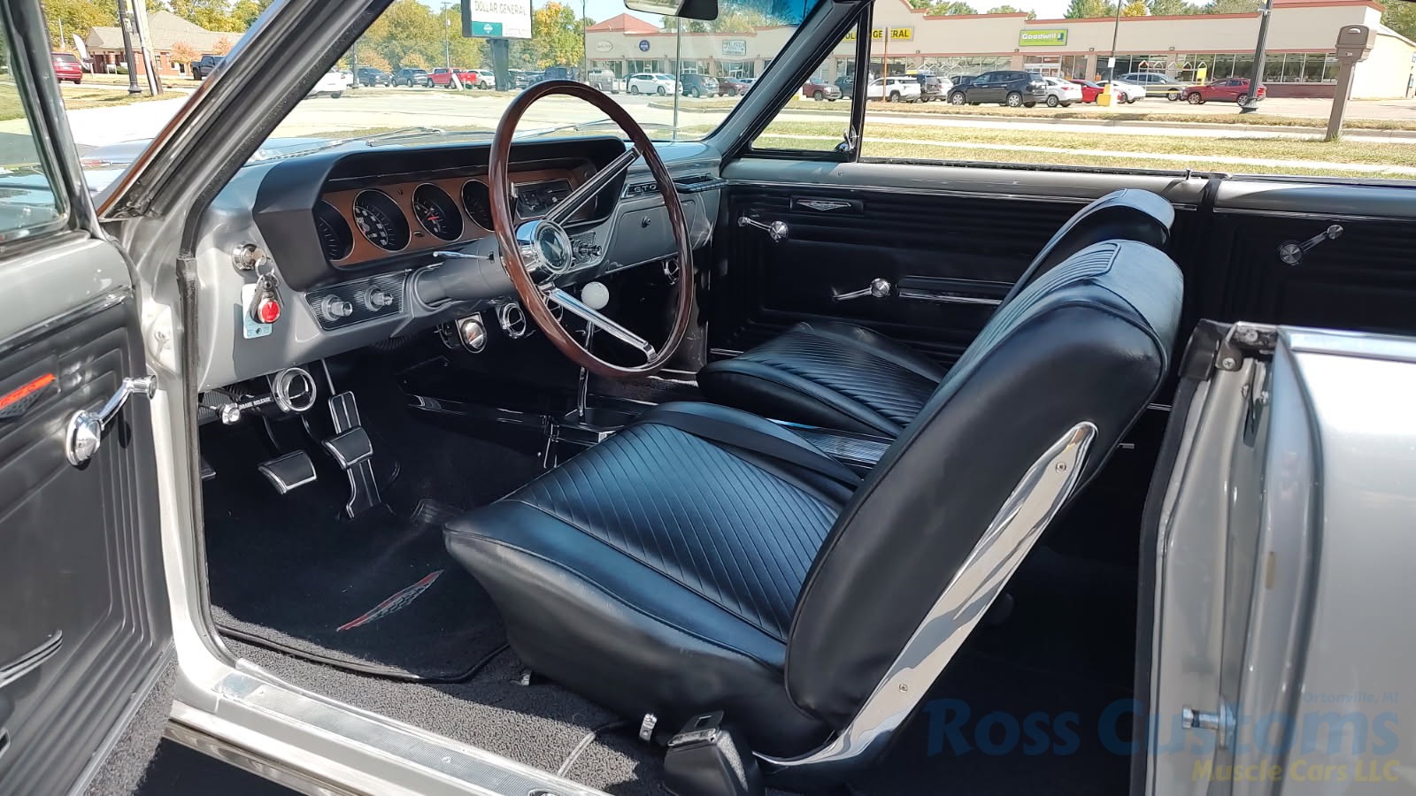 Factory black bucket seat console interior, dash has ben refinished, new factory wiring harness throughout, factory instrument cluster with full gauge package – showing 3,498 miles, dash bezel and woodgrain in excellent condition; as well as all other dash trim, factory appearing retro-fit AM/FM stereo with IPOD capability, 3 spoke deluxe wood steering wheel in excellent condition, nicely updated with Vintage heat and AC, vents nicely mounted under dash, deluxe pedal package, new headliner, visors and sail panels, deluxe package shelf with factory speaker grills, new front and rear door panels, new front and rear arm rest and bases, new front and rear seat covers; as well as foam, updated with GM front seat belts, original 4 speed center console in excellent condition with factory appearing Hurst shifter, new carpet and custom floor mats, new sill plates.