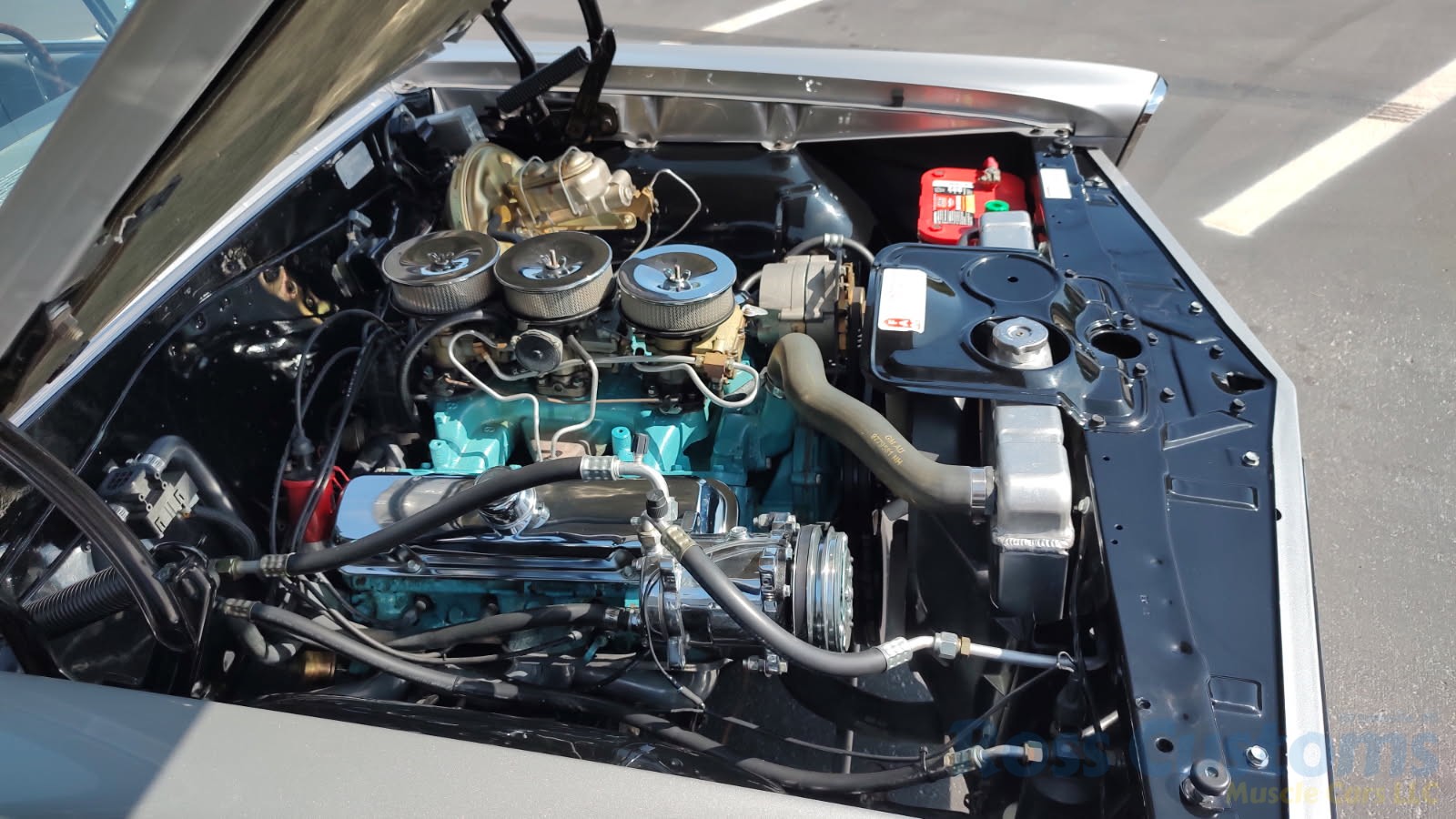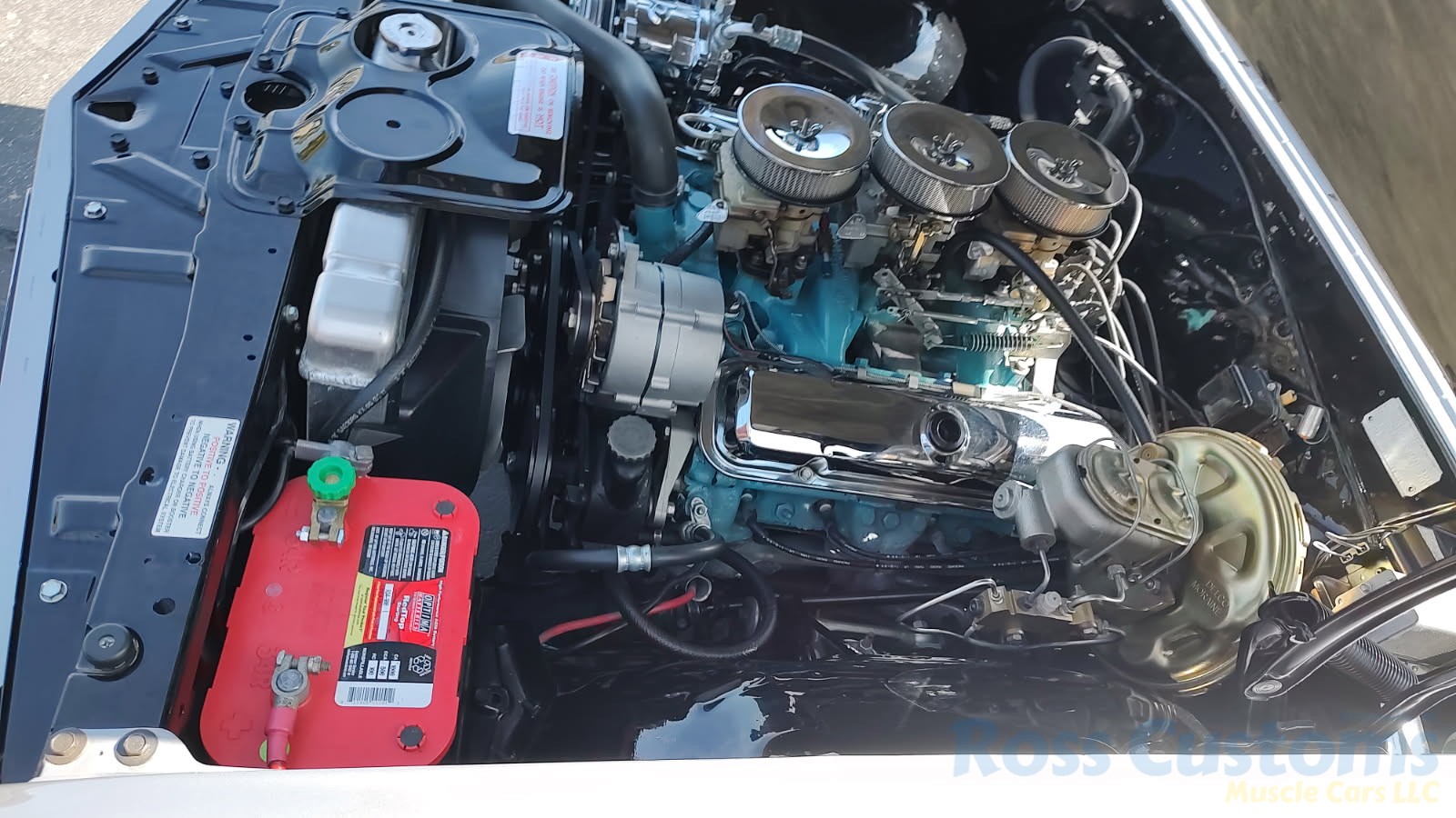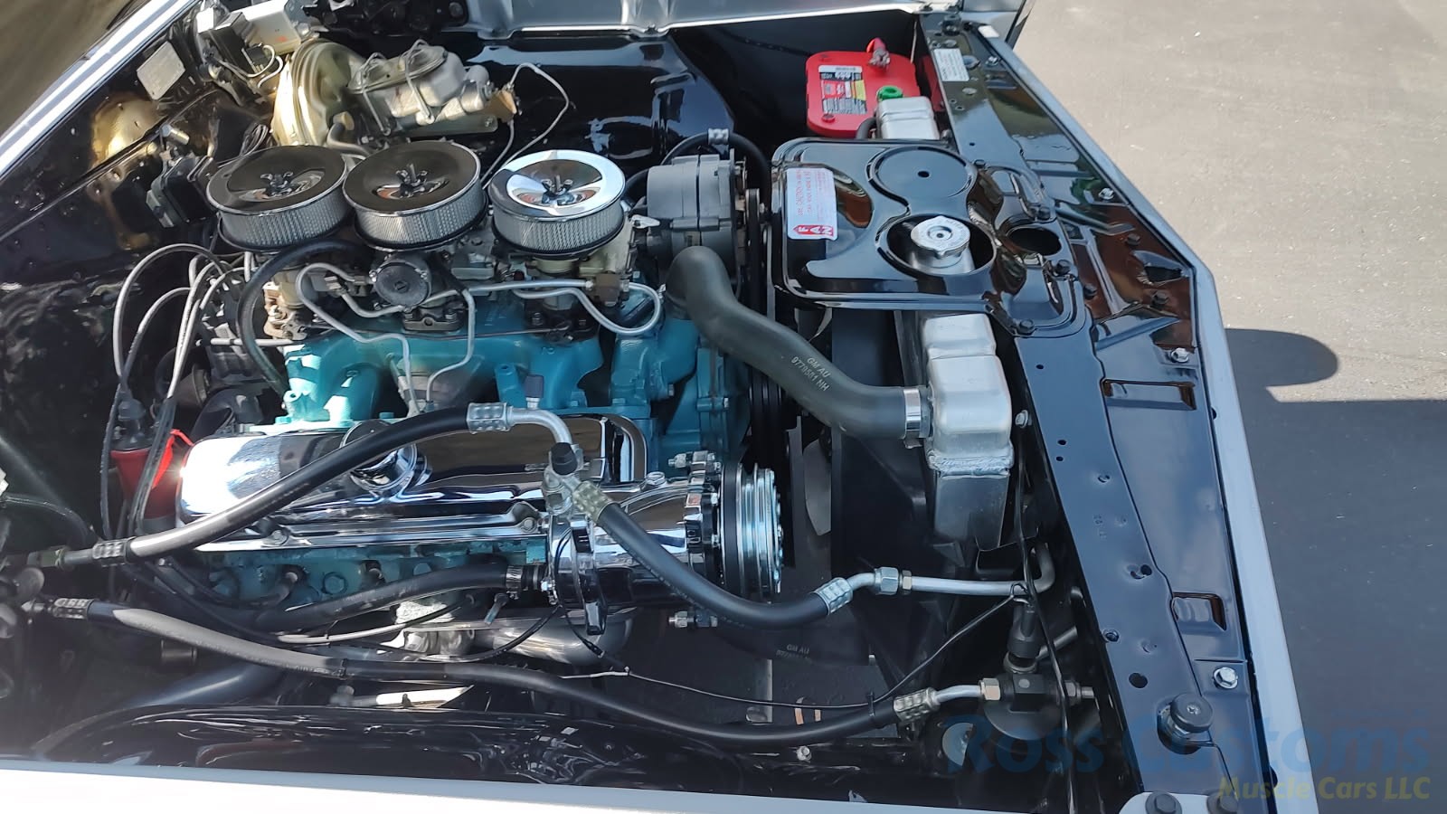 Under the hood the original motor has been replaced with a professionally built 400, original tri-power setup, factory valve covers and breathers, updated with Pertronix ignition, nicely updated with direct-fit aluminum radiator factory appearing, correct shroud and 7 blade clutch fan, nicely outfitted with Vintage AC and heat, chrome compressor, power steering, updated with power front disc brakes, stainless brake and fuel lines, this strong running 400 is backed up with a Muncie 4 speed trans and Hurst shifter, set of ceramic long tube headers into 2 1/2 inch dual Flowmaster exhaust out the back in stock location with chrome splitter tips, at time of restoration frame was powder coated; as well as control arms, new suspension components, front sway bar, rear has been nicely updated with Pure Muscle upper and lower control arms, sway bar, factory 10 bolt posi rear with 355 gear, new fuel tank and sending unit.