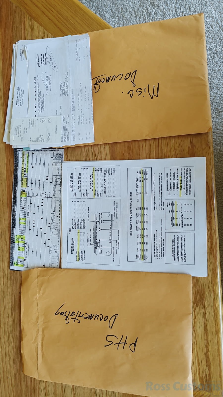 PHS docs, misc other paperwork, factory jack and spare, custom car cover.