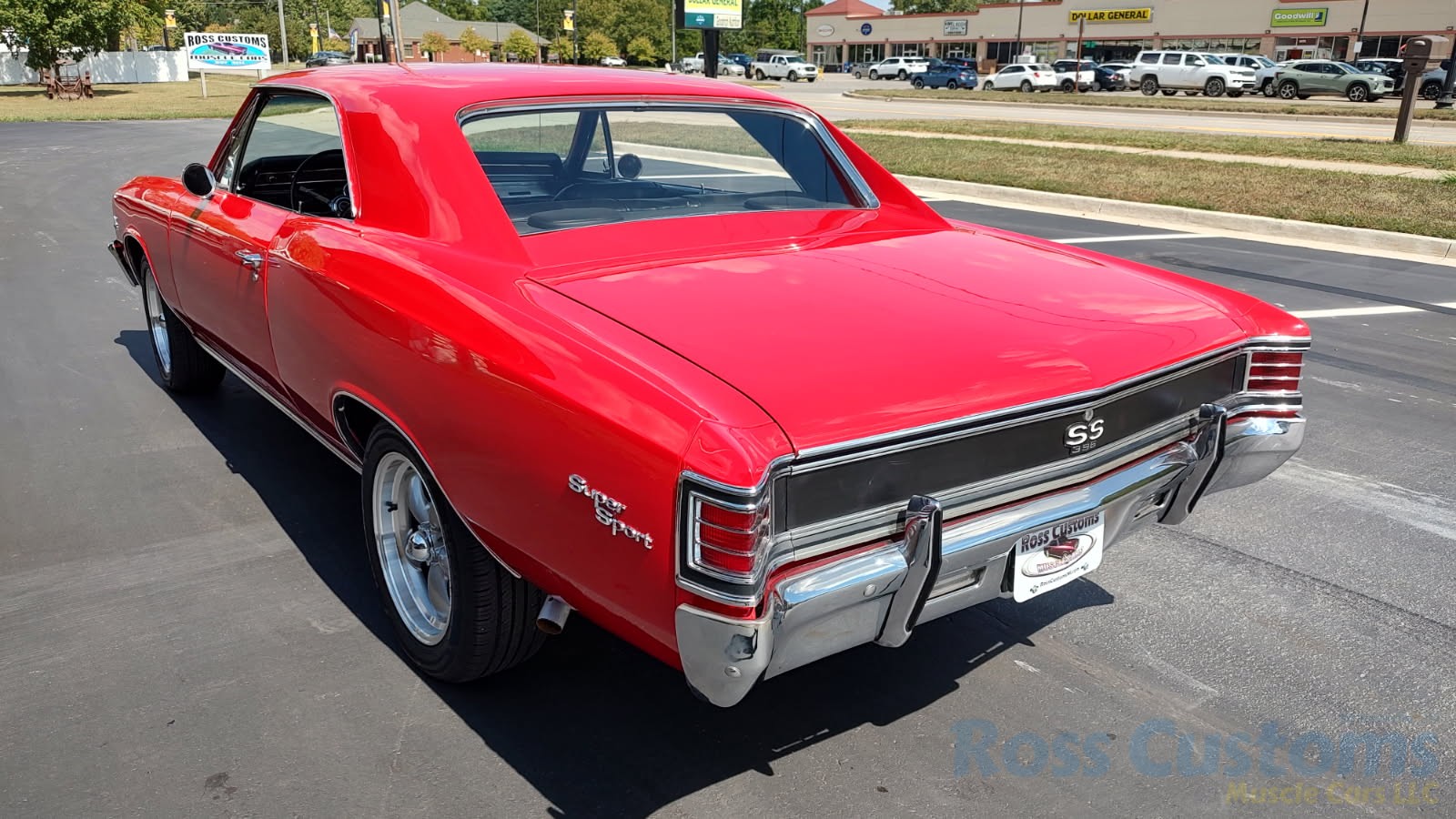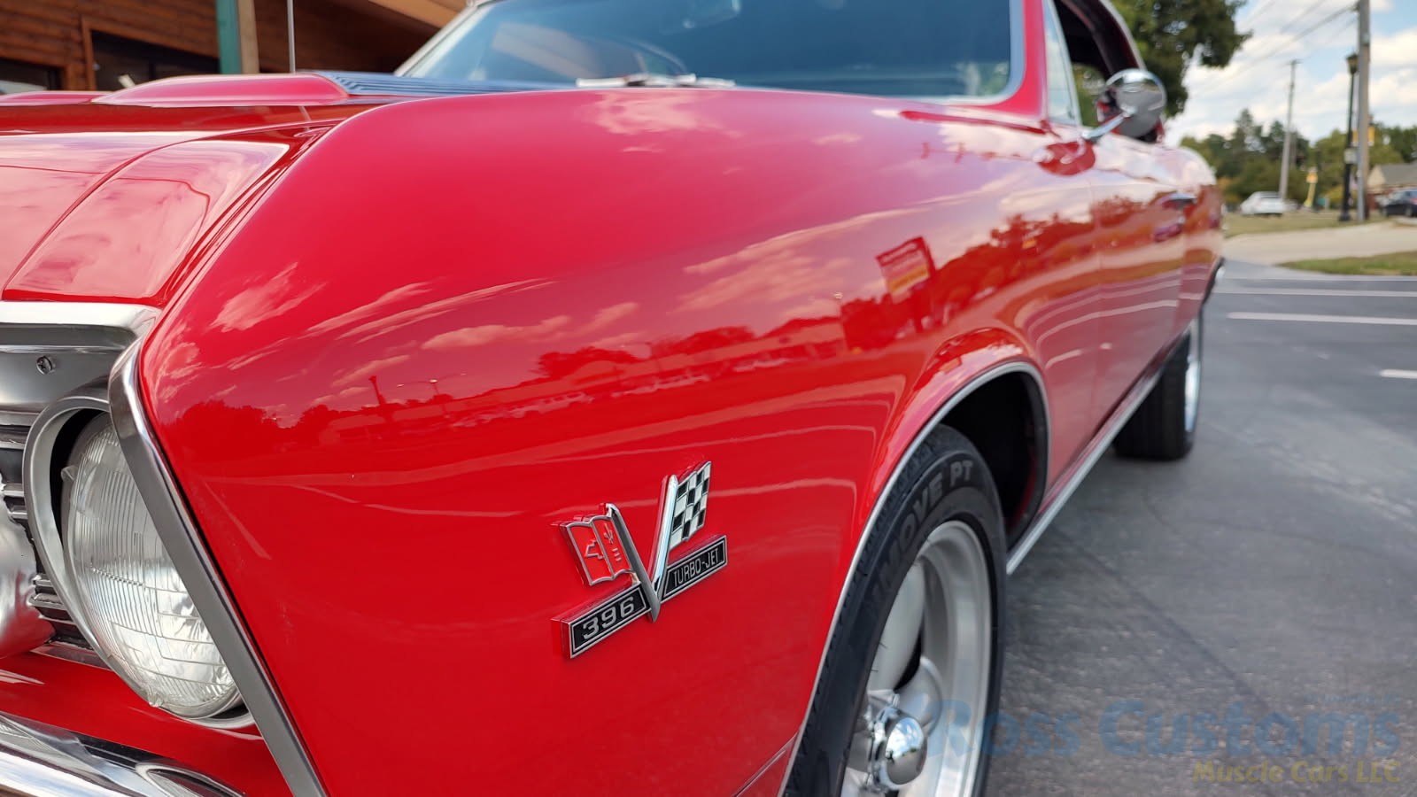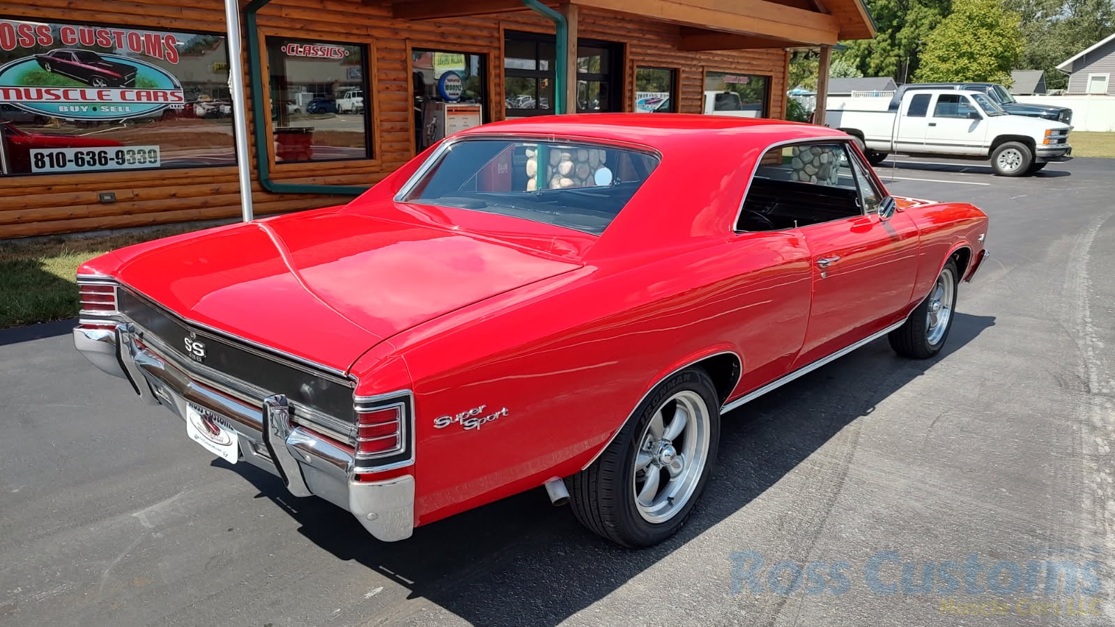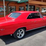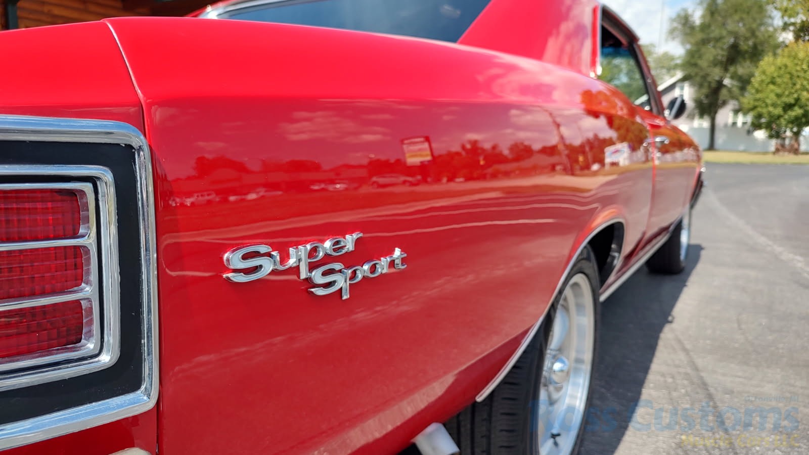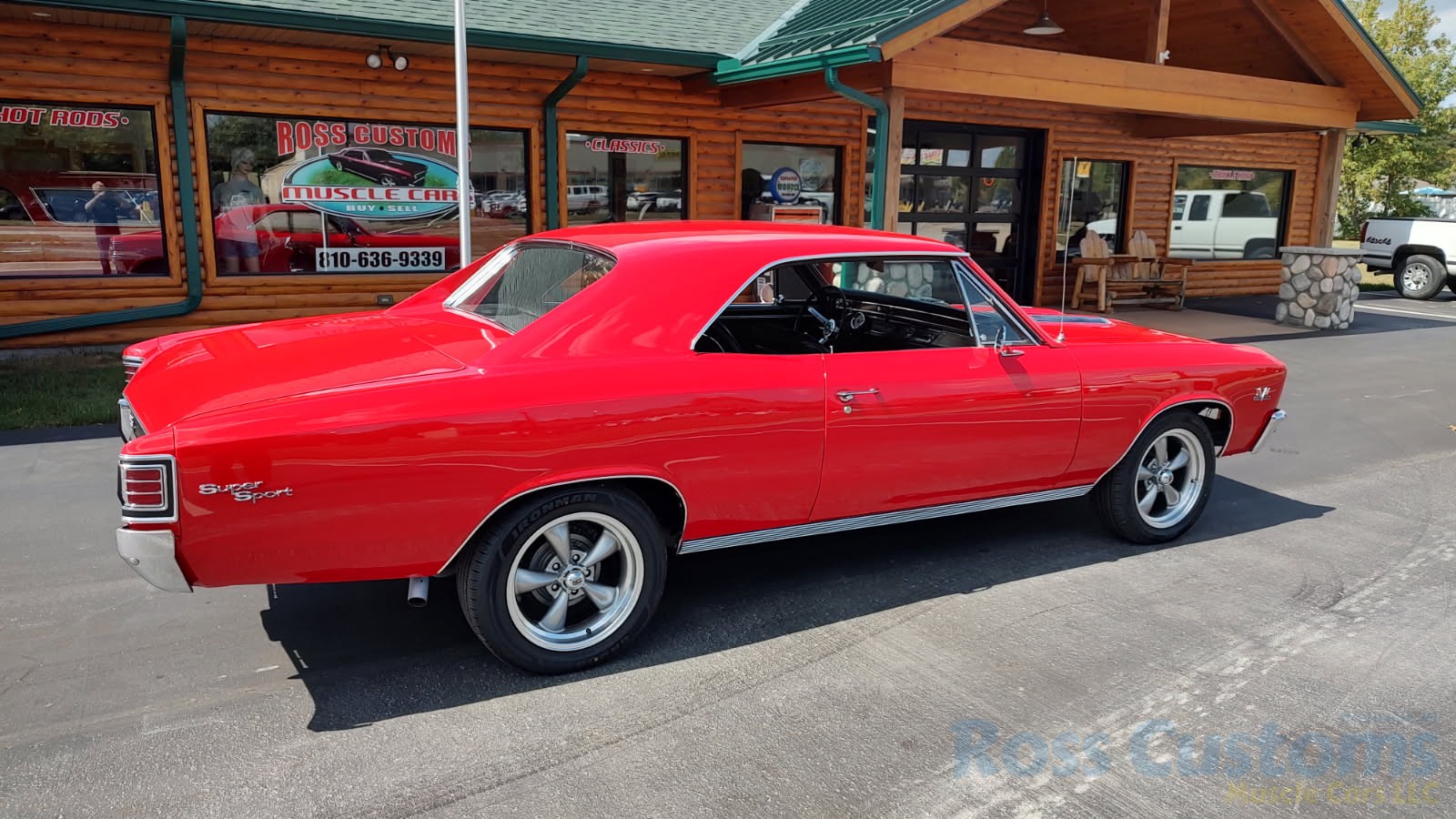 This is a very clean 67 Chevelle SS 396, 4 speed that has had a recent body up restoration, rust free, original panel car done in a very slick Victory Red, basecoat clearcoat, sanded and wheels smooth, slick as glass, at time of restoration had new tinted windshield; all other glass is factory original in very good condition, new weather stripping and window felts, original window stainless moldings in very good condition, new correct bowtie side view mirrors, new door handles, hood louvers, hood molding and fender eye brow moldings, grill and headlight bezels in excellent condition, original re-chromed front bumper with accessory bumper guards, new wheel well moldings and rocker moldings, taillight bezels have also been replaced, tail panel and deck lid moldings look like new, original rear bumper and bumper guards in very good condition.