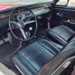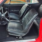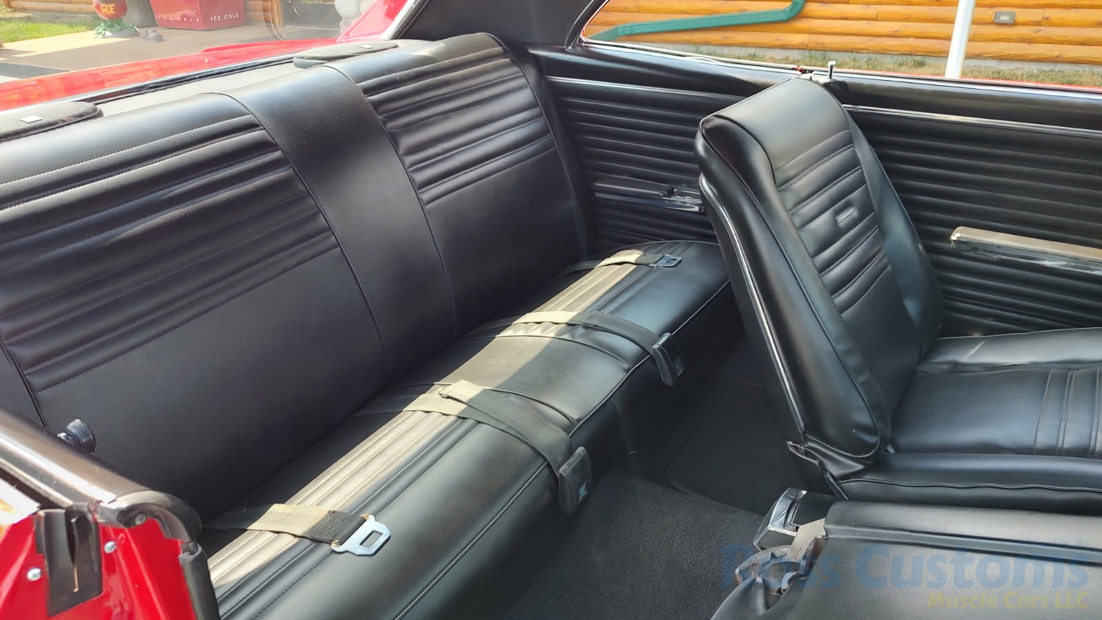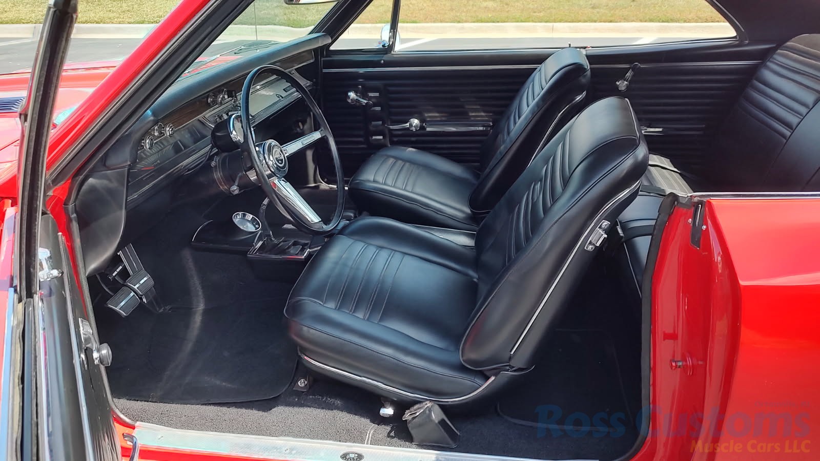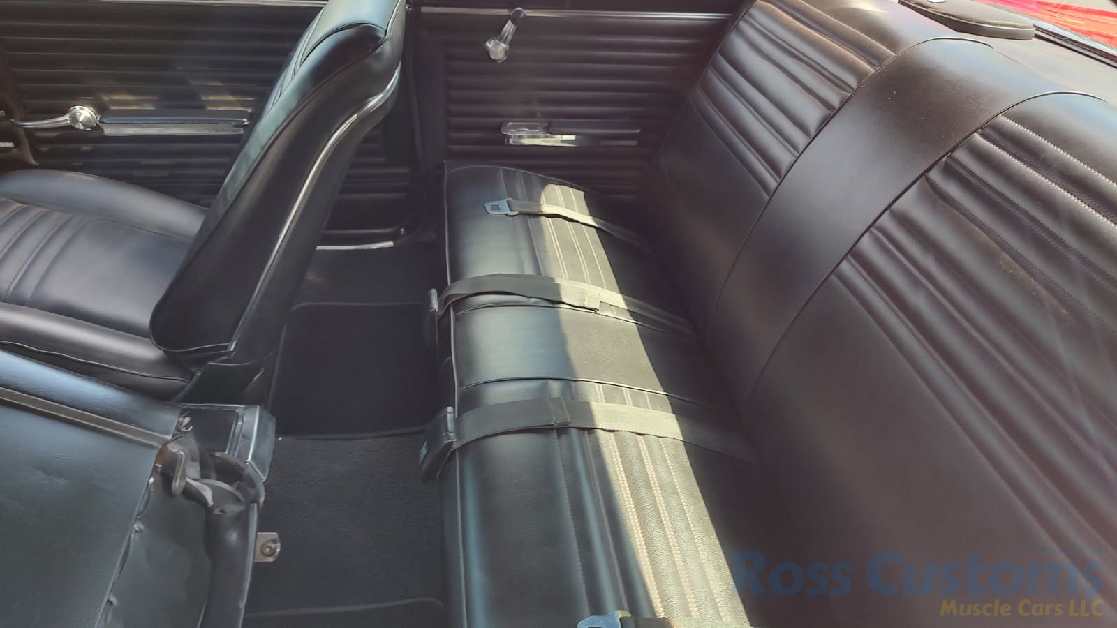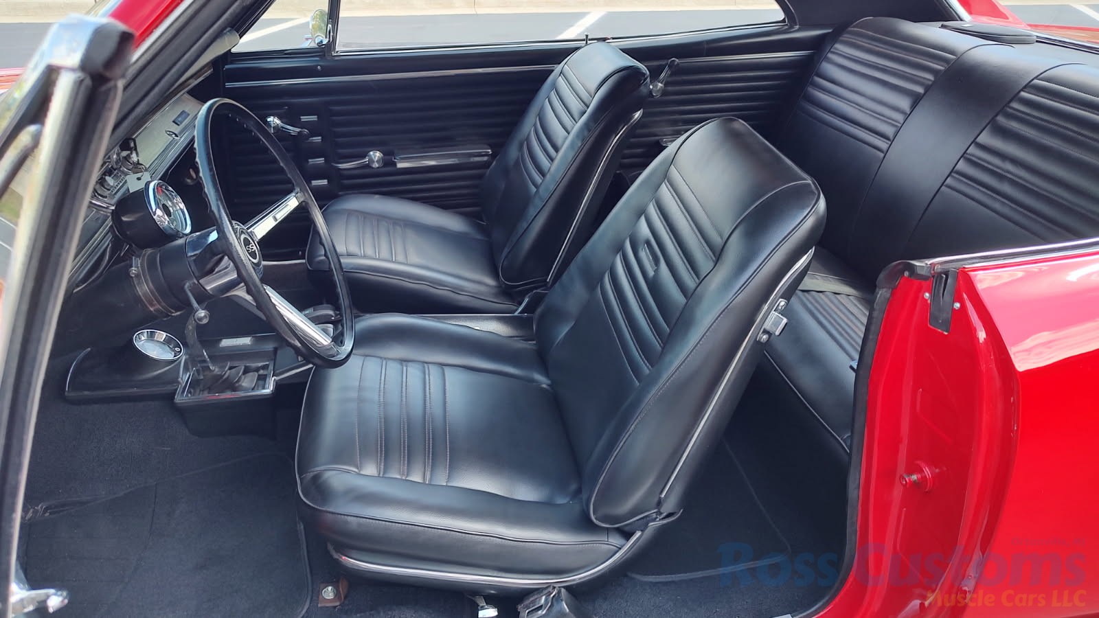 Factory black bucket seat console interior, dash housing has been refinished, at time of restoration had all new dash bezels, original factory gauge instrument cluster, nicely outfitted with direct-fit AM/FM/Cassette stereo, deluxe 3 spoke SS steering wheel, Vintage tach nicely mounted to column, deluxe pedal package, original dash pad in excellent condition, new headliner and sun visors, new sail panels, new front and rear door panels, arm rest and bases, front and rear seats have also been reupholstered, front and rear seat belts, original 4 speed center console in excellent condition, nicely outfitted with Hurst Competition Plus shifter, new carpet, floor mats and sill plates.
