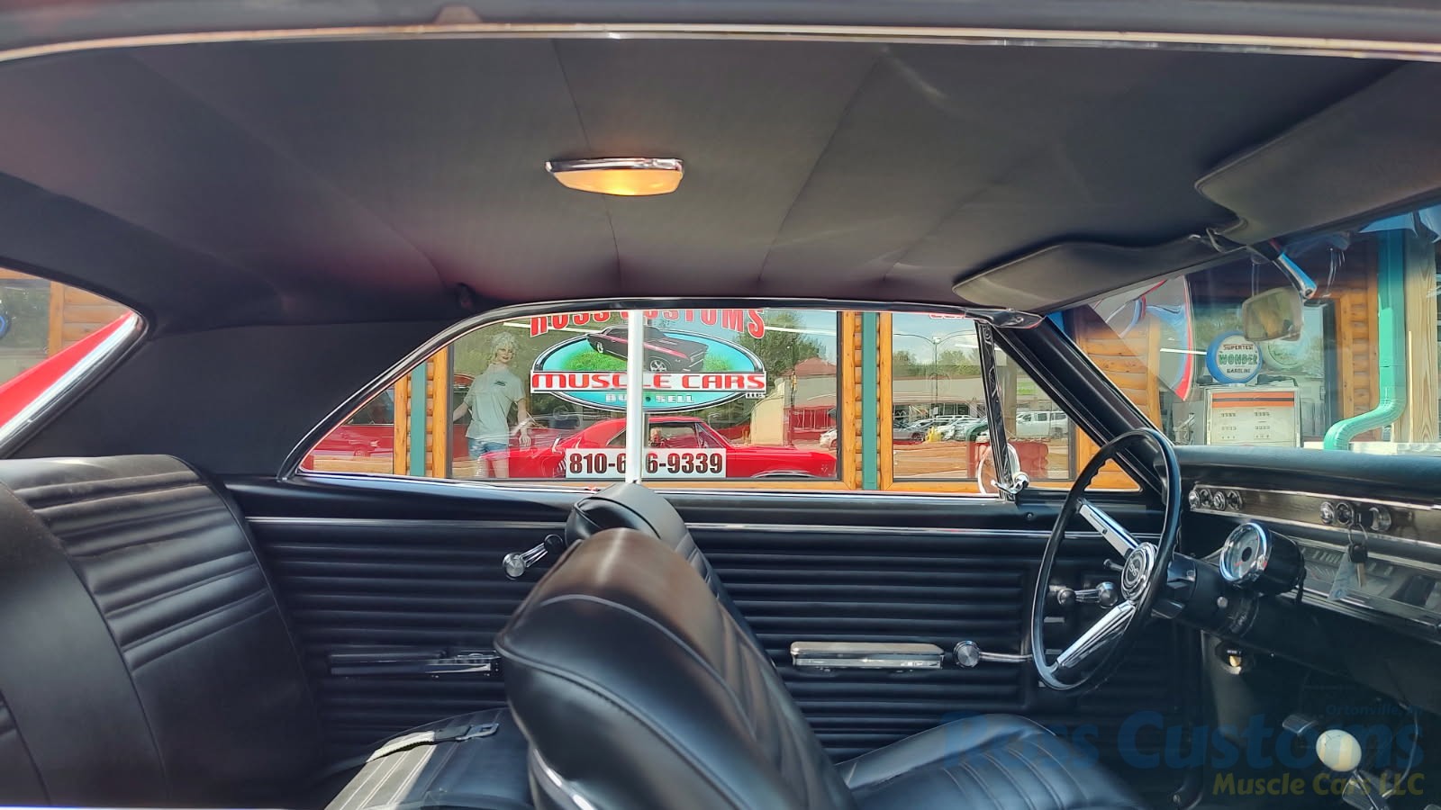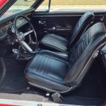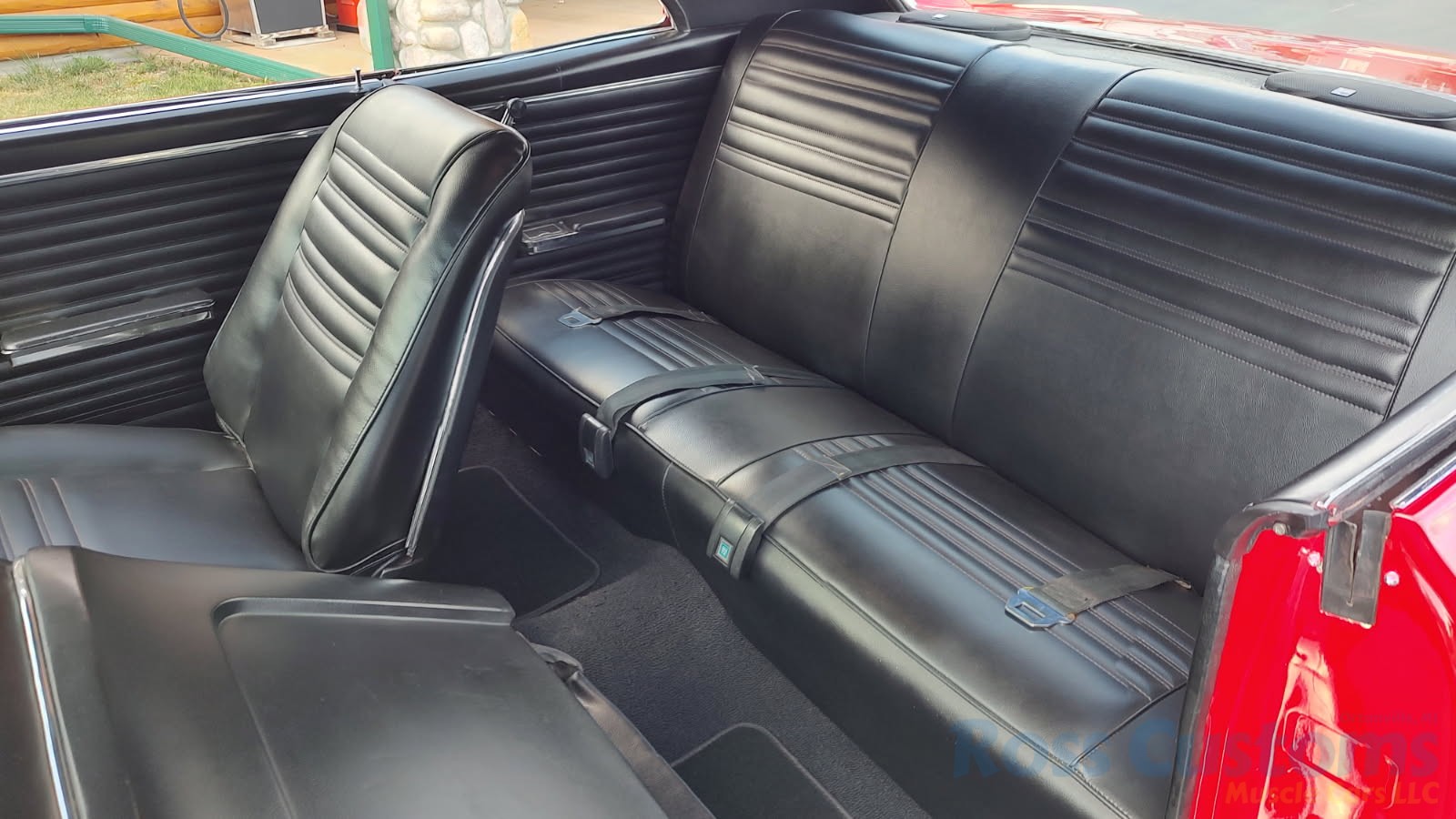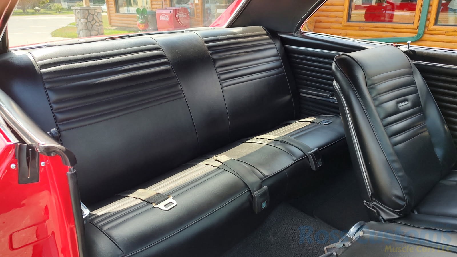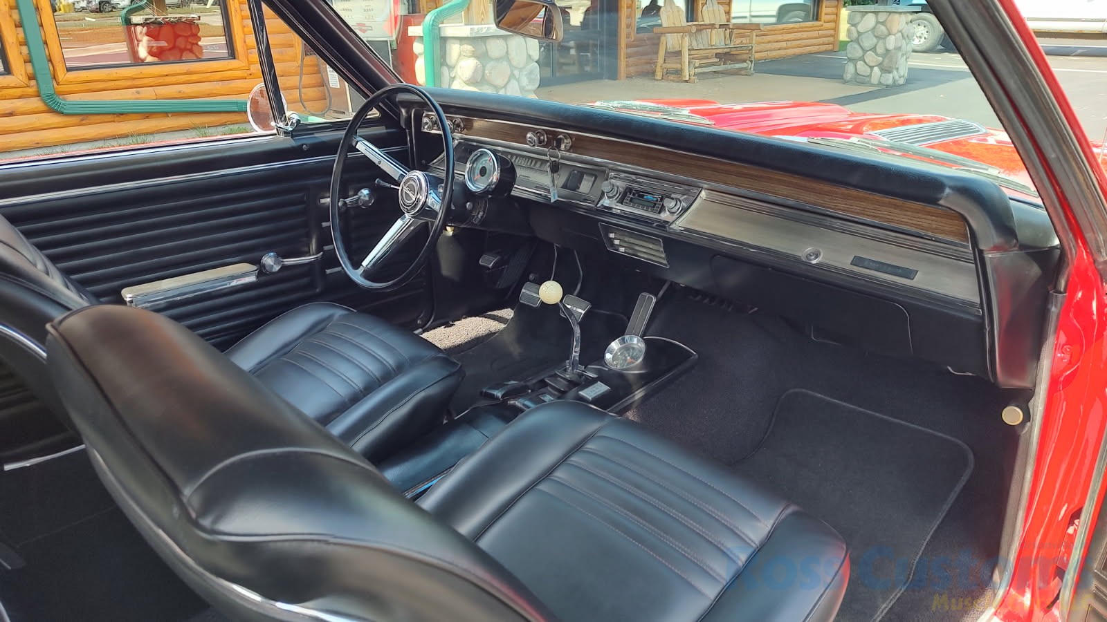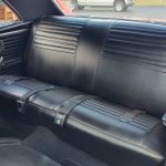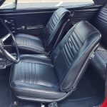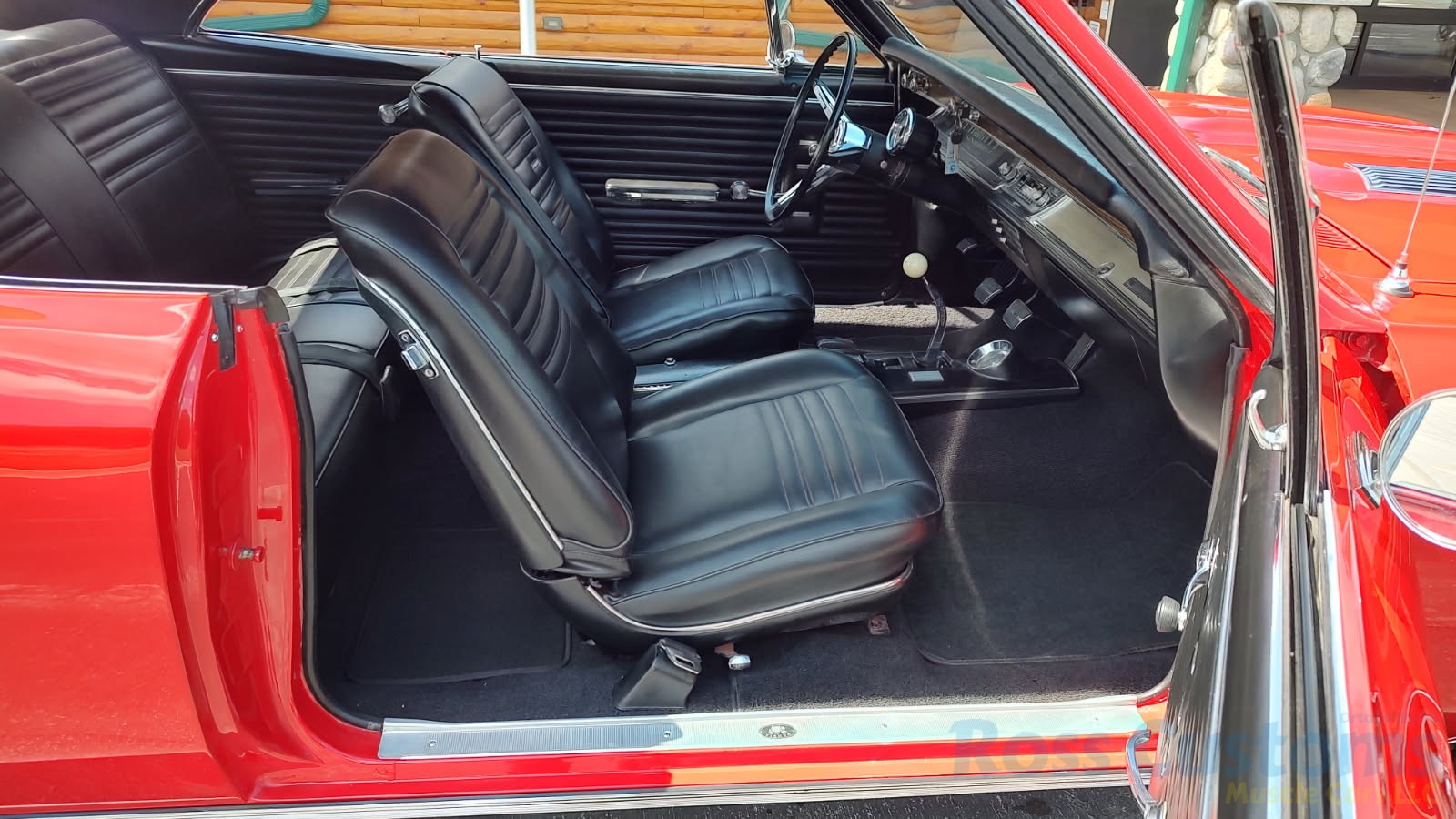 Factory black bucket seat console interior, dash housing has been refinished, at time of restoration had all new dash bezels, original factory gauge instrument cluster, nicely outfitted with direct-fit AM/FM/Cassette stereo, deluxe 3 spoke SS steering wheel, Vintage tach nicely mounted to column, deluxe pedal package, original dash pad in excellent condition, new headliner and sun visors, new sail panels, new front and rear door panels, arm rest and bases, front and rear seats have also been reupholstered, front and rear seat belts, original 4 speed center console in excellent condition, nicely outfitted with Hurst Competition Plus shifter, new carpet, floor mats and sill plates.