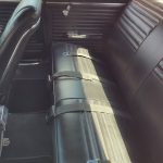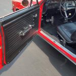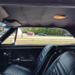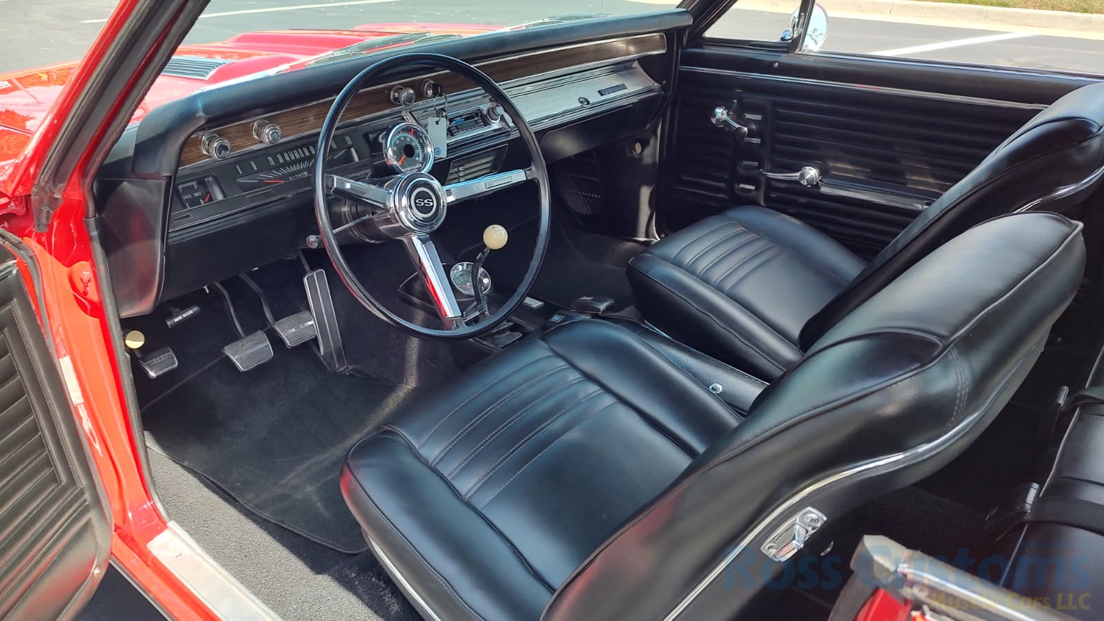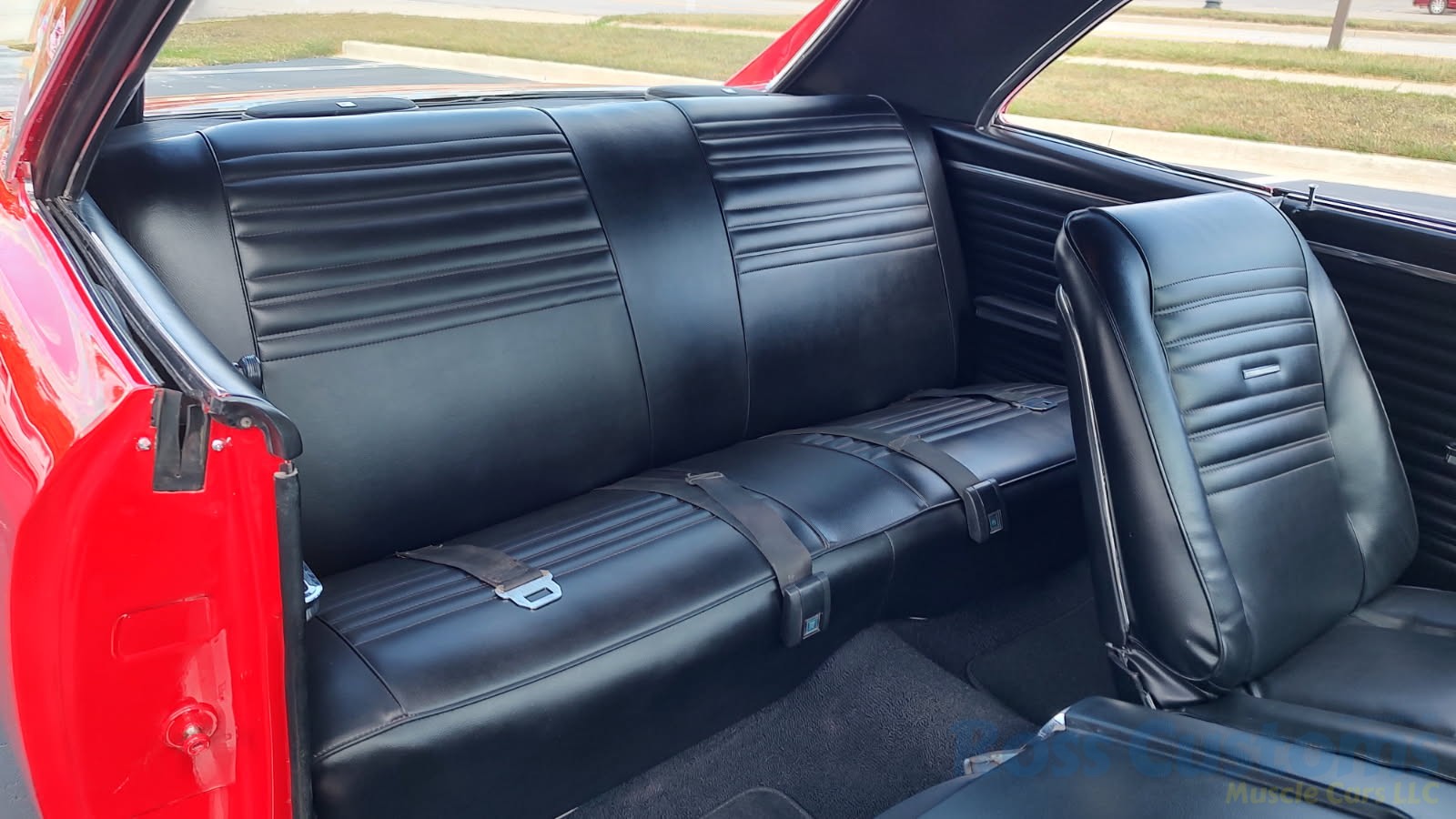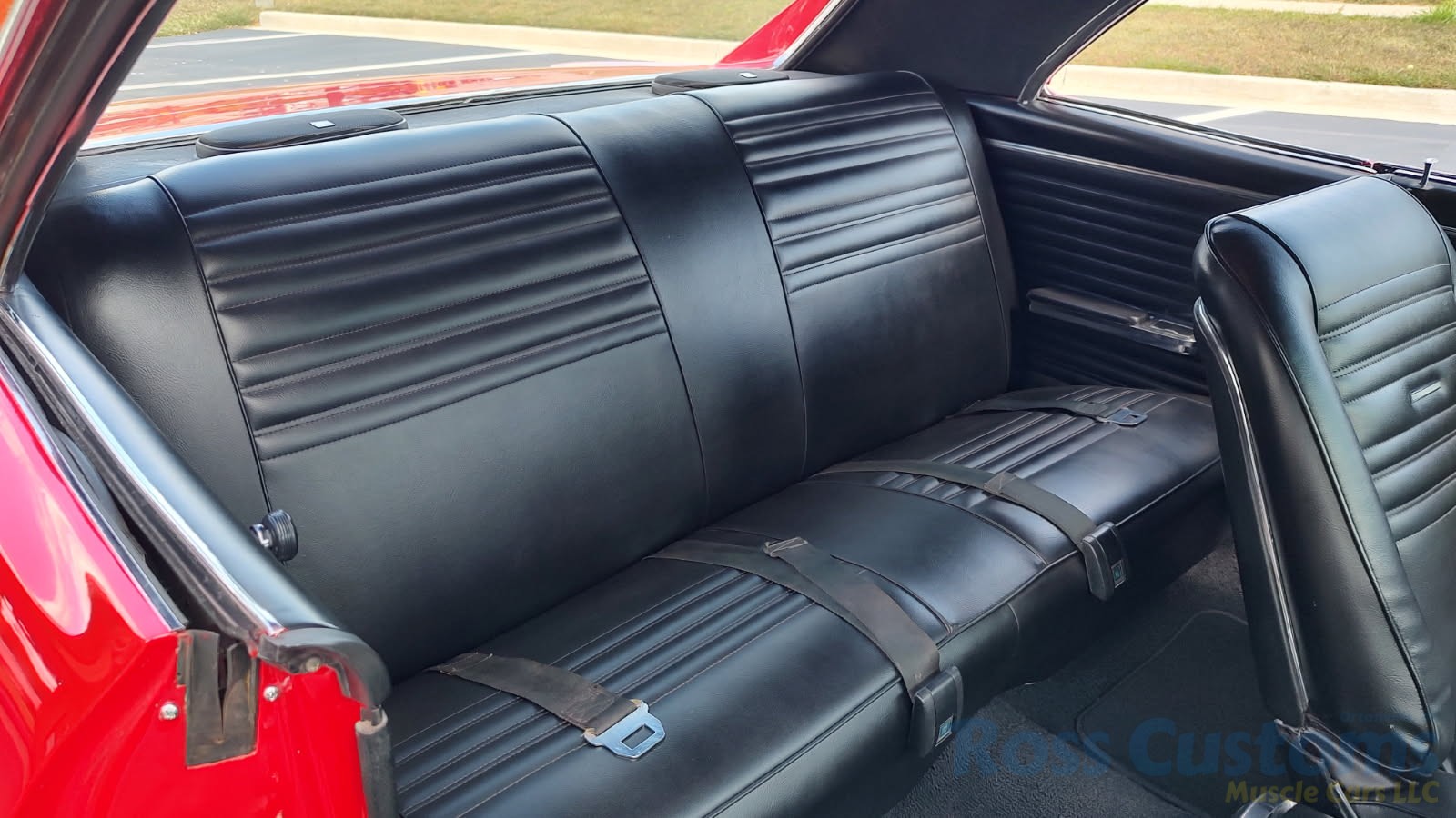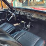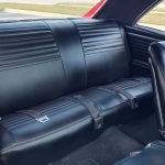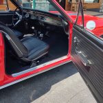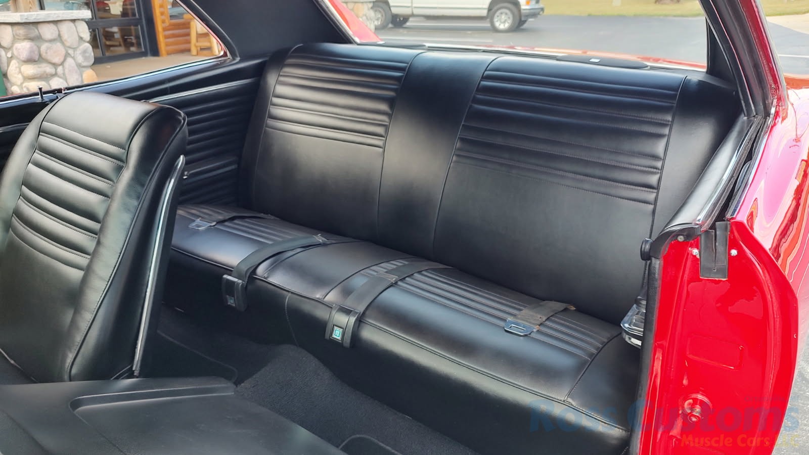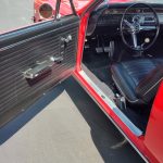 Factory black bucket seat console interior, dash housing has been refinished, at time of restoration had all new dash bezels, original factory gauge instrument cluster, nicely outfitted with direct-fit AM/FM/Cassette stereo, deluxe 3 spoke SS steering wheel, Vintage tach nicely mounted to column, deluxe pedal package, original dash pad in excellent condition, new headliner and sun visors, new sail panels, new front and rear door panels, arm rest and bases, front and rear seats have also been reupholstered, front and rear seat belts, original 4 speed center console in excellent condition, nicely outfitted with Hurst Competition Plus shifter, new carpet, floor mats and sill plates.