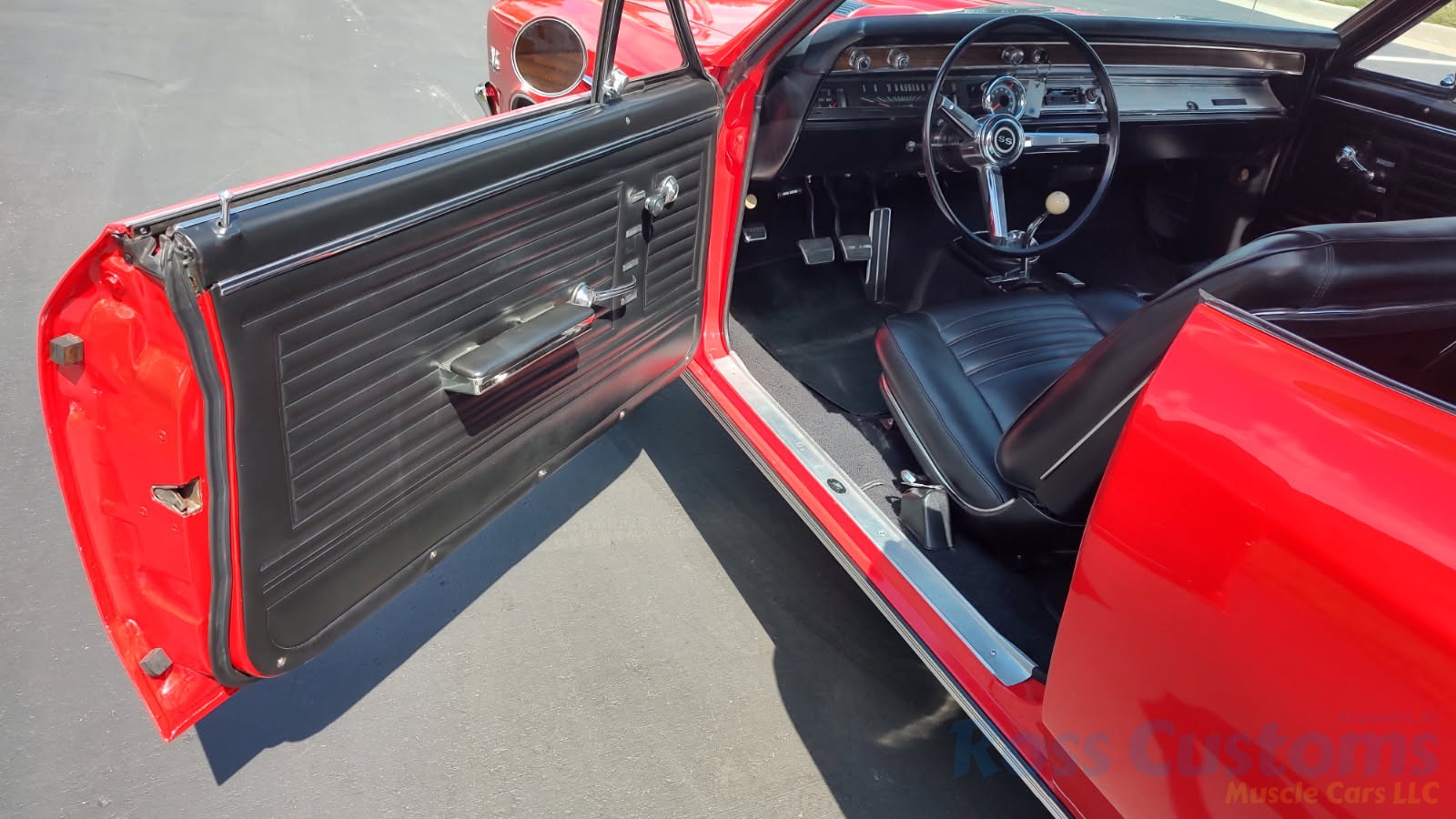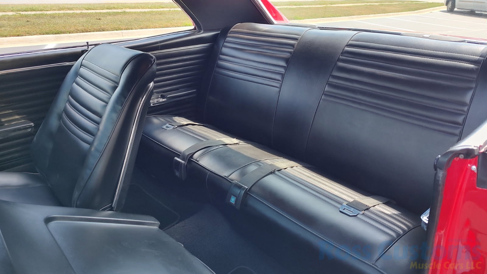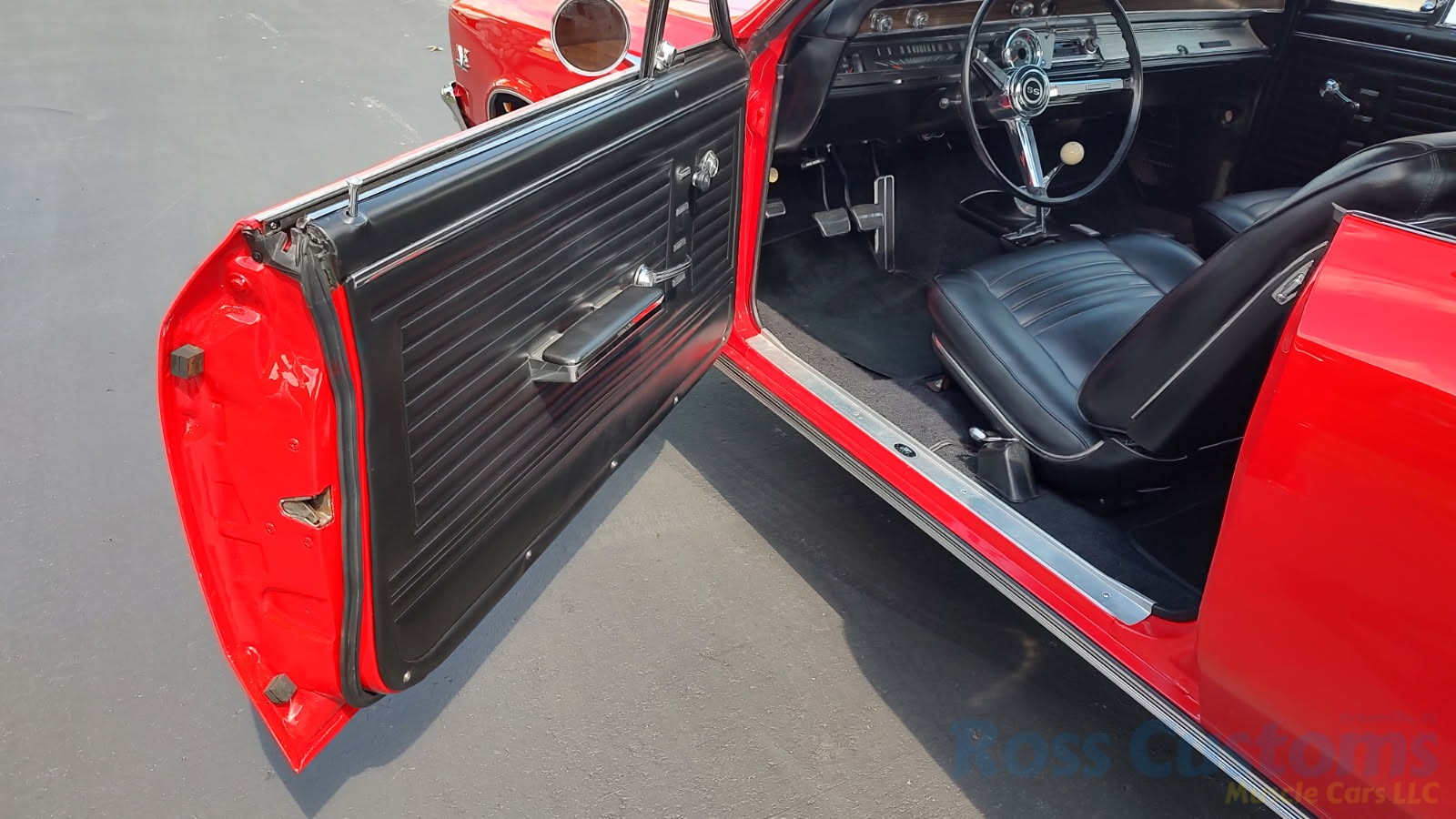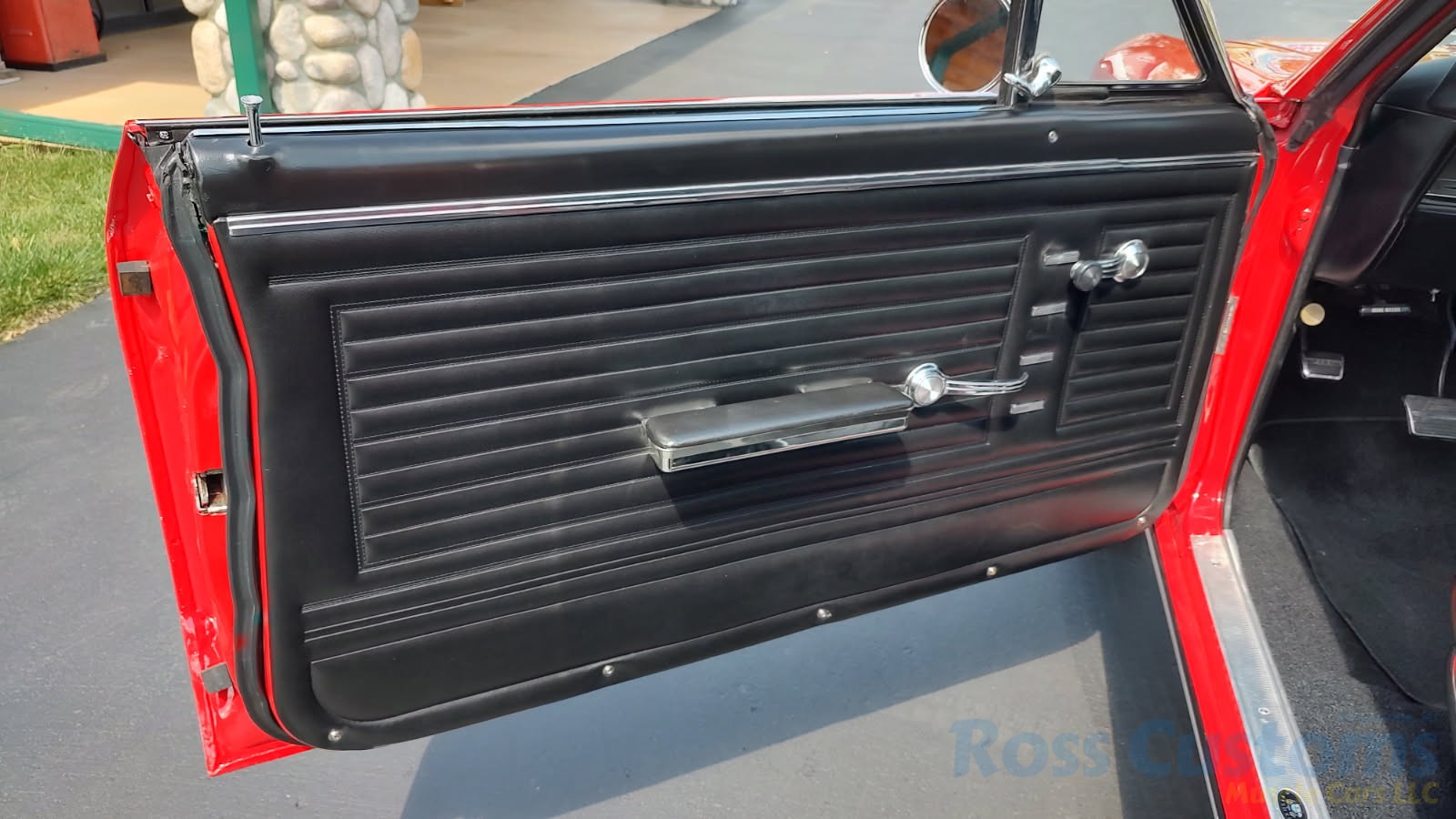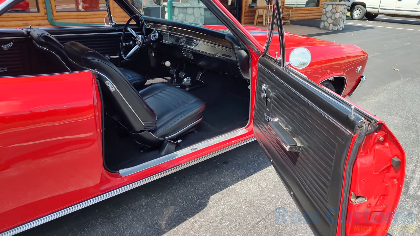 Factory black bucket seat console interior, dash housing has been refinished, at time of restoration had all new dash bezels, original factory gauge instrument cluster, nicely outfitted with direct-fit AM/FM/Cassette stereo, deluxe 3 spoke SS steering wheel, Vintage tach nicely mounted to column, deluxe pedal package, original dash pad in excellent condition, new headliner and sun visors, new sail panels, new front and rear door panels, arm rest and bases, front and rear seats have also been reupholstered, front and rear seat belts, original 4 speed center console in excellent condition, nicely outfitted with Hurst Competition Plus shifter, new carpet, floor mats and sill plates.