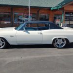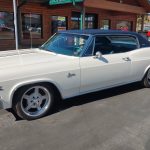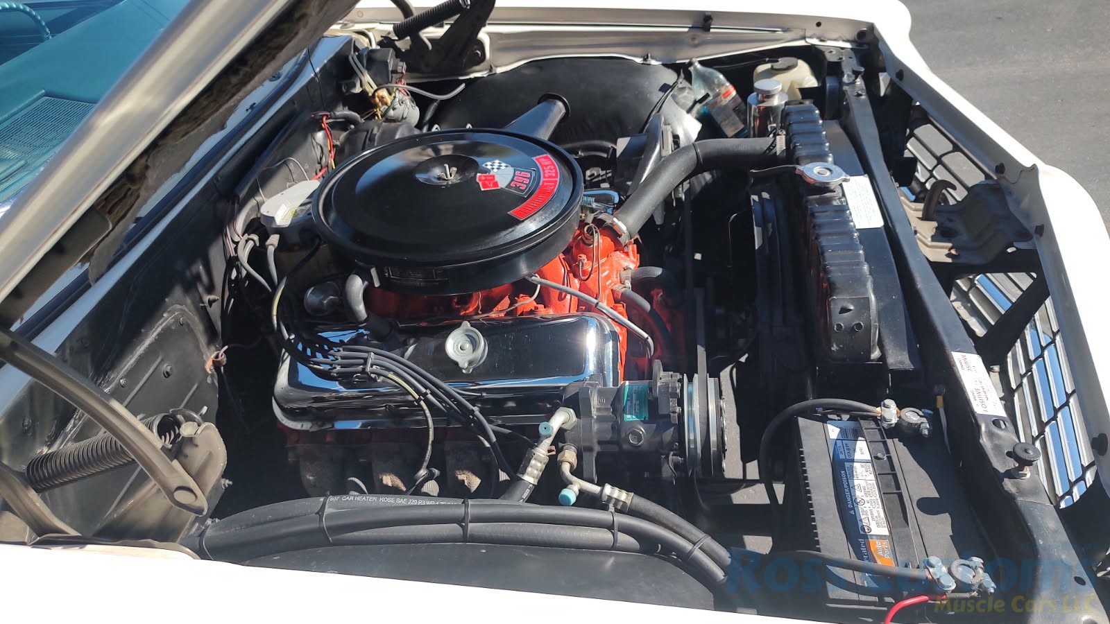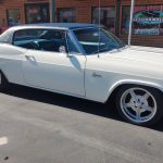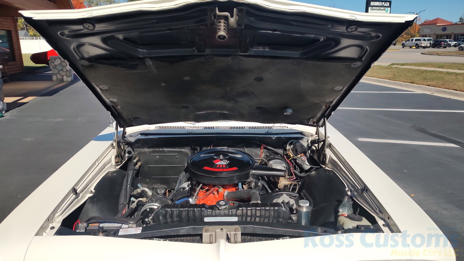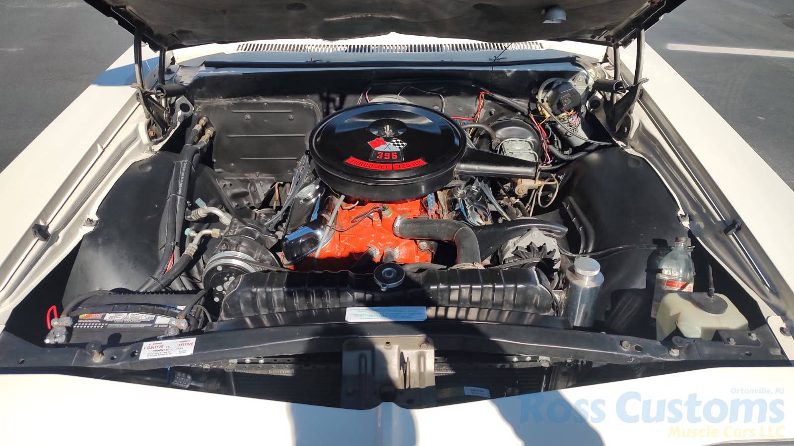 Under the hood we have the original 396 which has been rebuilt, 325 horse, factory 4 barrel, chrome valve covers, factory breather, updated with electronic ignition, heavy duty cooling system with correct shroud and fan, updated AC compressor, power steering, updated with power front disc brakes and dual master cylinder, front suspension has been gone through, has been lowered 2 inches all around with Hotchkis springs front and rear, factory exhaust manifolds into 2 1/2 inch dual Flowmaster exhaust out the back in stock location, this strong running 396 is backed up with its original 400 turbo trans which has been rebuilt, 12 bolt posi rear with 323 gear, new fuel tank and sending unit.