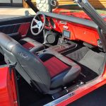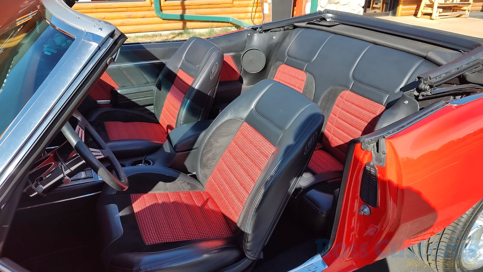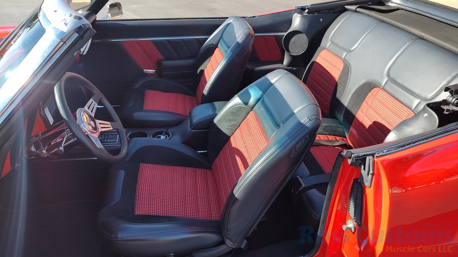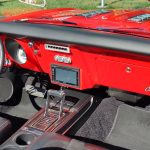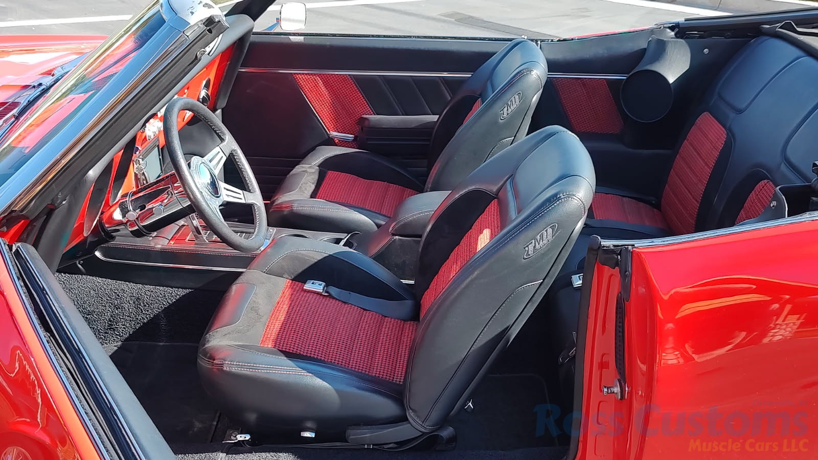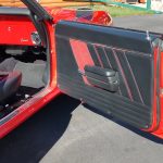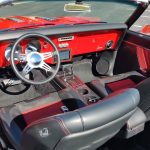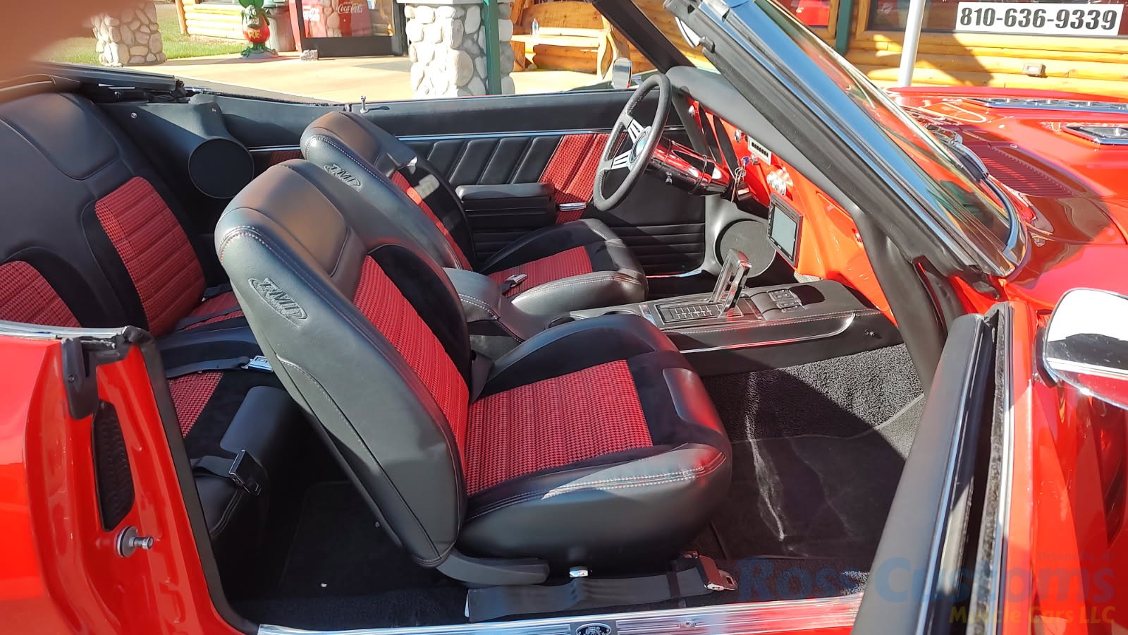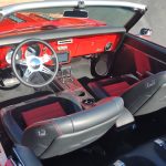Full custom black interior with black and red houndstooth, dash has been refinished, all new wiring throughout, equipped with power windows, power top, power remote locks, center of dash has been reworked to fit billet AC and heat controls, billet AC center vent, factory side AC dash vents have been replaced, full screen Alpine stereo system – CD, bluetooth, navigation; as well as backup camera, custom kick panel speakers which are leather wrapped; as well as custom rear side speakers, AMP’s nice mounted in trunk, nicely updated with Dakota Digital classic look instrumentation with full gauge package and GPS speedo, IDIDIT chrome steering column with LoKar billet steering wheel, deluxe pedal package, custom front and rear door panels with black and red houndstooth, custom TMI rear seat, front seats are original with custom TMI covers; as well as added bolster for better comfort and handling, custom center console with cup holds, nicely outfitted with factory staple shifter that has been converted to work correctly with the 700R4 overdrive automatic trans; also within console are the power window switches, new carpet, floormats and sill plates, trunk has also been custom upholstered to match.