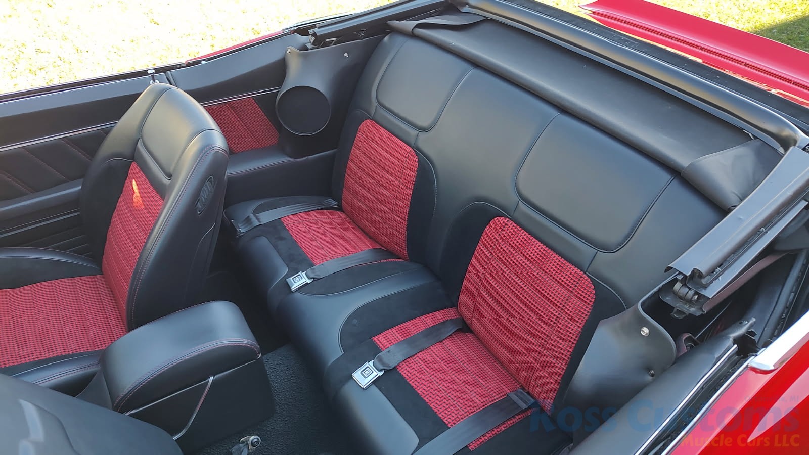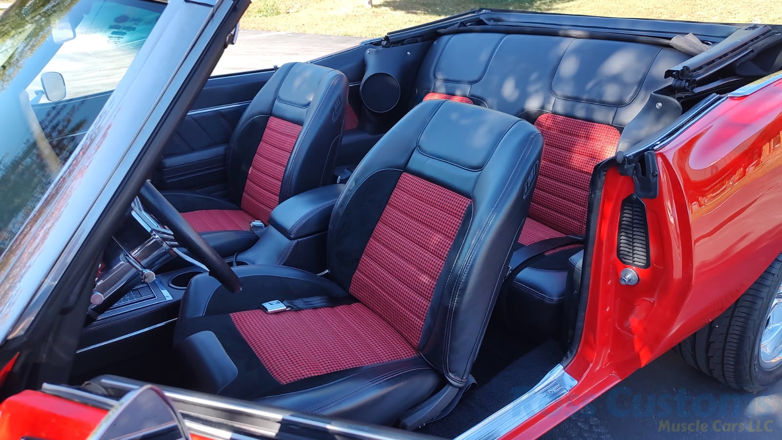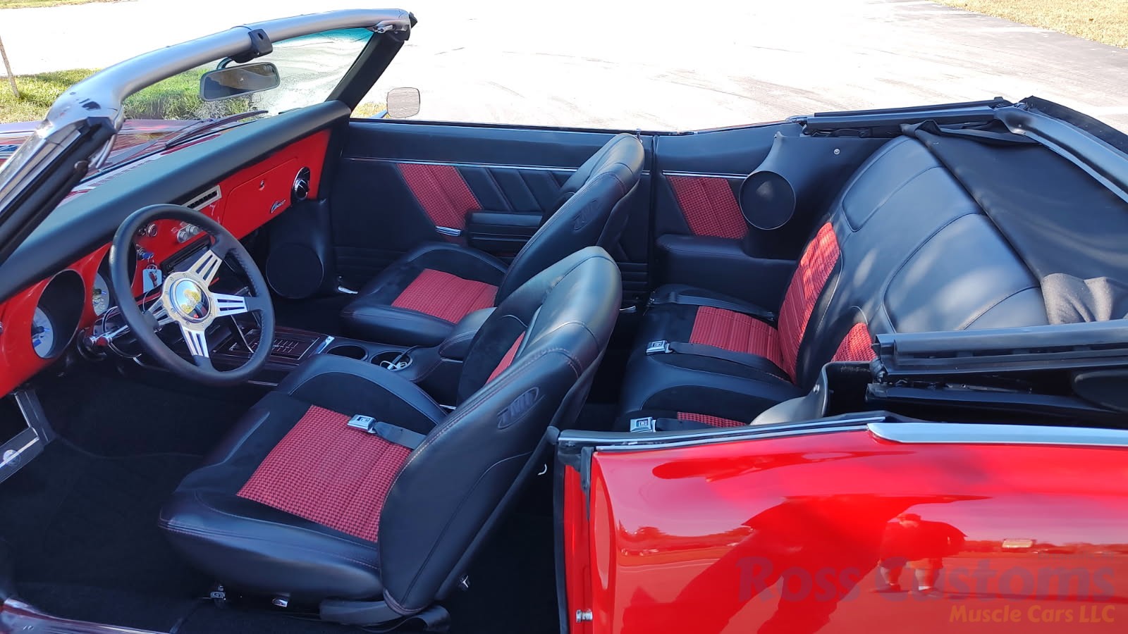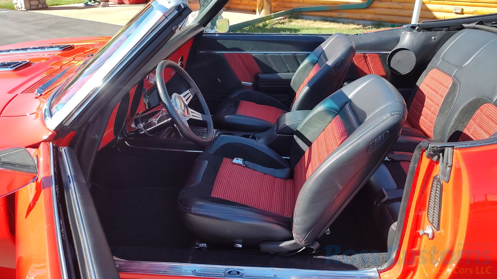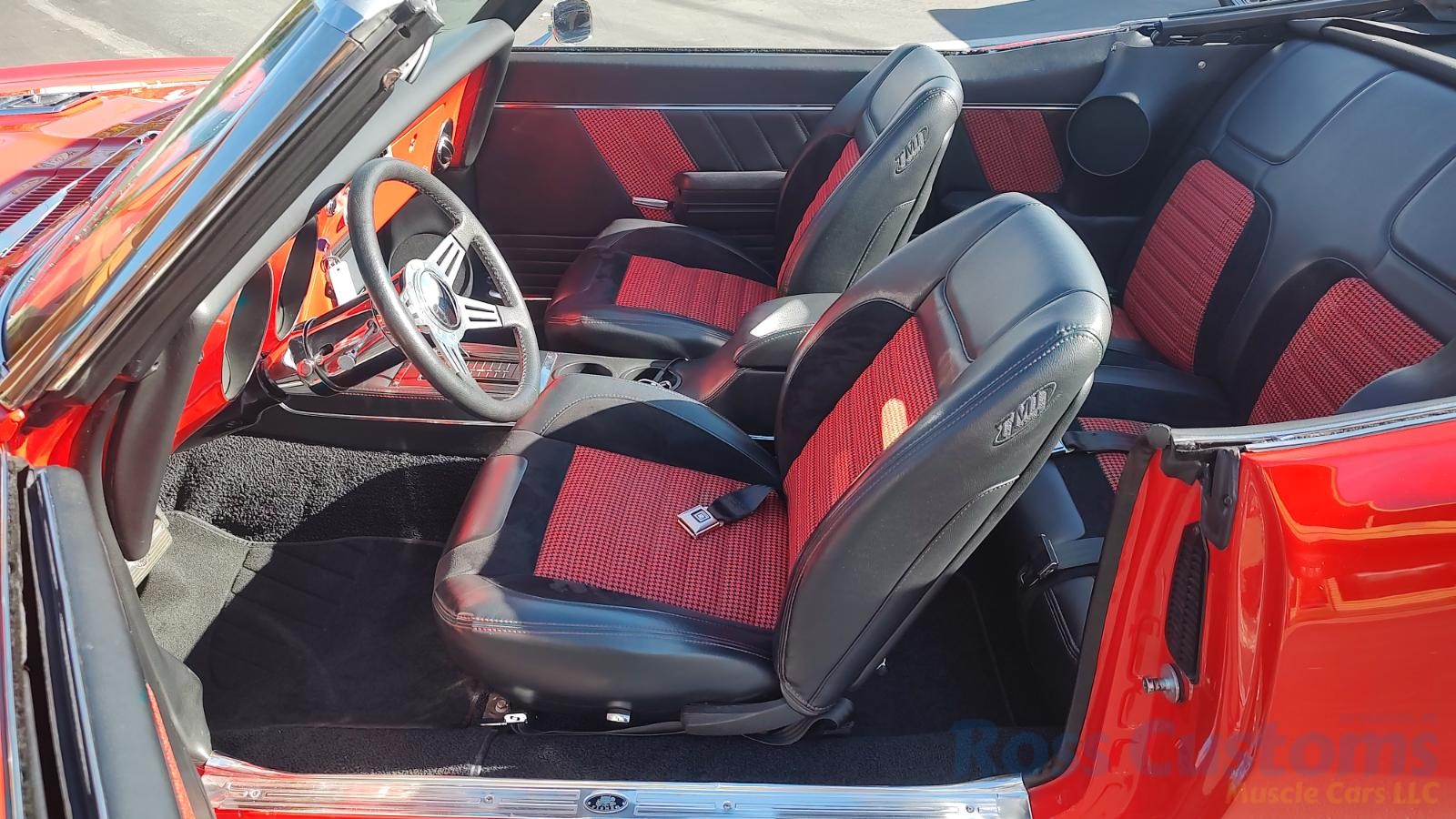 Full custom black interior with black and red houndstooth, dash has been refinished, all new wiring throughout, equipped with power windows, power top, power remote locks, center of dash has been reworked to fit billet AC and heat controls, billet AC center vent, factory side AC dash vents have been replaced, full screen Alpine stereo system – CD, bluetooth, navigation; as well as backup camera, custom kick panel speakers which are leather wrapped; as well as custom rear side speakers, AMP’s nice mounted in trunk, nicely updated with Dakota Digital classic look instrumentation with full gauge package and GPS speedo, IDIDIT chrome steering column with LoKar billet steering wheel, deluxe pedal package, custom front and rear door panels with black and red houndstooth, custom TMI rear seat, front seats are original with custom TMI covers; as well as added bolster for better comfort and handling, custom center console with cup holds, nicely outfitted with factory staple shifter that has been converted to work correctly with the 700R4 overdrive automatic trans; also within console are the power window switches, new carpet, floormats and sill plates, trunk has also been custom upholstered to match.