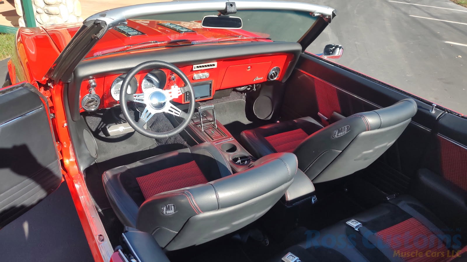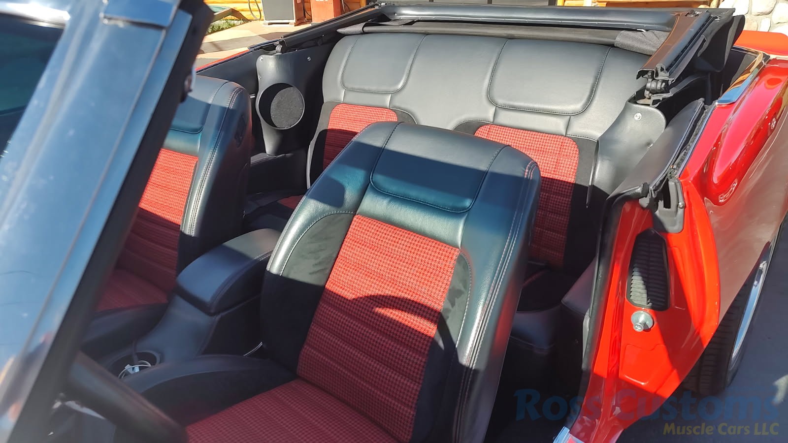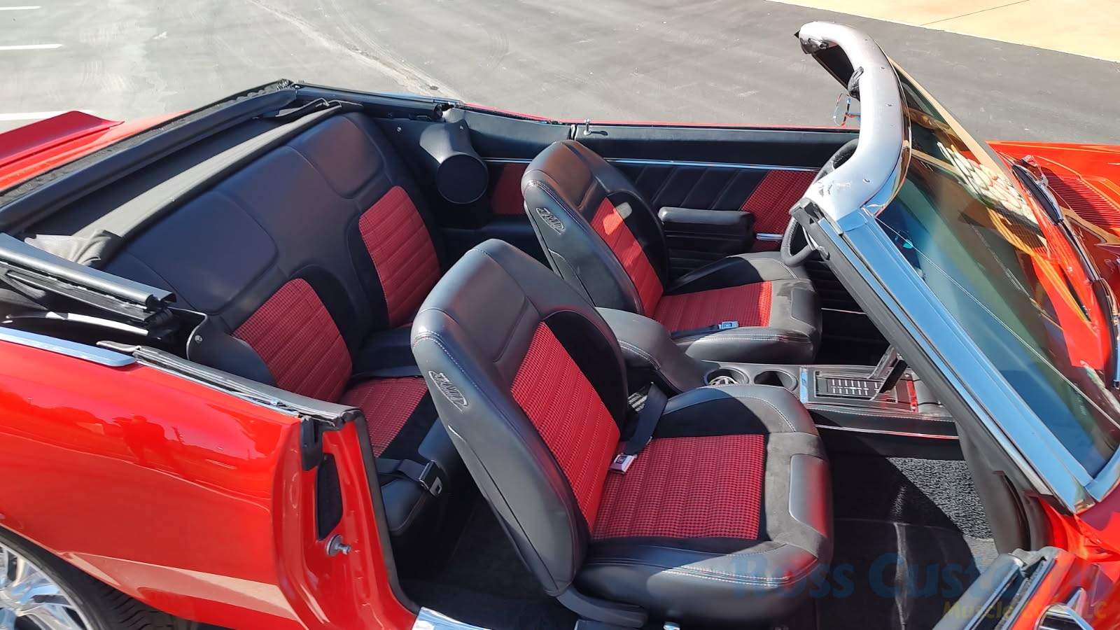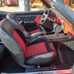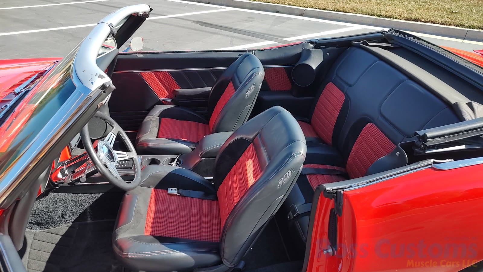 Full custom black interior with black and red houndstooth, dash has been refinished, all new wiring throughout, equipped with power windows, power top, power remote locks, center of dash has been reworked to fit billet AC and heat controls, billet AC center vent, factory side AC dash vents have been replaced, full screen Alpine stereo system – CD, bluetooth, navigation; as well as backup camera, custom kick panel speakers which are leather wrapped; as well as custom rear side speakers, AMP’s nice mounted in trunk, nicely updated with Dakota Digital classic look instrumentation with full gauge package and GPS speedo, IDIDIT chrome steering column with LoKar billet steering wheel, deluxe pedal package, custom front and rear door panels with black and red houndstooth, custom TMI rear seat, front seats are original with custom TMI covers; as well as added bolster for better comfort and handling, custom center console with cup holds, nicely outfitted with factory staple shifter that has been converted to work correctly with the 700R4 overdrive automatic trans; also within console are the power window switches, new carpet, floormats and sill plates, trunk has also been custom upholstered to match.