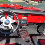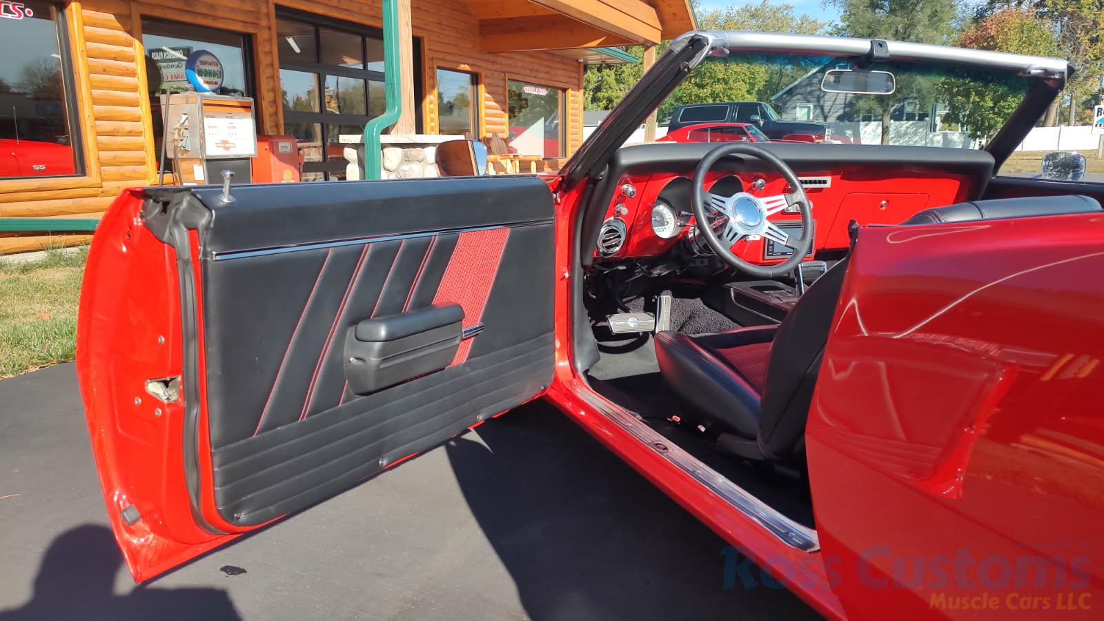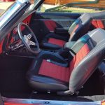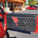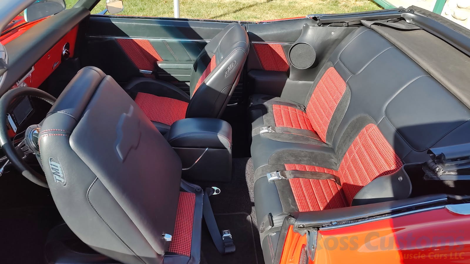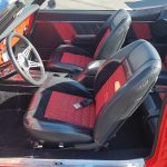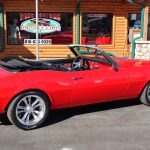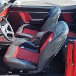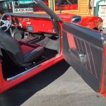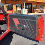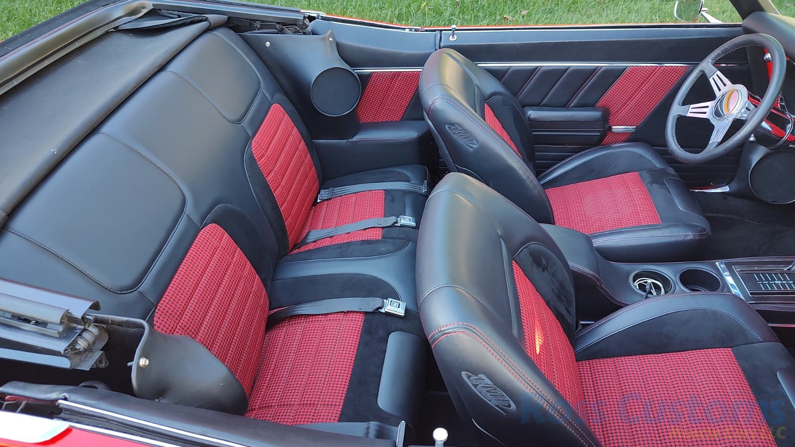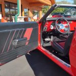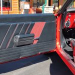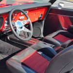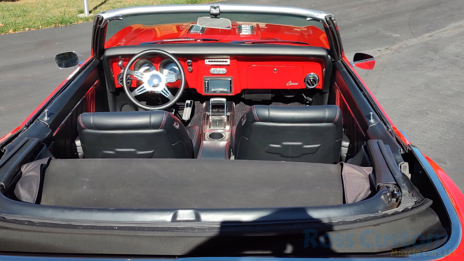Full custom black interior with black and red houndstooth, dash has been refinished, all new wiring throughout, equipped with power windows, power top, power remote locks, center of dash has been reworked to fit billet AC and heat controls, billet AC center vent, factory side AC dash vents have been replaced, full screen Alpine stereo system – CD, bluetooth, navigation; as well as backup camera, custom kick panel speakers which are leather wrapped; as well as custom rear side speakers, AMP’s nice mounted in trunk, nicely updated with Dakota Digital classic look instrumentation with full gauge package and GPS speedo, IDIDIT chrome steering column with LoKar billet steering wheel, deluxe pedal package, custom front and rear door panels with black and red houndstooth, custom TMI rear seat, front seats are original with custom TMI covers; as well as added bolster for better comfort and handling, custom center console with cup holds, nicely outfitted with factory staple shifter that has been converted to work correctly with the 700R4 overdrive automatic trans; also within console are the power window switches, new carpet, floormats and sill plates, trunk has also been custom upholstered to match.