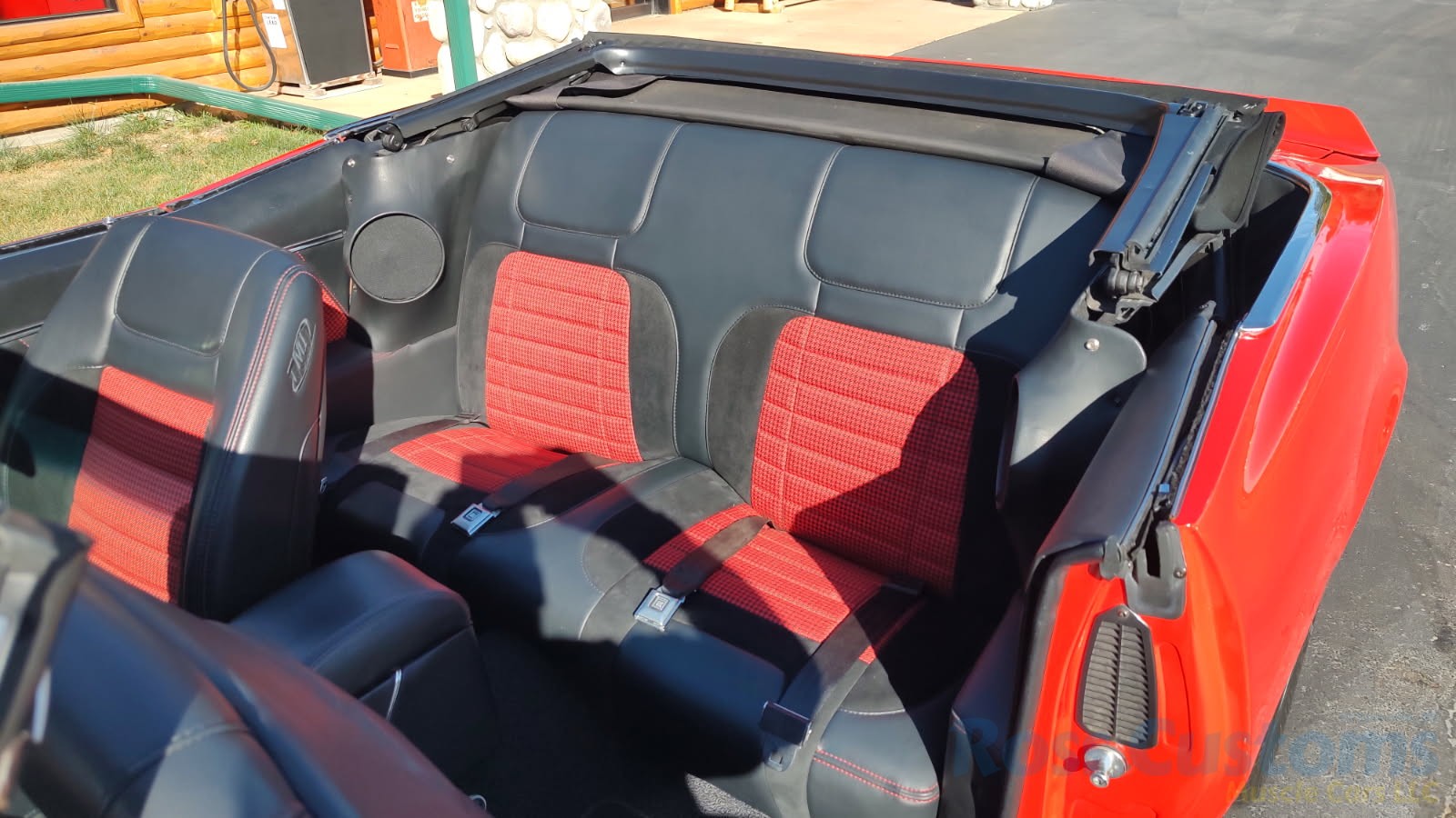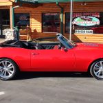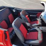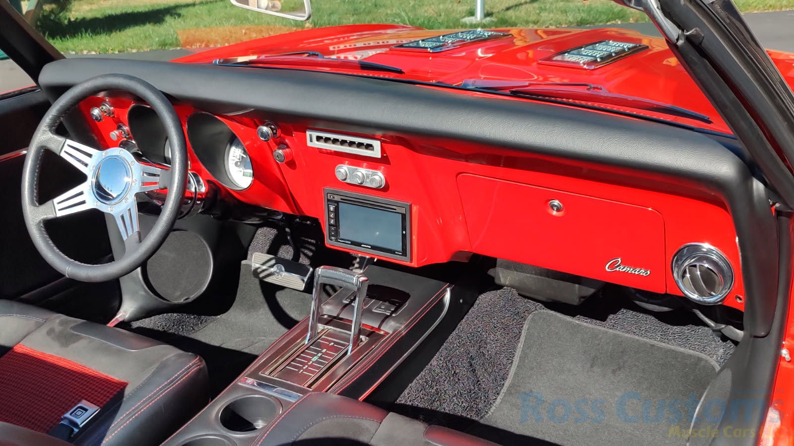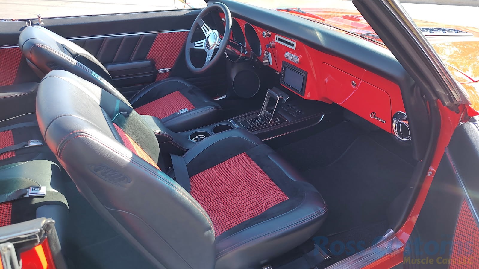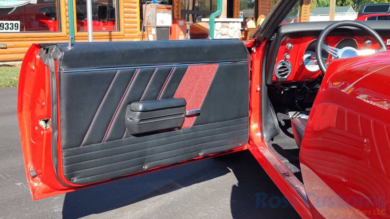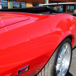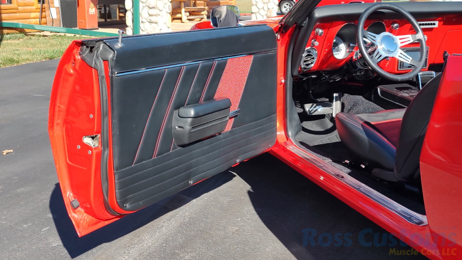 Full custom black interior with black and red houndstooth, dash has been refinished, all new wiring throughout, equipped with power windows, power top, power remote locks, center of dash has been reworked to fit billet AC and heat controls, billet AC center vent, factory side AC dash vents have been replaced, full screen Alpine stereo system – CD, bluetooth, navigation; as well as backup camera, custom kick panel speakers which are leather wrapped; as well as custom rear side speakers, AMP’s nice mounted in trunk, nicely updated with Dakota Digital classic look instrumentation with full gauge package and GPS speedo, IDIDIT chrome steering column with LoKar billet steering wheel, deluxe pedal package, custom front and rear door panels with black and red houndstooth, custom TMI rear seat, front seats are original with custom TMI covers; as well as added bolster for better comfort and handling, custom center console with cup holds, nicely outfitted with factory staple shifter that has been converted to work correctly with the 700R4 overdrive automatic trans; also within console are the power window switches, new carpet, floormats and sill plates, trunk has also been custom upholstered to match.