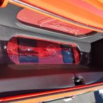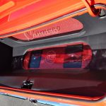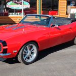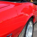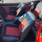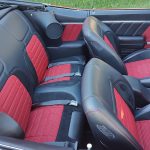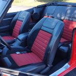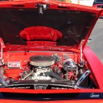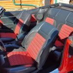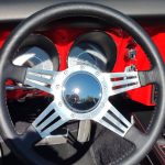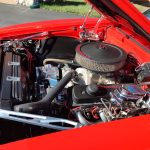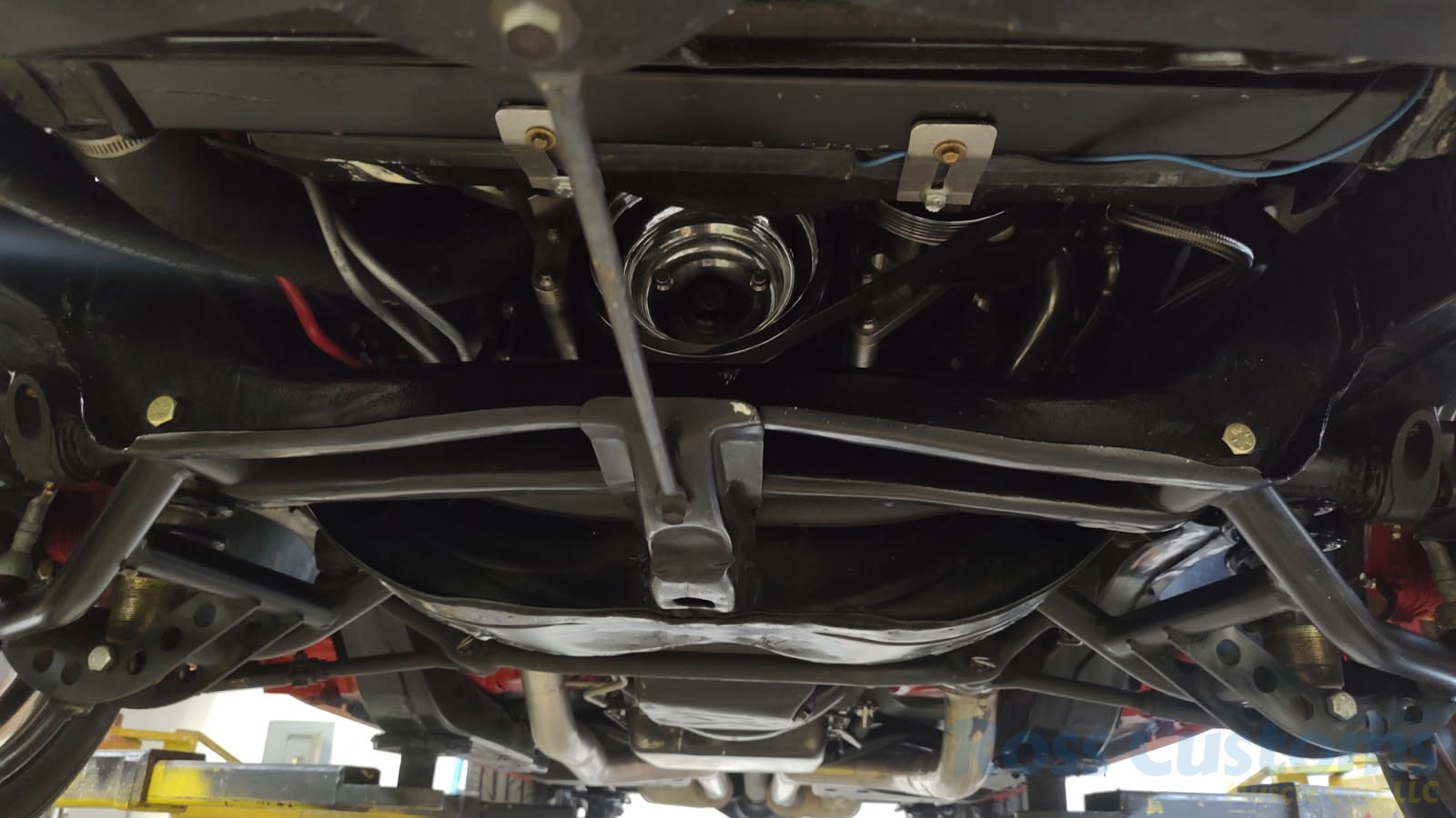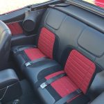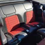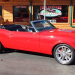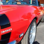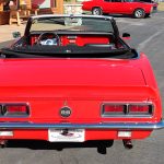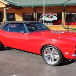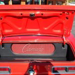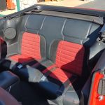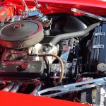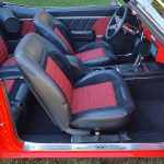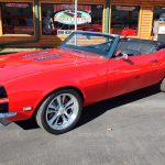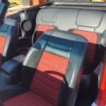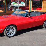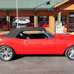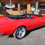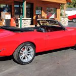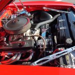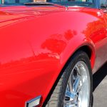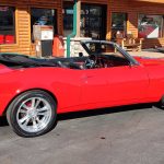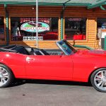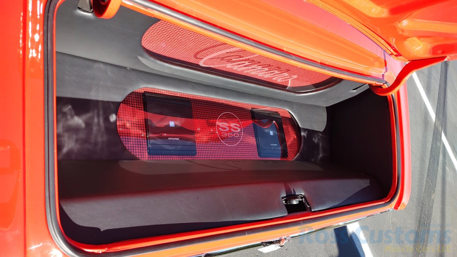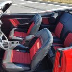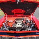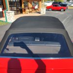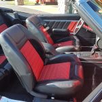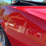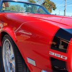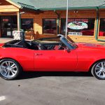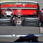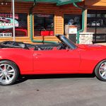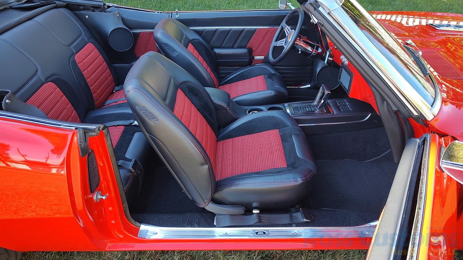 Full custom black interior with black and red houndstooth, dash has been refinished, all new wiring throughout, equipped with power windows, power top, power remote locks, center of dash has been reworked to fit billet AC and heat controls, billet AC center vent, factory side AC dash vents have been replaced, full screen Alpine stereo system – CD, bluetooth, navigation; as well as backup camera, custom kick panel speakers which are leather wrapped; as well as custom rear side speakers, AMP’s nice mounted in trunk, nicely updated with Dakota Digital classic look instrumentation with full gauge package and GPS speedo, IDIDIT chrome steering column with LoKar billet steering wheel, deluxe pedal package, custom front and rear door panels with black and red houndstooth, custom TMI rear seat, front seats are original with custom TMI covers; as well as added bolster for better comfort and handling, custom center console with cup holds, nicely outfitted with factory staple shifter that has been converted to work correctly with the 700R4 overdrive automatic trans; also within console are the power window switches, new carpet, floormats and sill plates, trunk has also been custom upholstered to match.