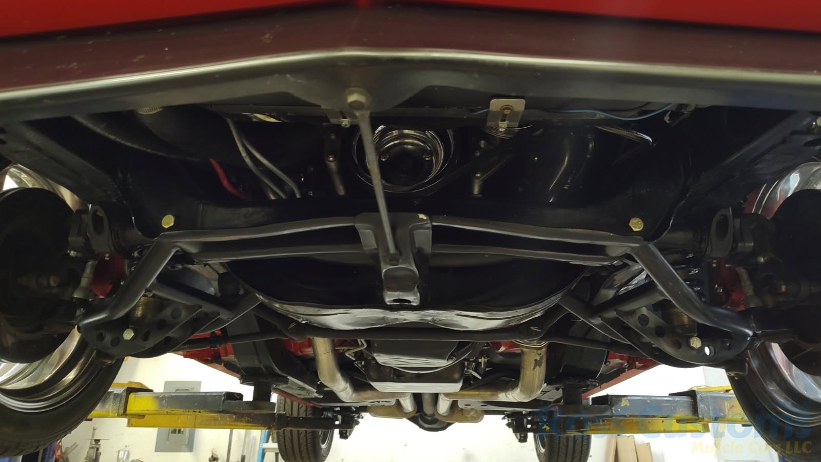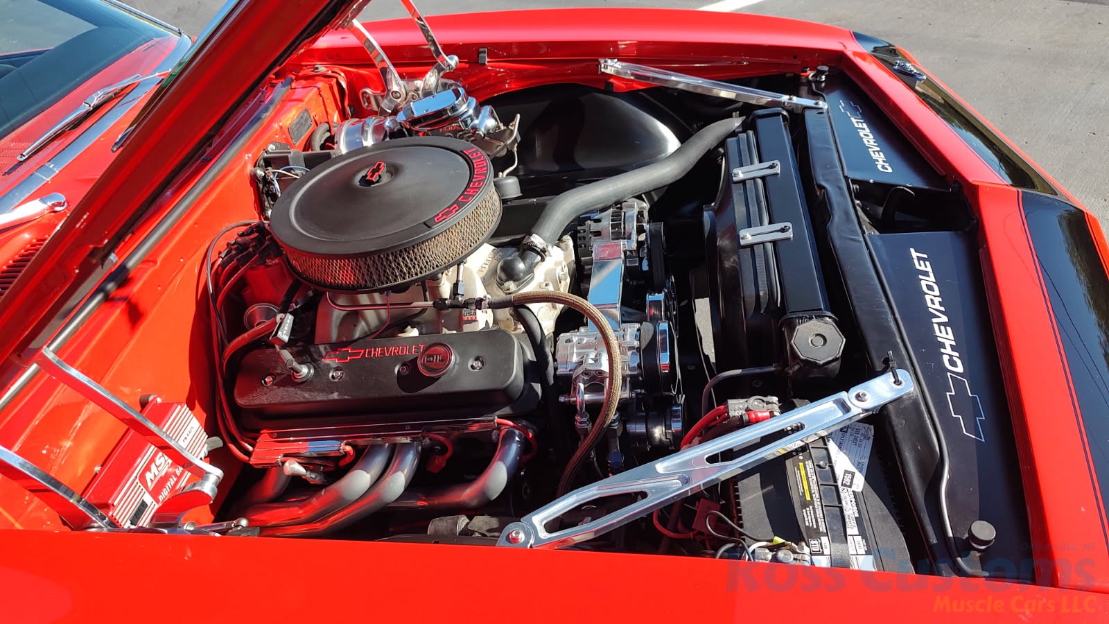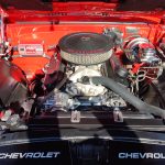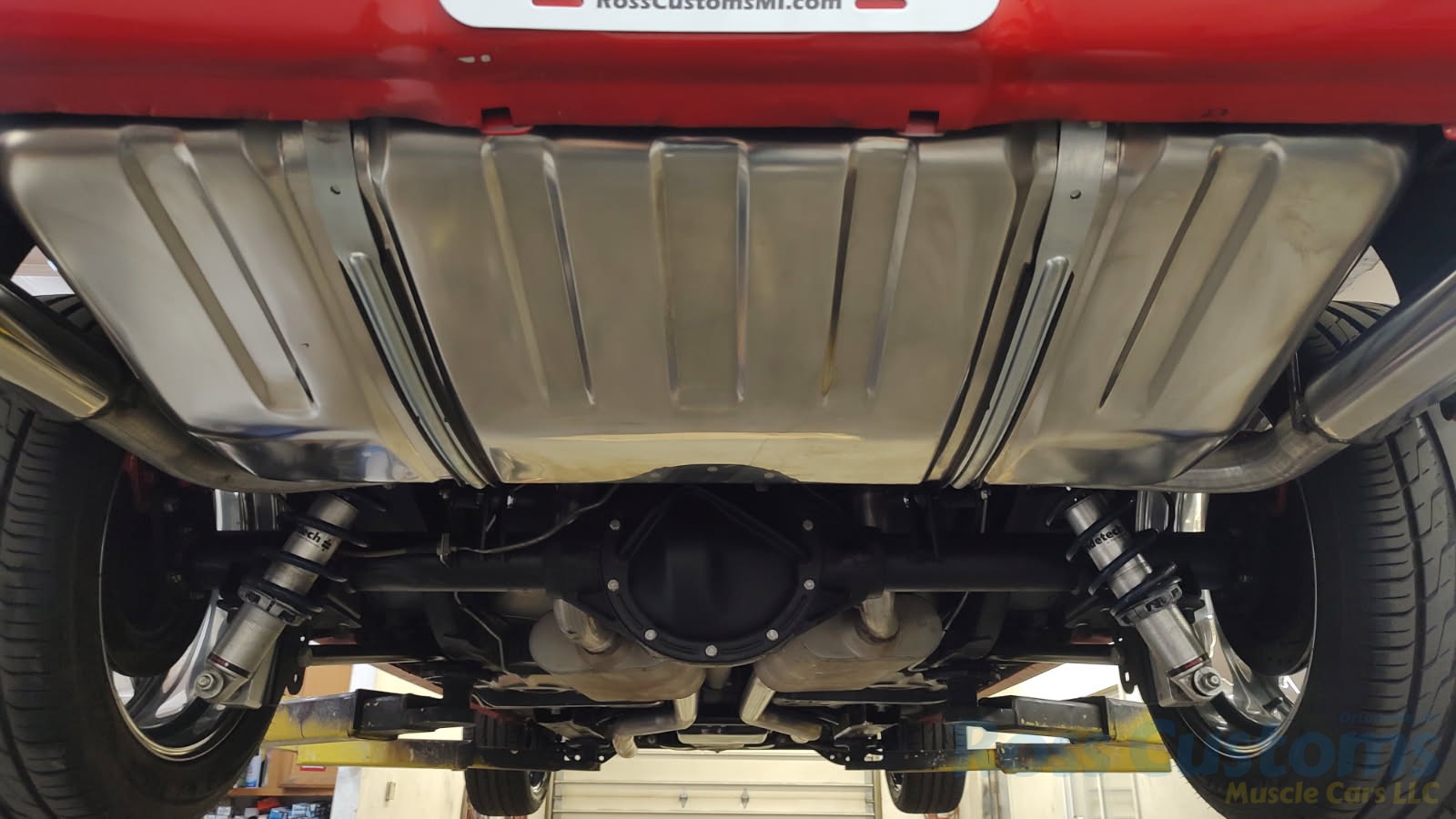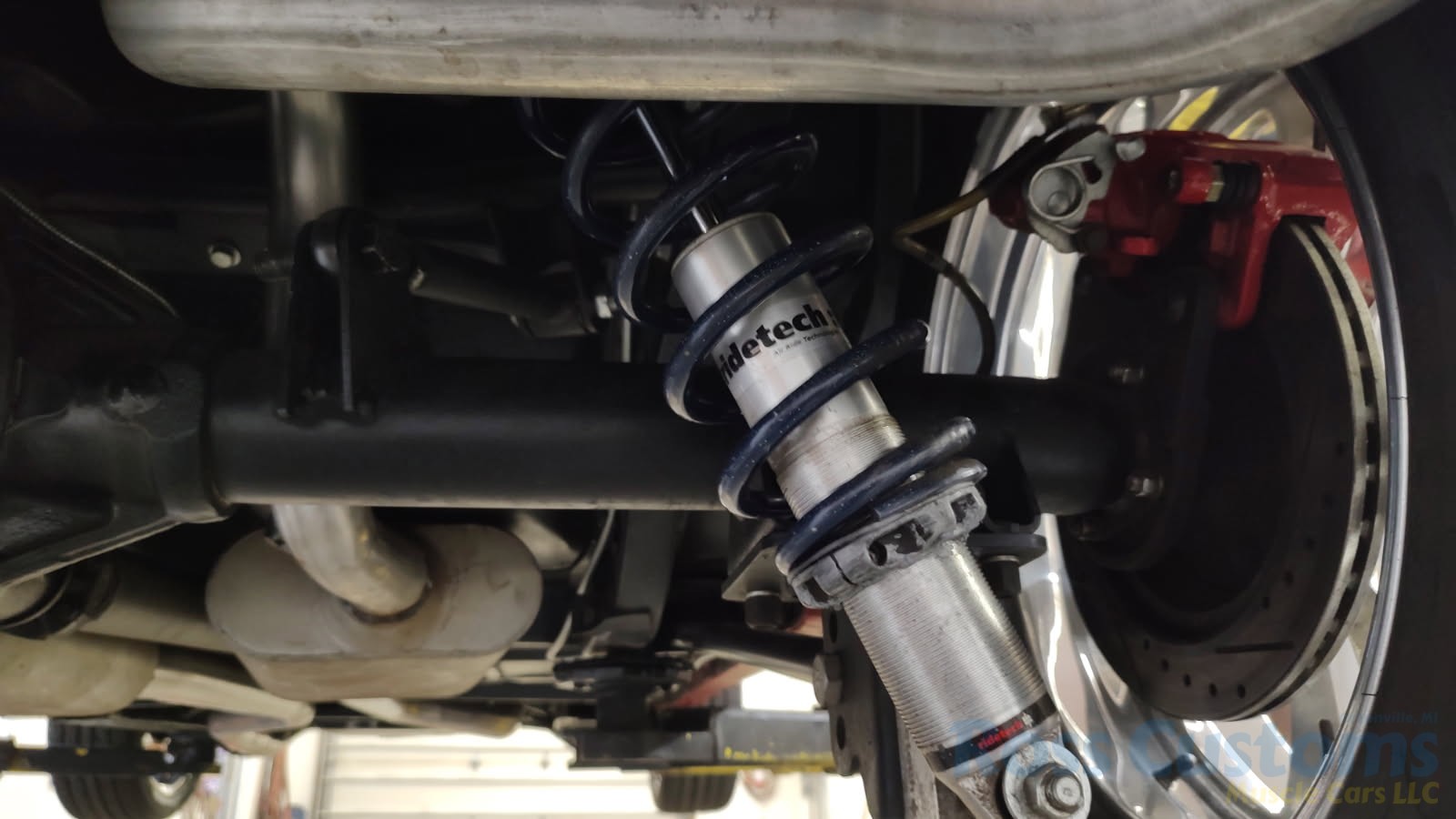 Under the hood we have a GM Crate 350 motor, 350 horse, Vortec cylinder heads, Edelbrock performer intake, Holley dual feed 4 barrel carb with electric choke, nicely updated with full MSD ignition, billet aluminum serpentine front runner kit with polished pulleys and brackets, aluminum high flow water pump, polished AC compressor and alternator, GM power steering pump, GM performance valve covers and air cleaner, heavy duty radiator with thermostatic controlled electric fan, updated with Quick Steer steering box, power 4 wheel disc brakes with drilled and slotted rotors – front are 12 inch rotors with 4 piston calipers, this strong running 350 is backed up with 700R4 overdrive automatic, set of ceramic coated mid-length headers into 2 1/2 inch dual Flowmaster exhaust out the back with stainless tips, front suspension has been nicely updated with full Ridetech suspension package; tubular upper and lower controls arms, 1 1/4 fully adjustable front sway bar, fully adjustable coil overs, rear suspension has also been updated with Ridetech 4 link rear suspension package, fully adjustable coil overs, 10 bolt posi rear with 331 gear, Moser axels, disc brakes with drilled and slotted rotors, new stainless fuel tank and sending unit.
