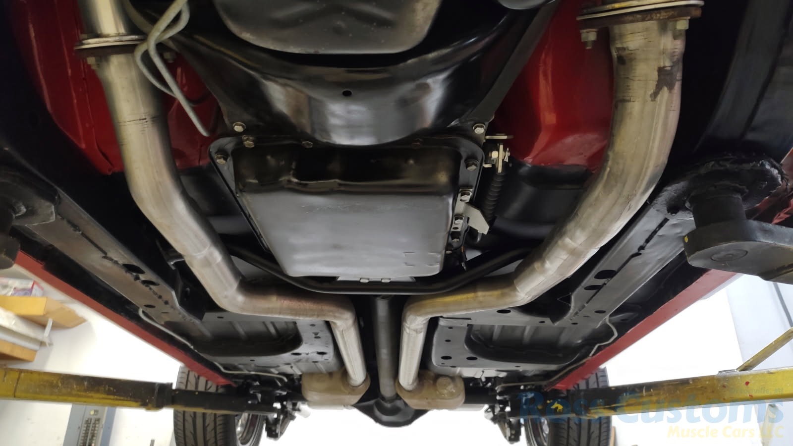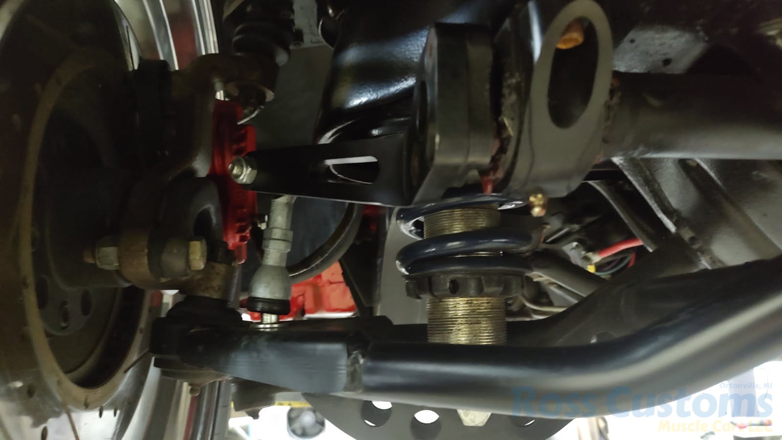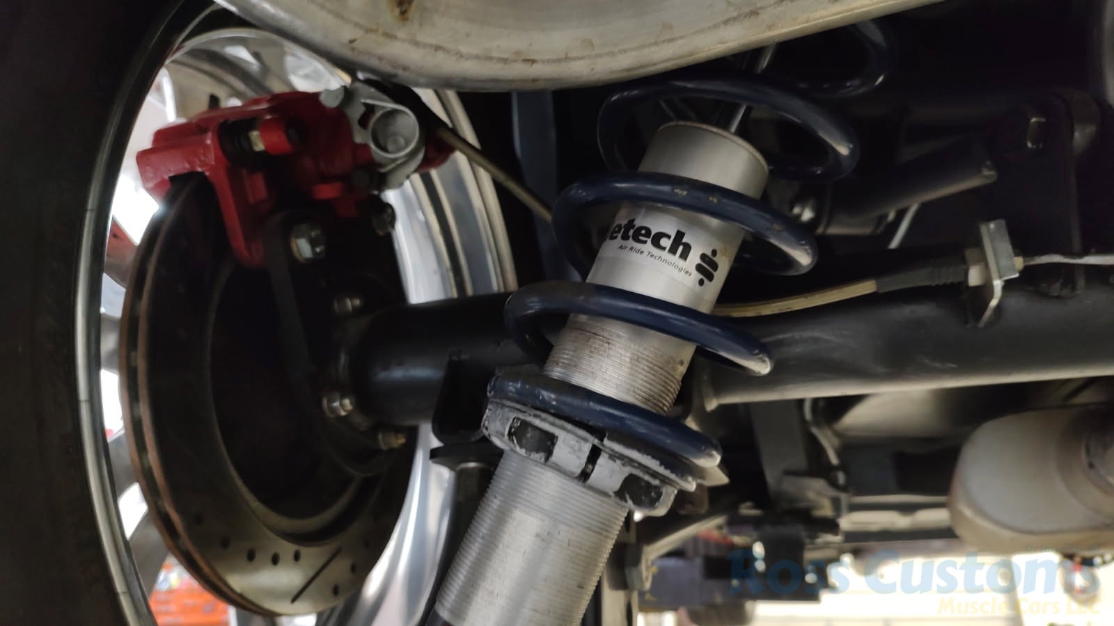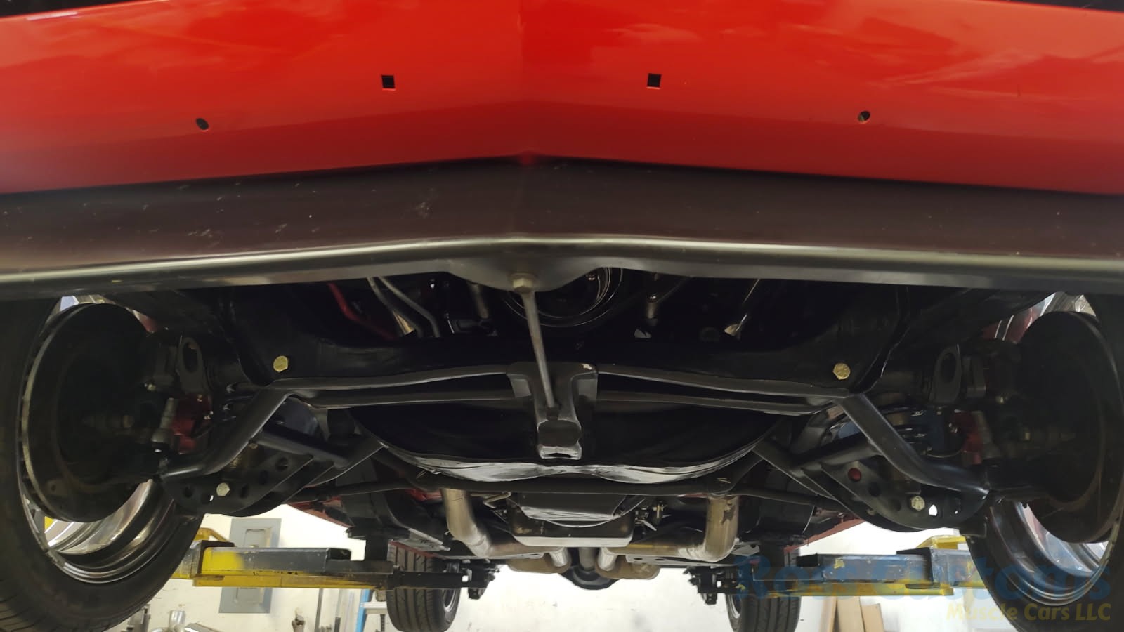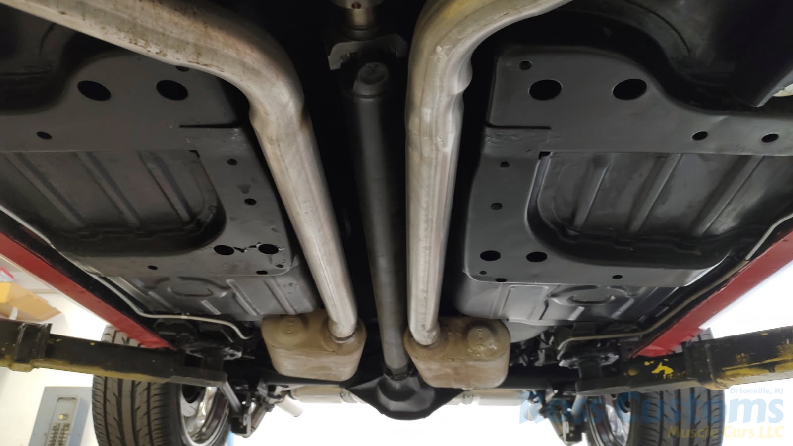 Under the hood we have a GM Crate 350 motor, 350 horse, Vortec cylinder heads, Edelbrock performer intake, Holley dual feed 4 barrel carb with electric choke, nicely updated with full MSD ignition, billet aluminum serpentine front runner kit with polished pulleys and brackets, aluminum high flow water pump, polished AC compressor and alternator, GM power steering pump, GM performance valve covers and air cleaner, heavy duty radiator with thermostatic controlled electric fan, updated with Quick Steer steering box, power 4 wheel disc brakes with drilled and slotted rotors – front are 12 inch rotors with 4 piston calipers, this strong running 350 is backed up with 700R4 overdrive automatic, set of ceramic coated mid-length headers into 2 1/2 inch dual Flowmaster exhaust out the back with stainless tips, front suspension has been nicely updated with full Ridetech suspension package; tubular upper and lower controls arms, 1 1/4 fully adjustable front sway bar, fully adjustable coil overs, rear suspension has also been updated with Ridetech 4 link rear suspension package, fully adjustable coil overs, 10 bolt posi rear with 331 gear, Moser axels, disc brakes with drilled and slotted rotors, new stainless fuel tank and sending unit.