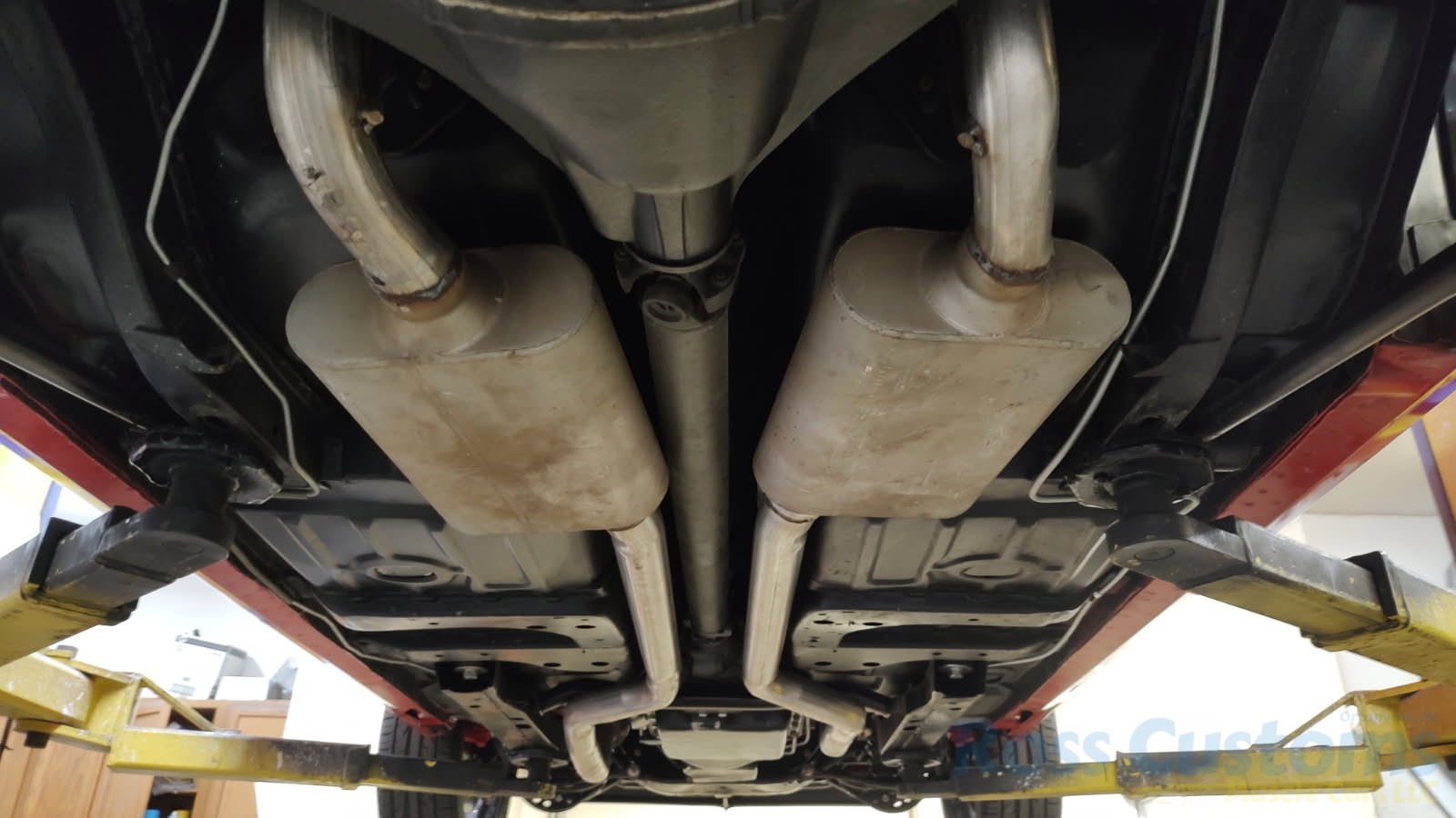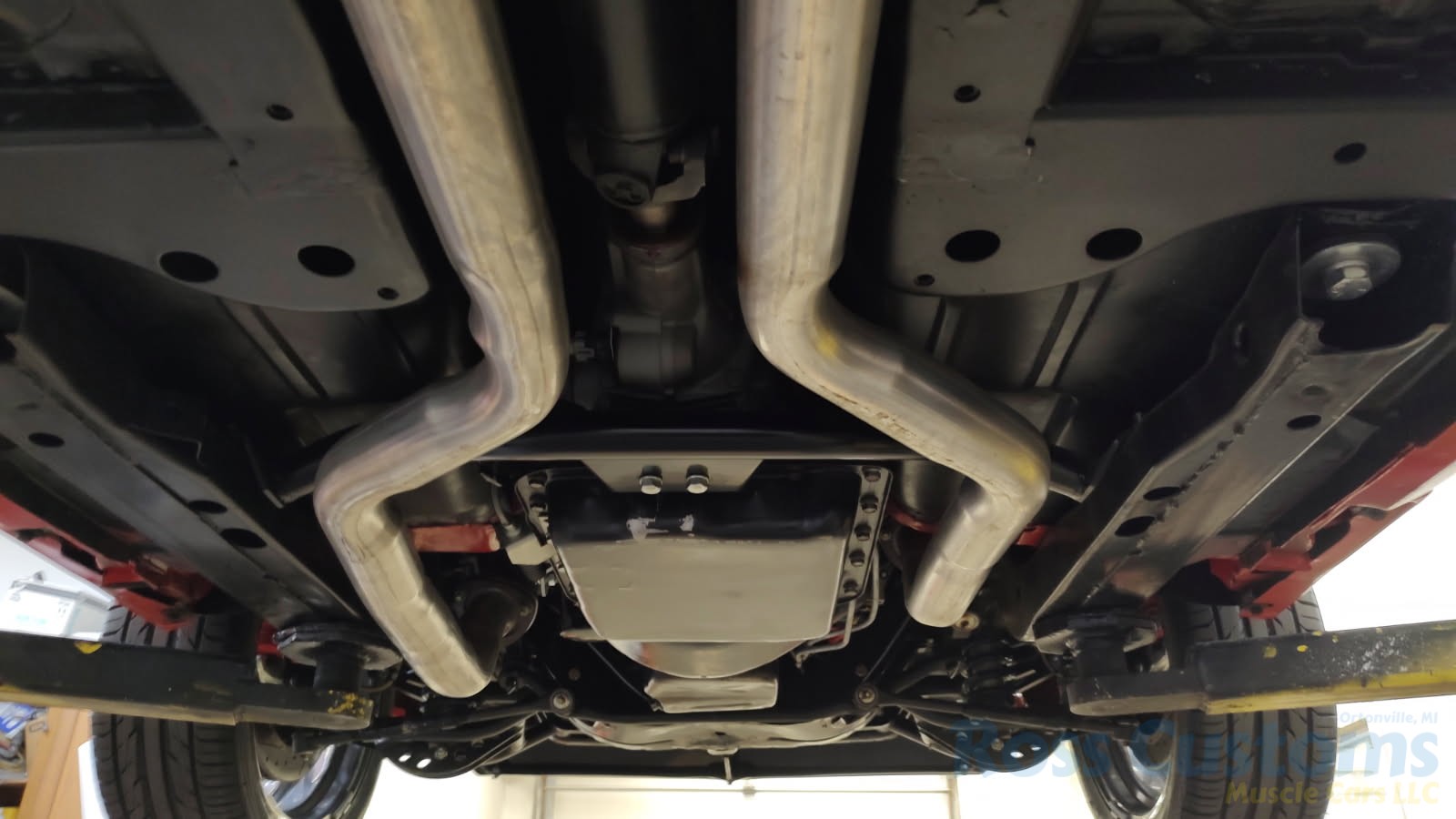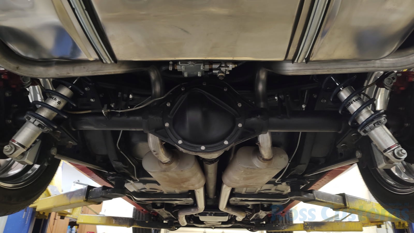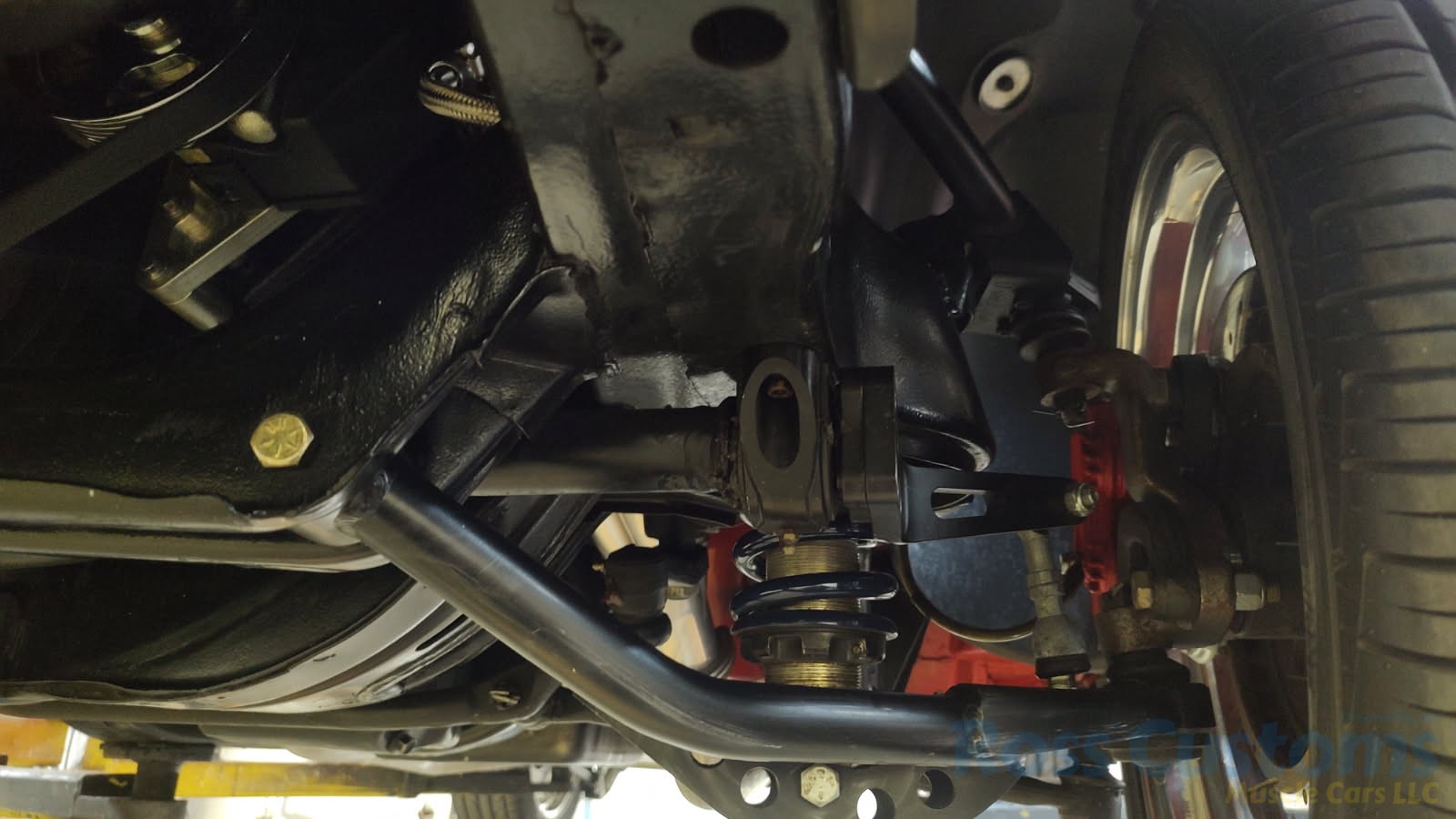 Under the hood we have a GM Crate 350 motor, 350 horse, Vortec cylinder heads, Edelbrock performer intake, Holley dual feed 4 barrel carb with electric choke, nicely updated with full MSD ignition, billet aluminum serpentine front runner kit with polished pulleys and brackets, aluminum high flow water pump, polished AC compressor and alternator, GM power steering pump, GM performance valve covers and air cleaner, heavy duty radiator with thermostatic controlled electric fan, updated with Quick Steer steering box, power 4 wheel disc brakes with drilled and slotted rotors – front are 12 inch rotors with 4 piston calipers, this strong running 350 is backed up with 700R4 overdrive automatic, set of ceramic coated mid-length headers into 2 1/2 inch dual Flowmaster exhaust out the back with stainless tips, front suspension has been nicely updated with full Ridetech suspension package; tubular upper and lower controls arms, 1 1/4 fully adjustable front sway bar, fully adjustable coil overs, rear suspension has also been updated with Ridetech 4 link rear suspension package, fully adjustable coil overs, 10 bolt posi rear with 331 gear, Moser axels, disc brakes with drilled and slotted rotors, new stainless fuel tank and sending unit.