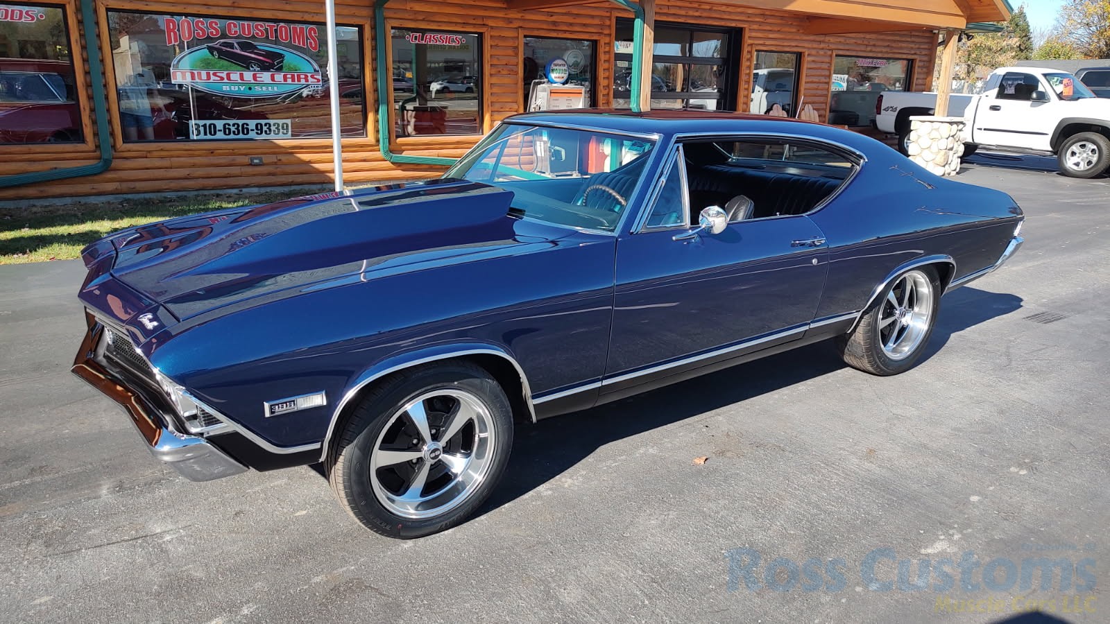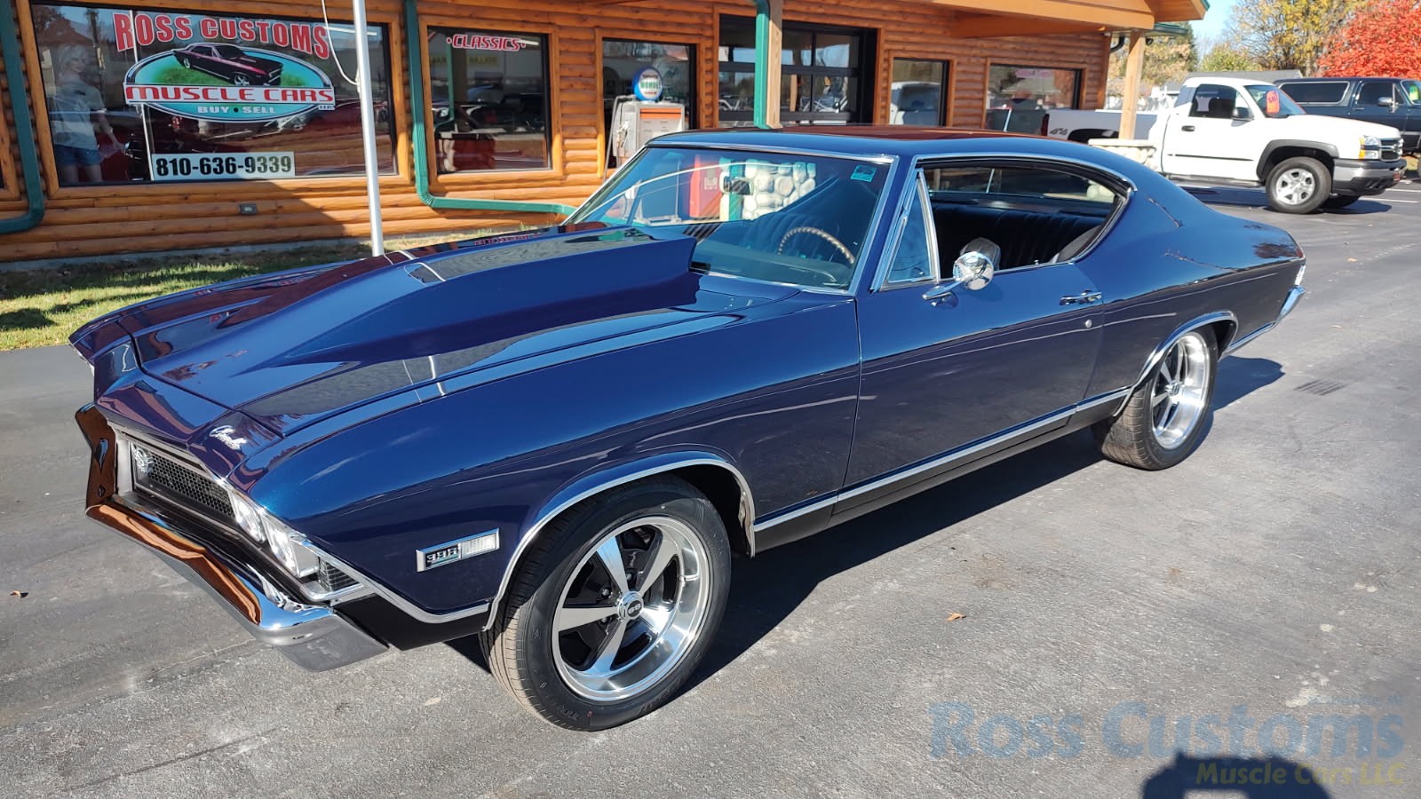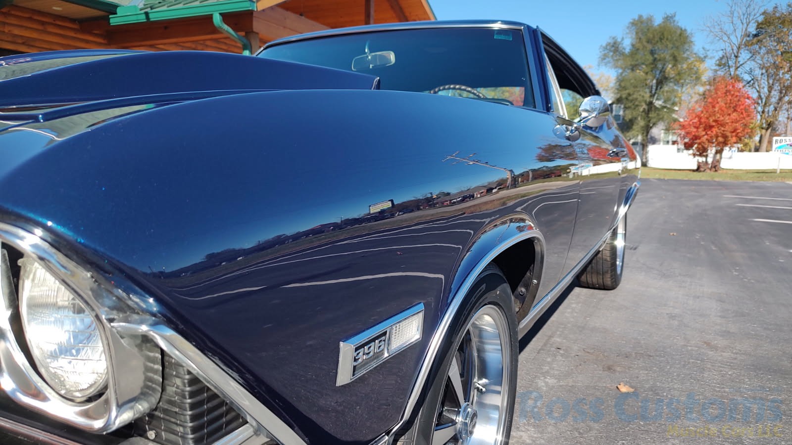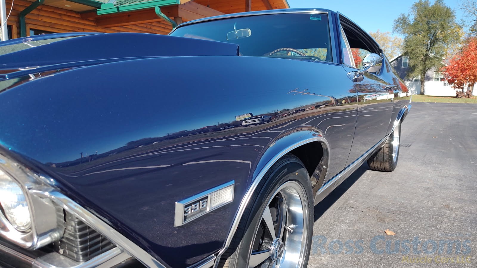 This is a “BAD ASS” 68 Chevelle SS 396 that has had a recent frame up restoration, done in “Show Quality” Midnight Blue Metallic, basecoat clearcoat, sanded and wheeled smooth, slick as glass, at time of restoration had new cowl hood added, new tinted windshield and back glass, side glass is original softray tint in excellent condition, all window stainless trim looks like new; as well as drip rail moldings, new weather stripping and window felts, new correct bowtie side view mirror, new door handles, grill, grill moldings, fender eye brows and headlight bezels all look like new, new front bumper, new 396 side markers, new SS body side moldings and wheel well moldings, taillight bezels and tail panel moldings are new, re-chromed rear bumper.