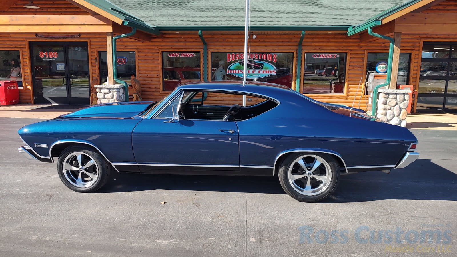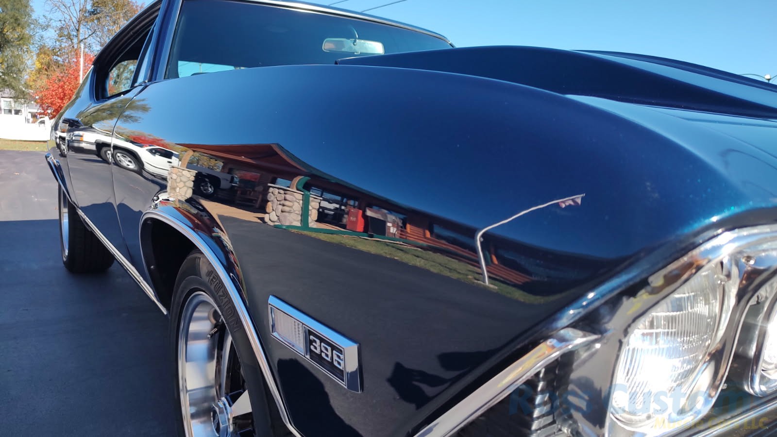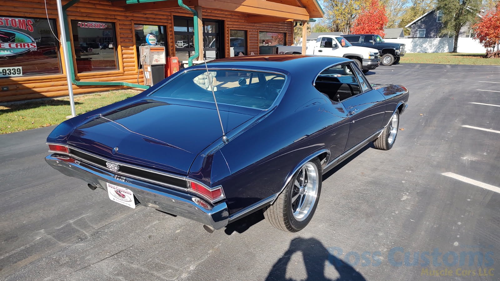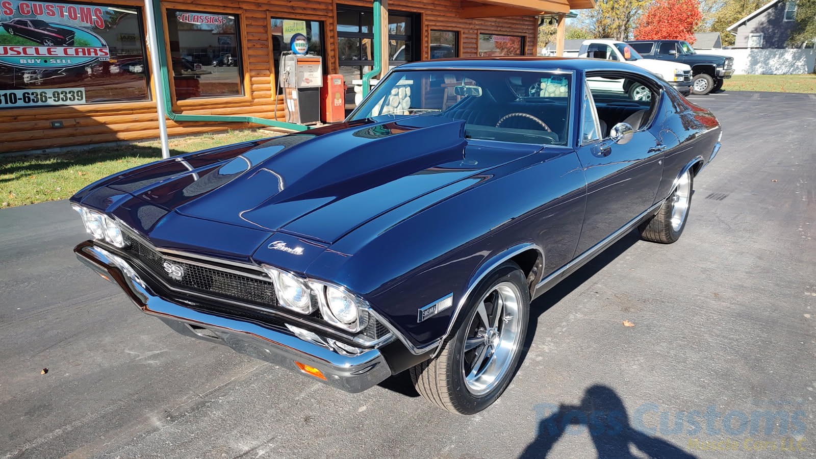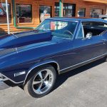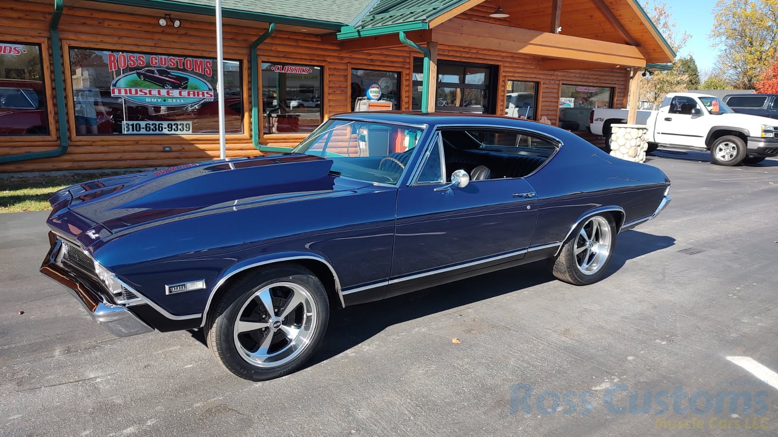 This is a “BAD ASS” 68 Chevelle SS 396 that has had a recent frame up restoration, done in “Show Quality” Midnight Blue Metallic, basecoat clearcoat, sanded and wheeled smooth, slick as glass, at time of restoration had new cowl hood added, new tinted windshield and back glass, side glass is original softray tint in excellent condition, all window stainless trim looks like new; as well as drip rail moldings, new weather stripping and window felts, new correct bowtie side view mirror, new door handles, grill, grill moldings, fender eye brows and headlight bezels all look like new, new front bumper, new 396 side markers, new SS body side moldings and wheel well moldings, taillight bezels and tail panel moldings are new, re-chromed rear bumper.