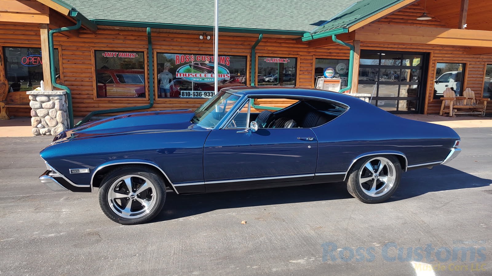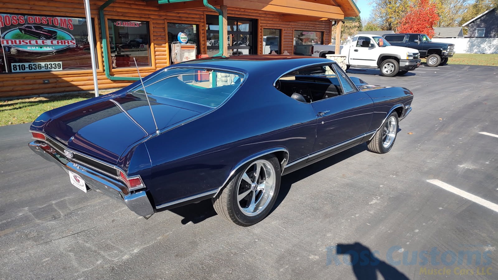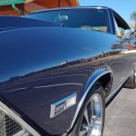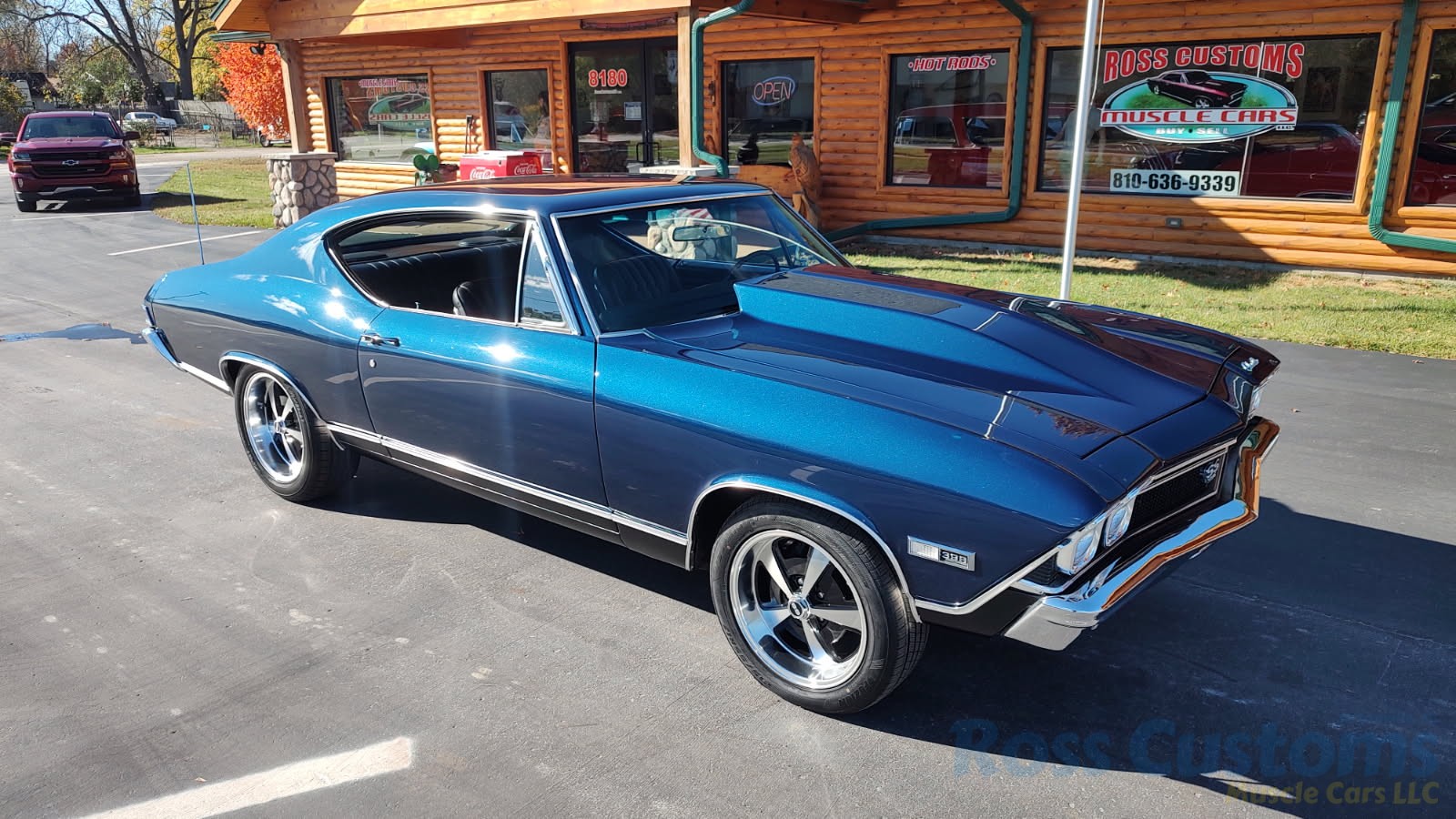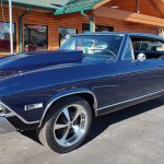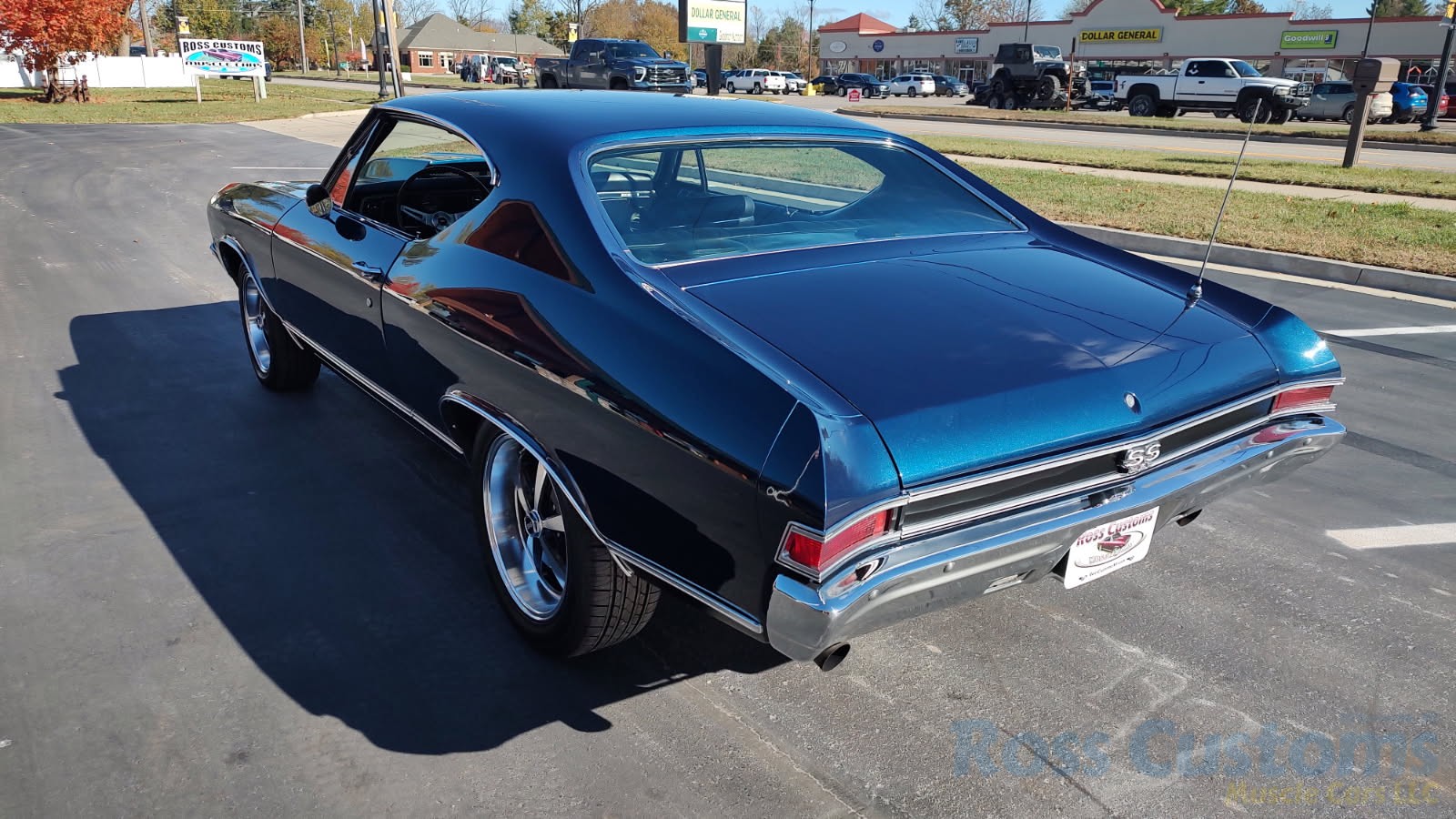 This is a “BAD ASS” 68 Chevelle SS 396 that has had a recent frame up restoration, done in “Show Quality” Midnight Blue Metallic, basecoat clearcoat, sanded and wheeled smooth, slick as glass, at time of restoration had new cowl hood added, new tinted windshield and back glass, side glass is original softray tint in excellent condition, all window stainless trim looks like new; as well as drip rail moldings, new weather stripping and window felts, new correct bowtie side view mirror, new door handles, grill, grill moldings, fender eye brows and headlight bezels all look like new, new front bumper, new 396 side markers, new SS body side moldings and wheel well moldings, taillight bezels and tail panel moldings are new, re-chromed rear bumper.