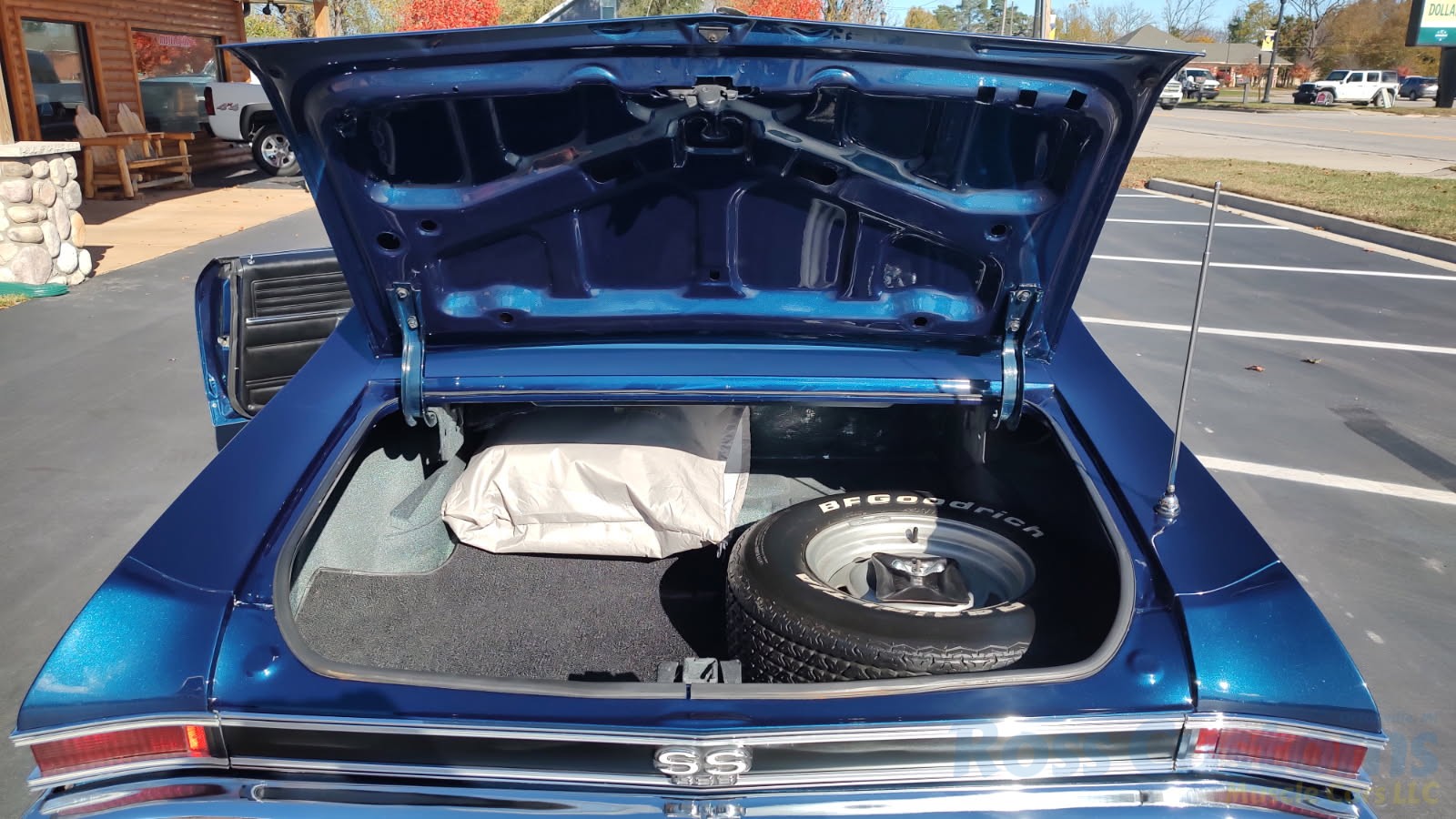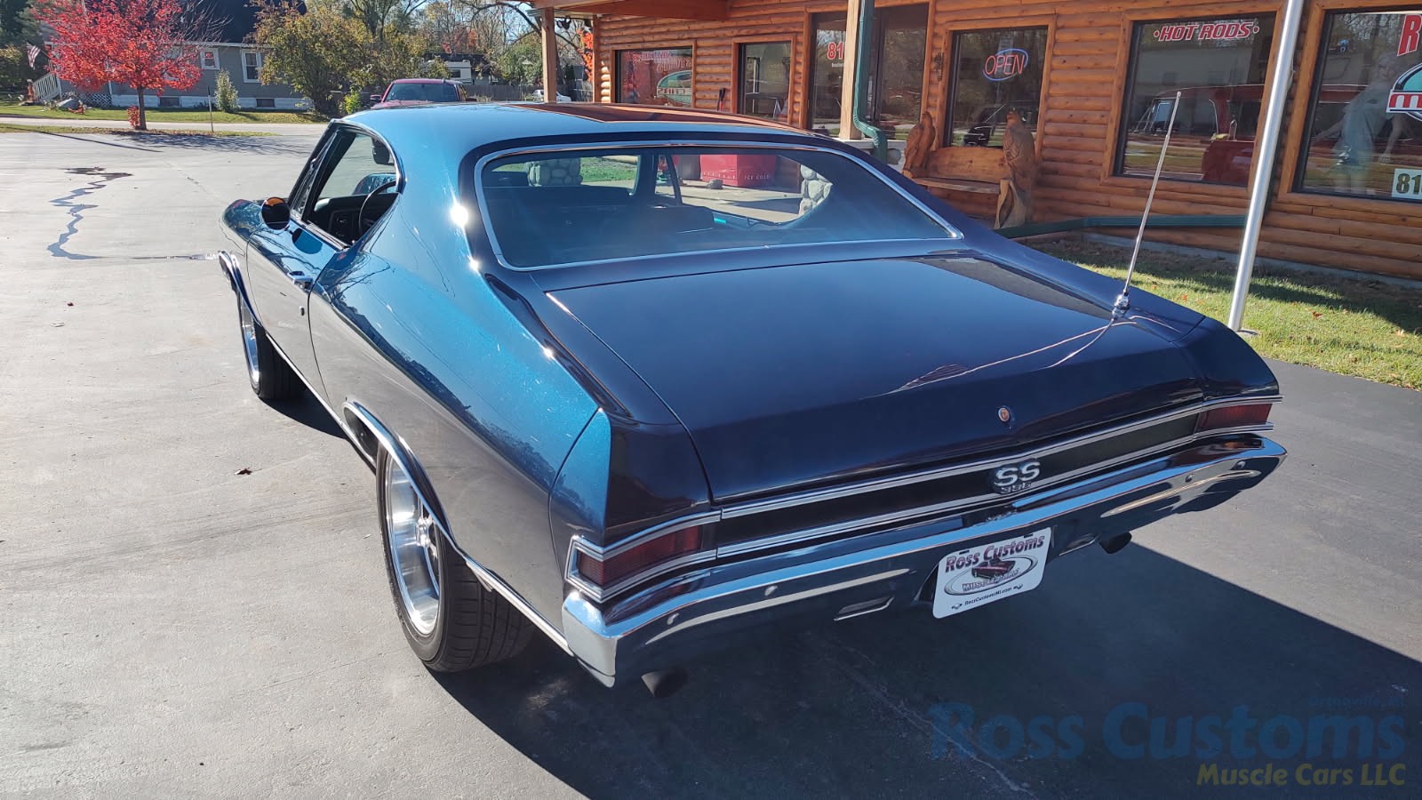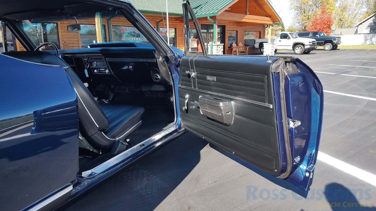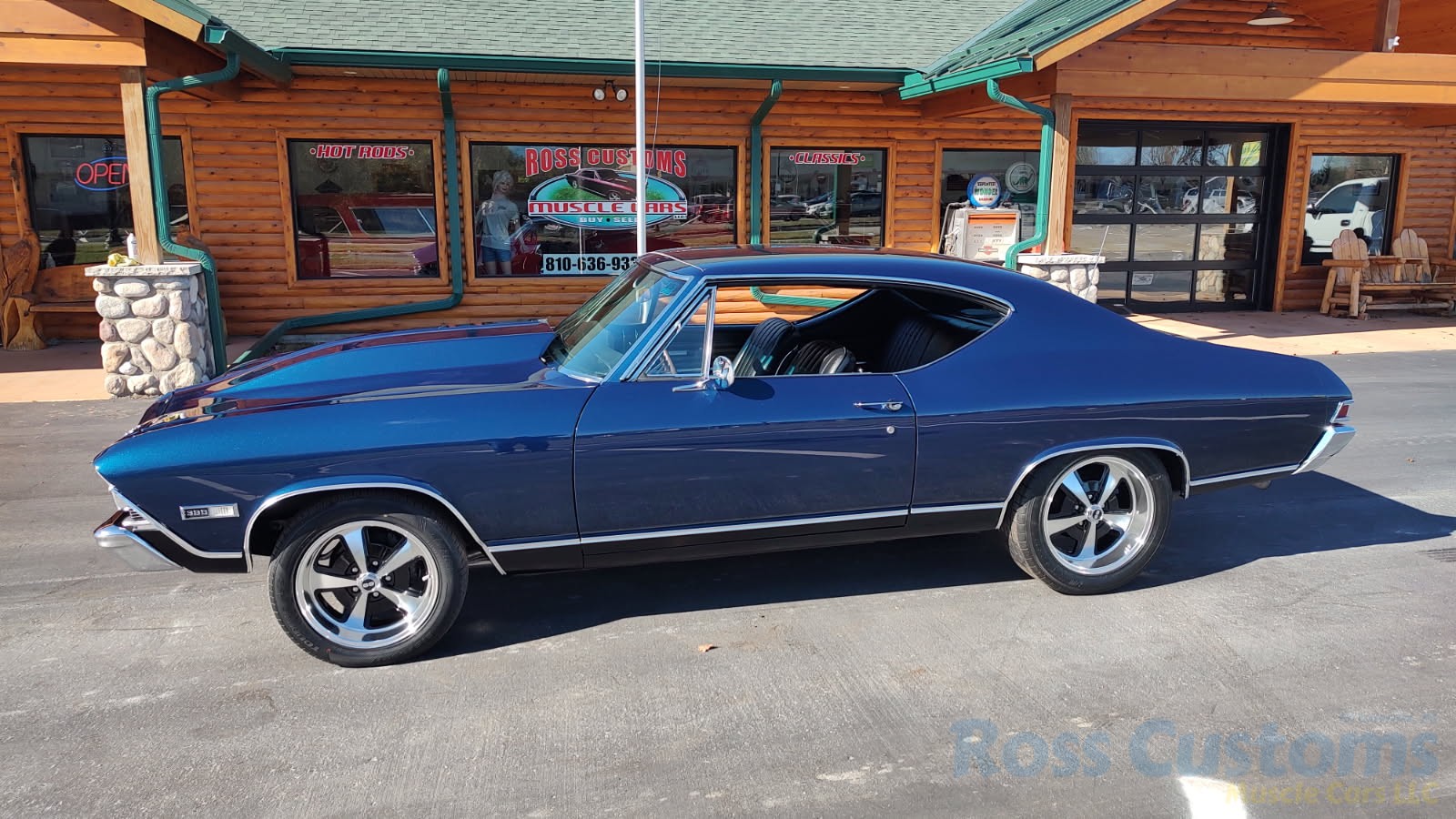 This is a “BAD ASS” 68 Chevelle SS 396 that has had a recent frame up restoration, done in “Show Quality” Midnight Blue Metallic, basecoat clearcoat, sanded and wheeled smooth, slick as glass, at time of restoration had new cowl hood added, new tinted windshield and back glass, side glass is original softray tint in excellent condition, all window stainless trim looks like new; as well as drip rail moldings, new weather stripping and window felts, new correct bowtie side view mirror, new door handles, grill, grill moldings, fender eye brows and headlight bezels all look like new, new front bumper, new 396 side markers, new SS body side moldings and wheel well moldings, taillight bezels and tail panel moldings are new, re-chromed rear bumper.
