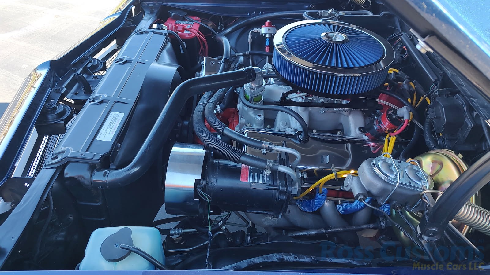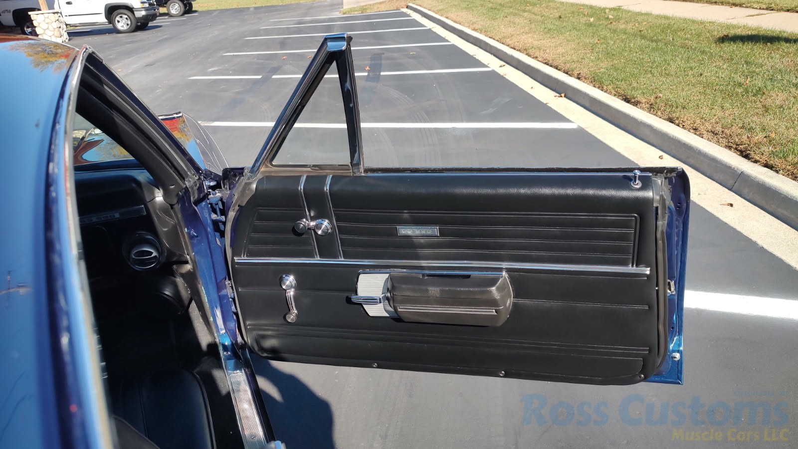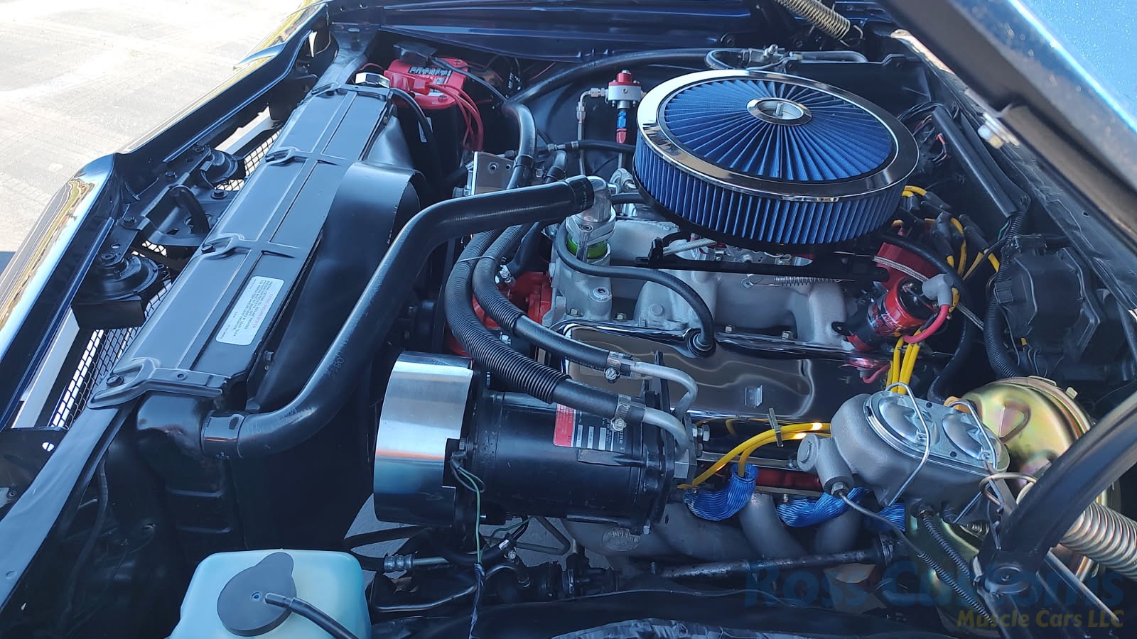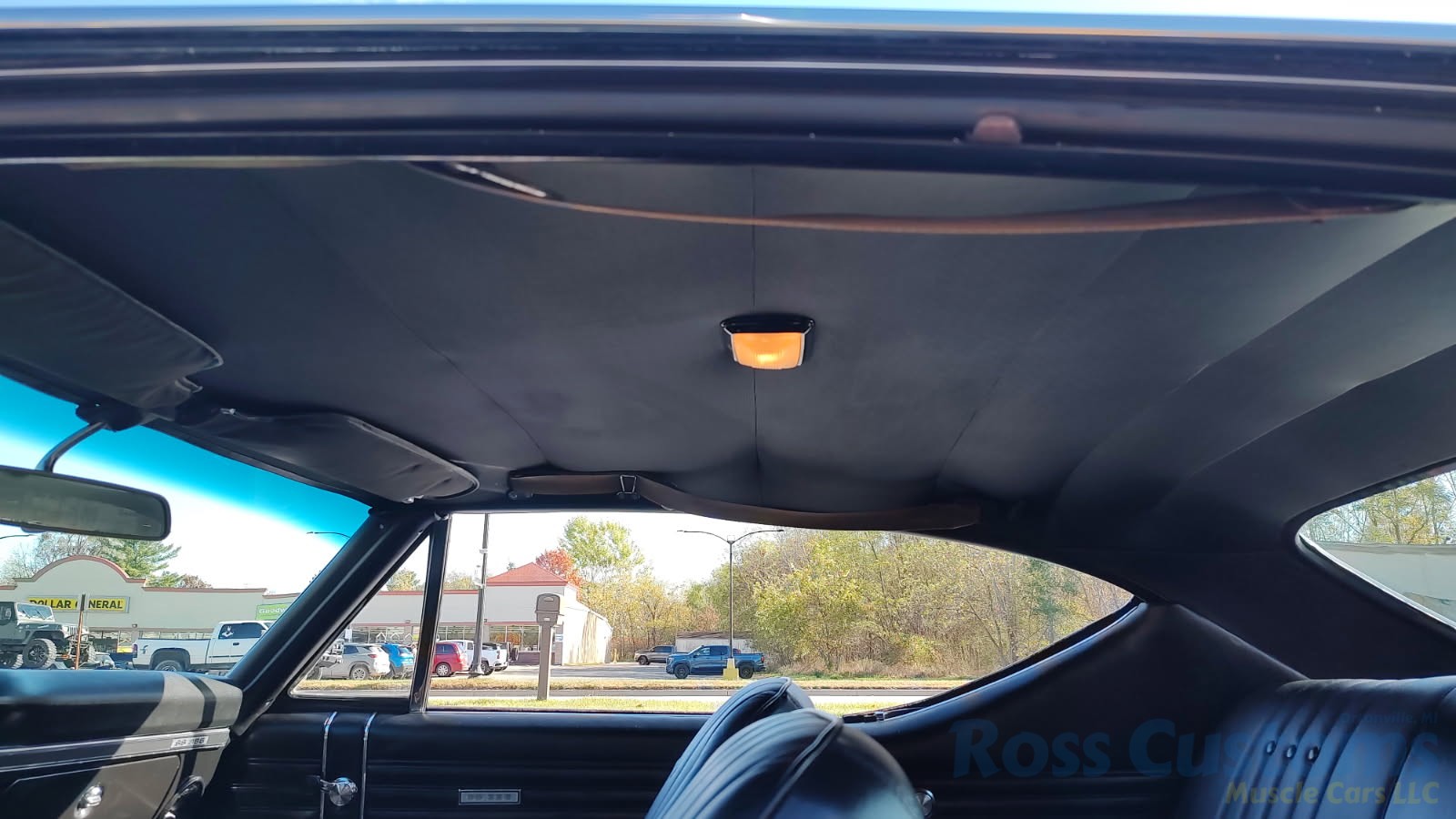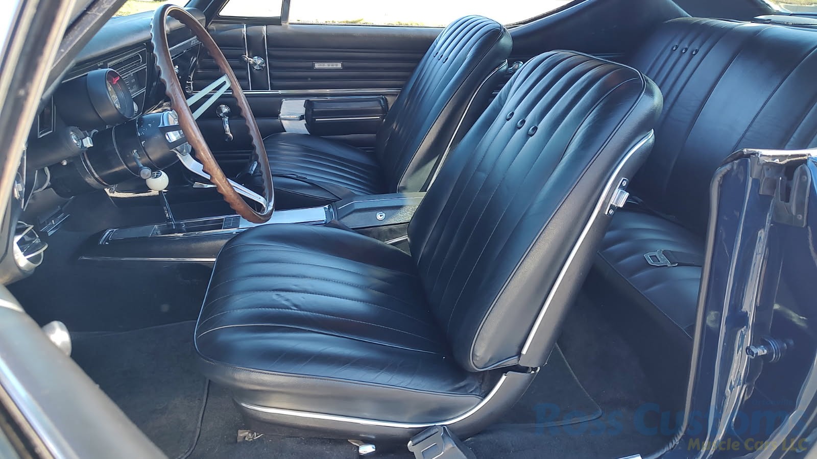 Factory black interior, factory dash in very good condition, factory gauge package with roller tach, updated with tach and shift light mounted to column which is more visible, factory AM/FM radio which has been disconnected – has AM/FM/CD stereo with remote nicely mounted in glovebox, front and rear speakers, new headliner, new front and rear door panels, new arm rest and bases, new front and rear seat covers, factory front and rear seatbelts, original center console in very good condition, new carpet, deluxe floor mats and sill plates.