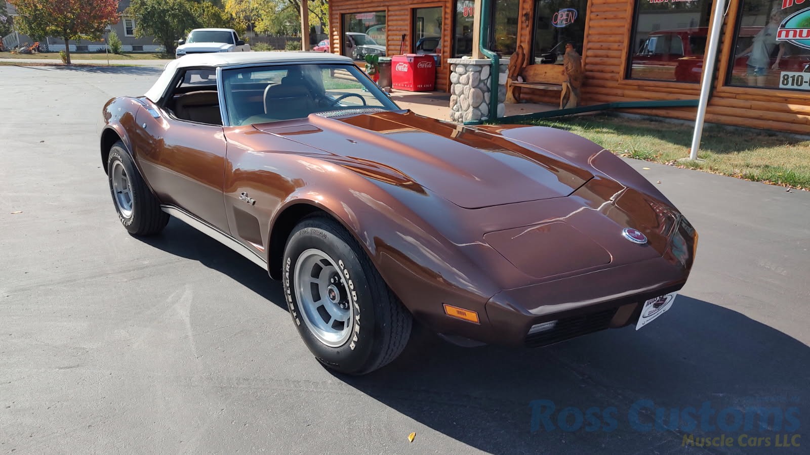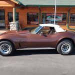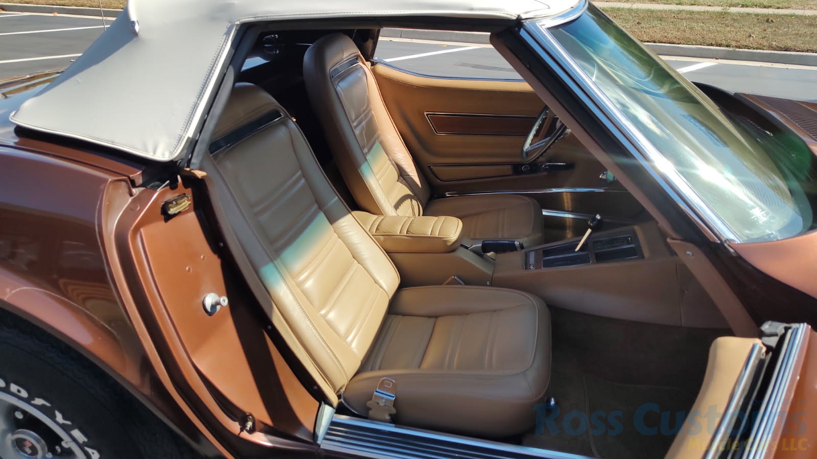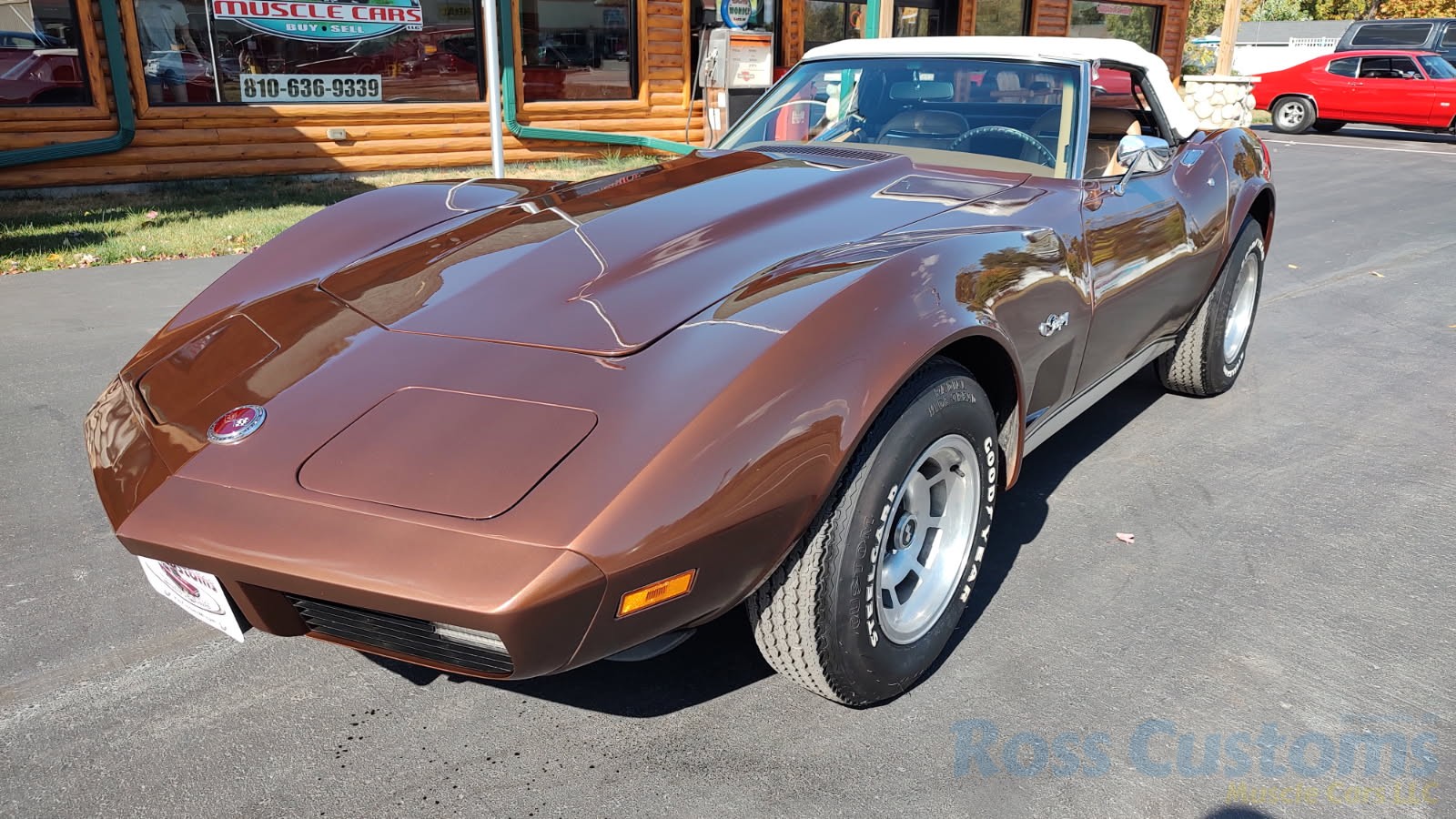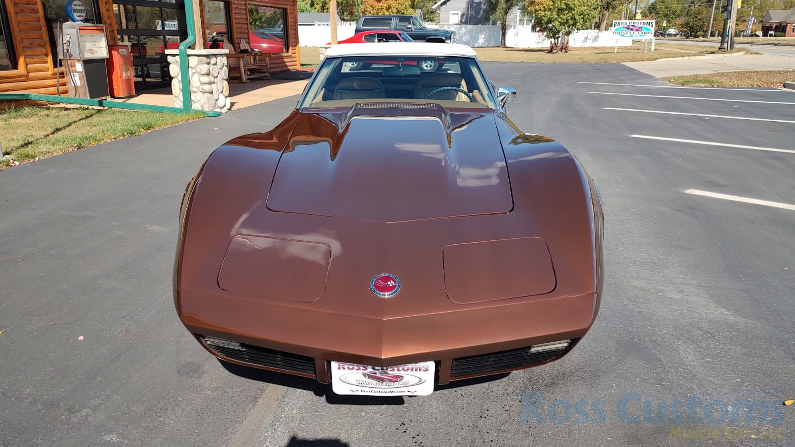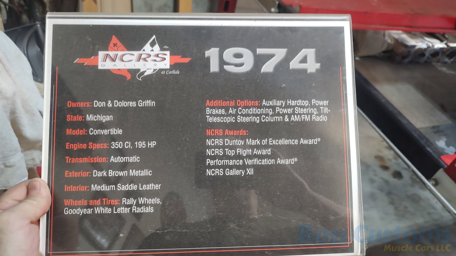 This is a very nice 2 owner 74 Corvette; past owner has owned for 40 years, 52,000 miles, has several NCRS awards, original condition, has had 1 very nice correct NCRS repaint its original factory Coco Brown Metallic, factory hardtop; as well as white convertible top – as seen in photos, convertible top is in excellent condition, original factory glass in excellent condition, original stainless in excellent condition, original window felts in excellent condition, weather stripping appears be have been replaced, original side view mirror in excellent condition, original emblems; as well as rocker moldings and taillights.