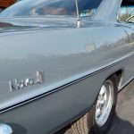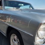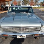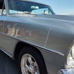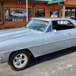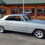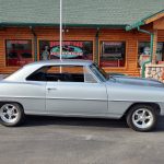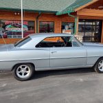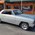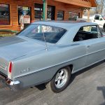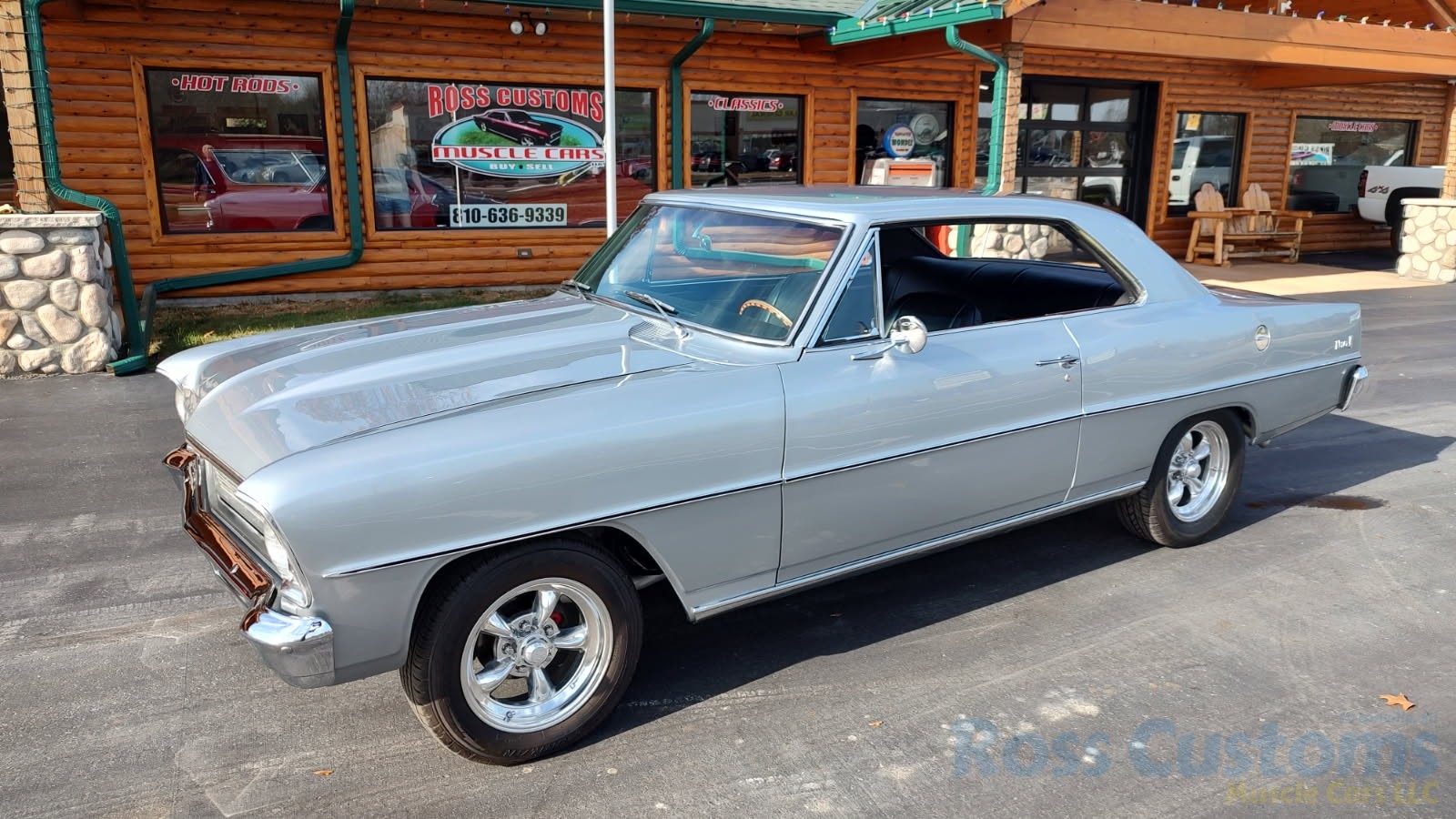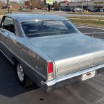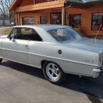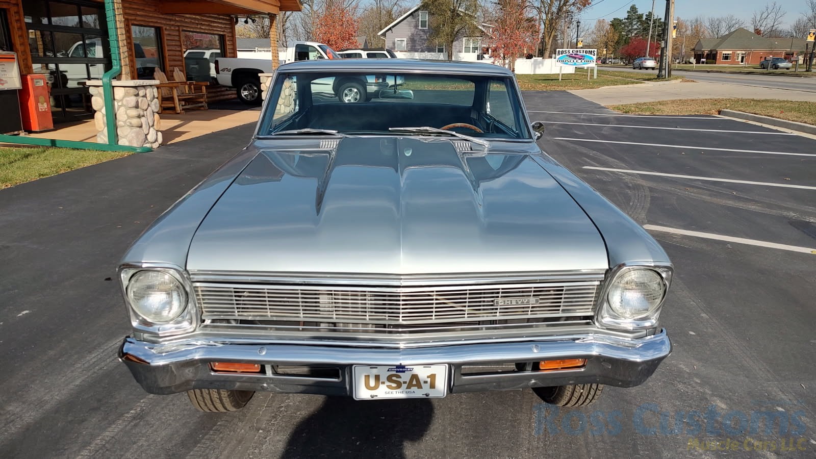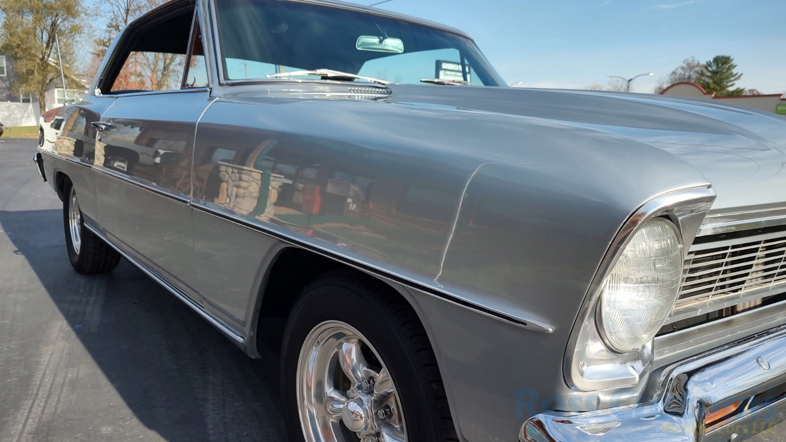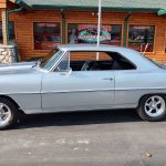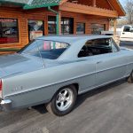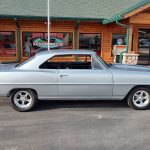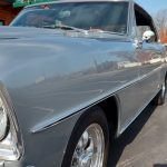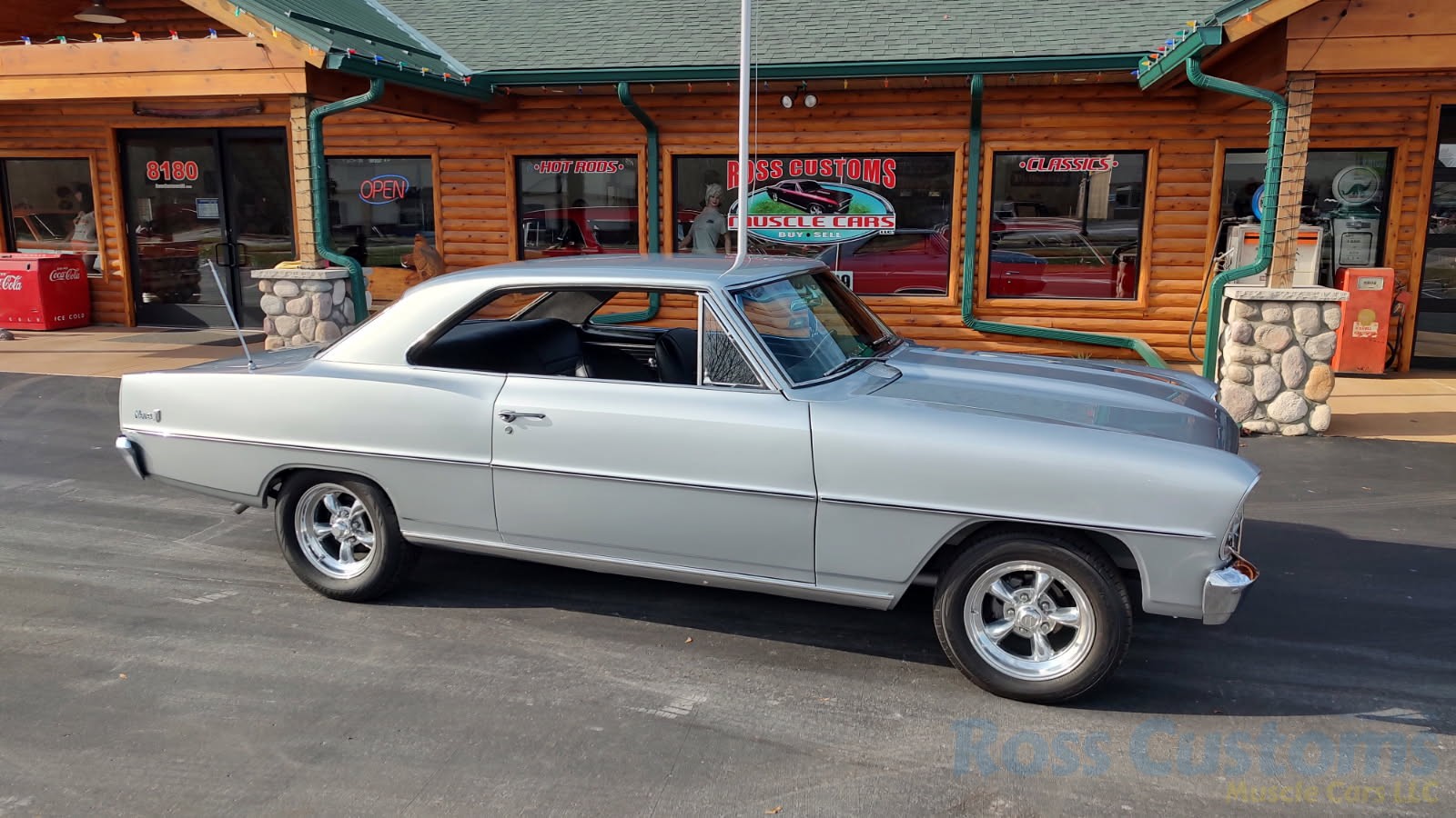 This is a very nice clean Chevy II Nova done in Switchblade Silver, basecoat clearcoat, sanded and wheeled smooth, at time of restoration has new tinted windshield and rubber, new weather stripping and window felts, all window stainless moldings are original in excellent condition, vent window chrome and upper door stainless moldings are original in excellent condition, new door handles, new correct bowtie side view mirror, at time of restoration had steel cowl hood added, new hood molding, original grill and headlight bezels in very good condition, new front bumper, body side moldings are original in excellent condition; as well as rocker moldings, taillights and taillight housings look like new, original trunk applique in very good condition, new rear bumper.