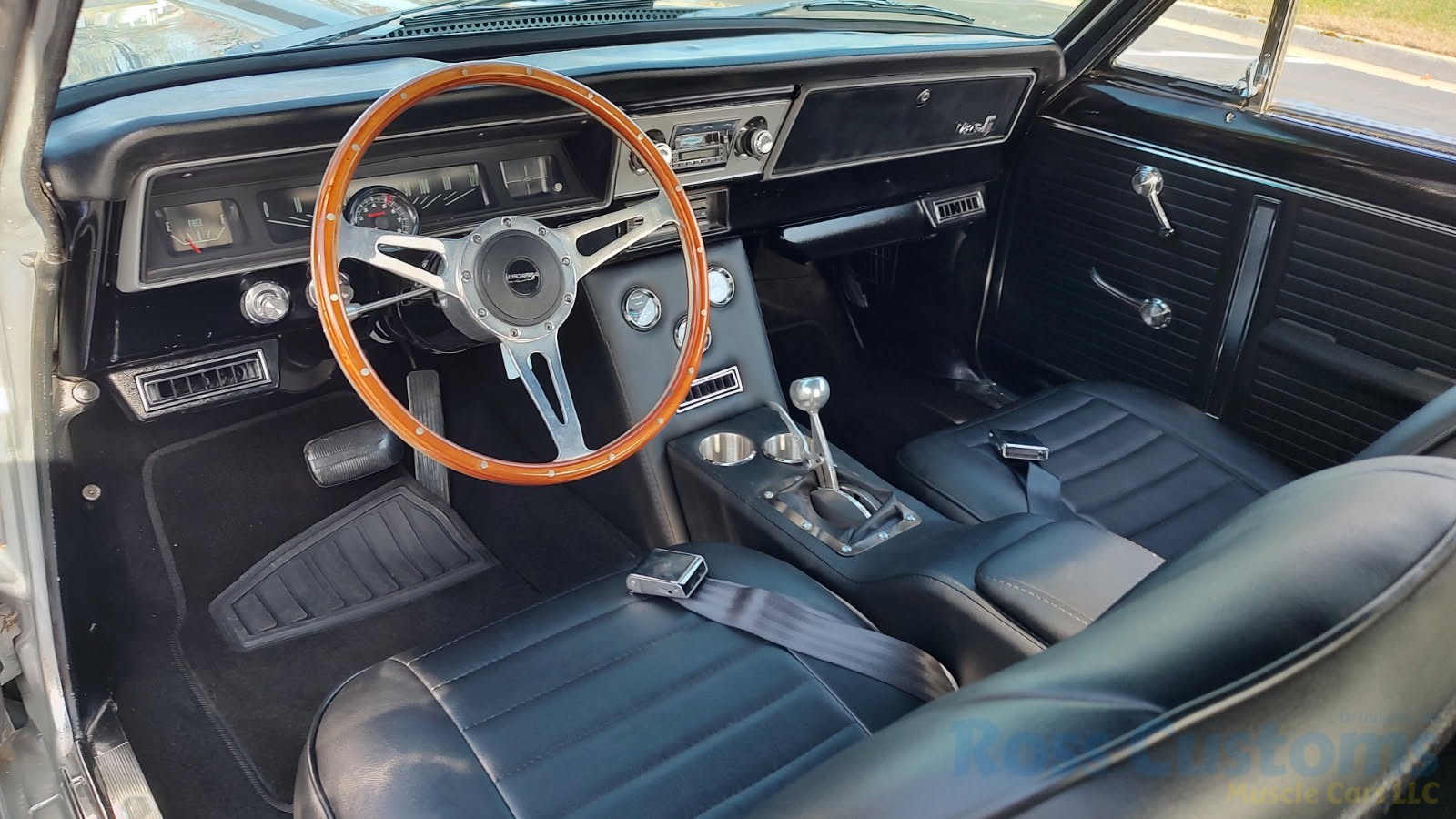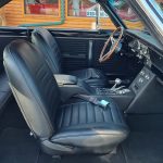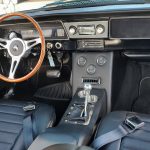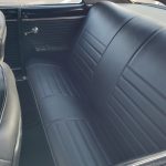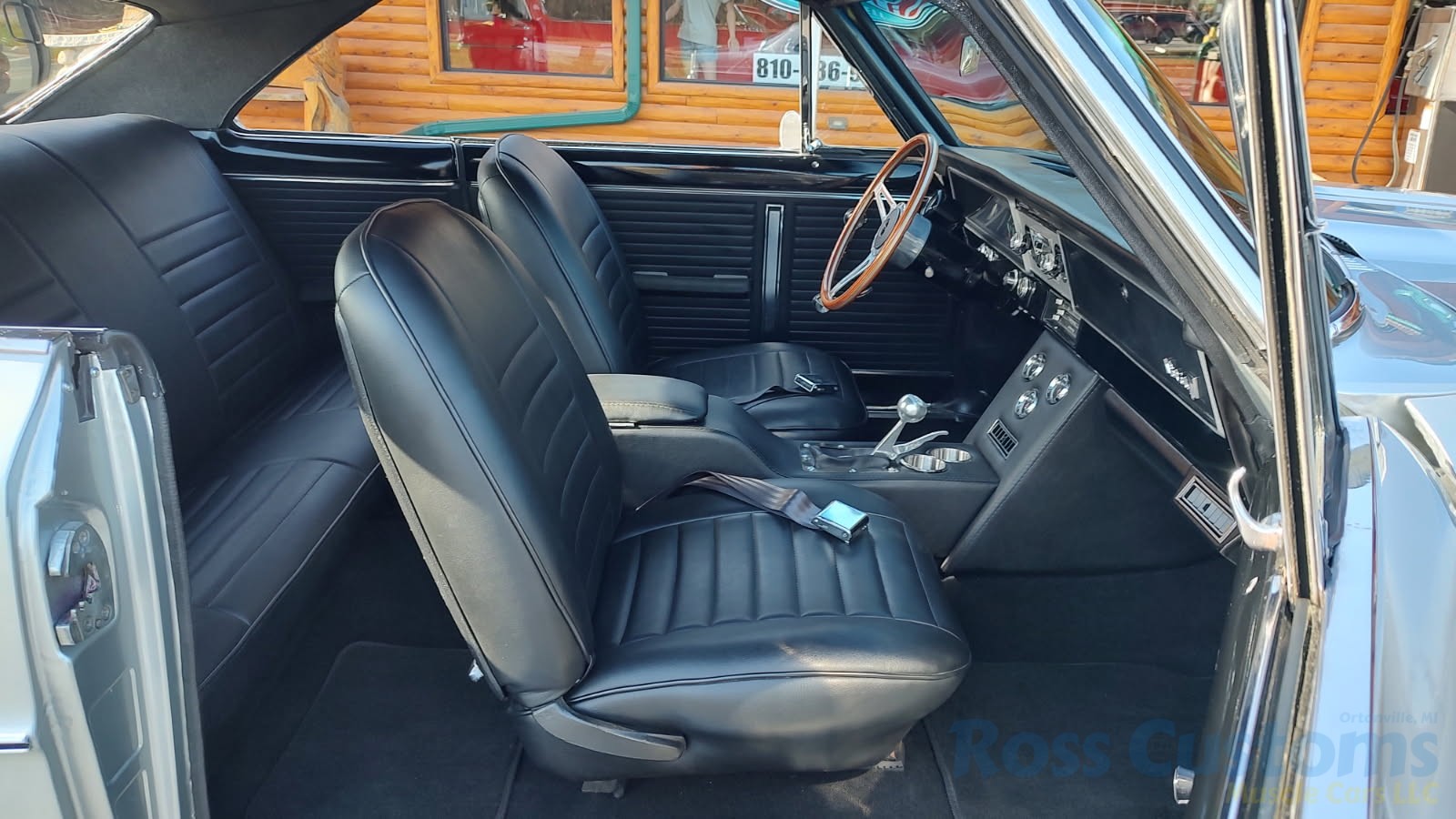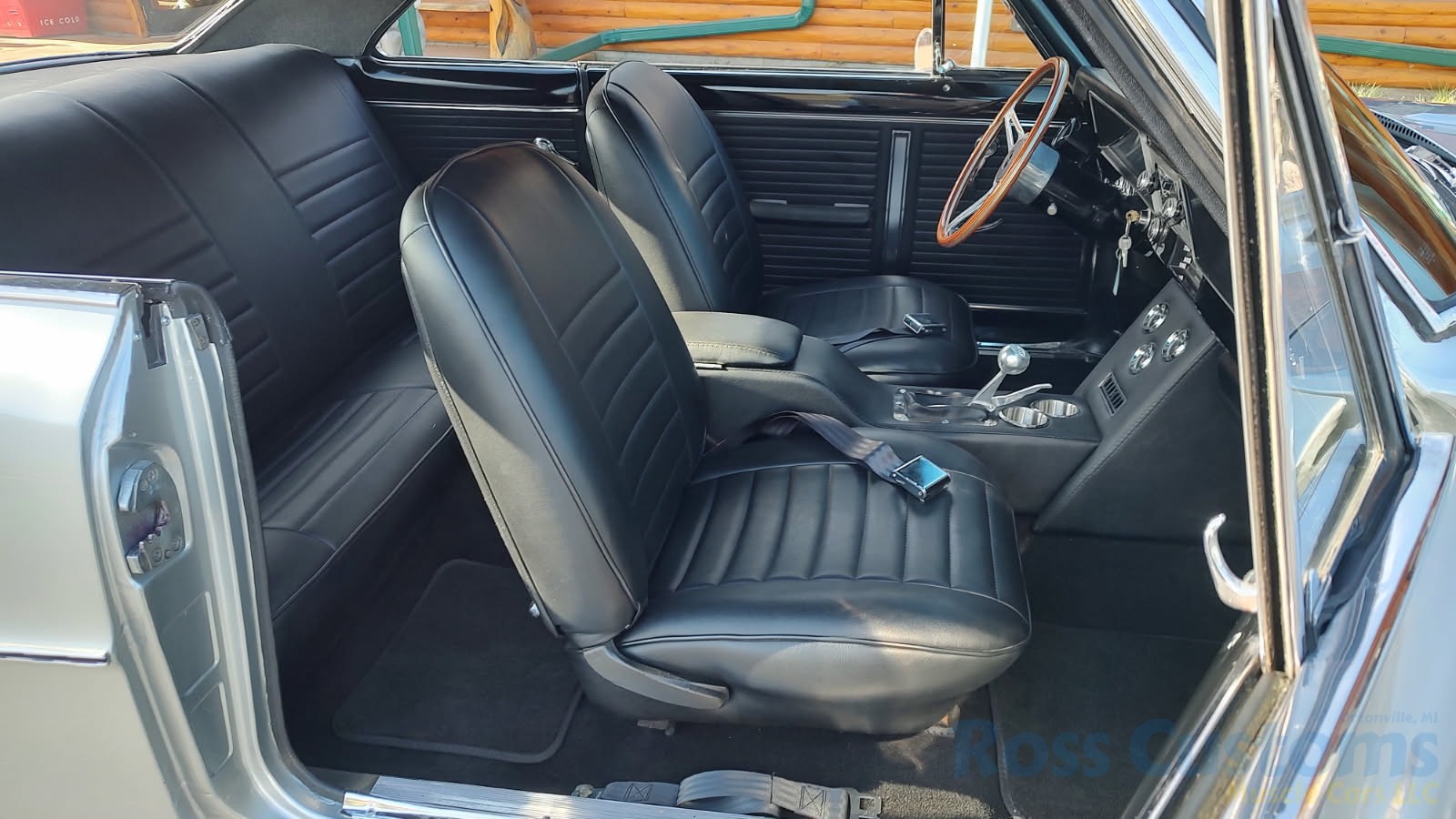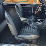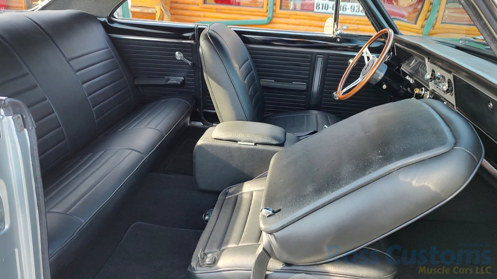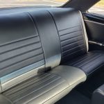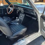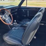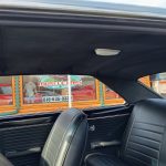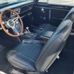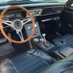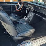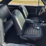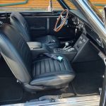 Black custom bucket seat interior, original dash pad is original in excellent condition – no cracks, instrument cluster and dash bezels are original in excellent condition, nicely outfitted with retrofit AM/FM/Cassette stereo, IDIDIT tilt steering column with Lokar billet wheel, outfitted with Vintage AC and heat, new headliner and visors, new front and rear door panels, front and rear seats have been custom upholstered, updated front seat belts, custom center console with trio of gauges, AC vent, cup holders and armrest, B&M performance shifter, new carpet, floor mats and sill plates, trunk has also been upholstered to match.