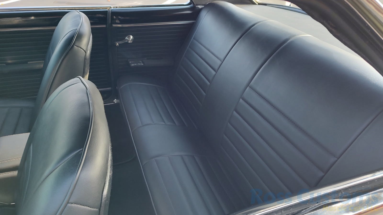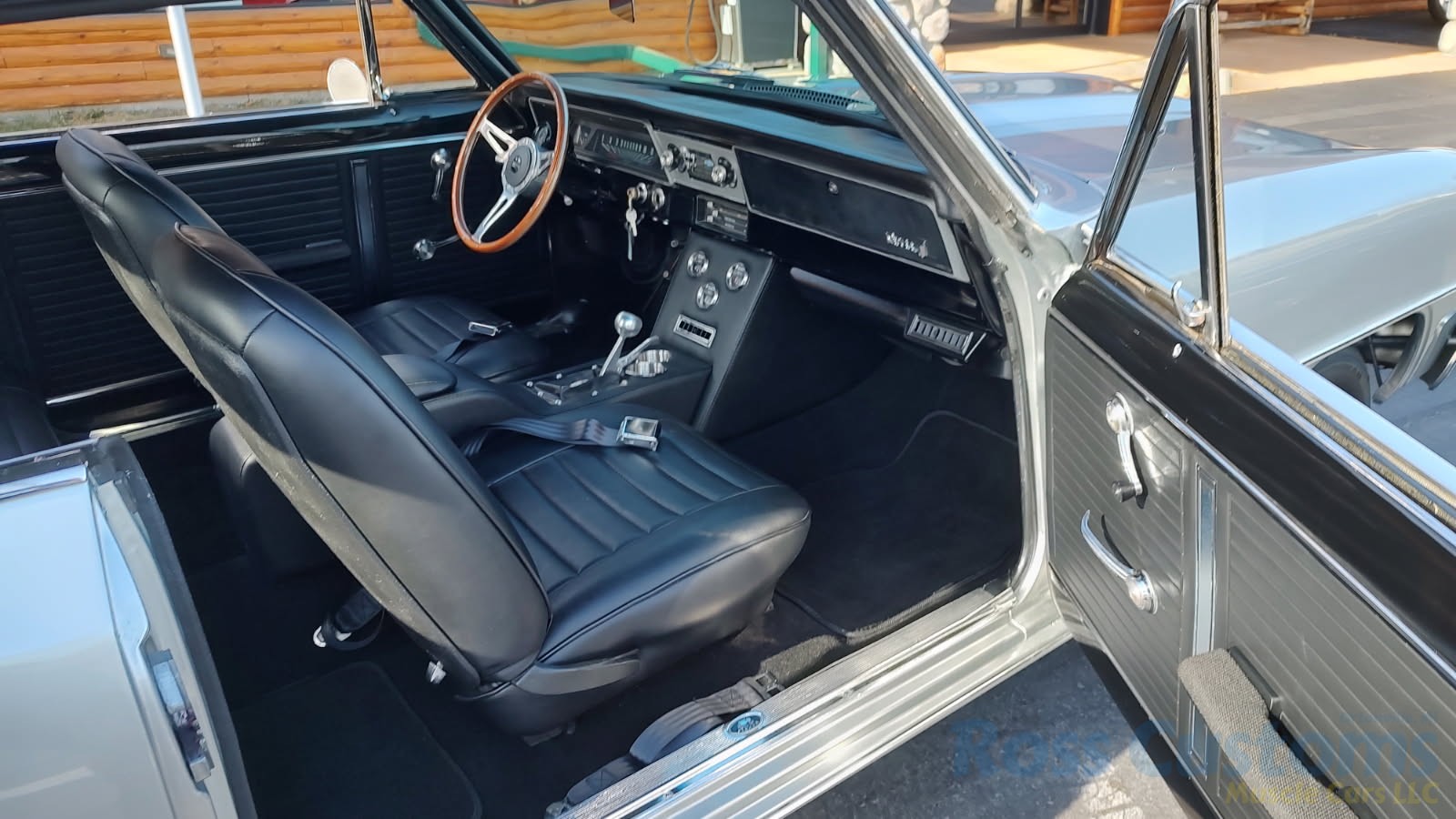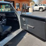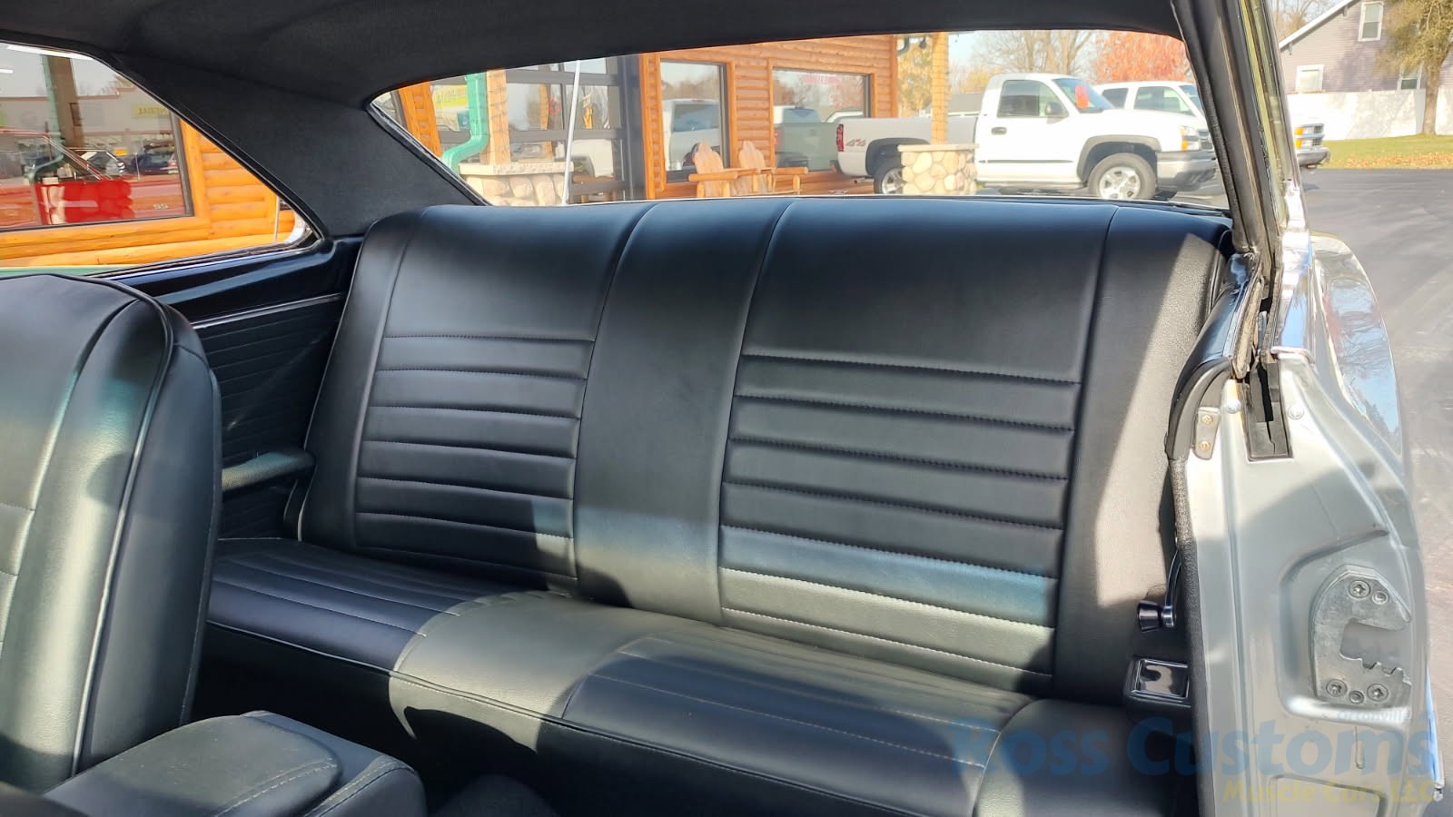 Black custom bucket seat interior, original dash pad is original in excellent condition – no cracks, instrument cluster and dash bezels are original in excellent condition, nicely outfitted with retrofit AM/FM/Cassette stereo, IDIDIT tilt steering column with Lokar billet wheel, outfitted with Vintage AC and heat, new headliner and visors, new front and rear door panels, front and rear seats have been custom upholstered, updated front seat belts, custom center console with trio of gauges, AC vent, cup holders and armrest, B&M performance shifter, new carpet, floor mats and sill plates, trunk has also been upholstered to match.