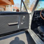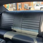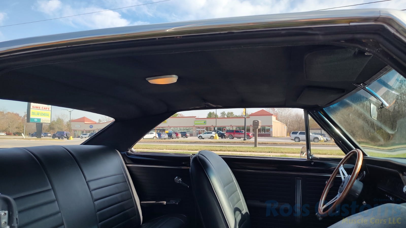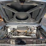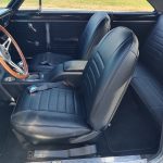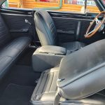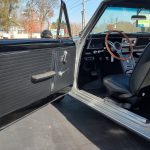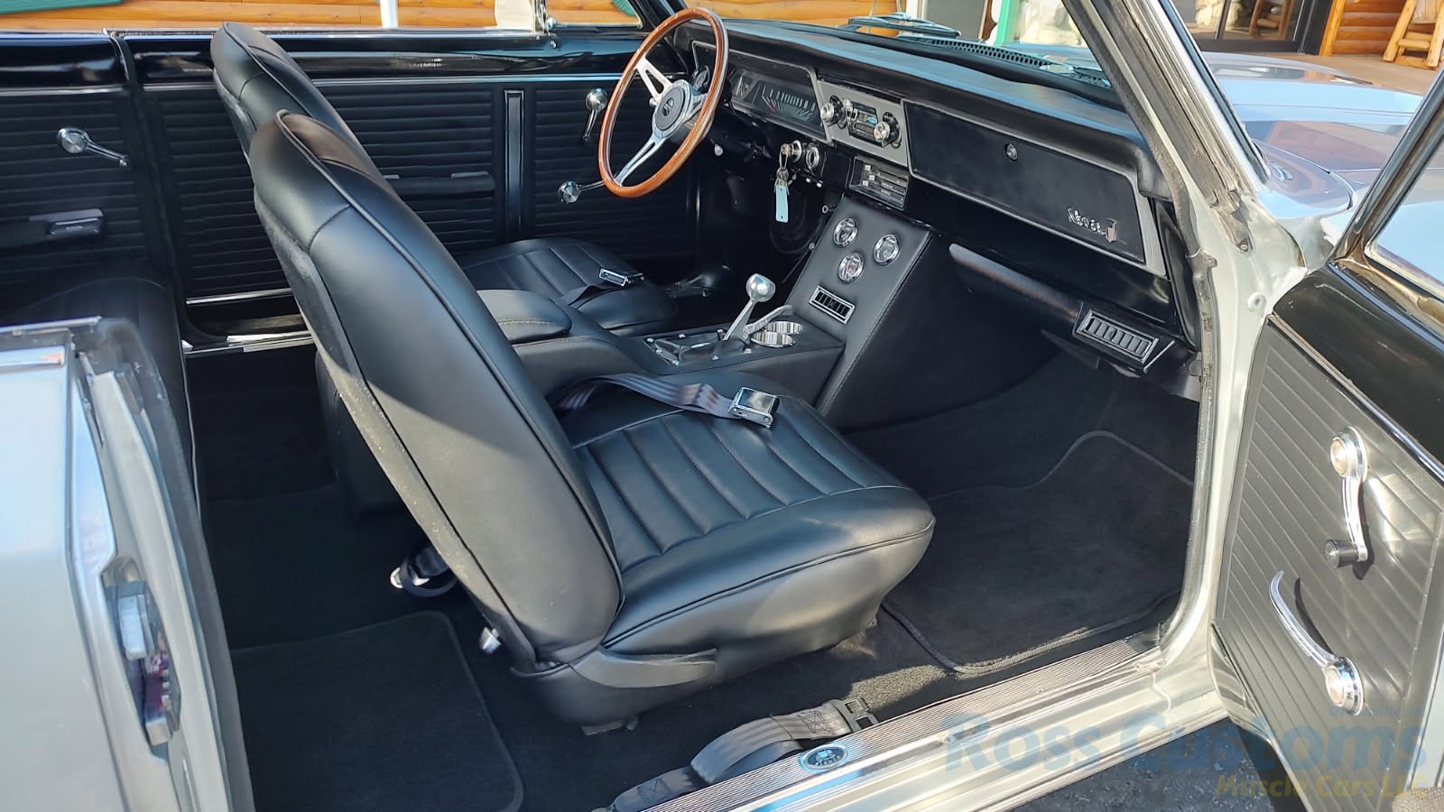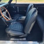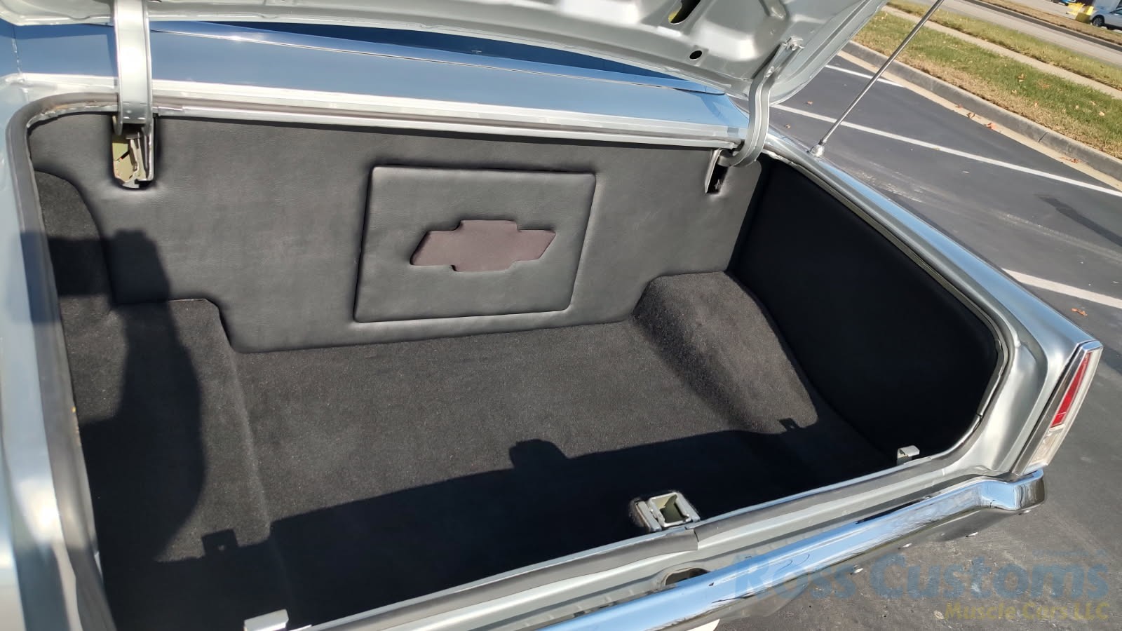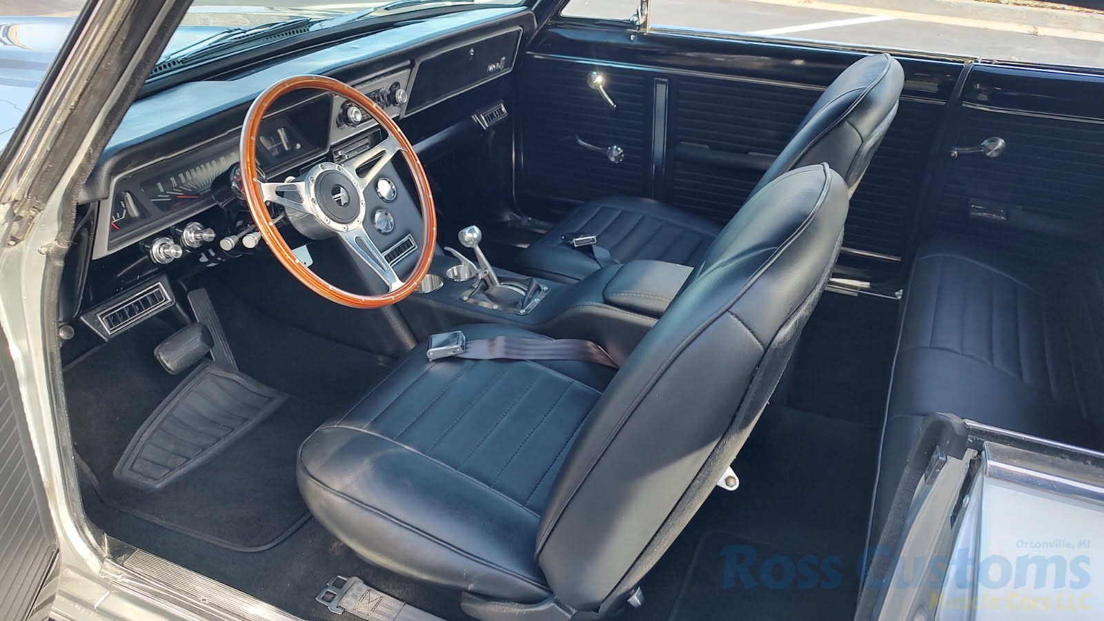 Black custom bucket seat interior, original dash pad is original in excellent condition – no cracks, instrument cluster and dash bezels are original in excellent condition, nicely outfitted with retrofit AM/FM/Cassette stereo, IDIDIT tilt steering column with Lokar billet wheel, outfitted with Vintage AC and heat, new headliner and visors, new front and rear door panels, front and rear seats have been custom upholstered, updated front seat belts, custom center console with trio of gauges, AC vent, cup holders and armrest, B&M performance shifter, new carpet, floor mats and sill plates, trunk has also been upholstered to match.