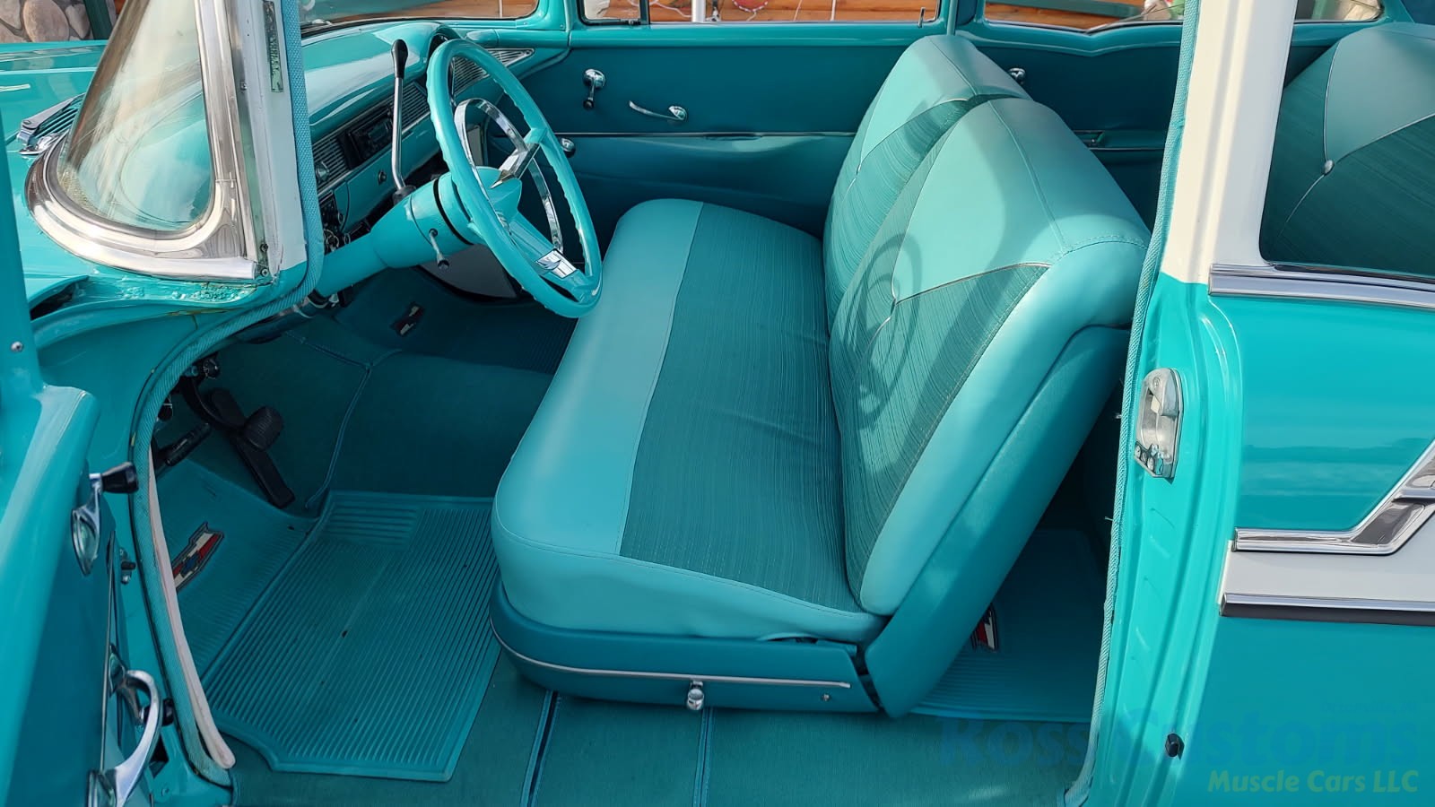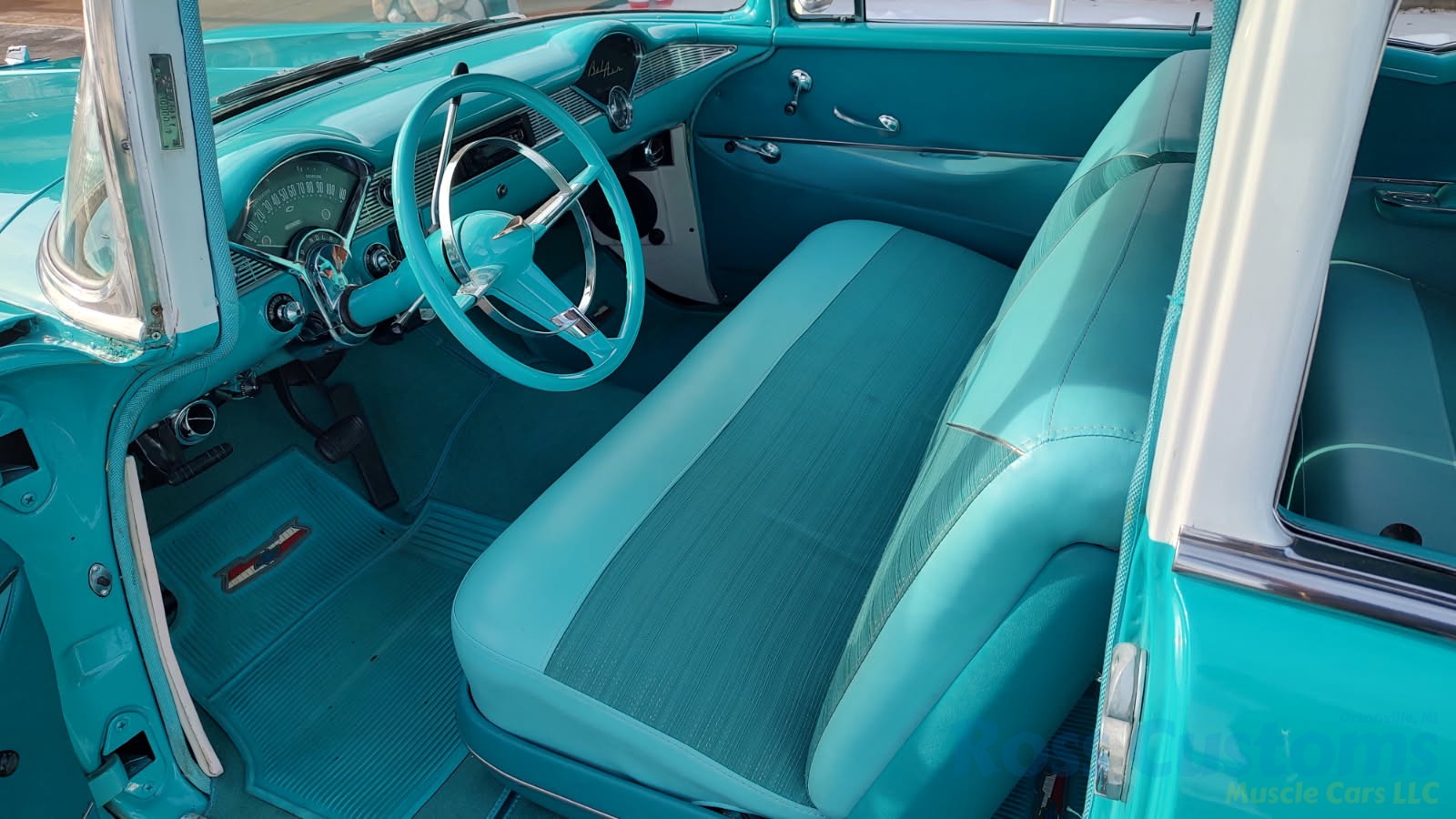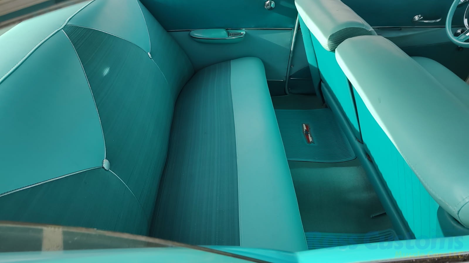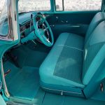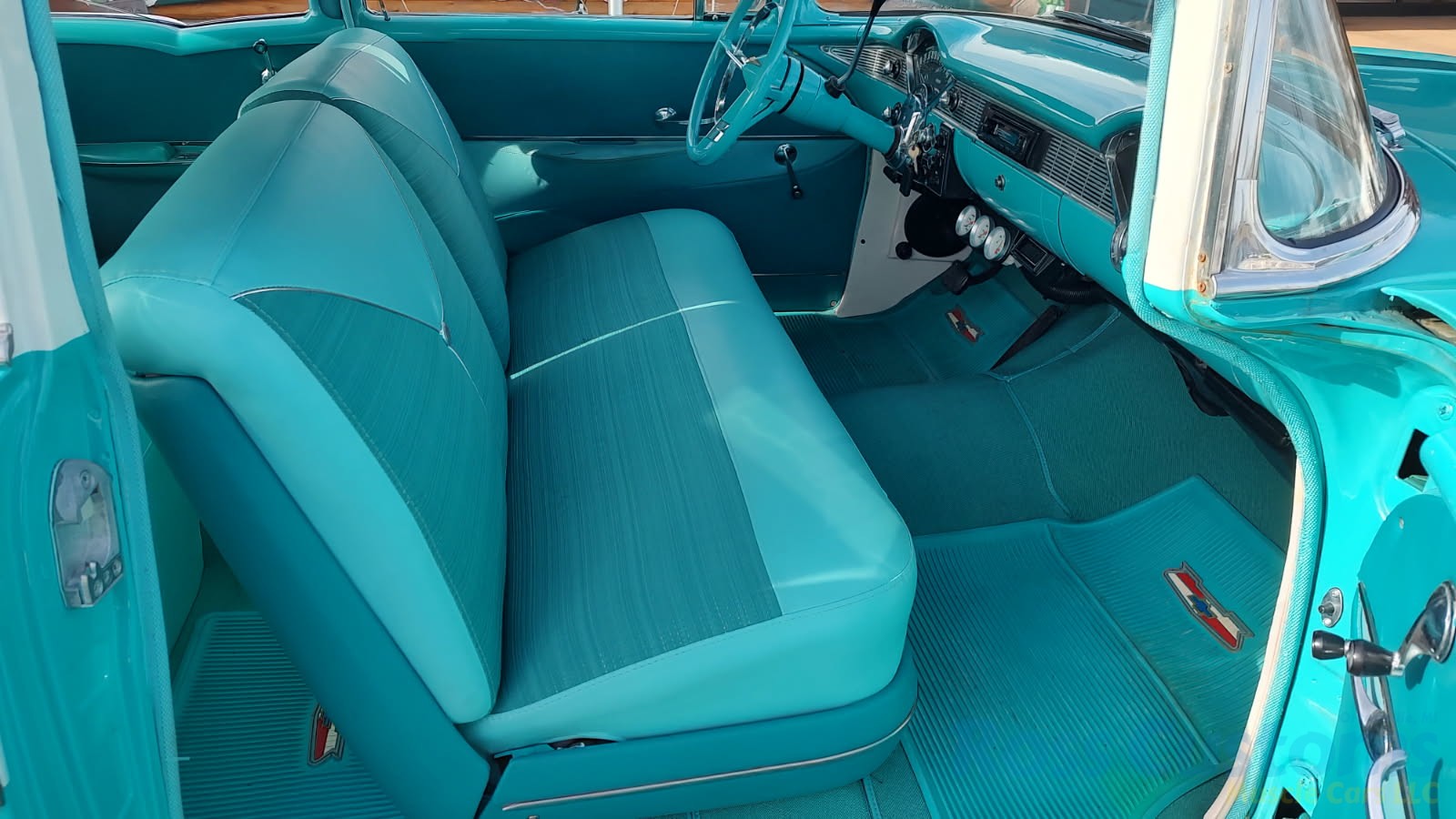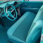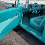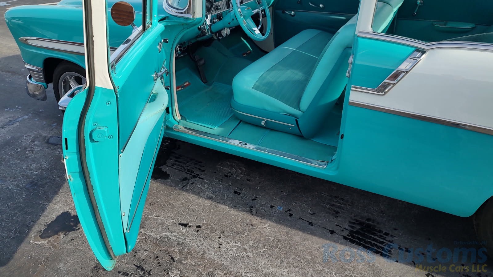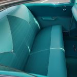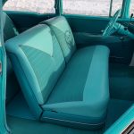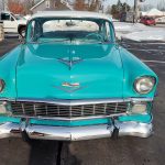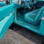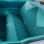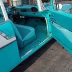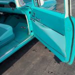 This is a very clean 56 Bel Air with several upgrades, done in factory Turquoise and White, basecoat clearcoat – older restoration still looks good, most of all the glass appears to be factory original in very good condition, at time of restoration had new window rubbers; as well as weather stripping and window felts, original window stainless and upper Bel Air trim in very good condition, new side view mirrors, door handles appear to be original in good condition, hood jet and hood emblem have been replaced, hood bar and fender eyebrows look like new, original grill, grill moldings and parking light surrounds in very good condition, front bumper and bumper guards have been re-chromed, original Bel Air side trim has been re-polished in excellent condition, original taillight bezels and housing in good condition, new deck lid emblems, rear bumper has also been re-chromed.