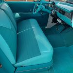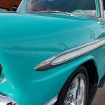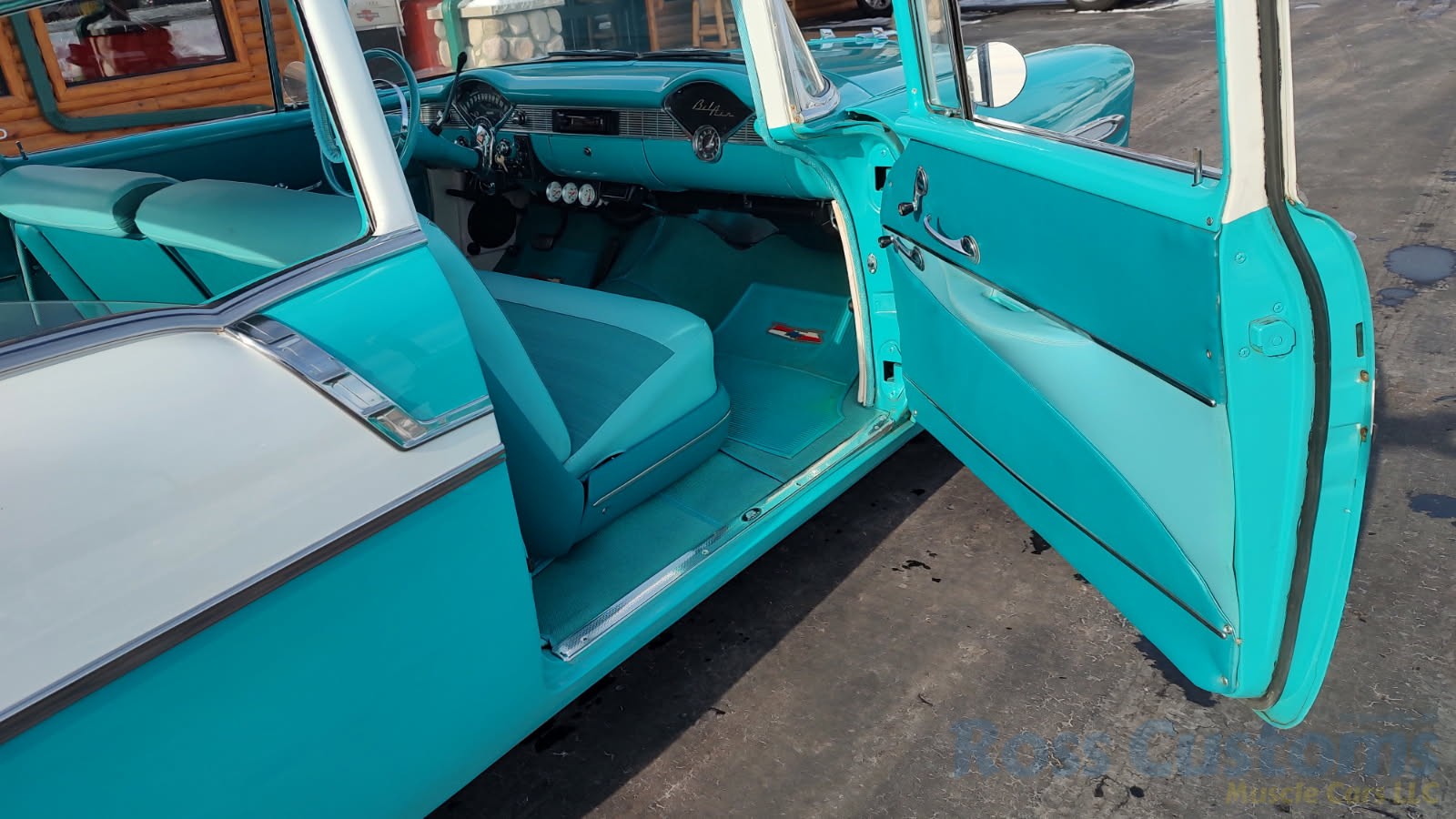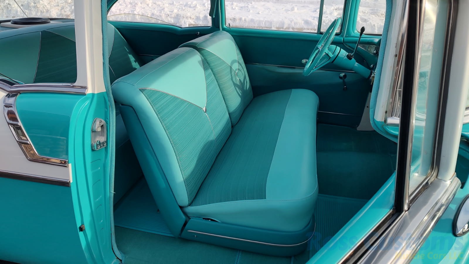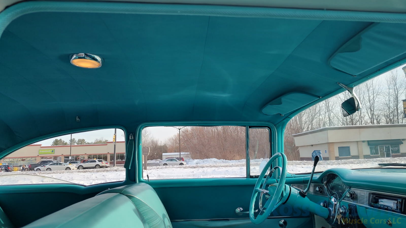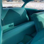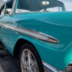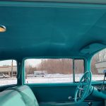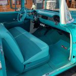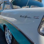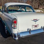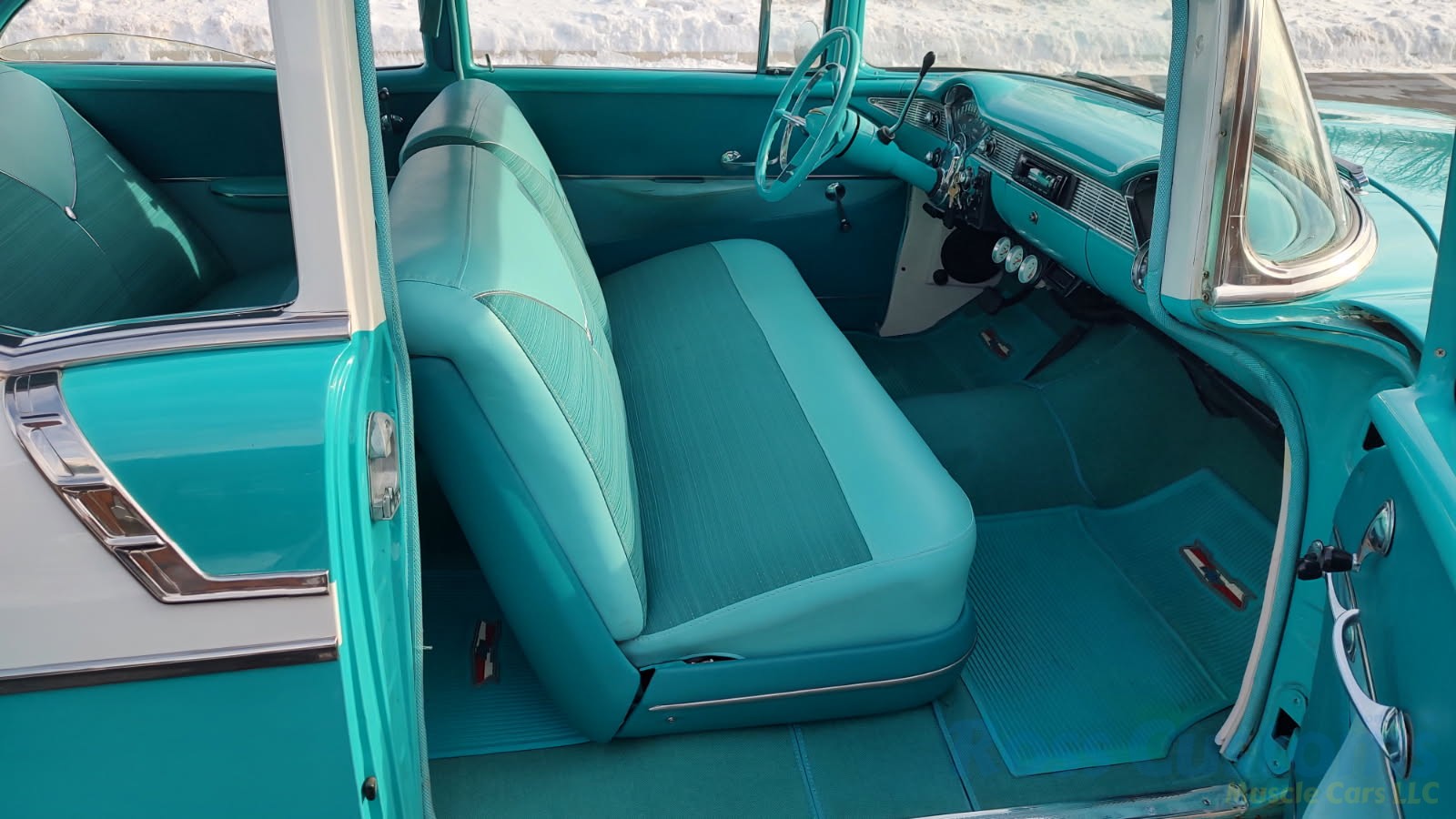 This is a very clean 56 Bel Air with several upgrades, done in factory Turquoise and White, basecoat clearcoat – older restoration still looks good, most of all the glass appears to be factory original in very good condition, at time of restoration had new window rubbers; as well as weather stripping and window felts, original window stainless and upper Bel Air trim in very good condition, new side view mirrors, door handles appear to be original in good condition, hood jet and hood emblem have been replaced, hood bar and fender eyebrows look like new, original grill, grill moldings and parking light surrounds in very good condition, front bumper and bumper guards have been re-chromed, original Bel Air side trim has been re-polished in excellent condition, original taillight bezels and housing in good condition, new deck lid emblems, rear bumper has also been re-chromed.