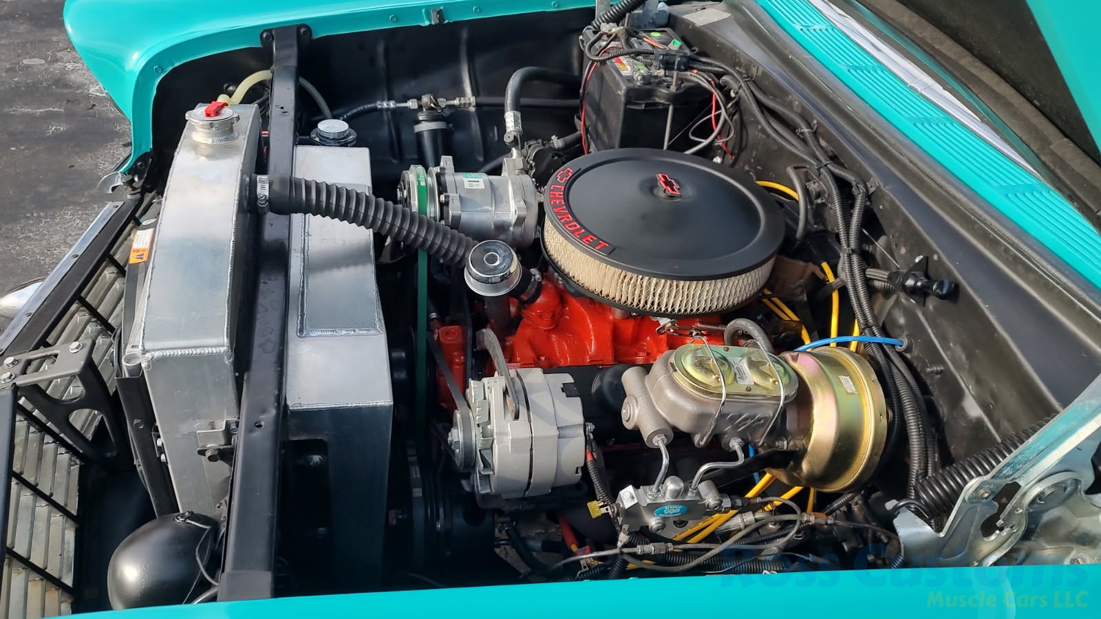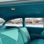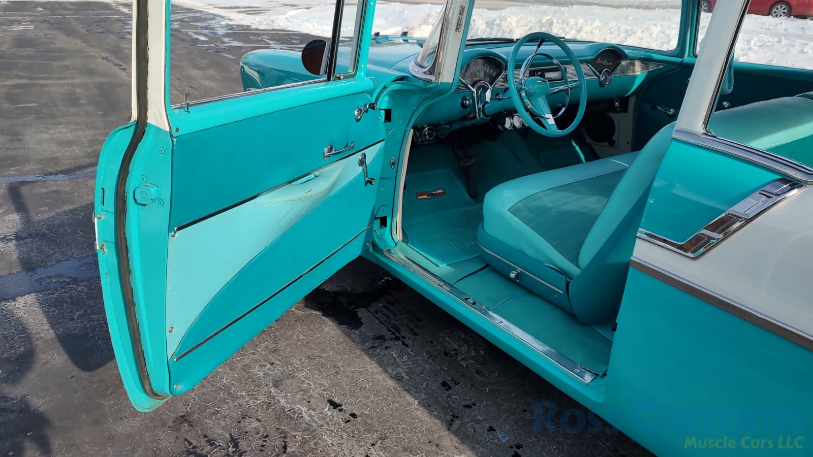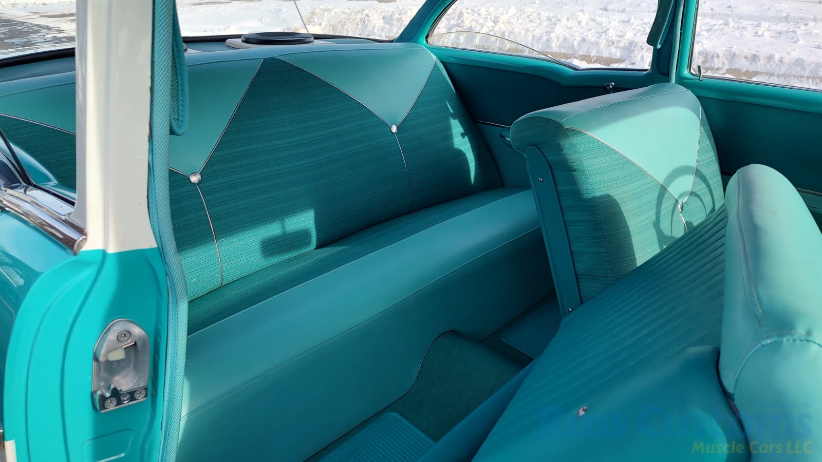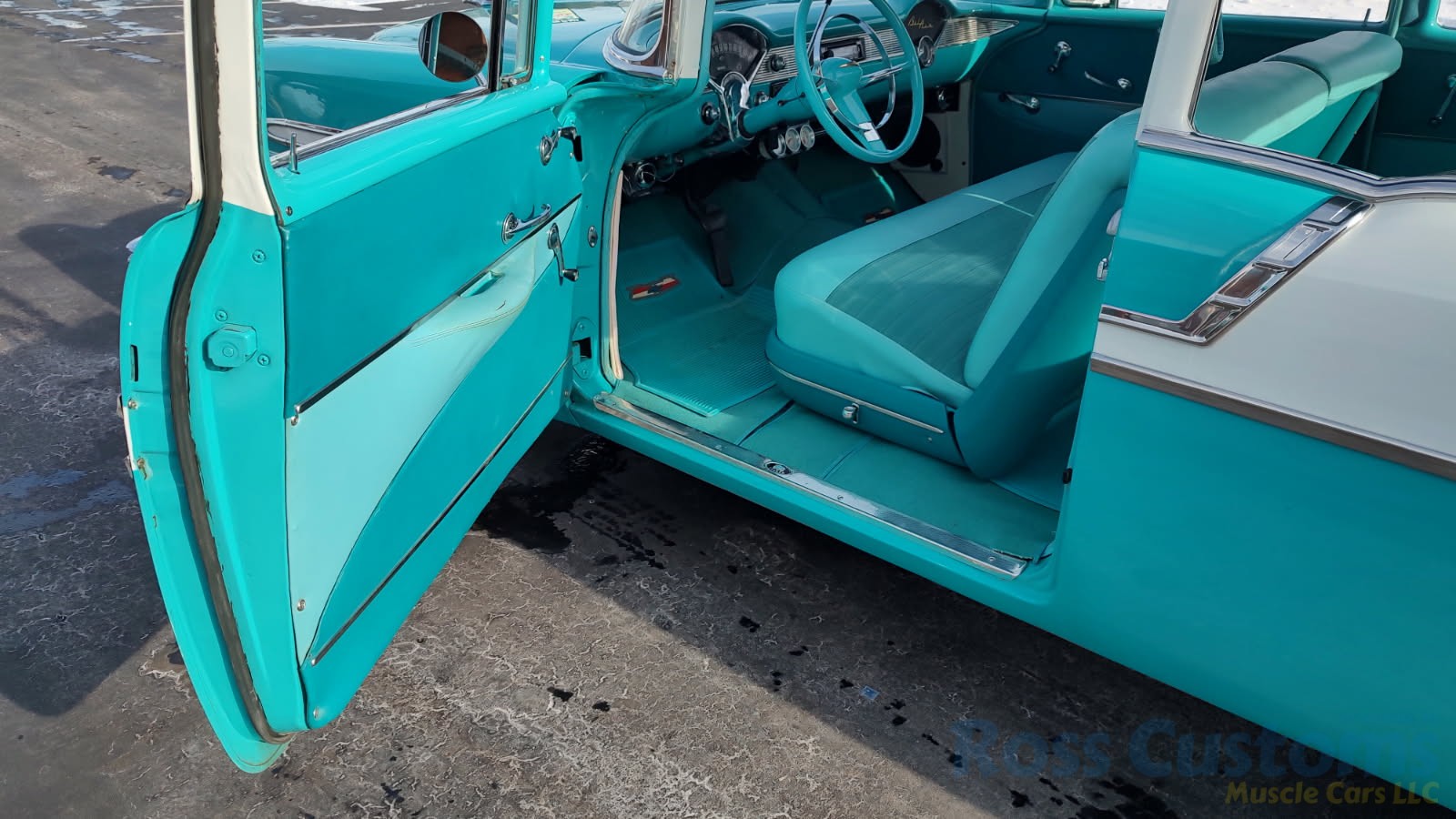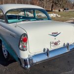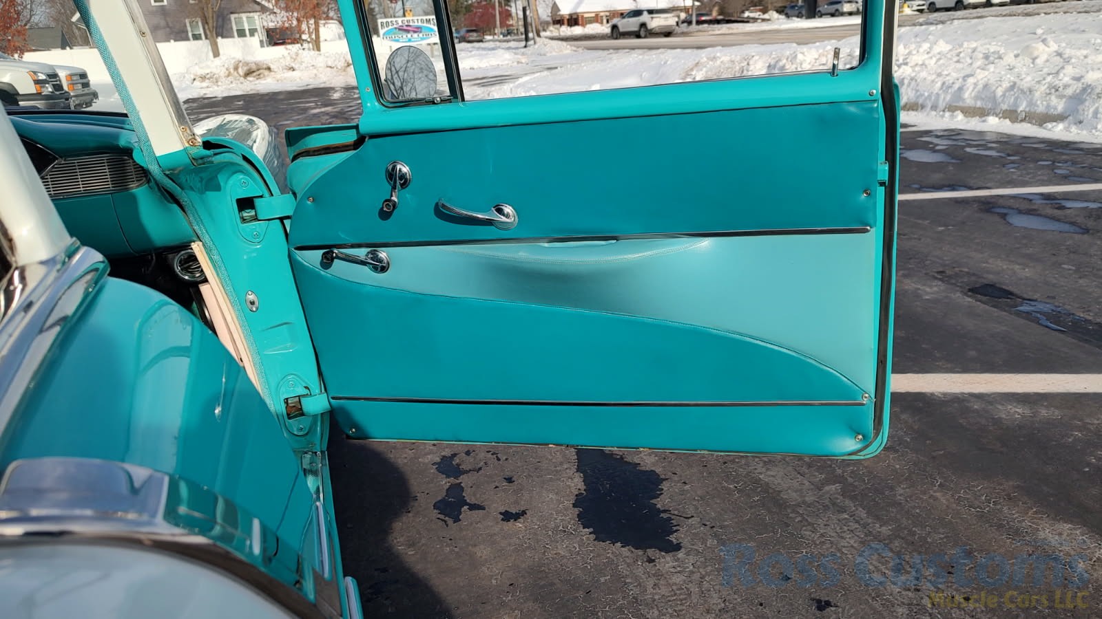 This is a very clean 56 Bel Air with several upgrades, done in factory Turquoise and White, basecoat clearcoat – older restoration still looks good, most of all the glass appears to be factory original in very good condition, at time of restoration had new window rubbers; as well as weather stripping and window felts, original window stainless and upper Bel Air trim in very good condition, new side view mirrors, door handles appear to be original in good condition, hood jet and hood emblem have been replaced, hood bar and fender eyebrows look like new, original grill, grill moldings and parking light surrounds in very good condition, front bumper and bumper guards have been re-chromed, original Bel Air side trim has been re-polished in excellent condition, original taillight bezels and housing in good condition, new deck lid emblems, rear bumper has also been re-chromed.