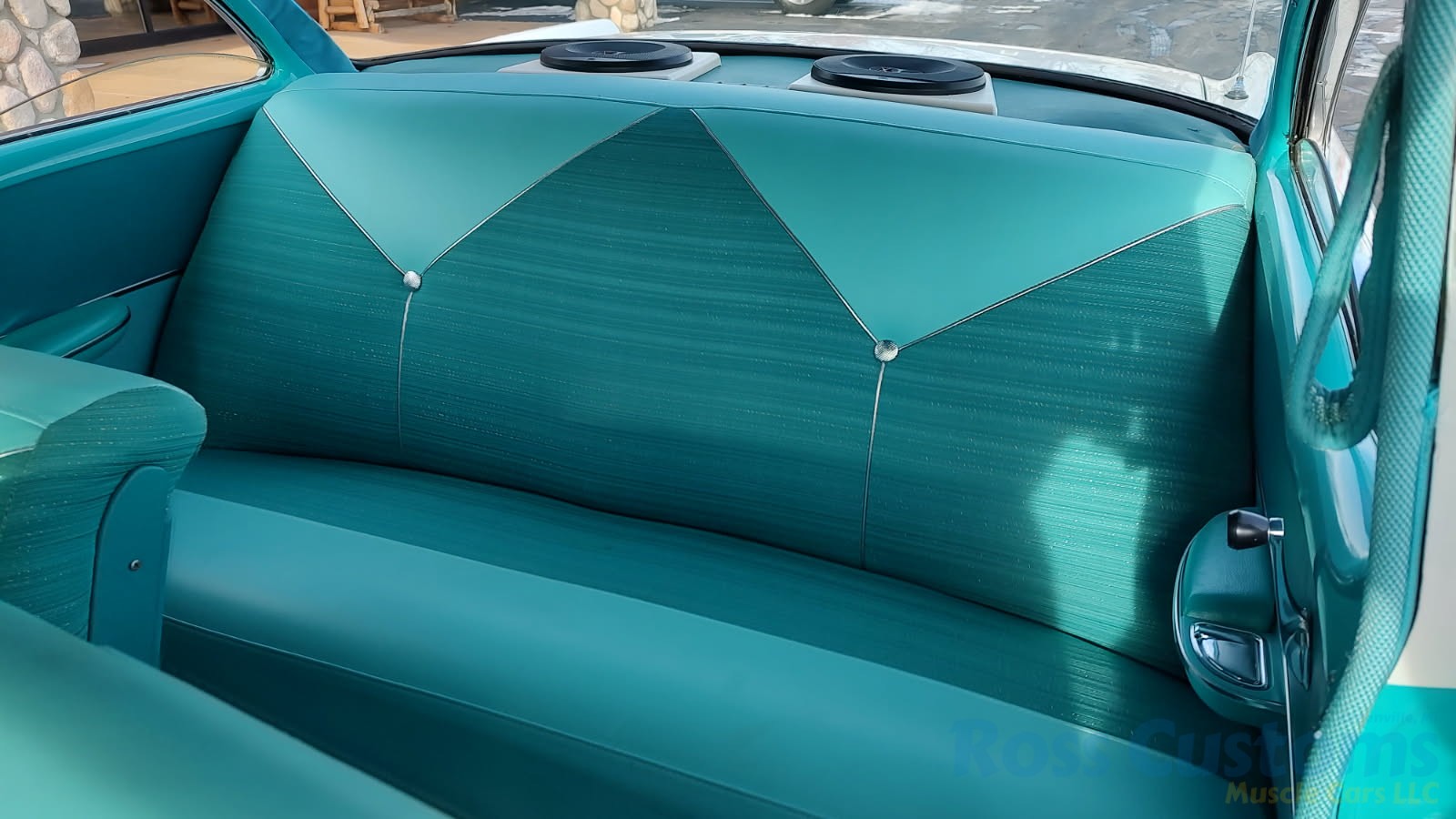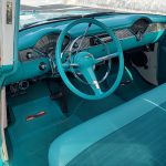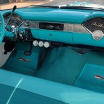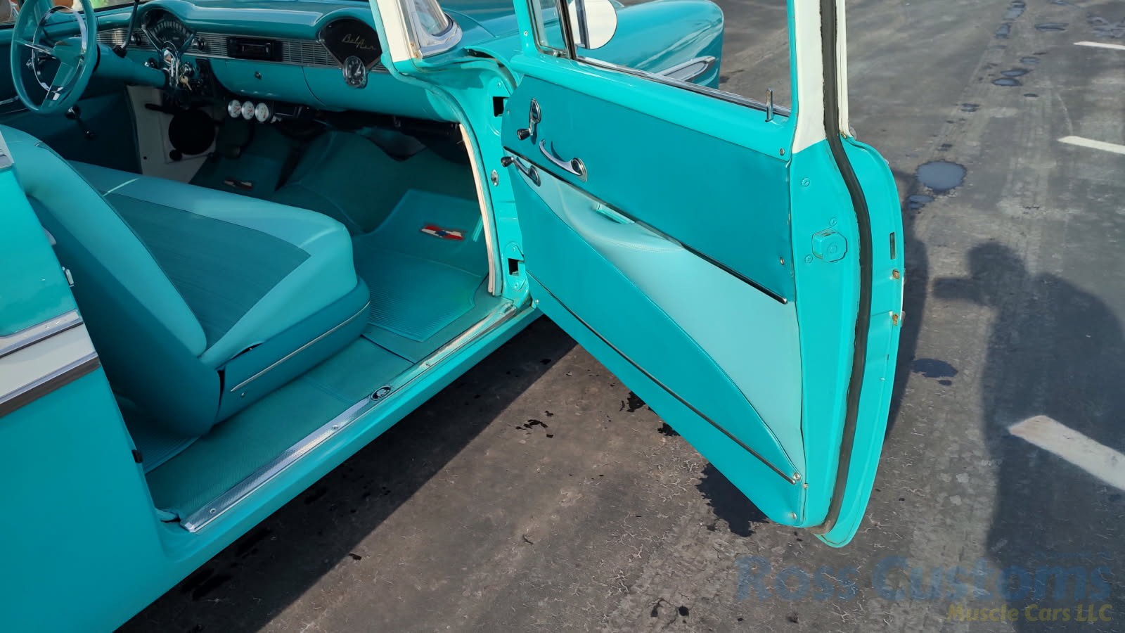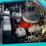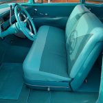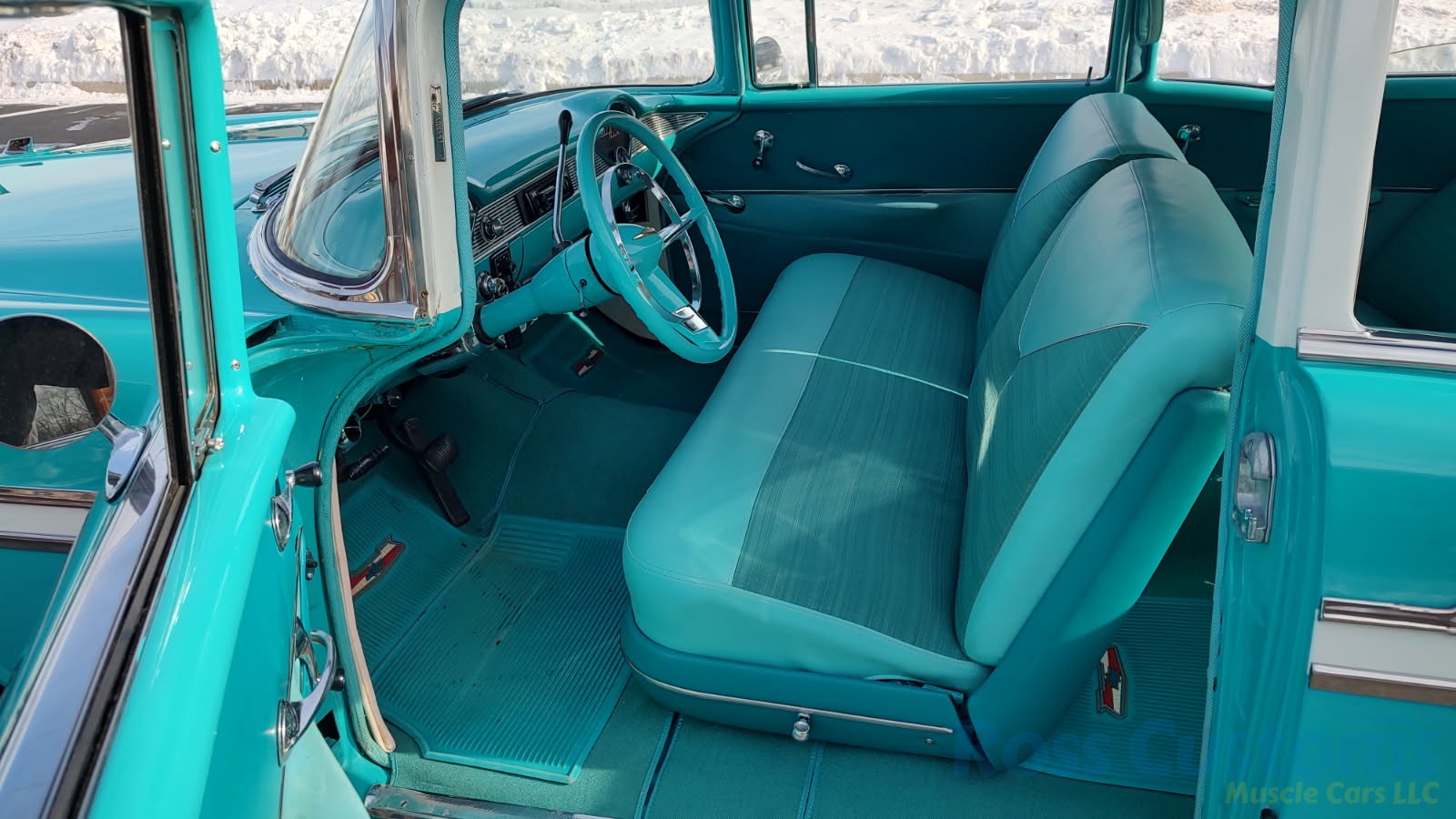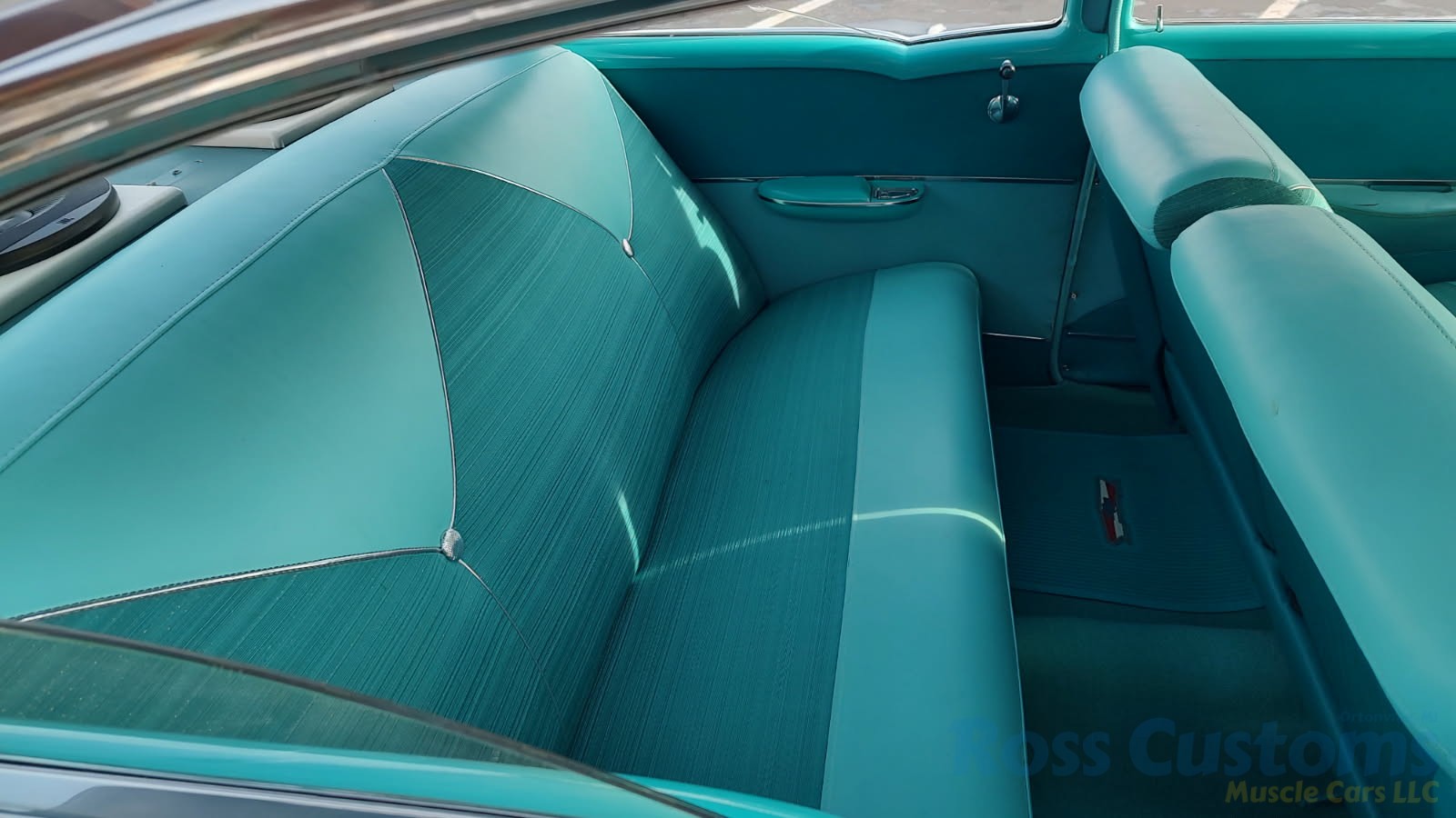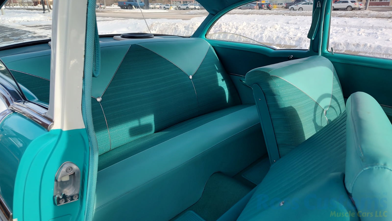 This is a very clean 56 Bel Air with several upgrades, done in factory Turquoise and White, basecoat clearcoat – older restoration still looks good, most of all the glass appears to be factory original in very good condition, at time of restoration had new window rubbers; as well as weather stripping and window felts, original window stainless and upper Bel Air trim in very good condition, new side view mirrors, door handles appear to be original in good condition, hood jet and hood emblem have been replaced, hood bar and fender eyebrows look like new, original grill, grill moldings and parking light surrounds in very good condition, front bumper and bumper guards have been re-chromed, original Bel Air side trim has been re-polished in excellent condition, original taillight bezels and housing in good condition, new deck lid emblems, rear bumper has also been re-chromed.