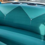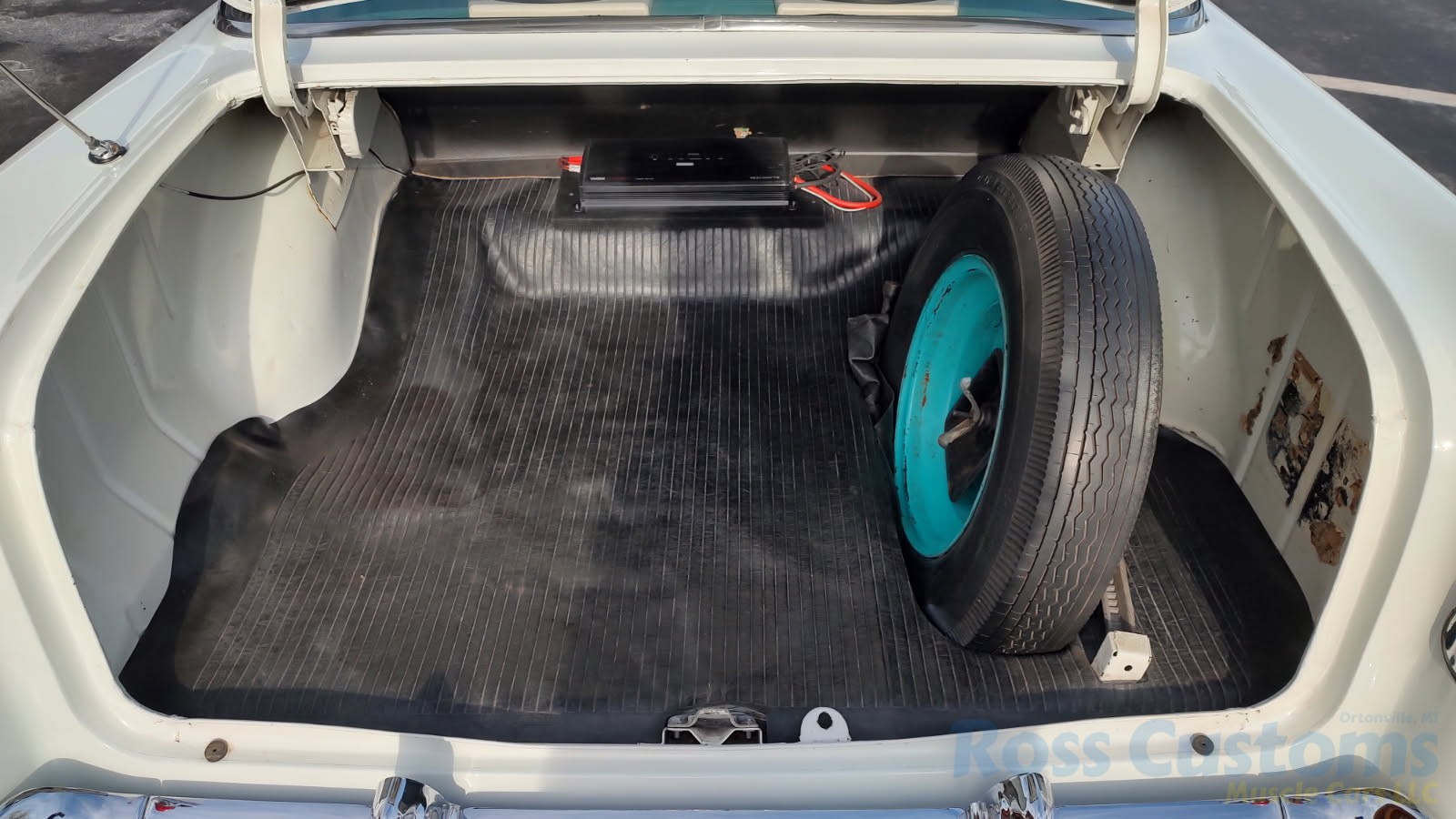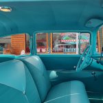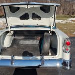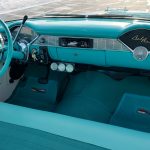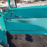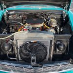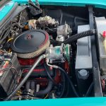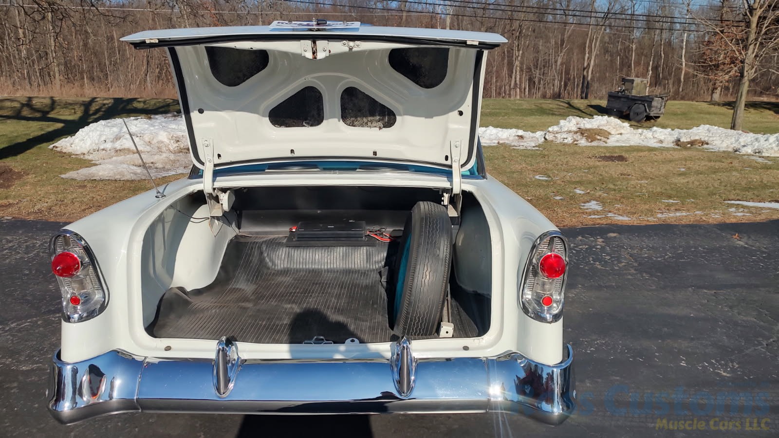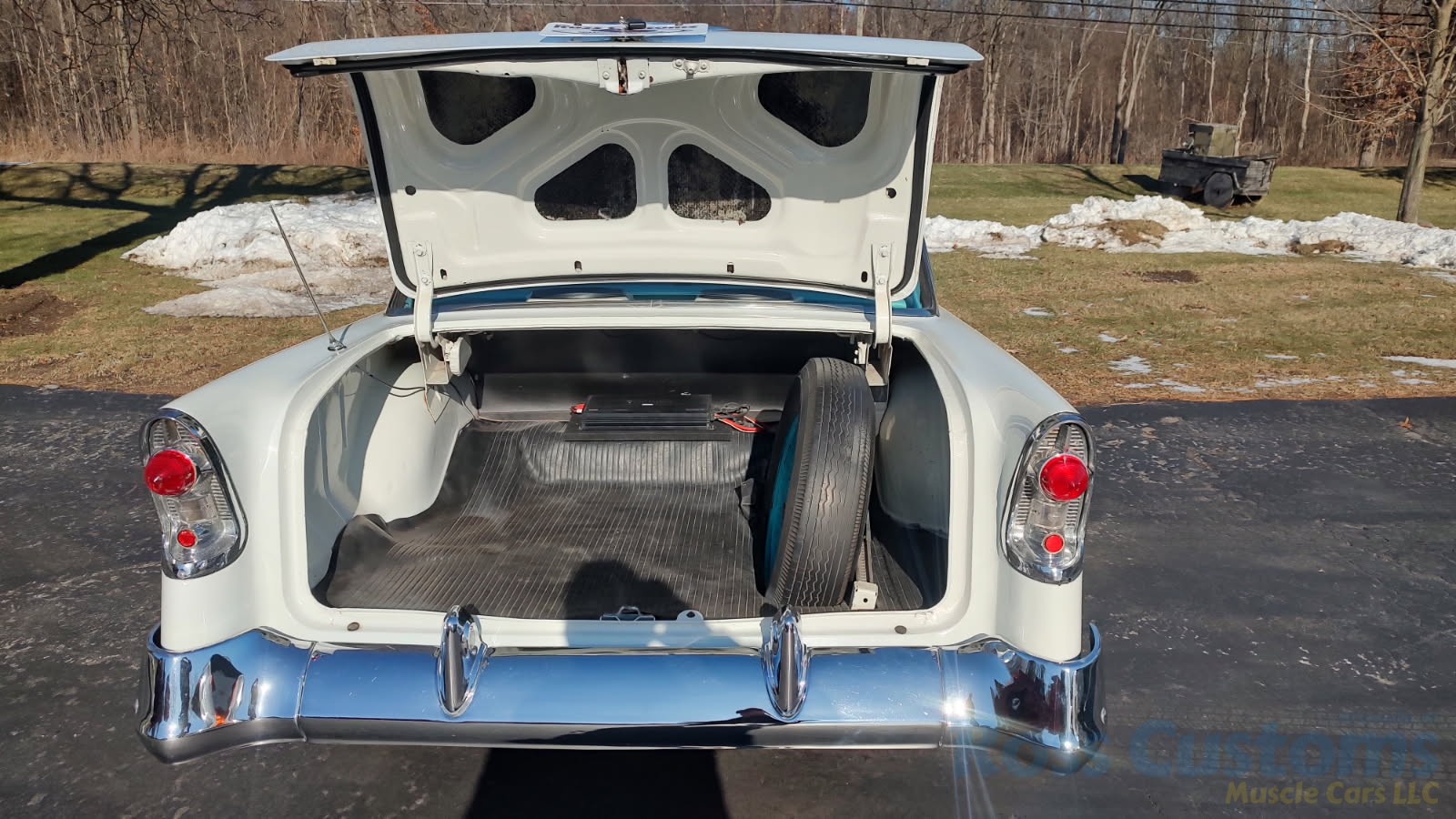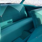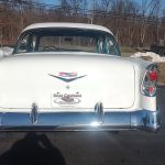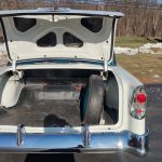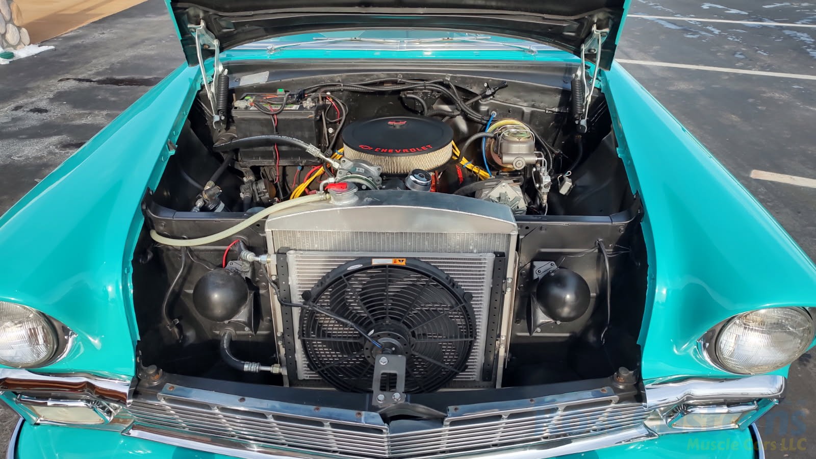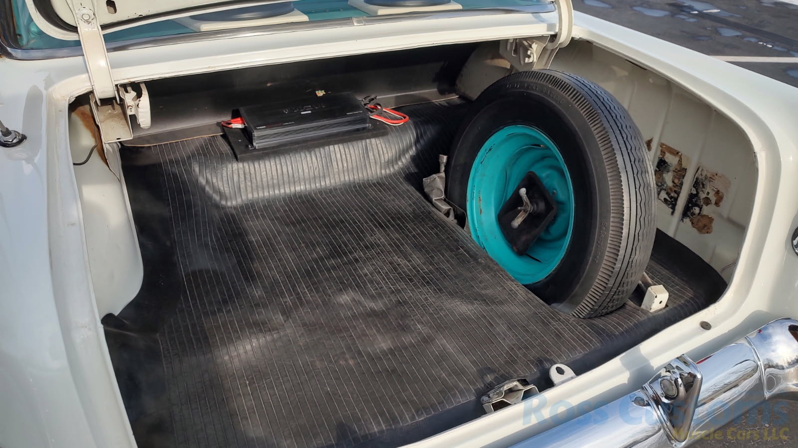This is a very clean 56 Bel Air with several upgrades, done in factory Turquoise and White, basecoat clearcoat – older restoration still looks good, most of all the glass appears to be factory original in very good condition, at time of restoration had new window rubbers; as well as weather stripping and window felts, original window stainless and upper Bel Air trim in very good condition, new side view mirrors, door handles appear to be original in good condition, hood jet and hood emblem have been replaced, hood bar and fender eyebrows look like new, original grill, grill moldings and parking light surrounds in very good condition, front bumper and bumper guards have been re-chromed, original Bel Air side trim has been re-polished in excellent condition, original taillight bezels and housing in good condition, new deck lid emblems, rear bumper has also been re-chromed.