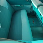 Factory 2 tone Bel Air interior, dash has been refinished; as well as garnish moldings, original dash trim in good condition, factory original instrument cluster – showing 97,533 miles, nicely outfitted with Kenwood AM/FM/CD stereo, front and rear speakers with amp, nicely updated with Vintage AC and heat controls, trio of gauges nicely mounted under dash; as well as AC vents, updated 15 inch factory appearing steering wheel, at time of restoration had new headliner, visors, front and rear seat covers, door panels appear to be original in very good condition, deluxe Daytona carpet and floor mats, new sill plates.