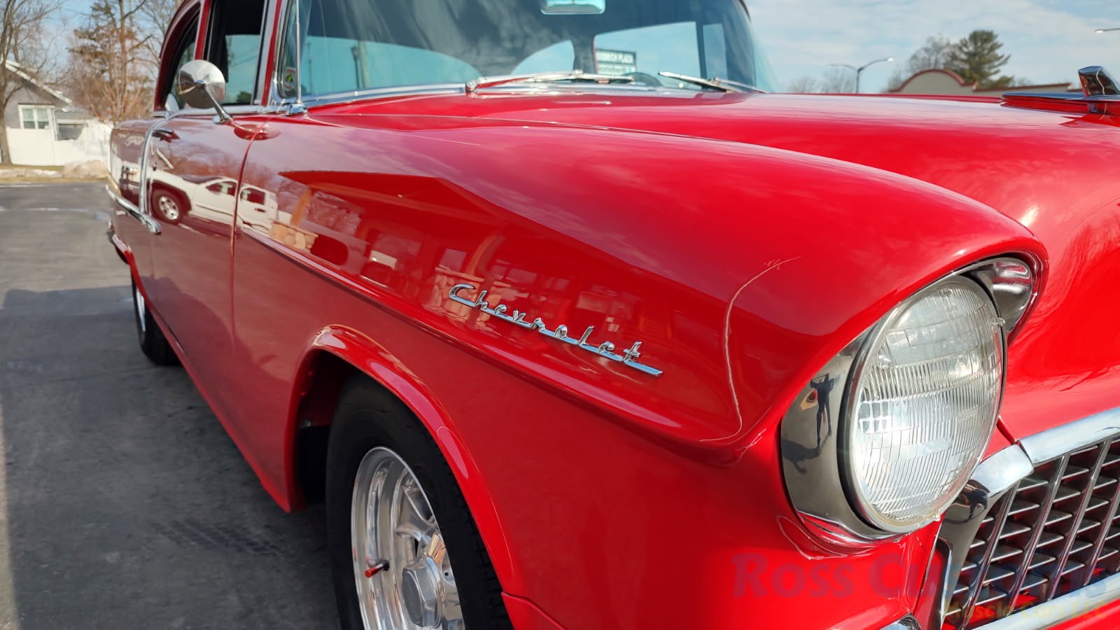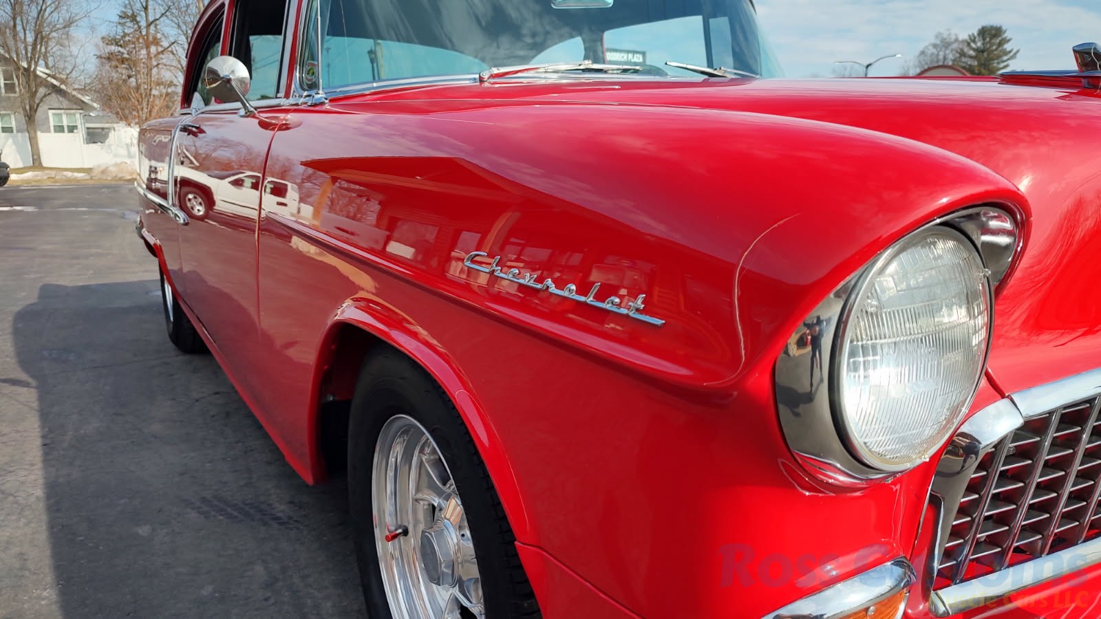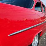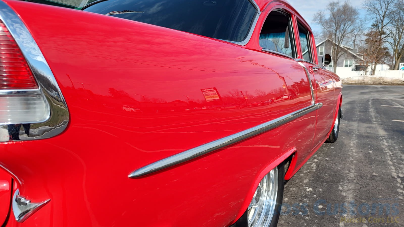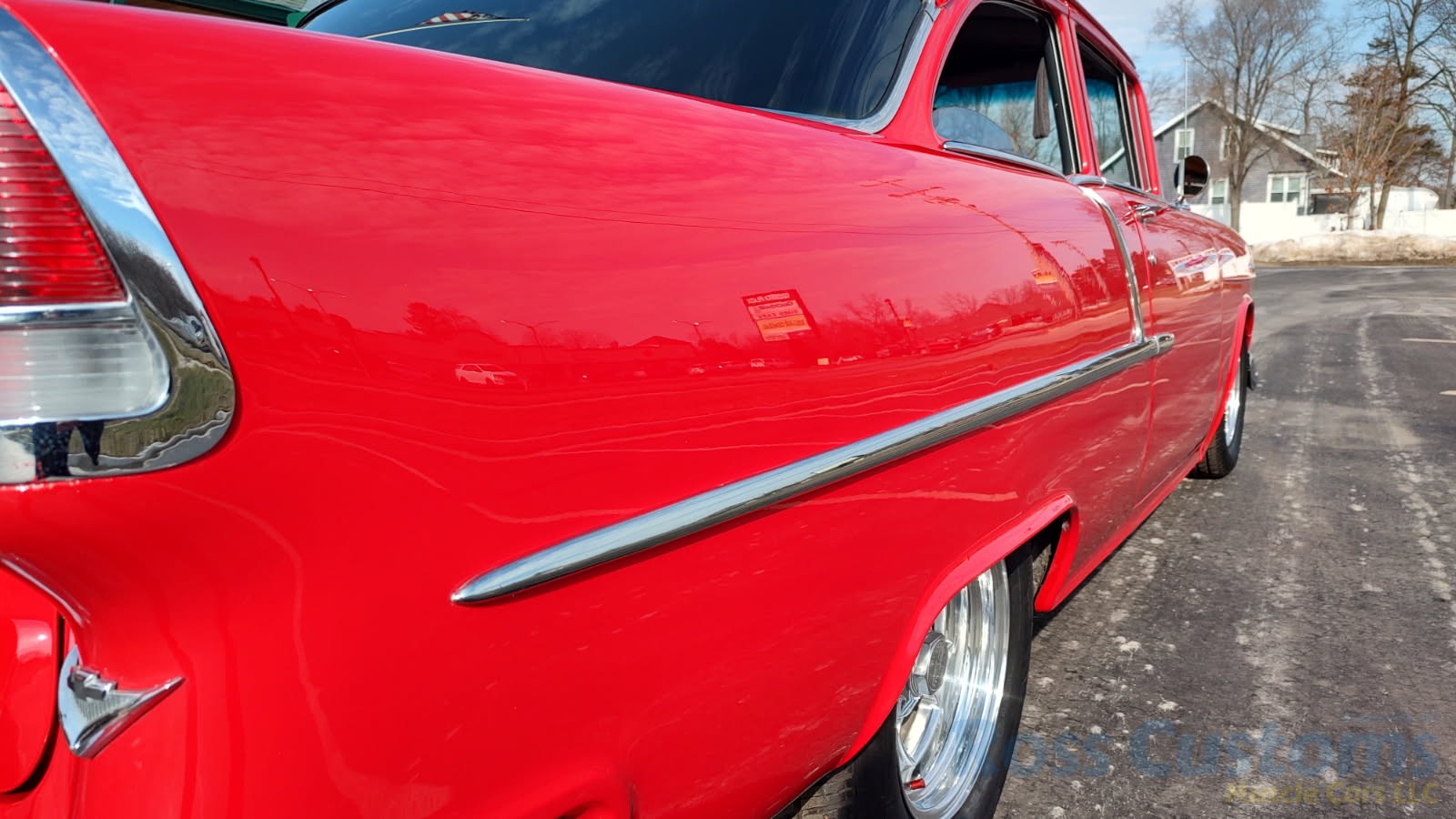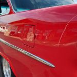 This is a slick 55 210 that has undergone a very nice custom build, done in Apple Red, basecoat clearcoat, sanded and wheeled smooth, slick as glass, at time of build had all new smoke tinted glass; as well as tinted windshield, new window rubbers, window felts and weather stripping, window stainless moldings are original and have been re-polished to a show finish; as well as upper door stainless moldings, new side view mirrors, antenna, door handles, hood jet and hood emblem, hood bar and grill side moldings look like new, stainless grill in excellent condition, lower grill molding appear to be original in very good condition, new parking lights and housings, re-chromed front bumper and bumperettes, original body side moldings have been re-polished to a show finish, new taillight and taillight bezels, new deck lid emblem, re-chromed rear bumper and bumper guards.