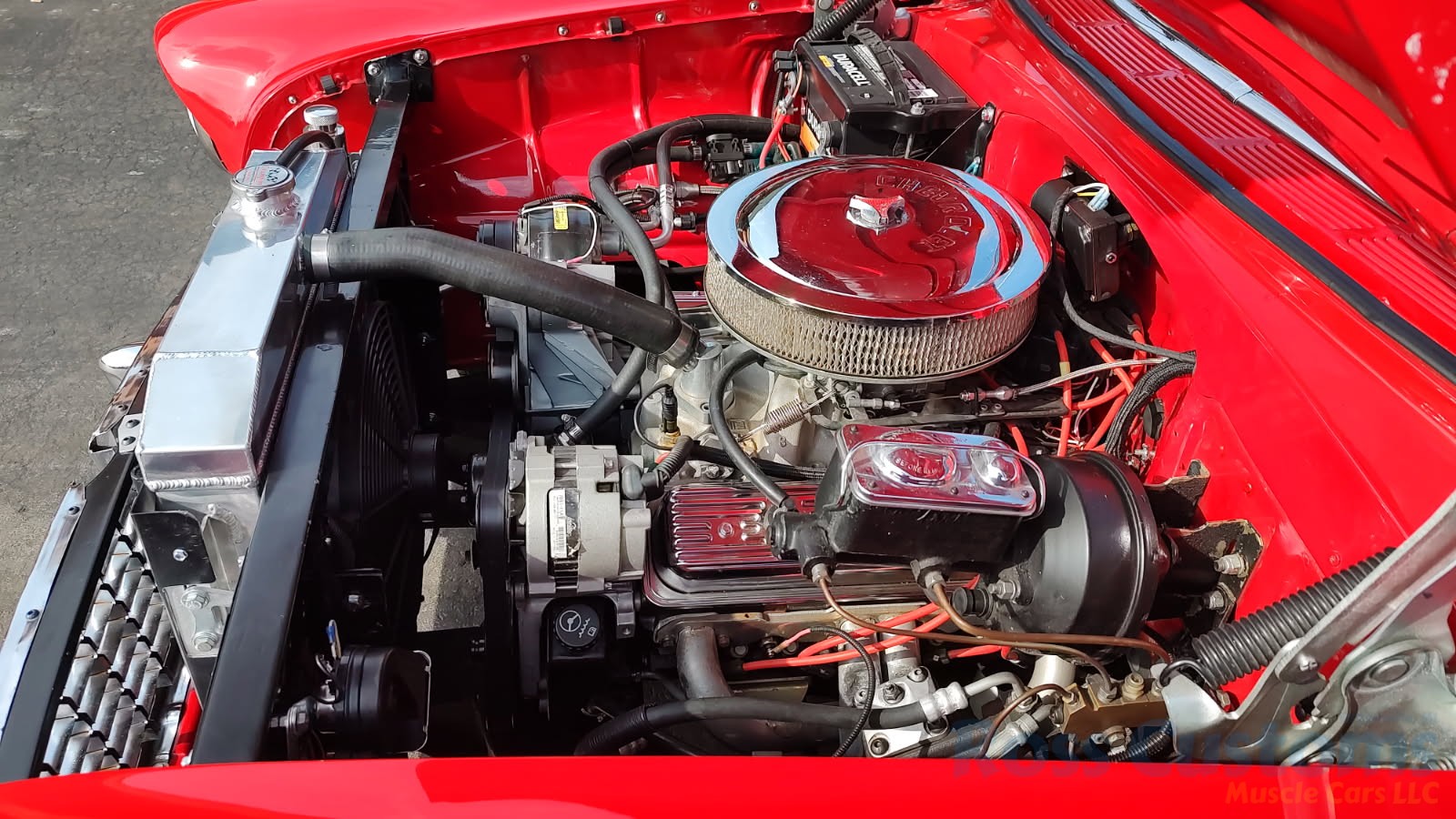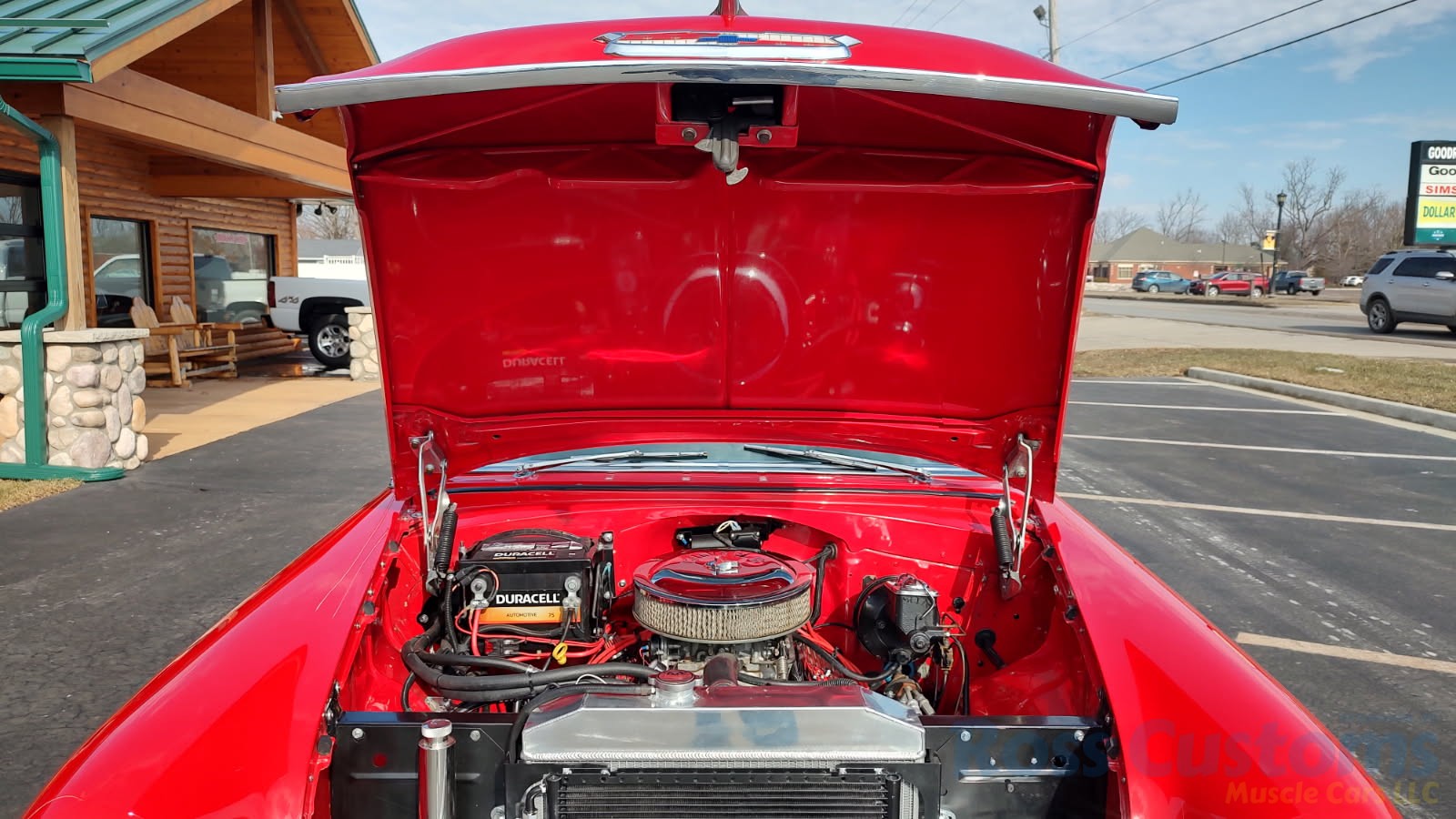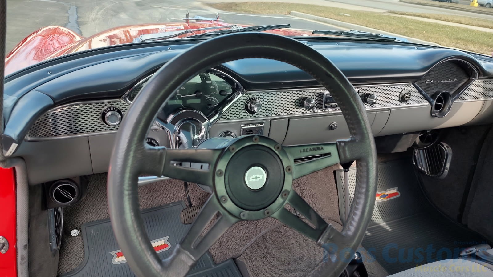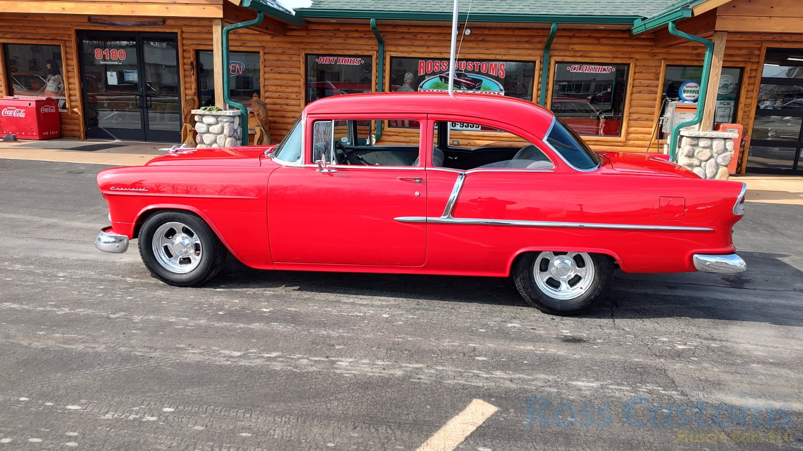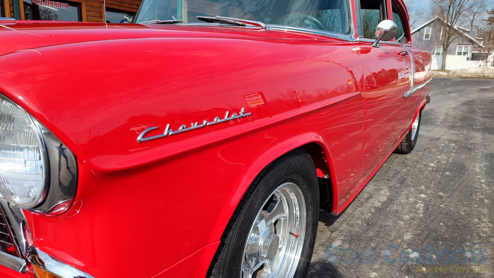 This is a slick 55 210 that has undergone a very nice custom build, done in Apple Red, basecoat clearcoat, sanded and wheeled smooth, slick as glass, at time of build had all new smoke tinted glass; as well as tinted windshield, new window rubbers, window felts and weather stripping, window stainless moldings are original and have been re-polished to a show finish; as well as upper door stainless moldings, new side view mirrors, antenna, door handles, hood jet and hood emblem, hood bar and grill side moldings look like new, stainless grill in excellent condition, lower grill molding appear to be original in very good condition, new parking lights and housings, re-chromed front bumper and bumperettes, original body side moldings have been re-polished to a show finish, new taillight and taillight bezels, new deck lid emblem, re-chromed rear bumper and bumper guards.